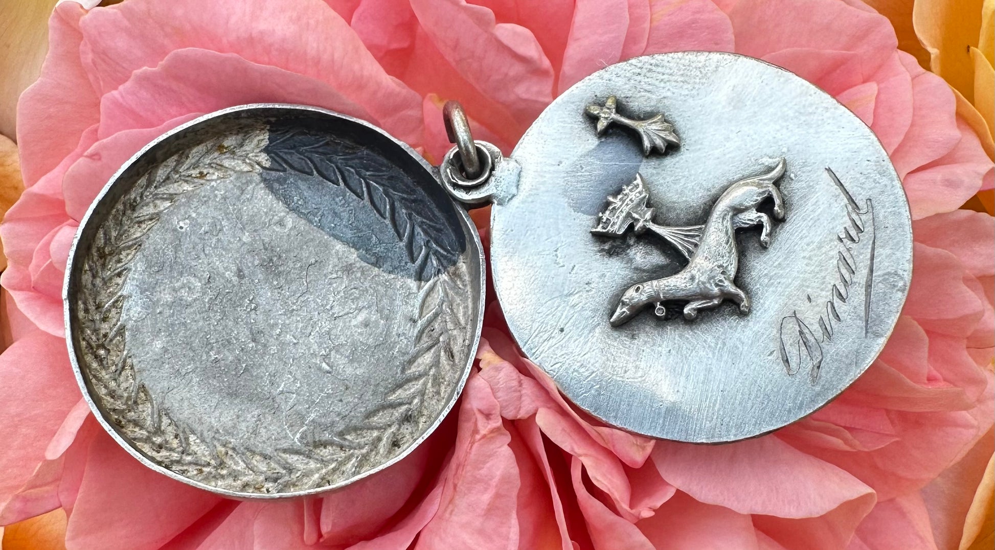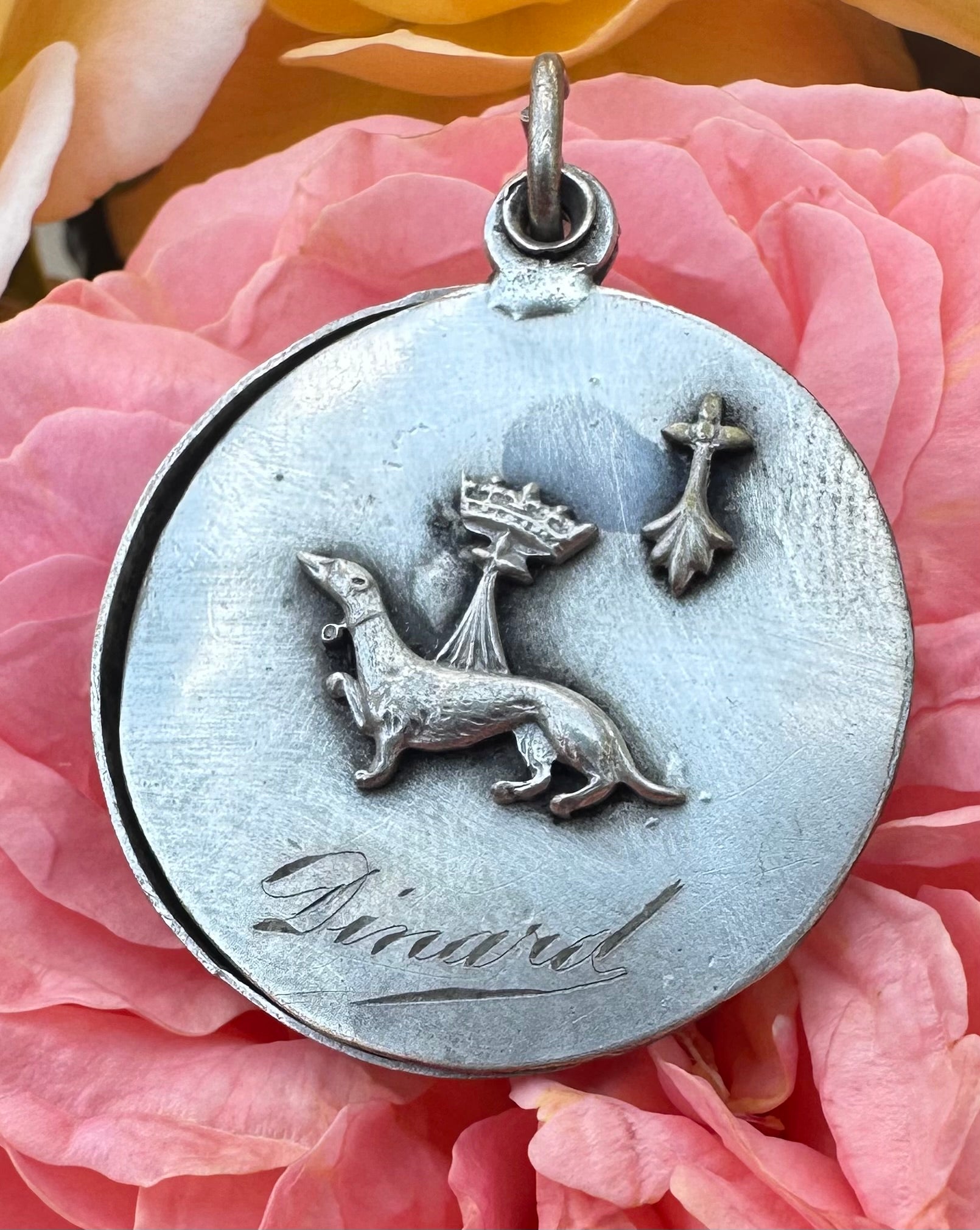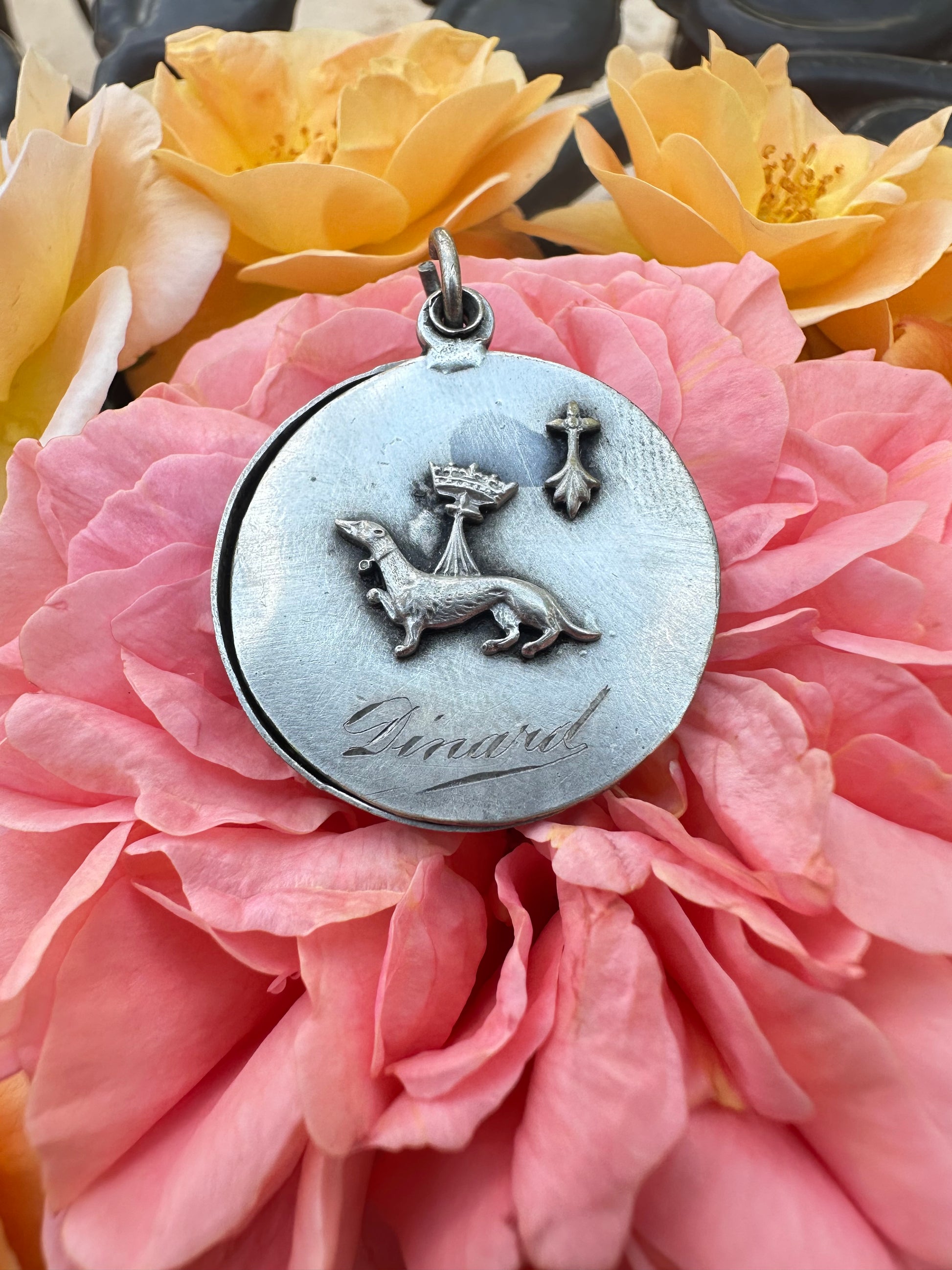 The front of the locket is adorned with the symbol of the French region of Brittany: the ermine. The ermine is a symbol of purity and honesty. The ermine emblem was adopted by Anne de Bretagne in the 15th century. The name of the renowned Breton seaside resort of Dinard is inscribed.