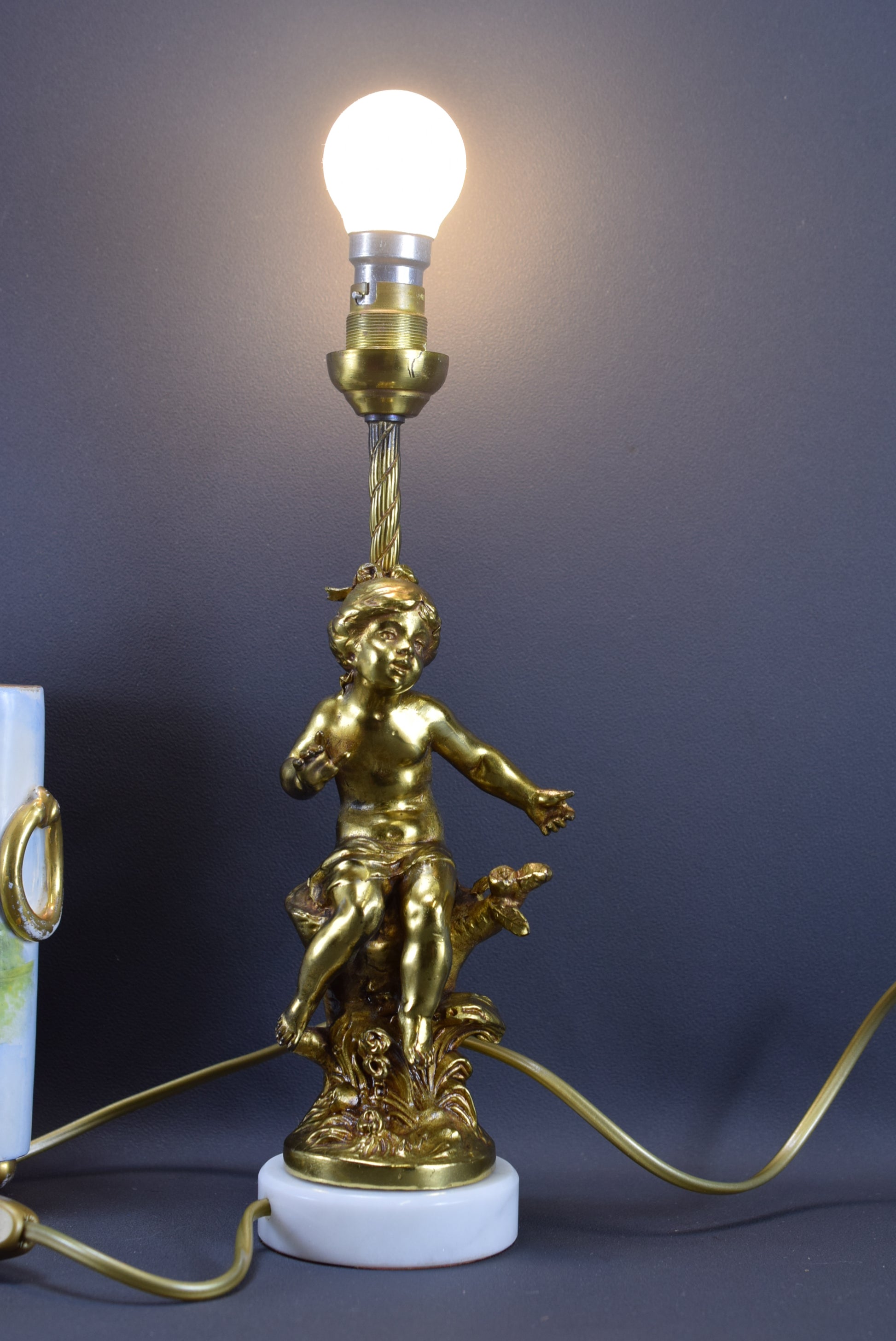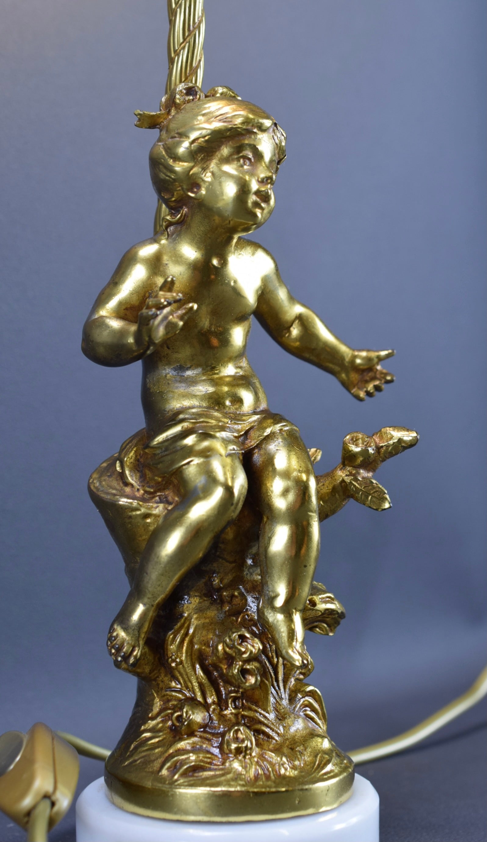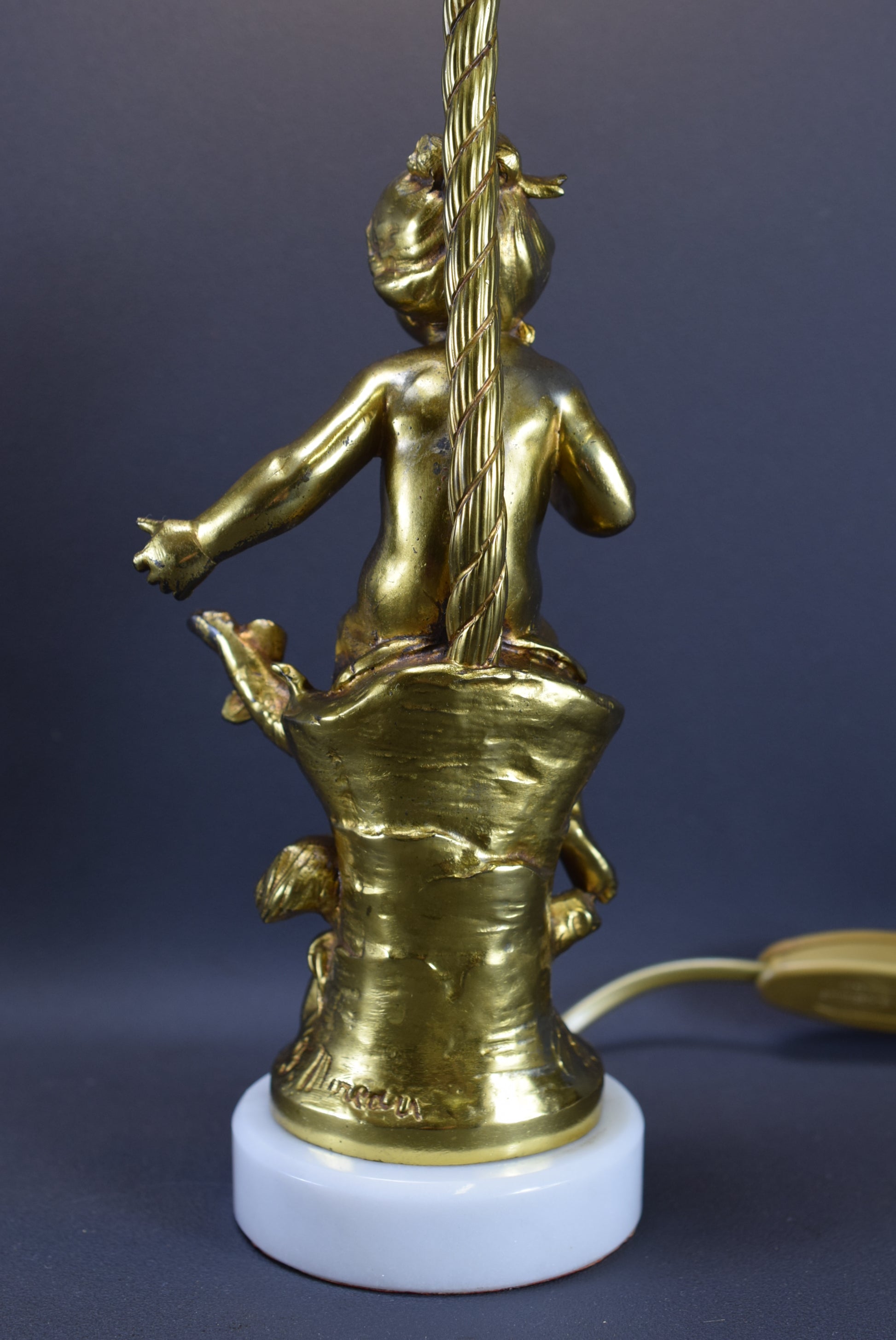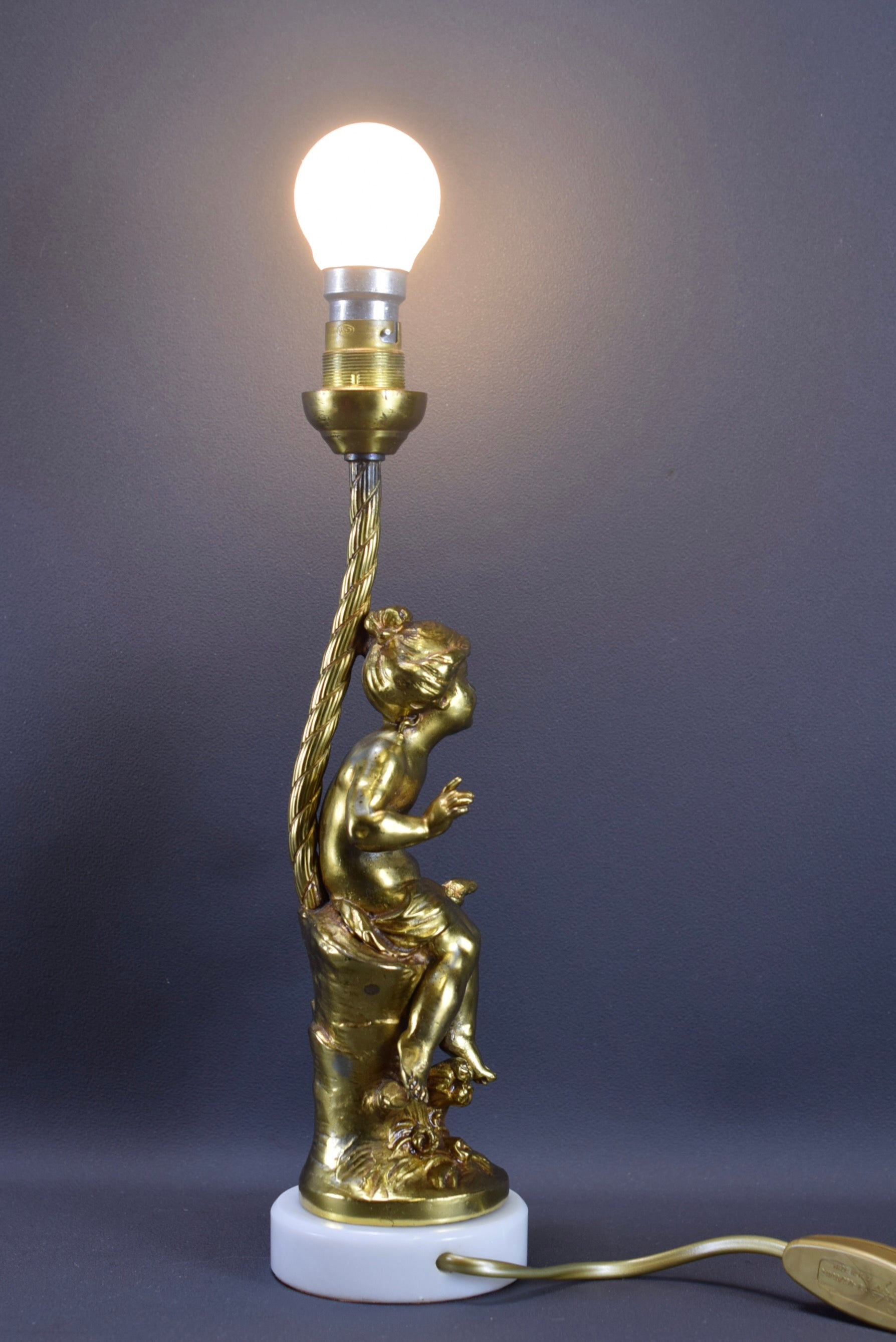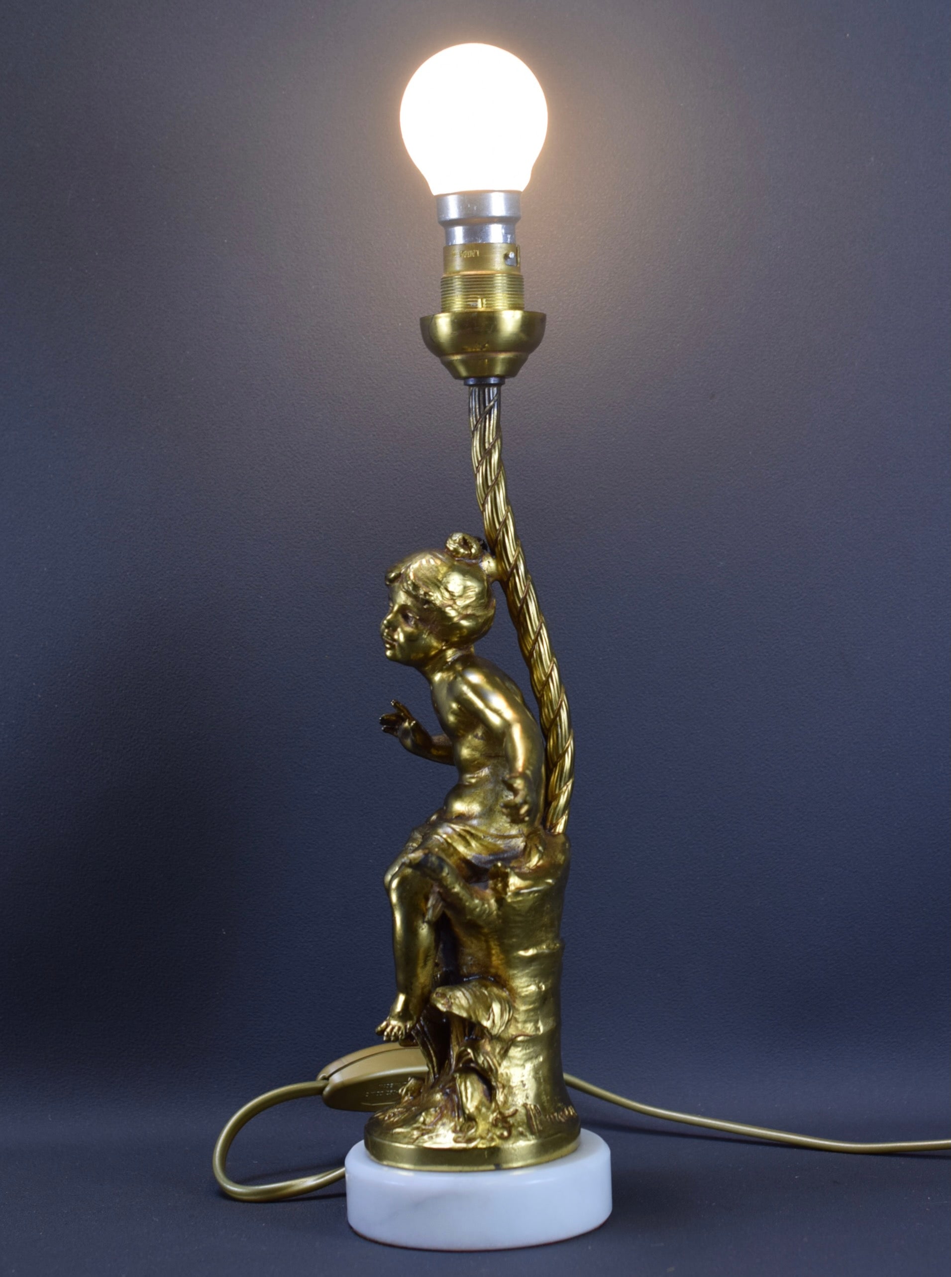 A beautiful French antique table lamp designed by F Moreau in the early 20th century. The charming lighting features a delightful girl (cast from gilded bronze patina spelter). The metal part rests on a white marble base.