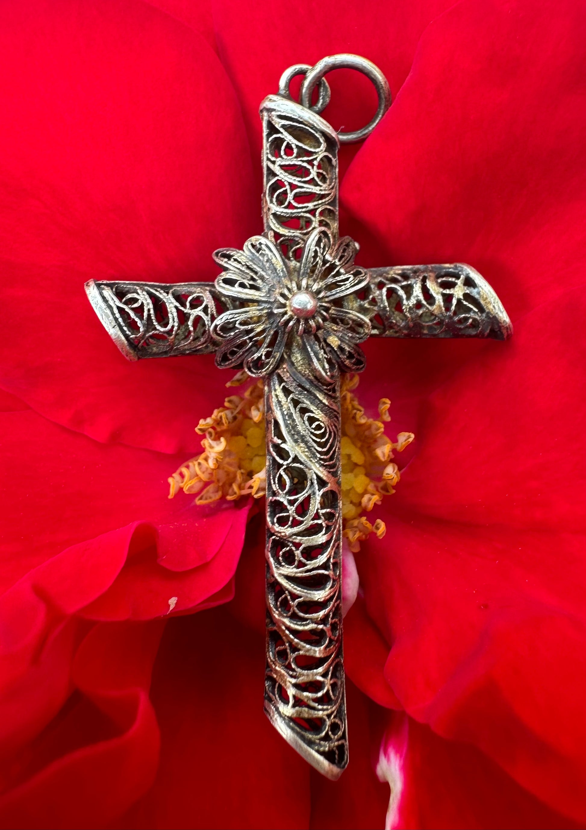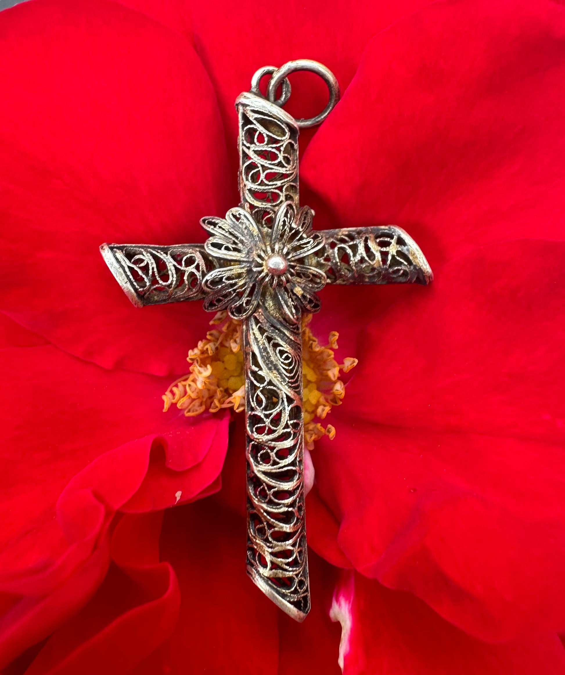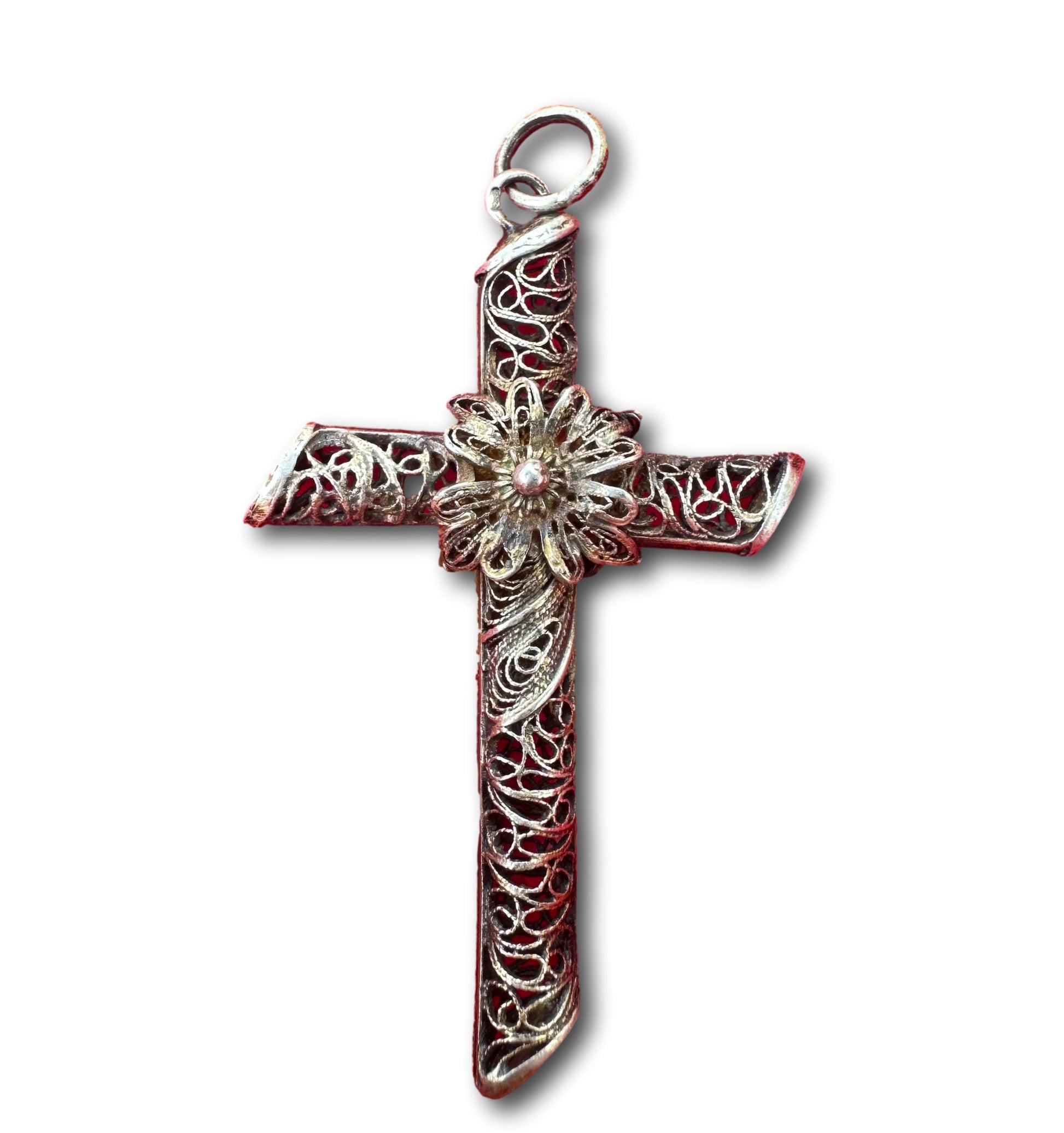 A beautiful antique French cross pendant dating to the early 20th century. The charm shows an exquisite delicate design, adorned with a flower. The fine detail and craftsmanship give it a timeless and elegant aesthetic.