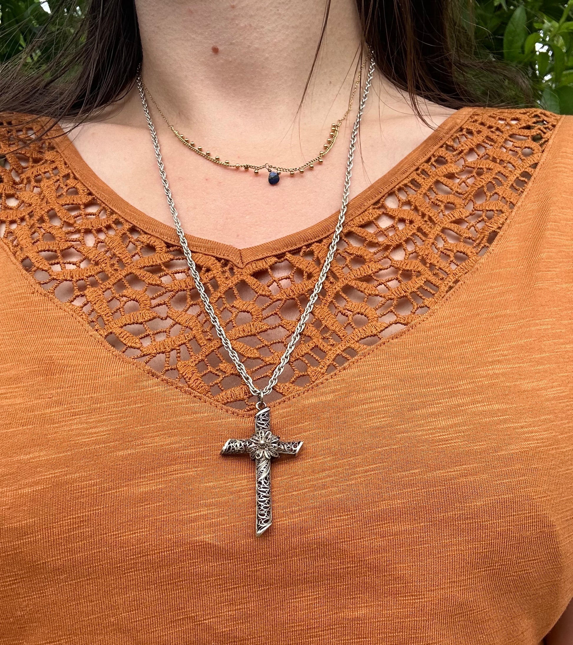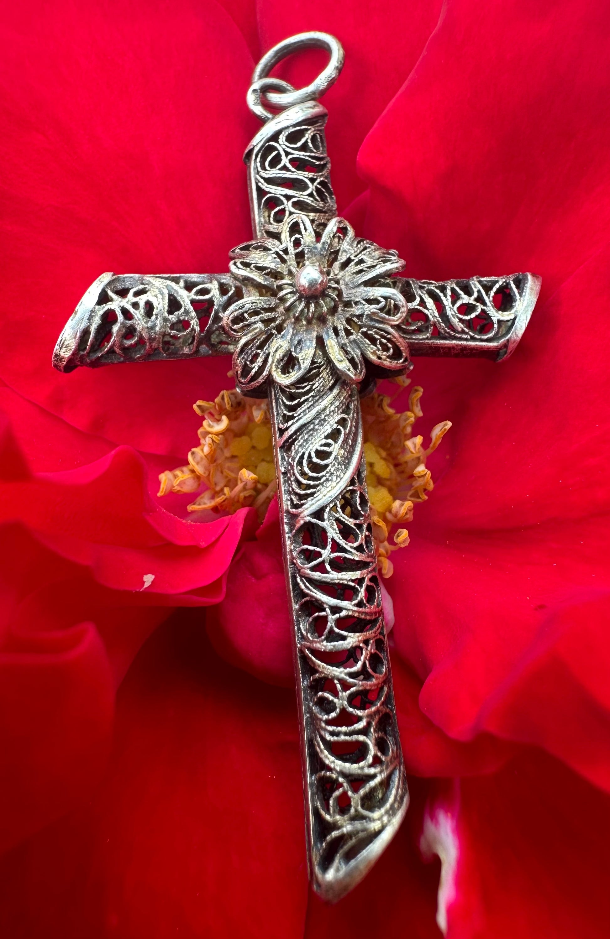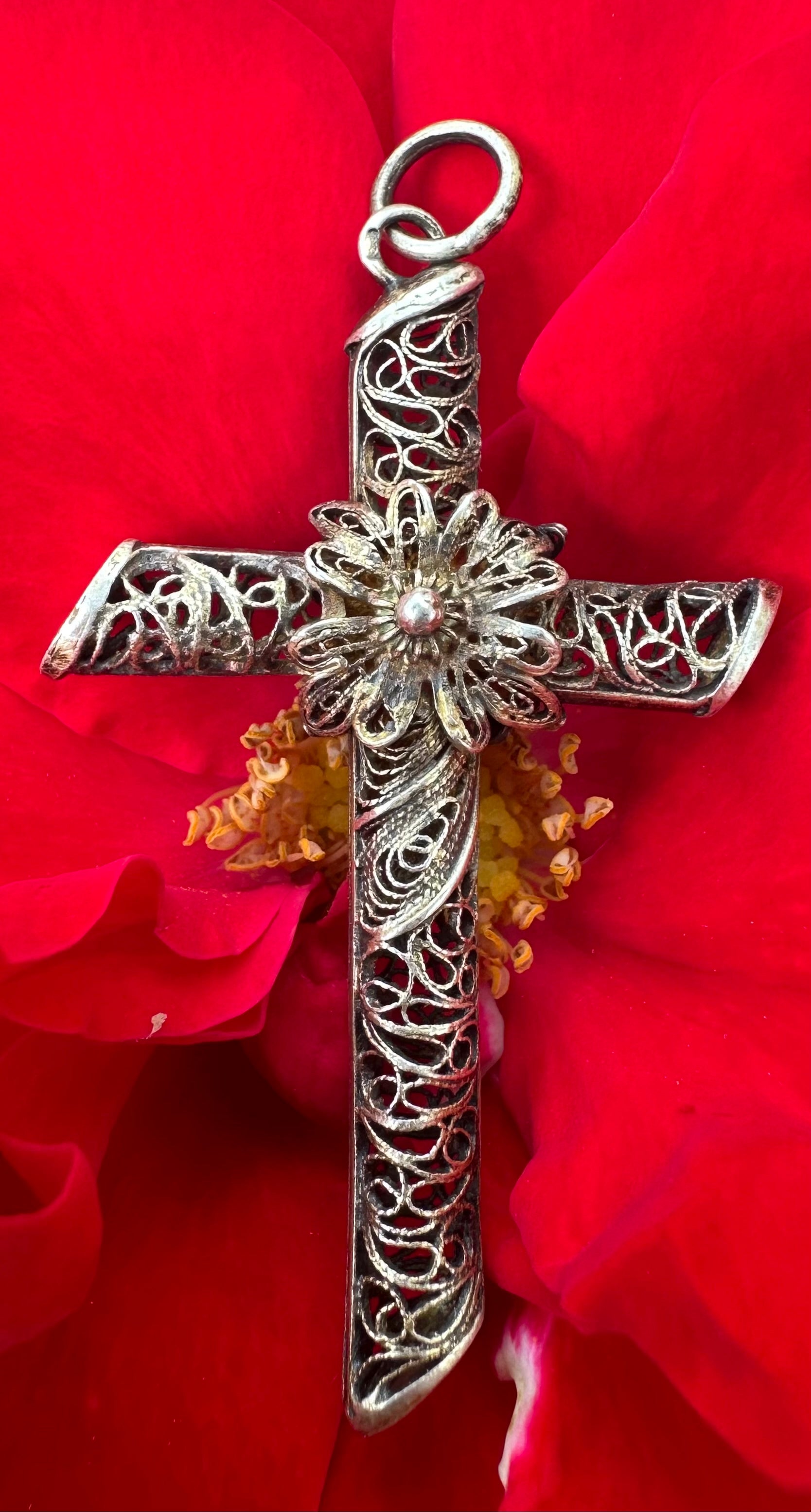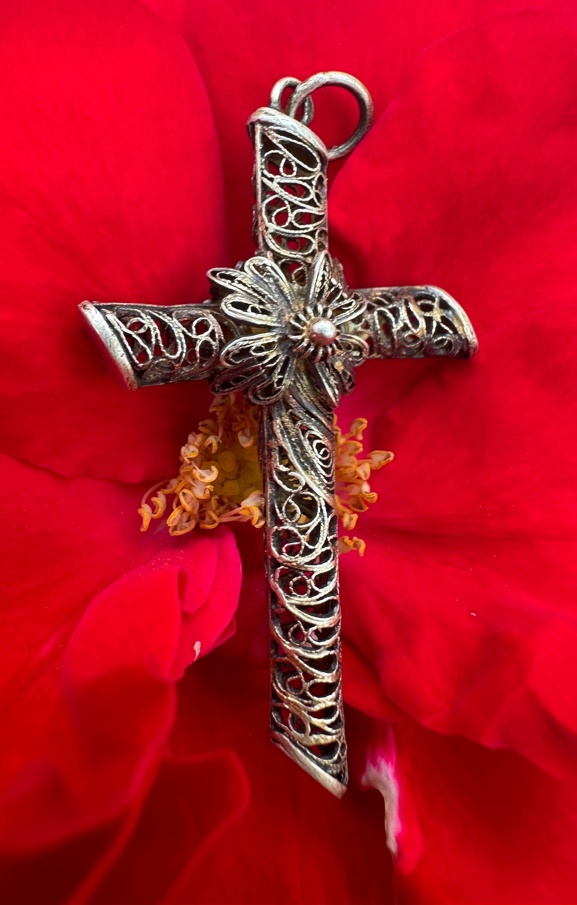 A beautiful antique French cross pendant dating to the early 20th century. The charm shows an exquisite delicate design, adorned with a flower. The fine detail and craftsmanship give it a timeless and elegant aesthetic.
