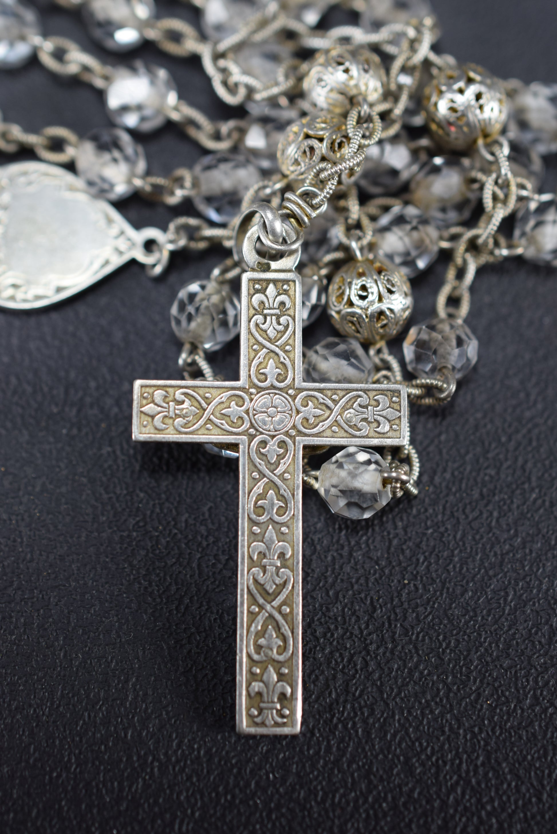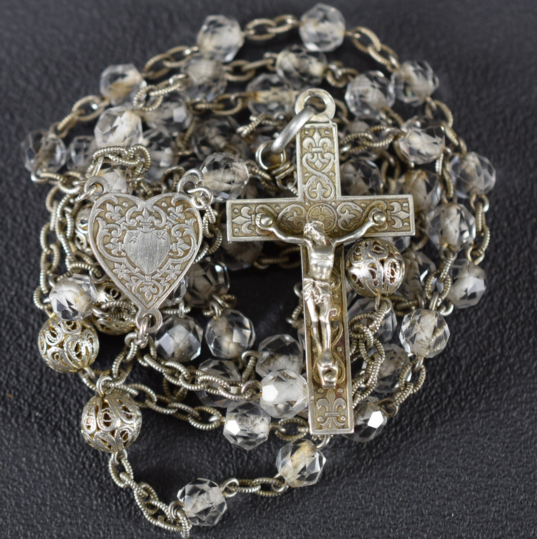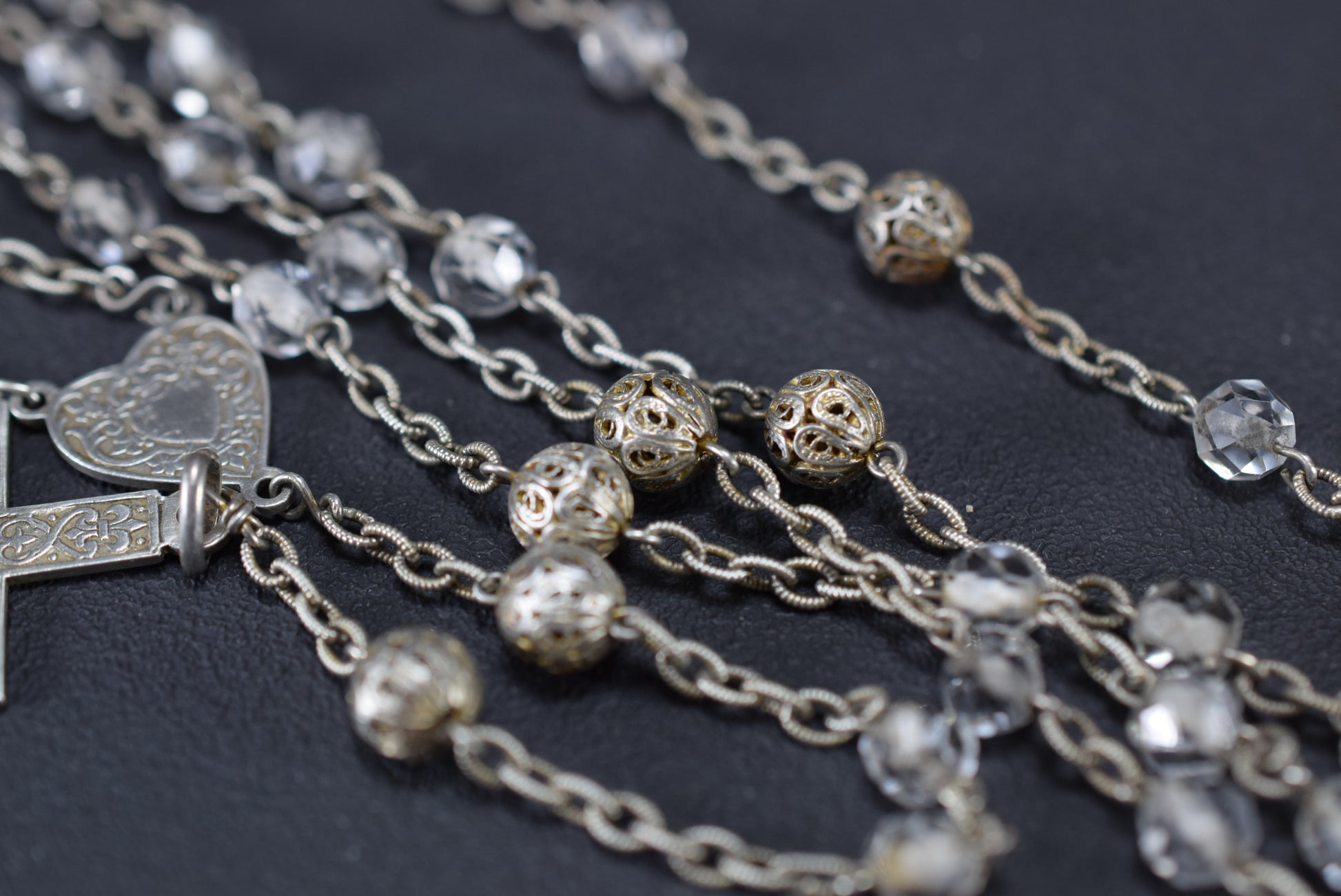 A fabulous French rosary dating to the 1900's. The religious necklace is made of sterling silver and faceted transparent glass beads. The Pater beads are made of filigree sterling silver. There are 58 beads. High quality rosary.