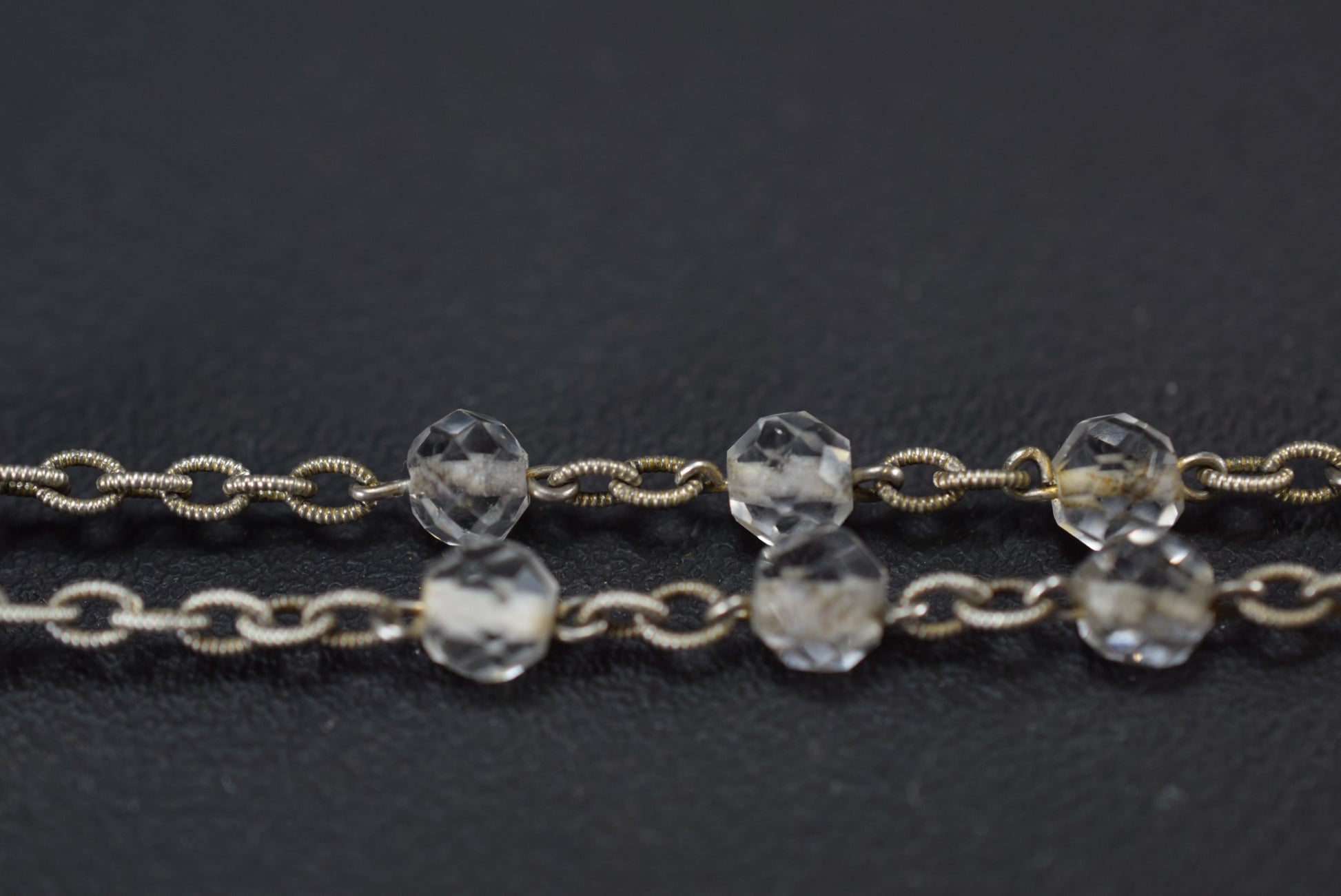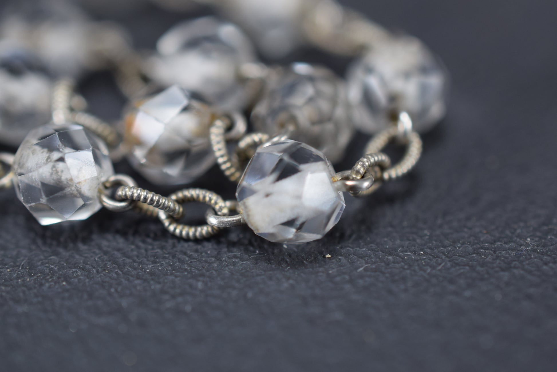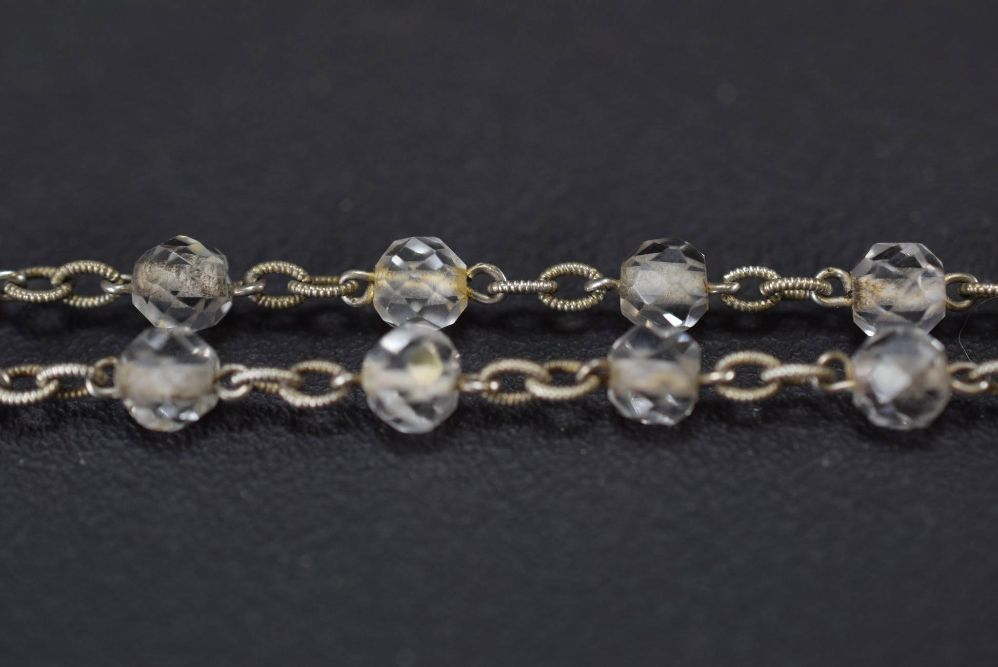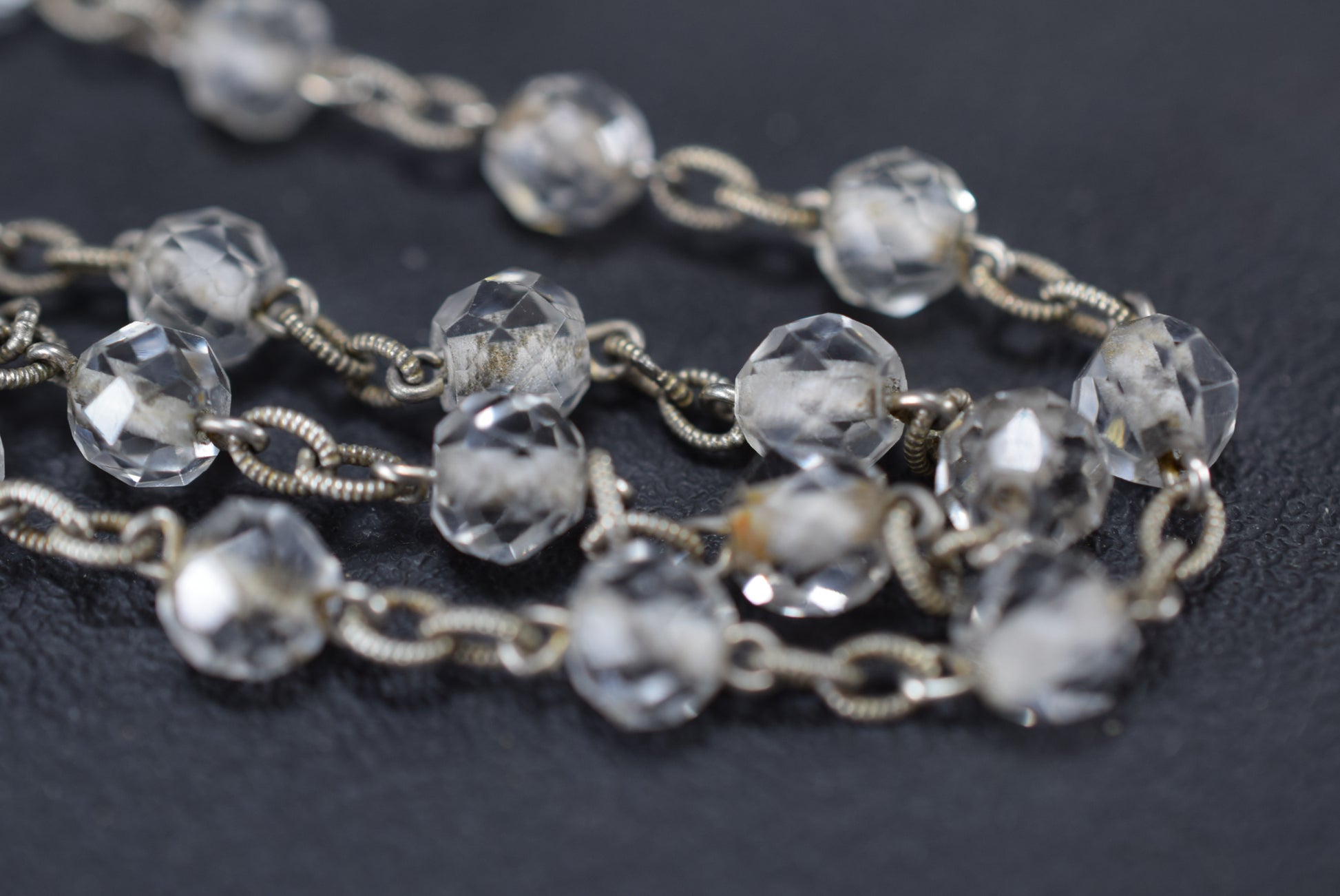 A fabulous French rosary dating to the 1900's. The religious necklace is made of sterling silver and faceted transparent glass beads. The Pater beads are made of filigree sterling silver. There are 58 beads. High quality rosary.