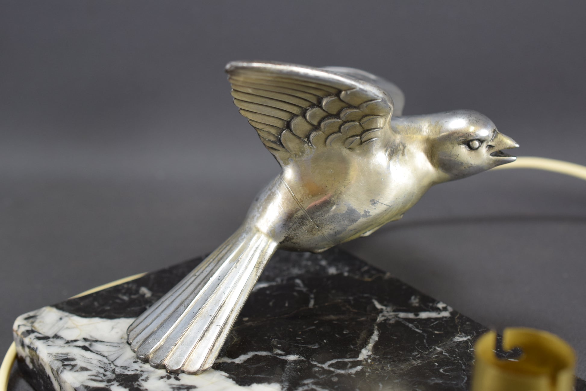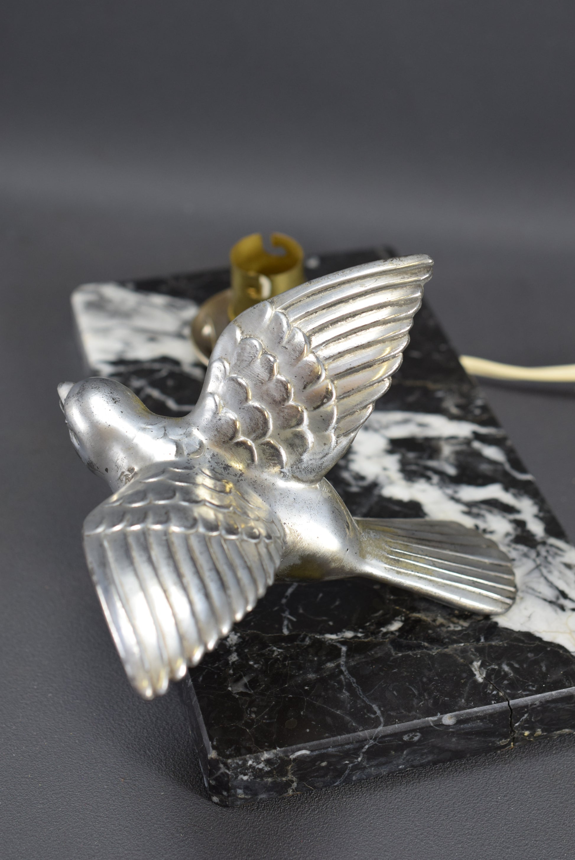 Beautiful French vintage bedside lamp from the Art Deco period. It features a delightful flying bird. The bird statue is cast from spelter and shows a silver patina. It is based on a black marble plaque.