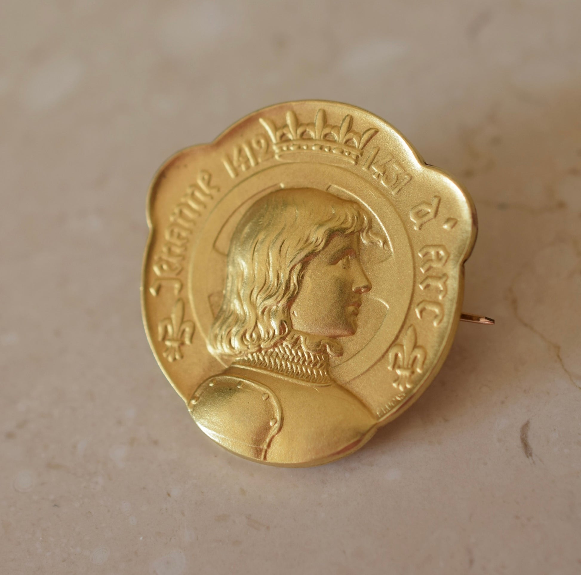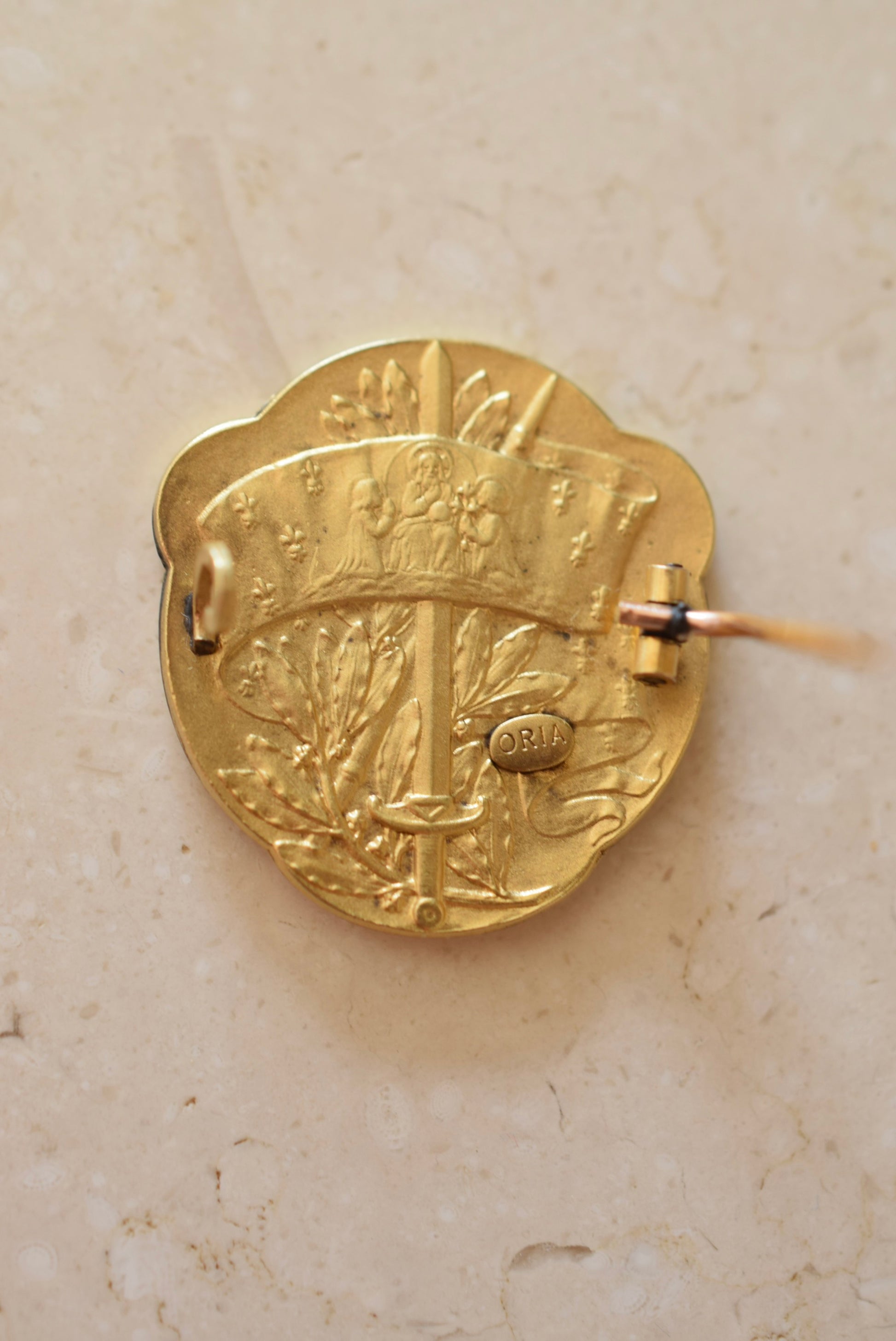 A beautiful antique French pin brooch dating to the early 20th century. The fine religious jewelry features Saint Joan of Arc with fine details. Rare design. It has been goldplated on metal, Oria quality. The St Joan of Arc, patron of France, brooch, has been signed by the engraver Lucas.