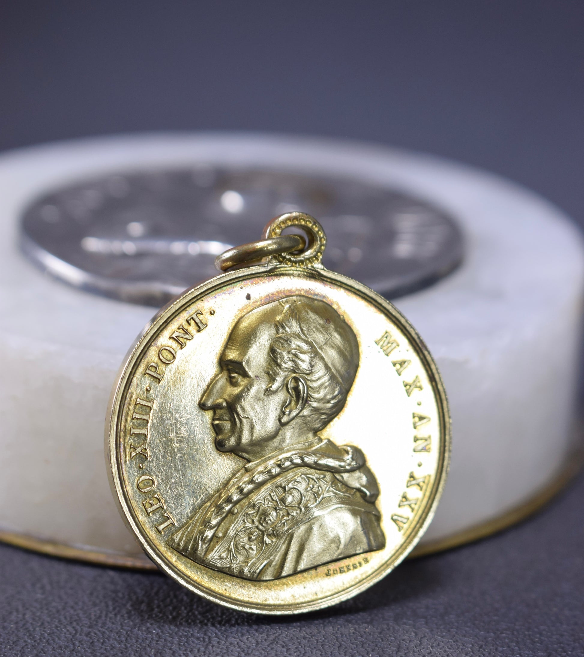 The reverse of this large amulet features Pope Leo XIII (1810-1903) and has been signed by the engraver Johnson.