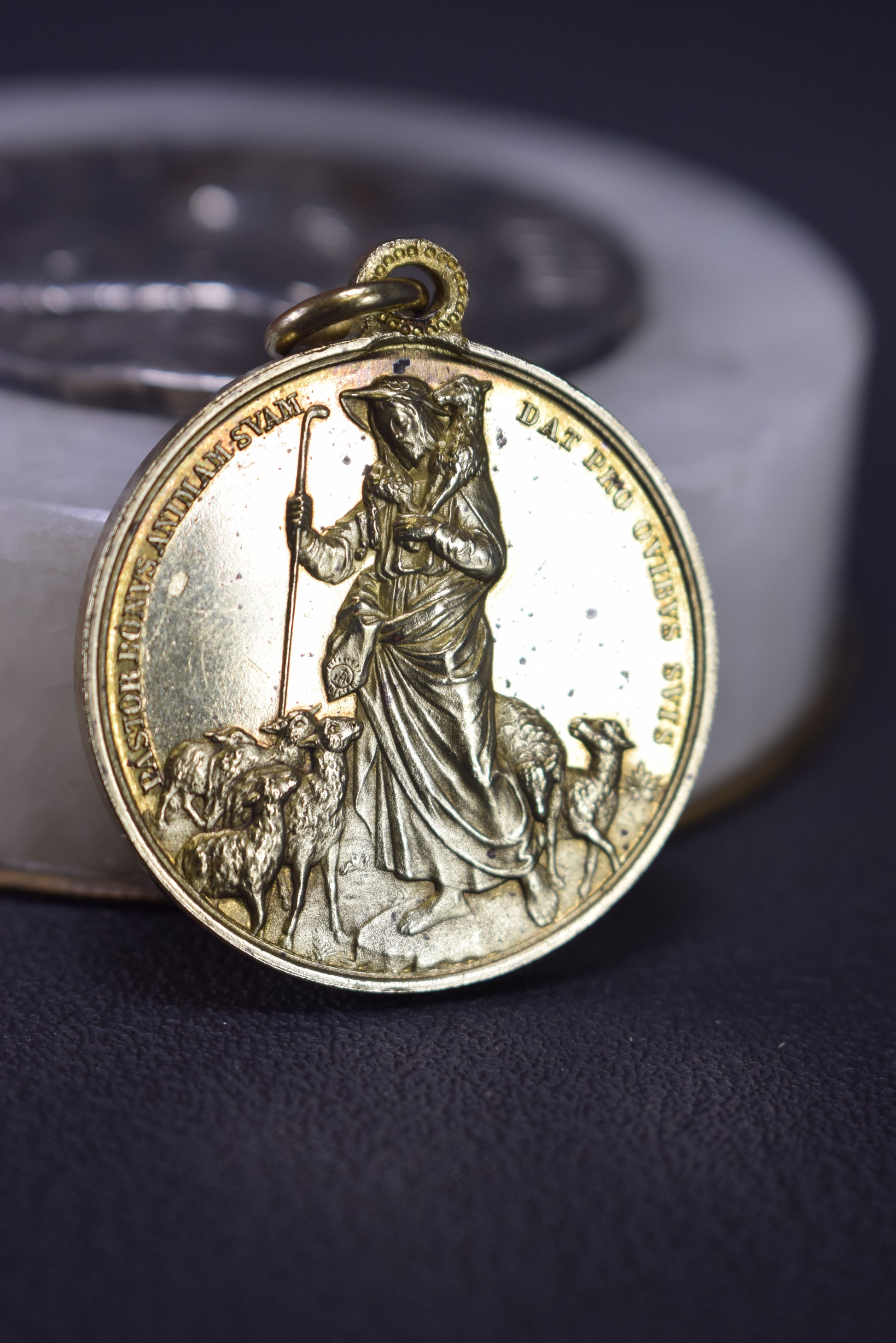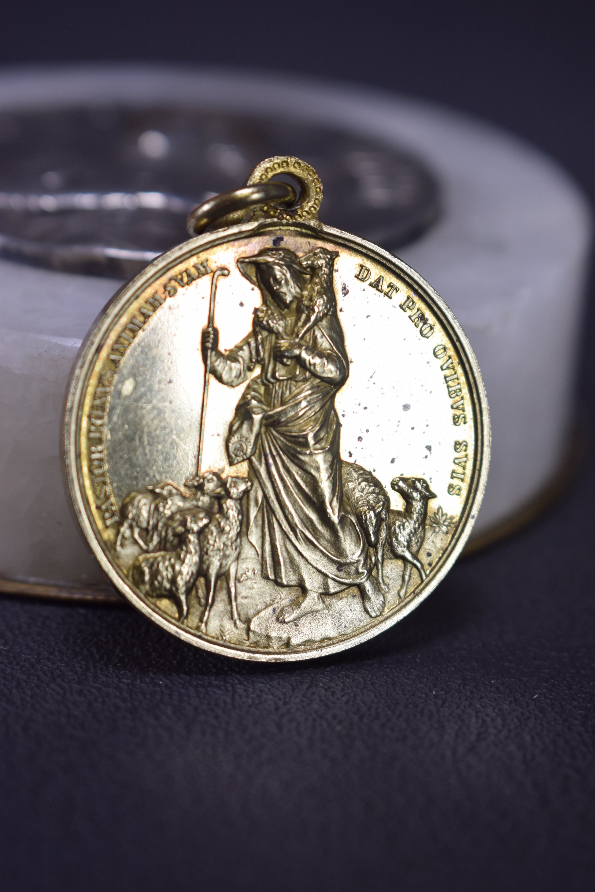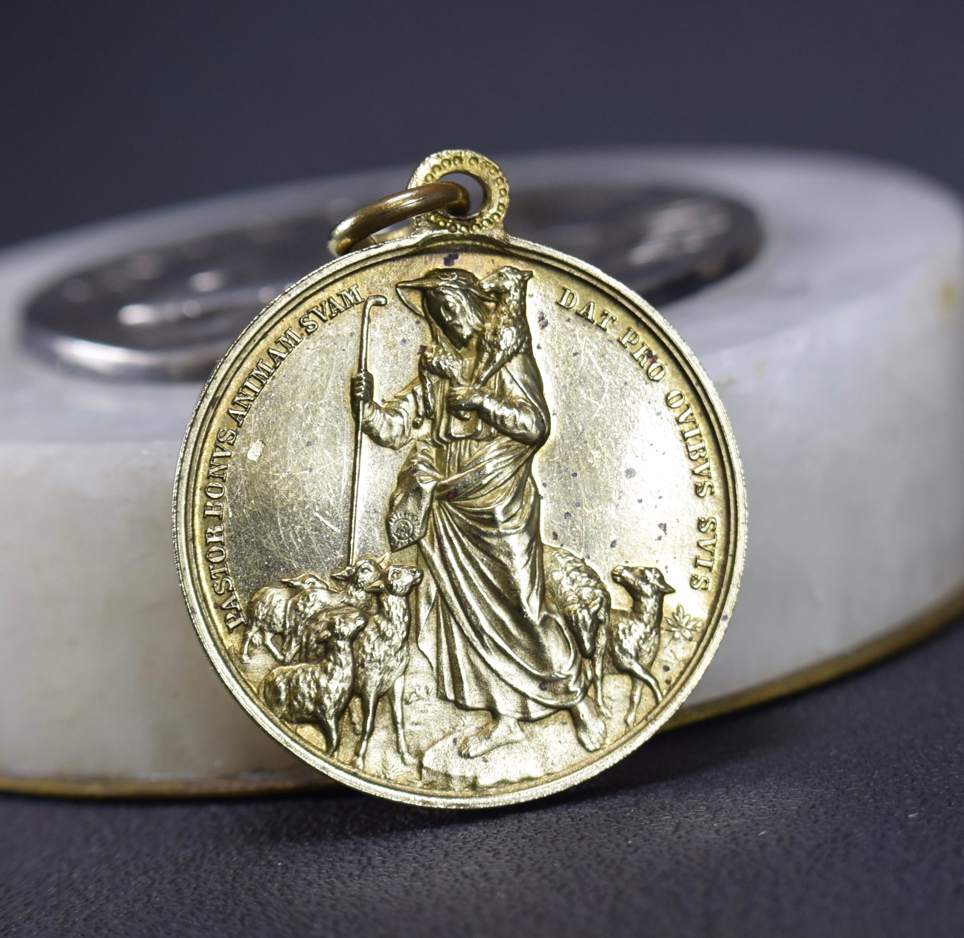 A beautiful French antique religious medal dating to the early 20th century. The Catholic pendant depicts Jesus the Good Shepherd.
