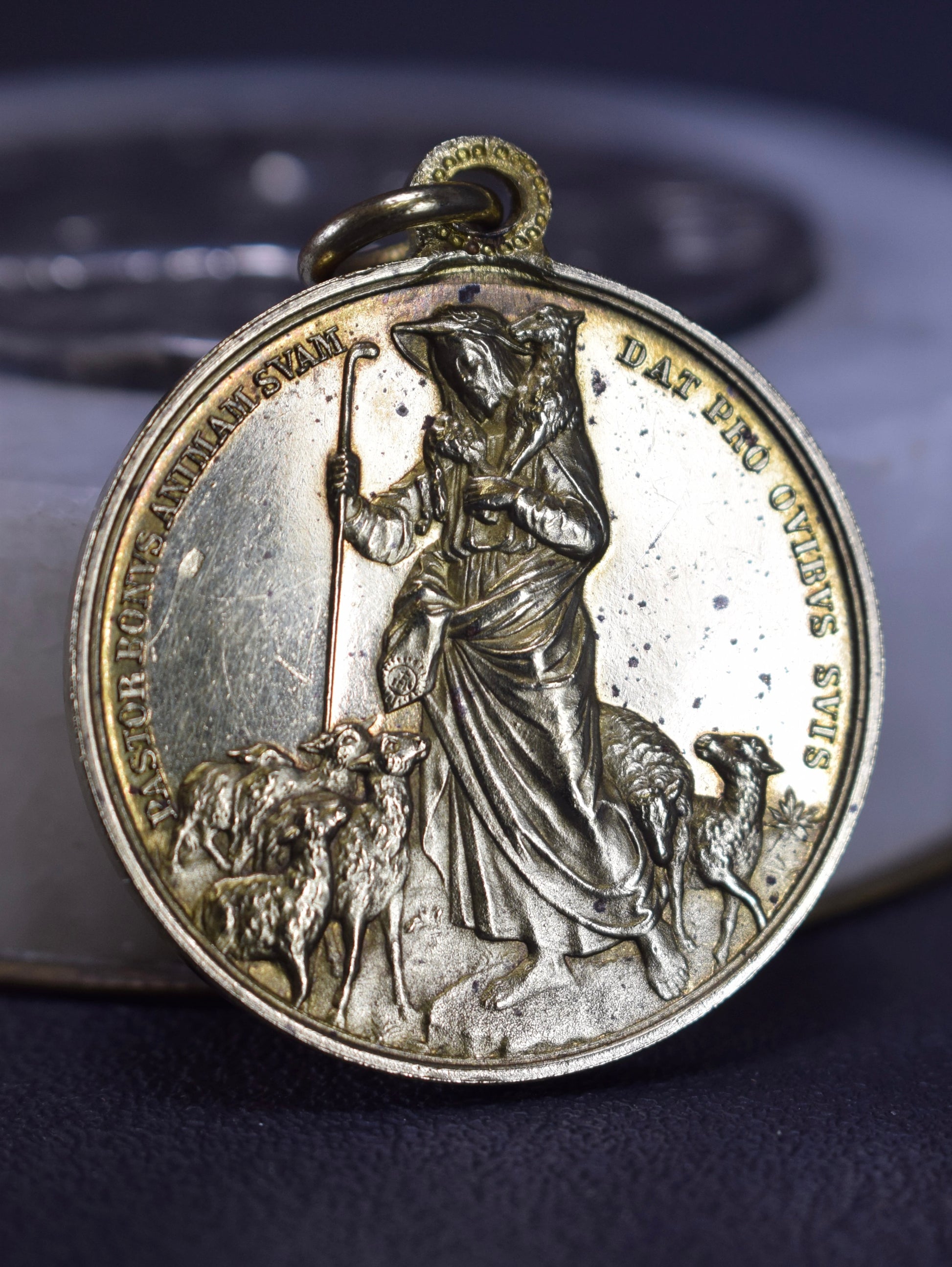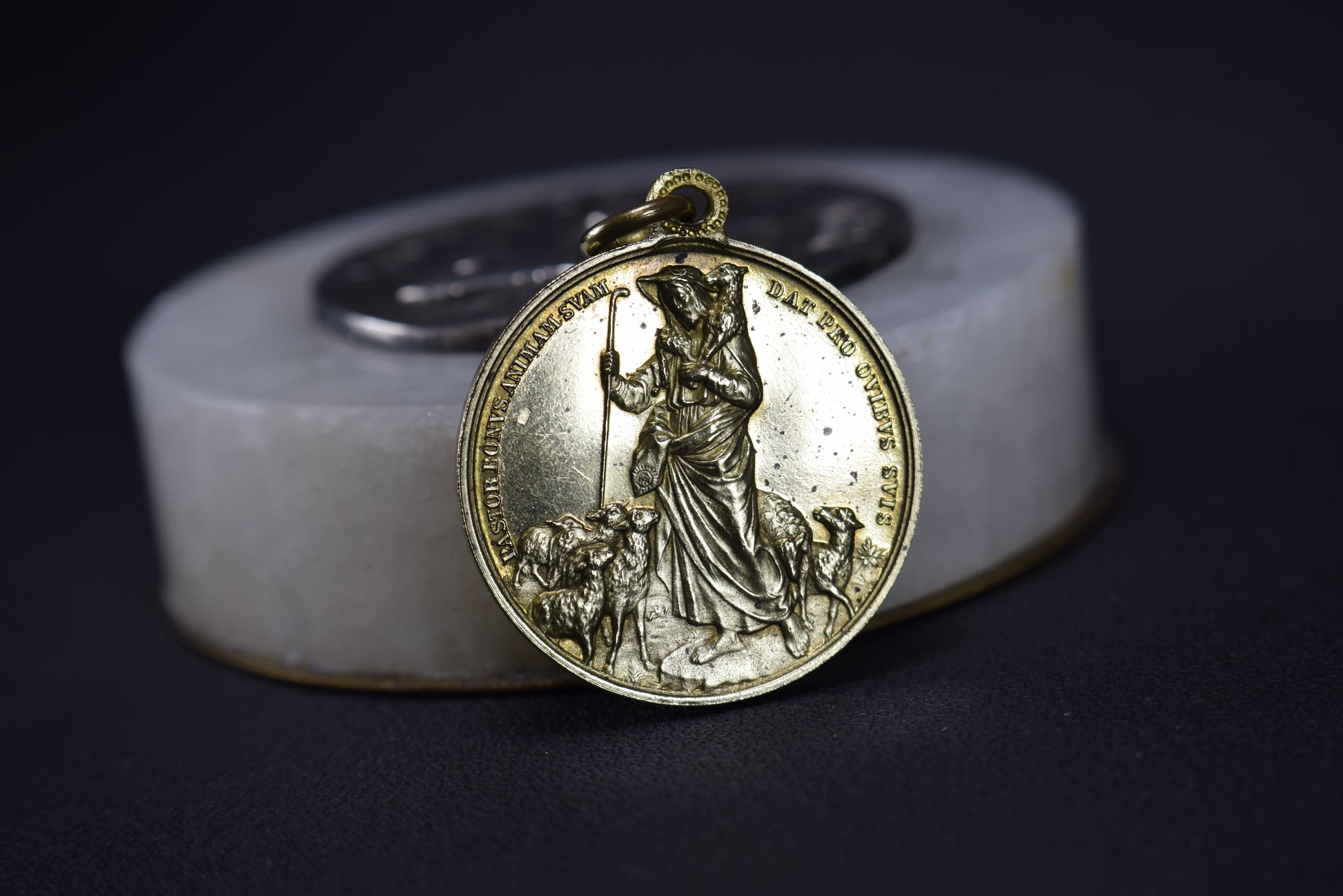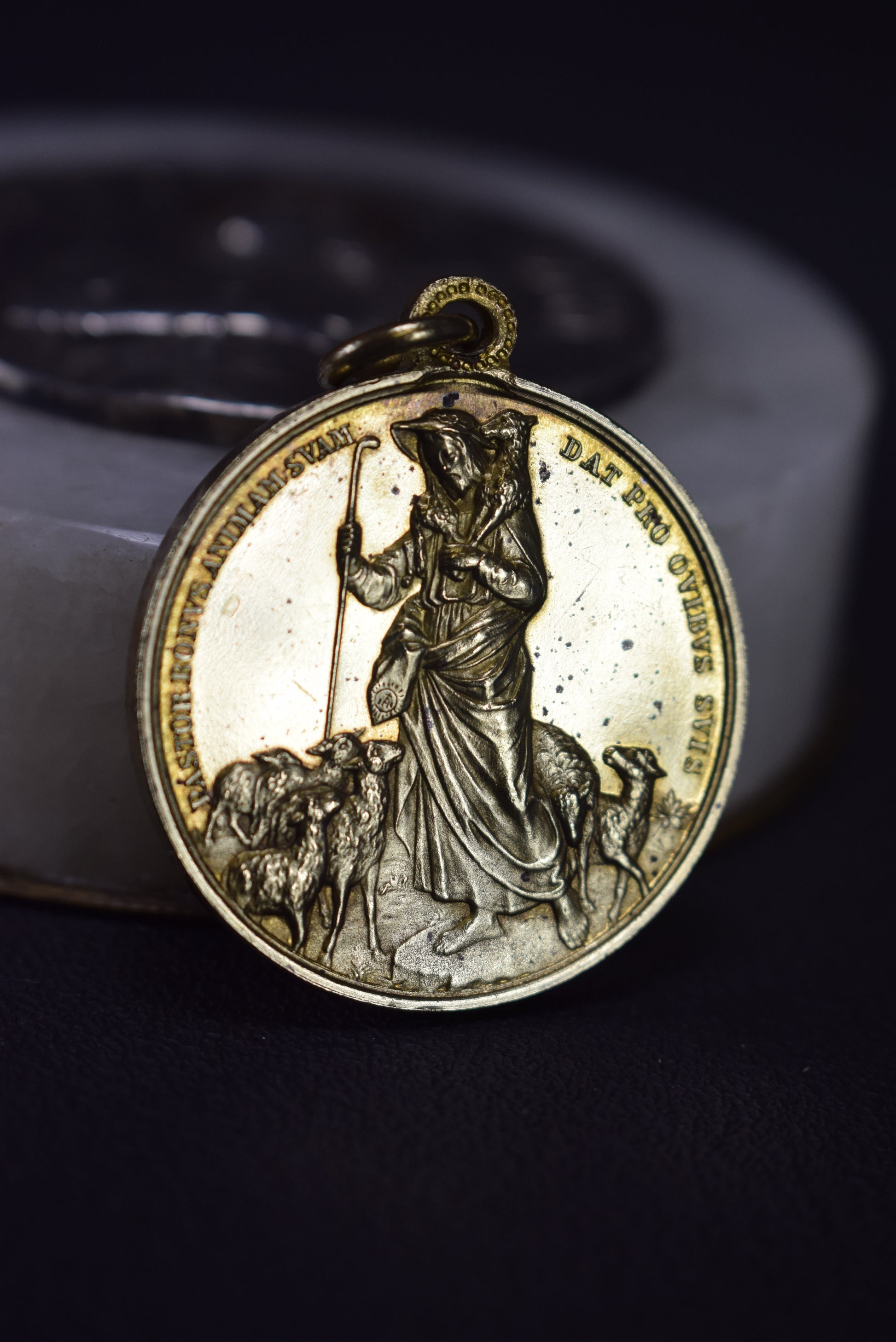 A beautiful French antique religious medal dating to the early 20th century. The Catholic pendant depicts Jesus the Good Shepherd.