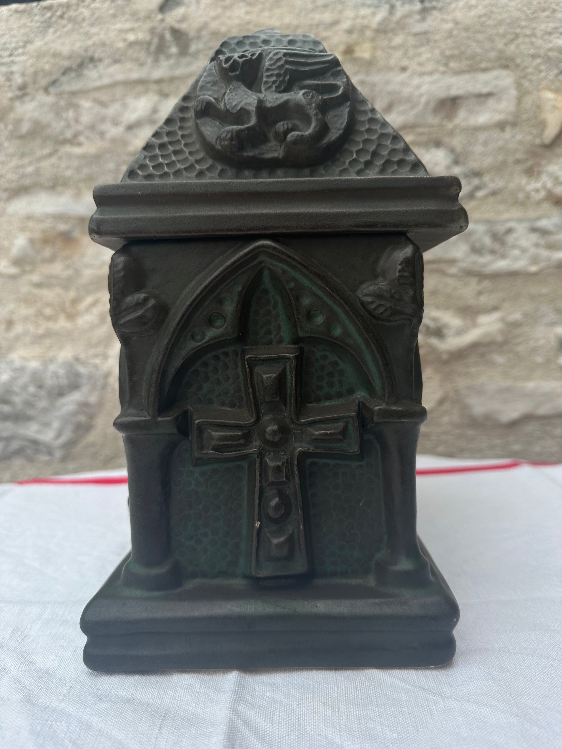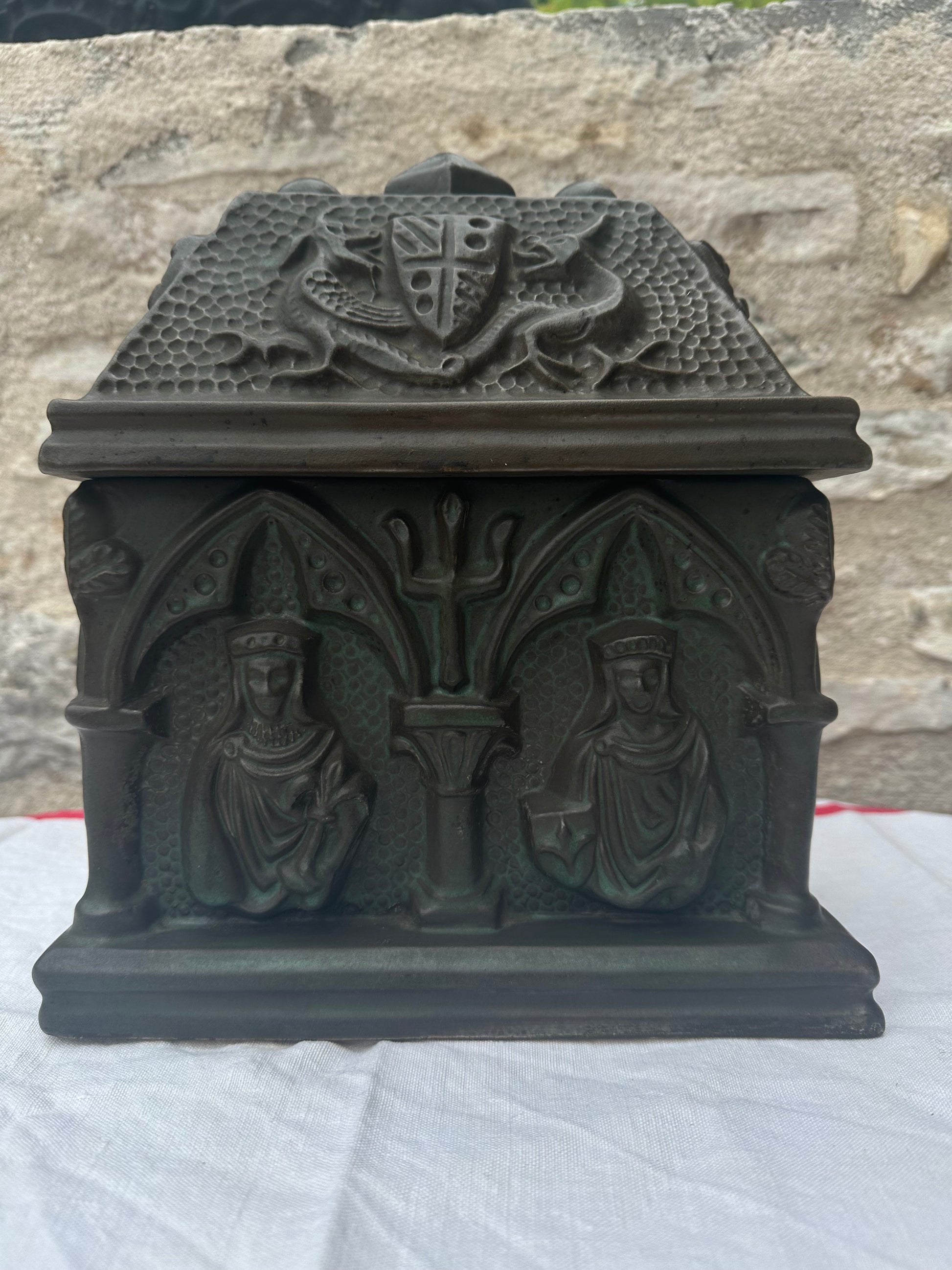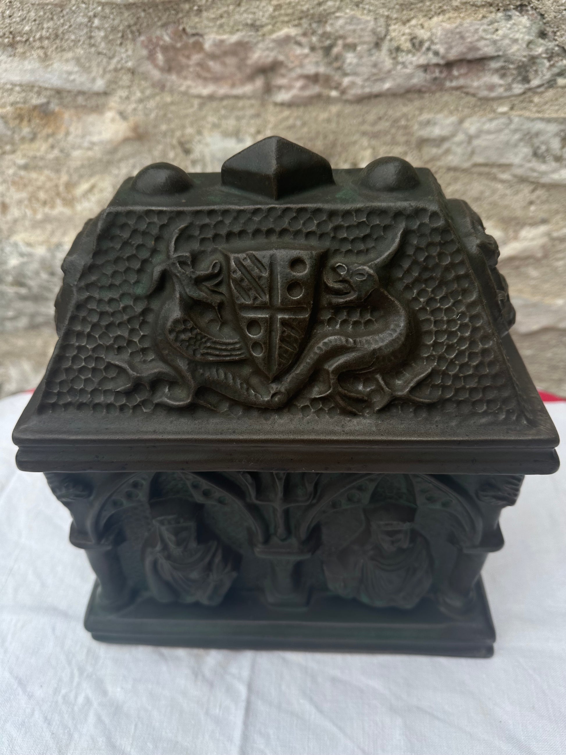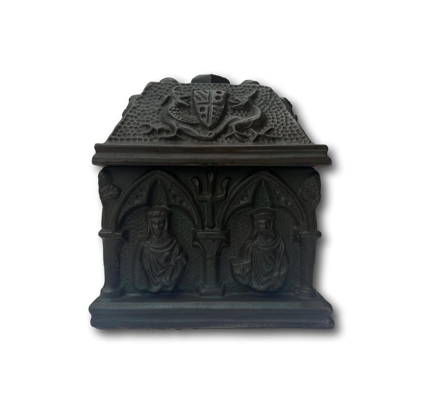 The Gothic Revival pottery casket is a striking decorative piece, reflecting the ornate and mystical elements characteristic of the Gothic Revival style. This casket is crafted from pottery and features a lid adorned with a detailed coat of arms, around which fierce griffins are intricately sculpted, symbolizing strength and guardianship. The sides of the casket are marked with bold crosses, emphasizing its gothic influence and adding a touch of solemnity. The front and back of the casket are embellished with sculpted figures, possibly depicting medieval or religious icons, adding depth and narrative to the piece. The casket’s design is rich with texture and elaborate patterns, evoking a sense of antiquity and reverence. It serves as both a functional item and a work of art, capturing the essence of the Gothic Revival movement with its intricate symbolism and craftsmanship.