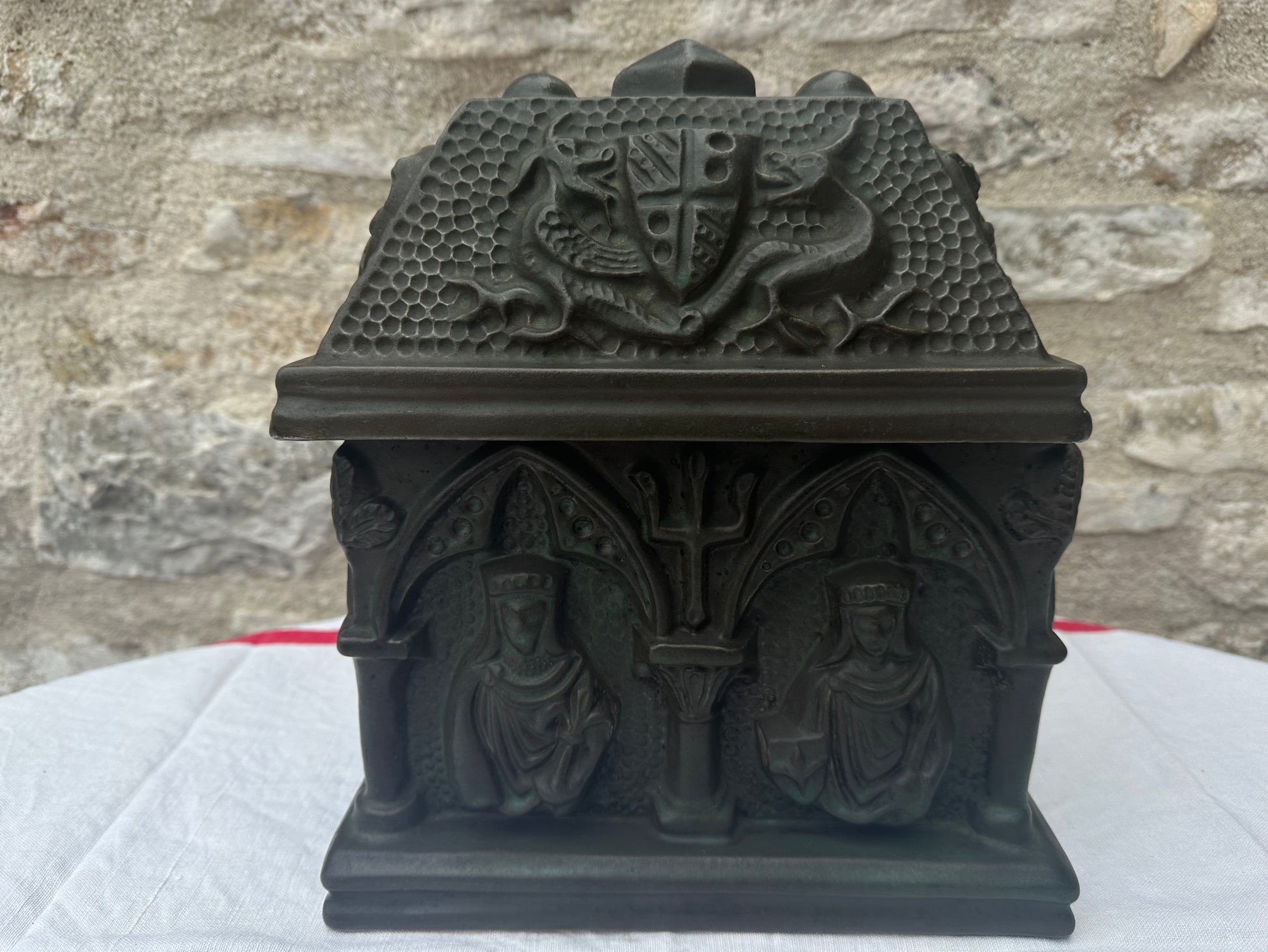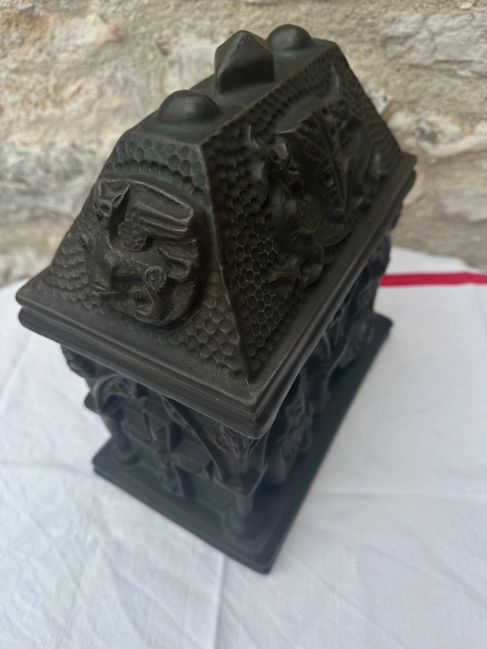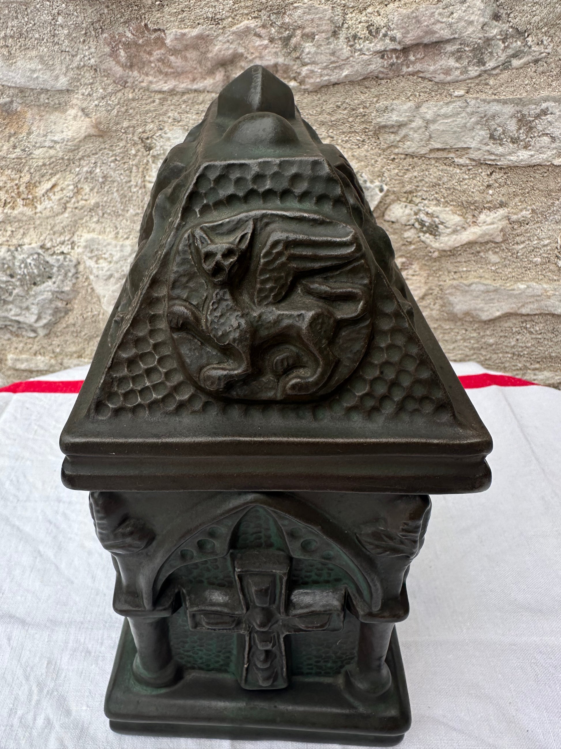 The Gothic Revival pottery casket is a striking decorative piece, reflecting the ornate and mystical elements characteristic of the Gothic Revival style. This casket is crafted from pottery and features a lid adorned with a detailed coat of arms, around which fierce griffins are intricately sculpted, symbolizing strength and guardianship. The sides of the casket are marked with bold crosses, emphasizing its gothic influence and adding a touch of solemnity. The front and back of the casket are embellished with sculpted figures, possibly depicting medieval or religious icons, adding depth and narrative to the piece. The casket’s design is rich with texture and elaborate patterns, evoking a sense of antiquity and reverence. It serves as both a functional item and a work of art, capturing the essence of the Gothic Revival movement with its intricate symbolism and craftsmanship.
