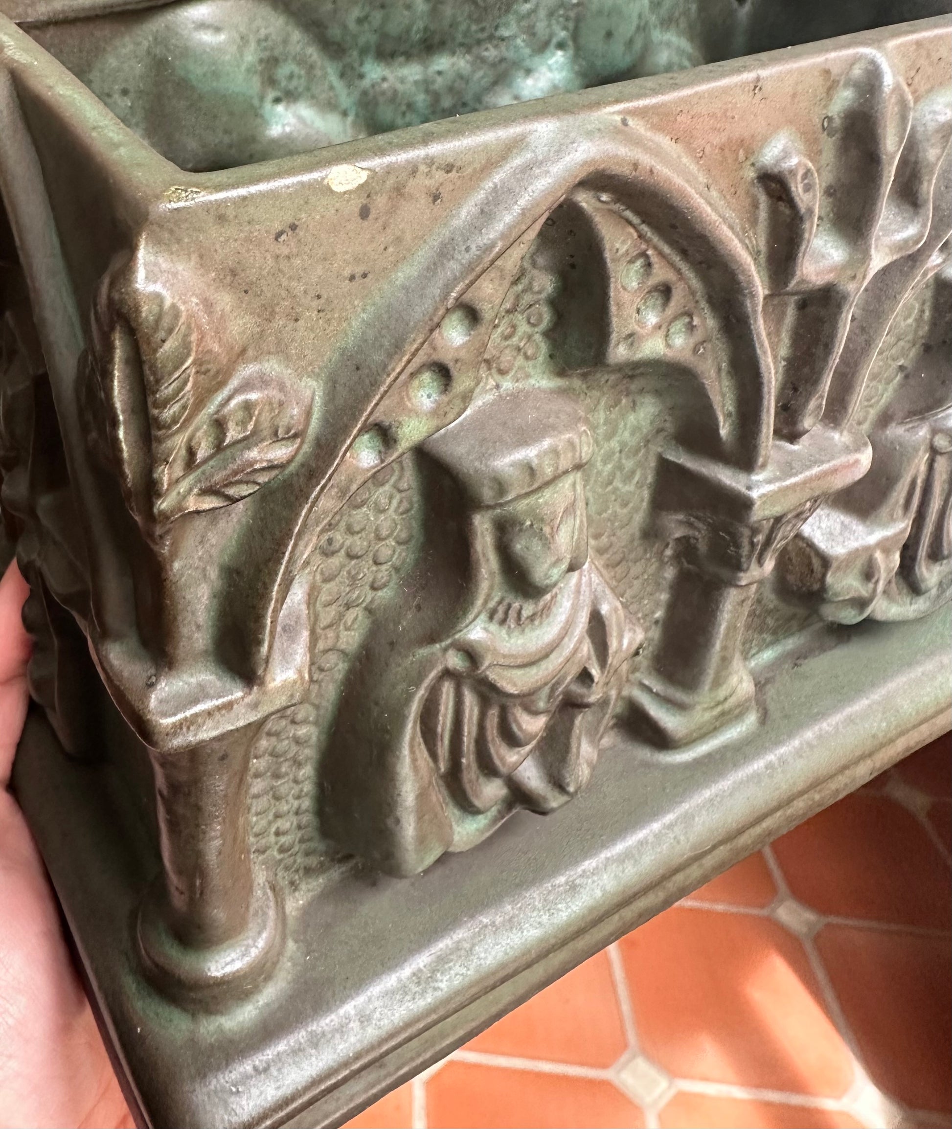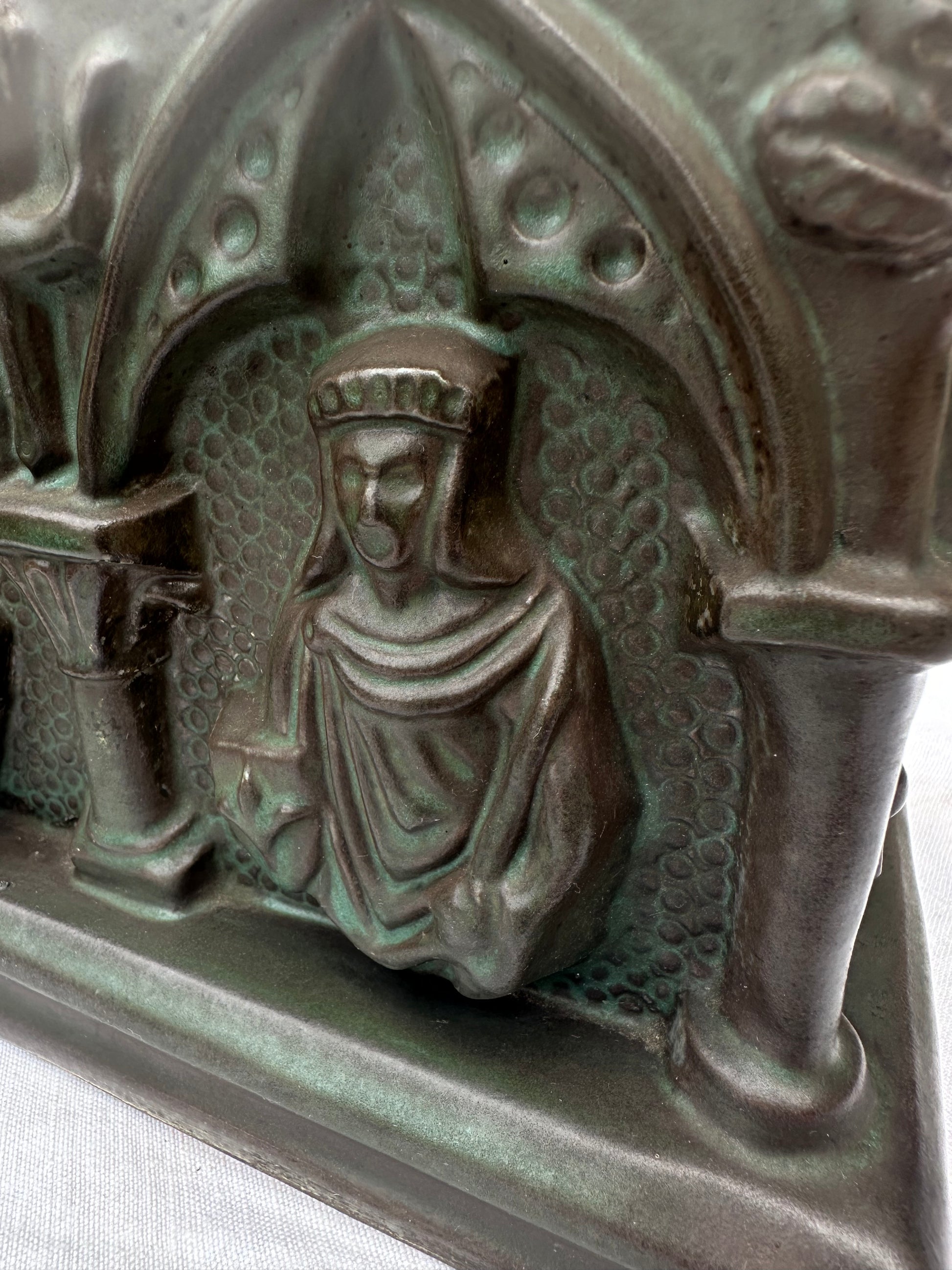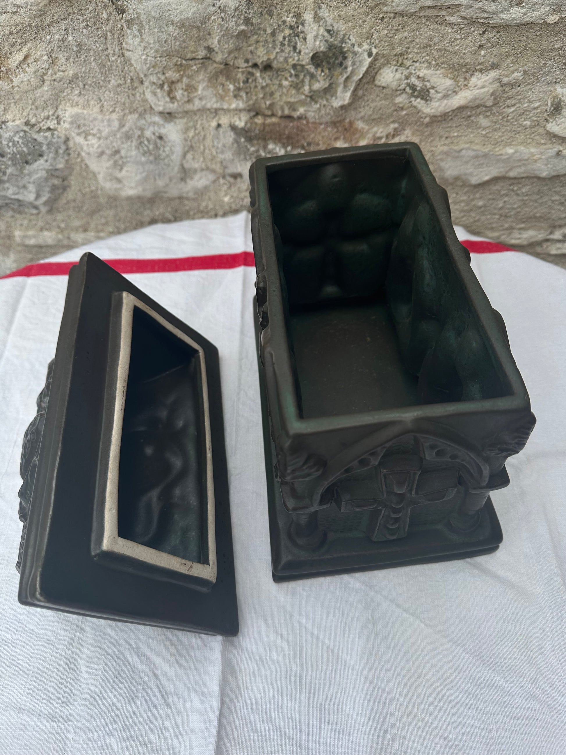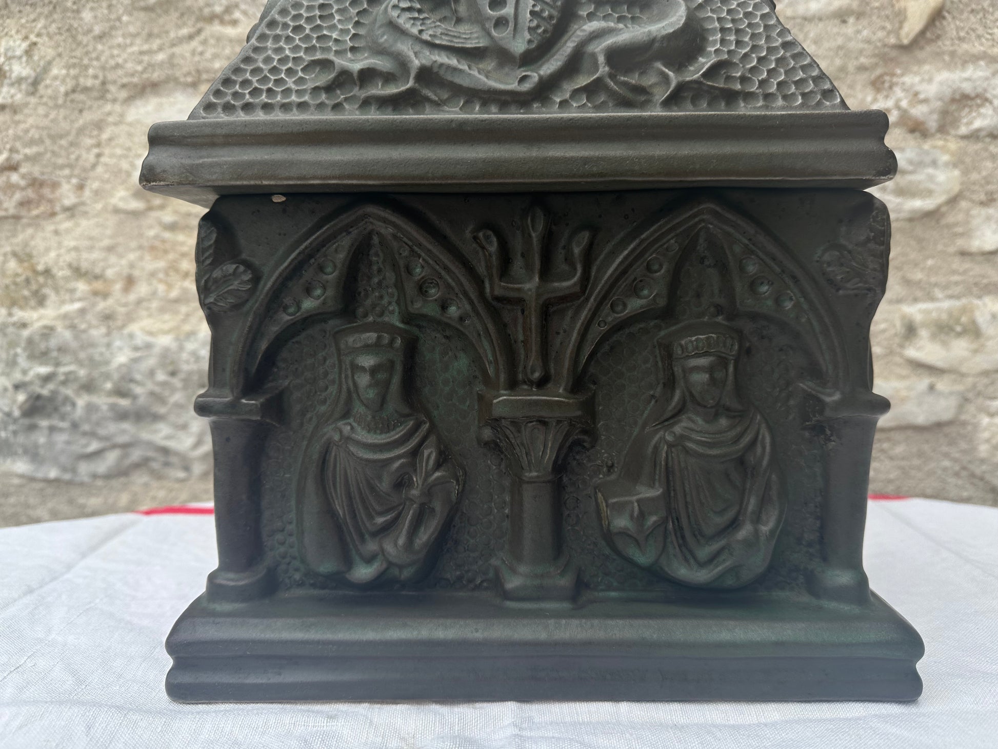 The Gothic Revival pottery casket is a striking decorative piece, reflecting the ornate and mystical elements characteristic of the Gothic Revival style. This casket is crafted from pottery and features a lid adorned with a detailed coat of arms, around which fierce griffins are intricately sculpted, symbolizing strength and guardianship. The sides of the casket are marked with bold crosses, emphasizing its gothic influence and adding a touch of solemnity. The front and back of the casket are embellished with sculpted figures, possibly depicting medieval or religious icons, adding depth and narrative to the piece. The casket’s design is rich with texture and elaborate patterns, evoking a sense of antiquity and reverence. It serves as both a functional item and a work of art, capturing the essence of the Gothic Revival movement with its intricate symbolism and craftsmanship.