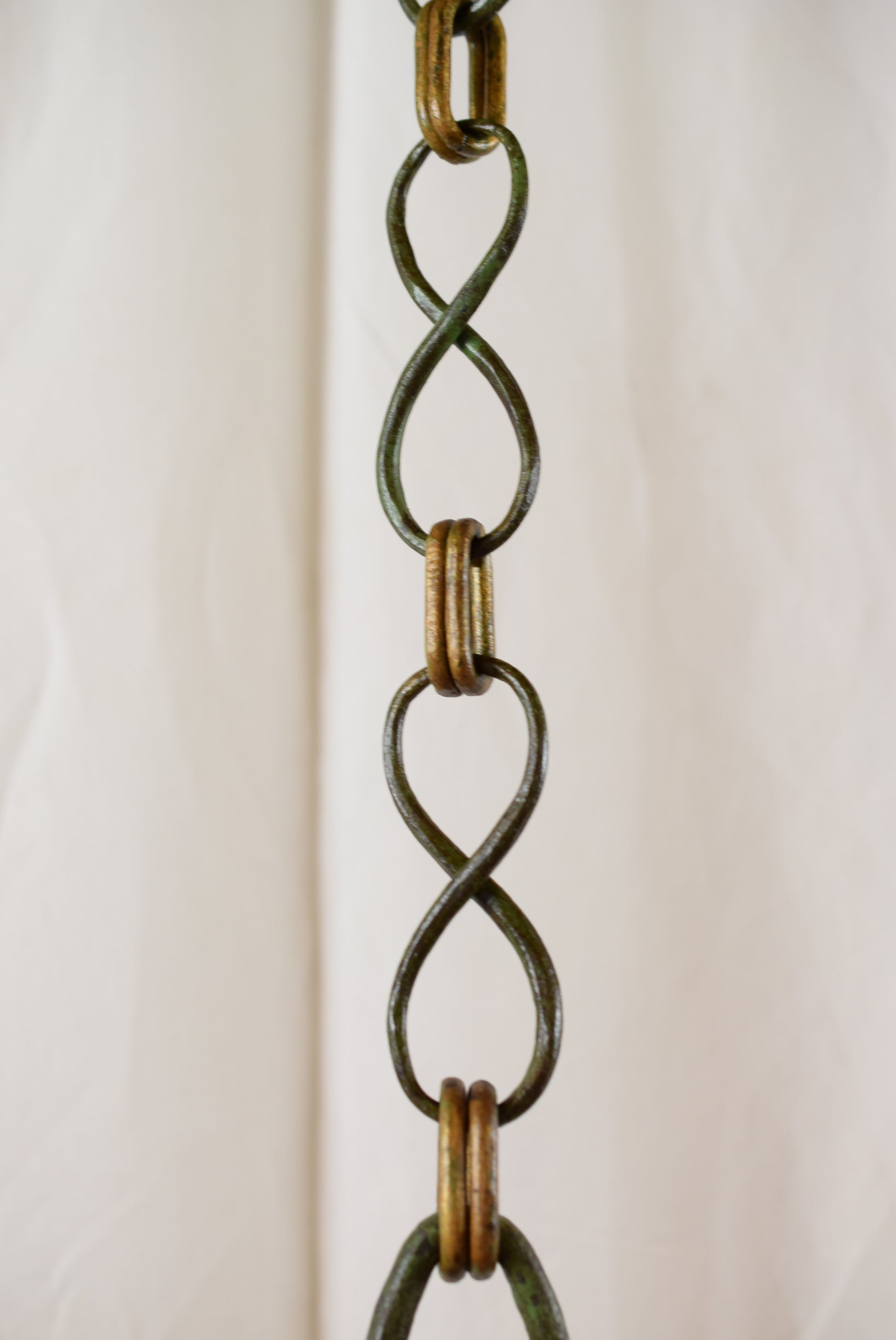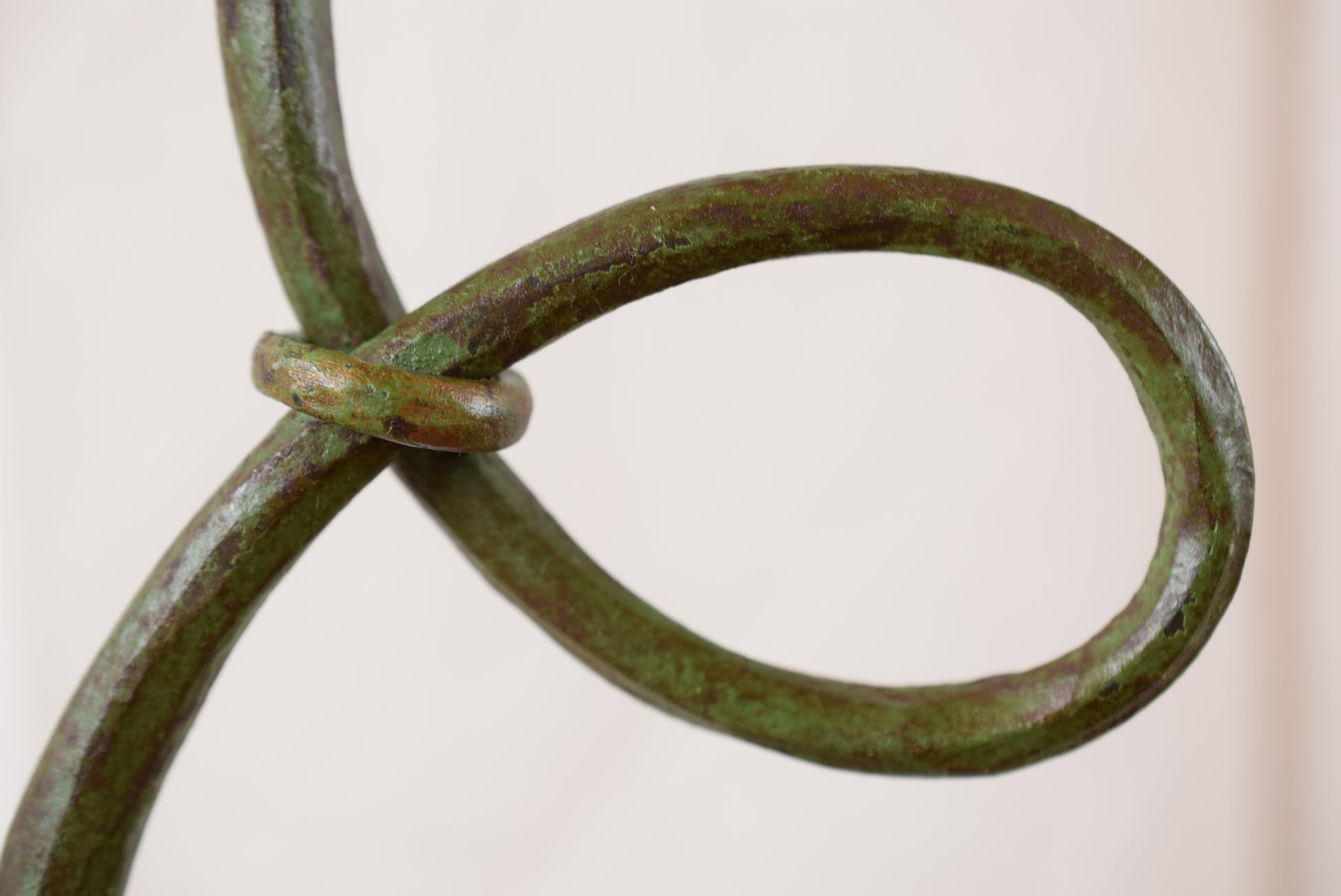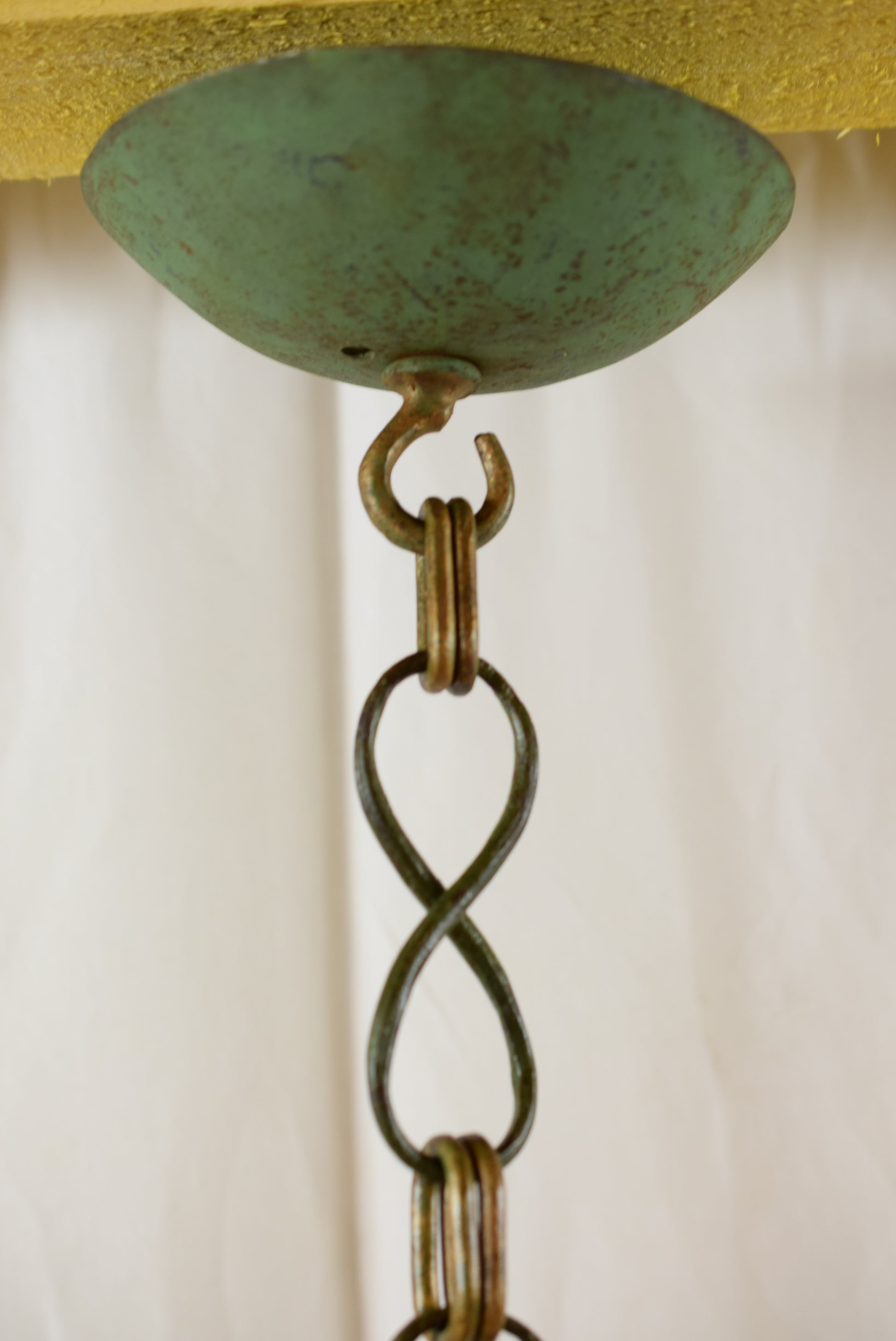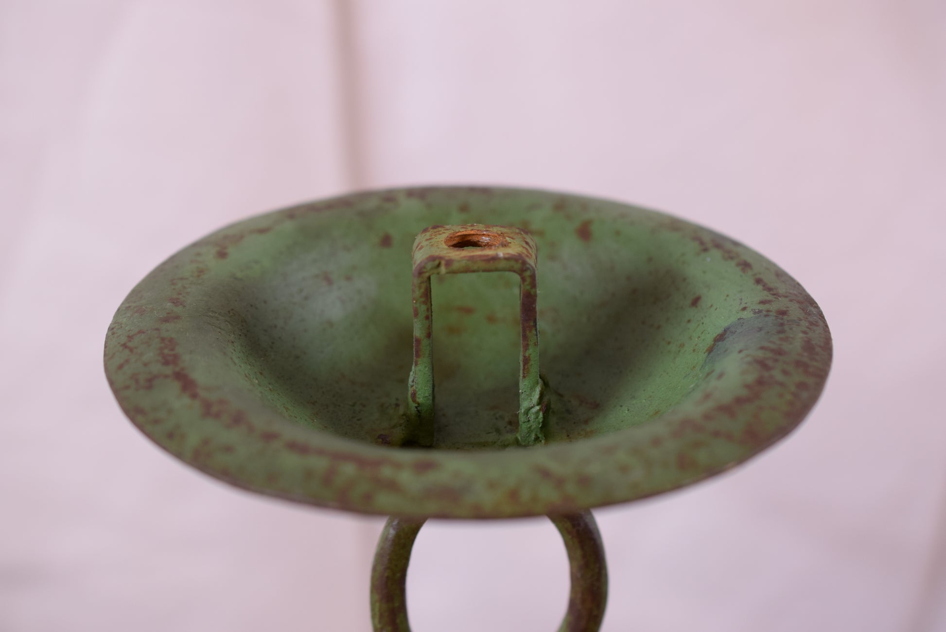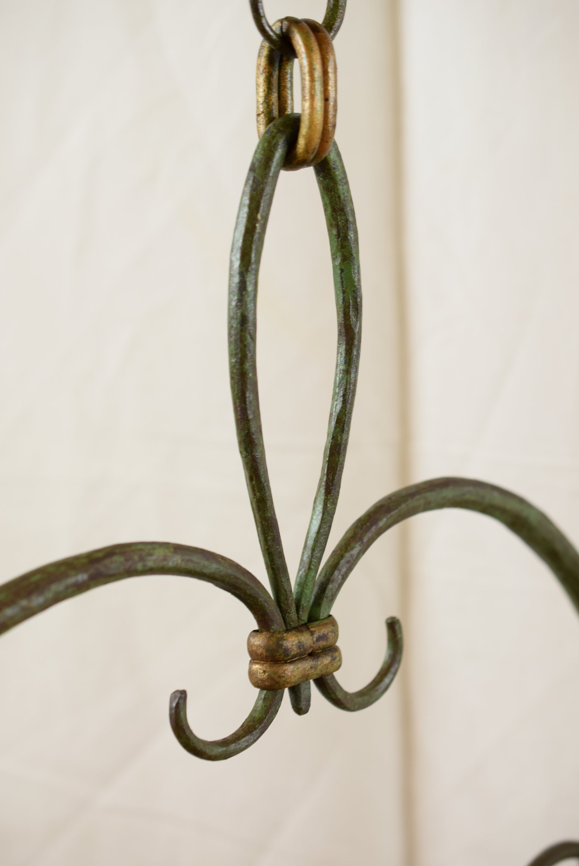 A gorgeous French antique hand made lamp from the early 20th century. The Arts & Craft light is made of green and gold painted wrought iron. It used to be electrified but it was not in working order, so I remove the wires. It looks great with a candle. For a candle, you would just have to add a kind of pike.
