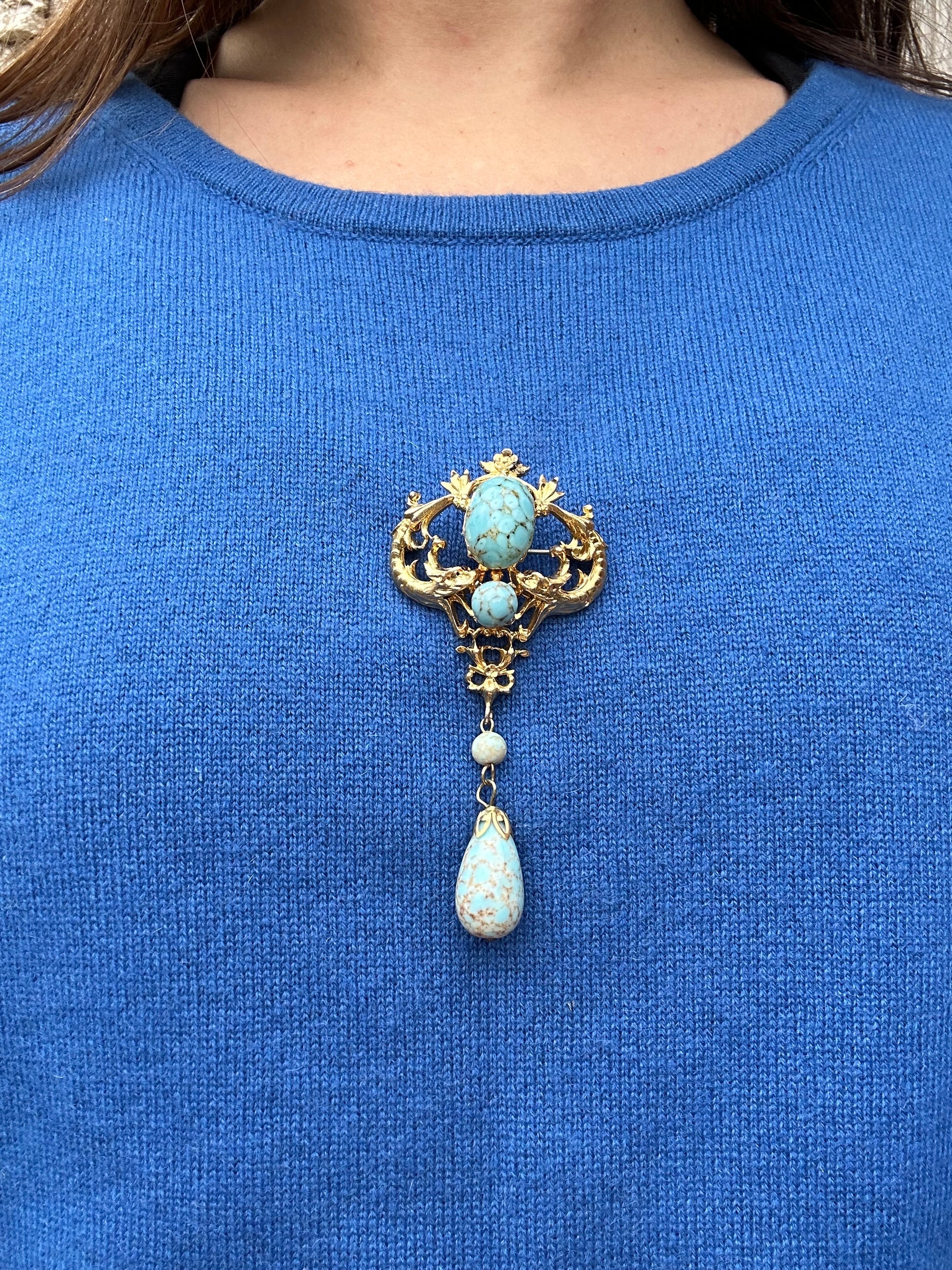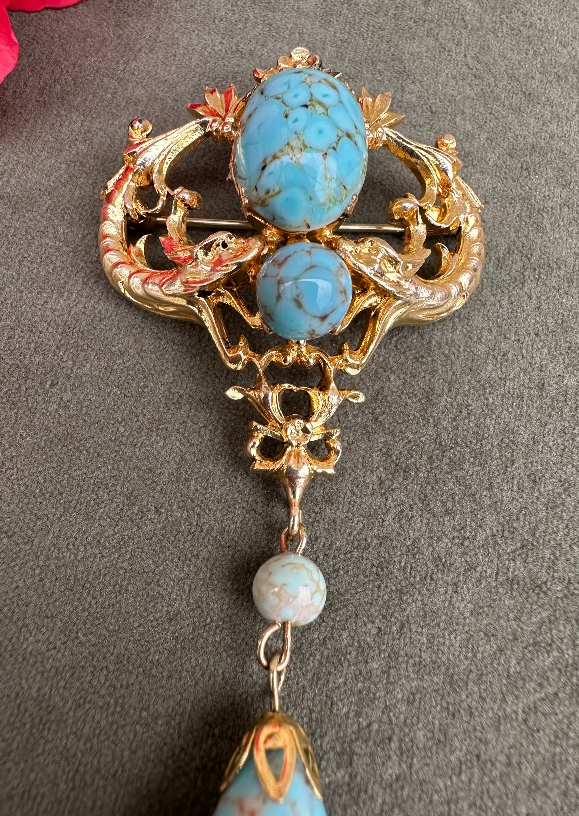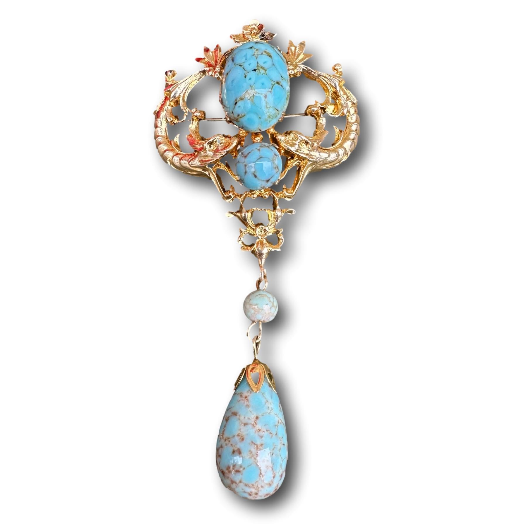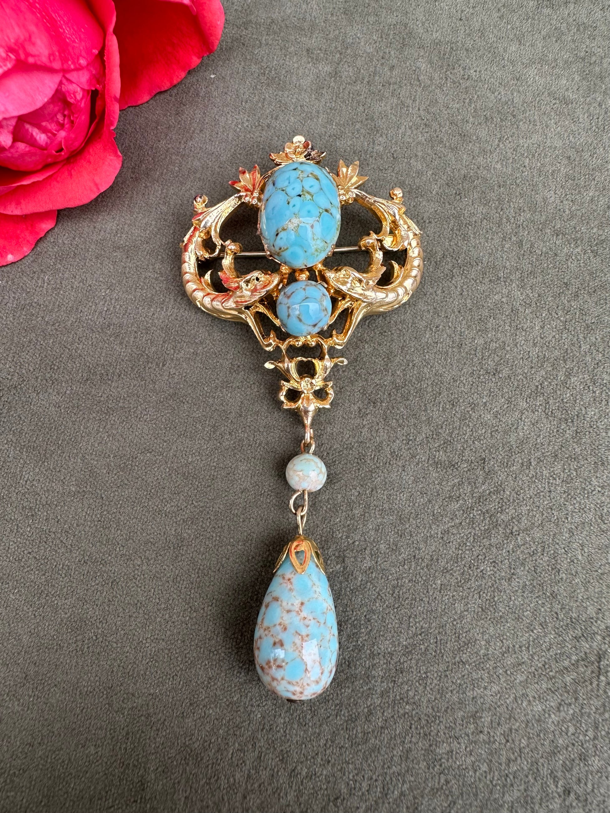 A beautiful French vintage Victorian revival brooch dating to the 1950's. The gorgeous pin features two griffins, mouths wide opened around two turquoise beads. Two other turquoise beads dangle from the pendant. This is the perfect jewelry for all lovers of vintage jewelry mixing quality and timeless design.