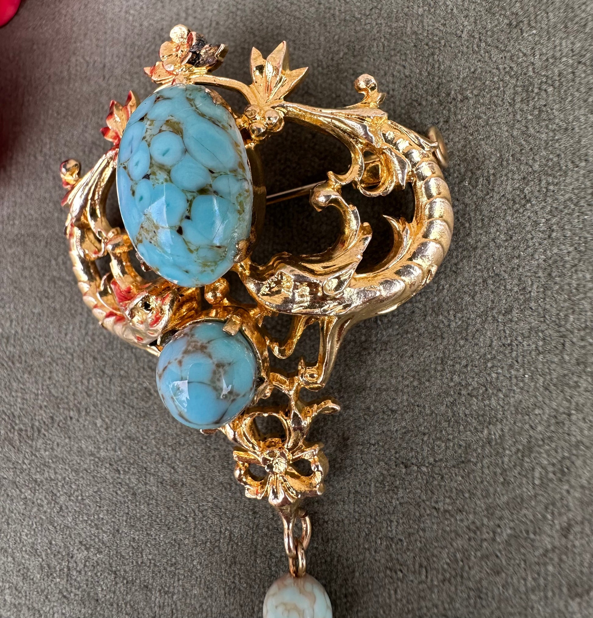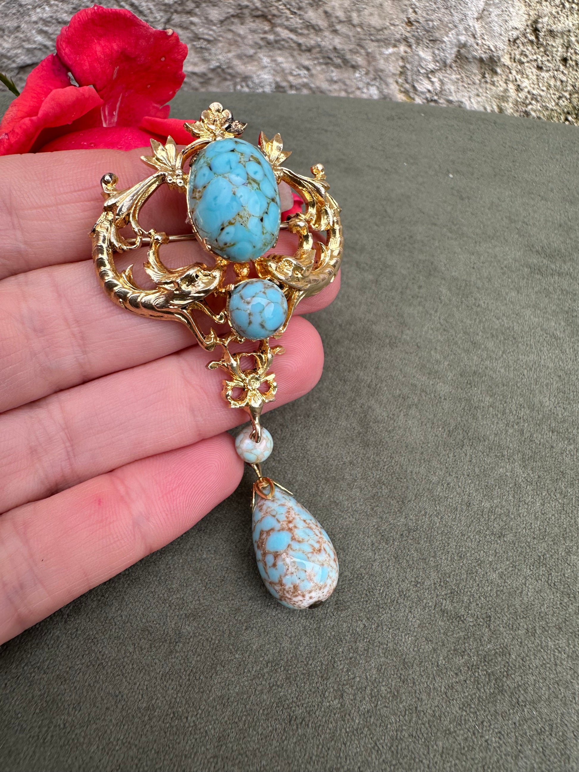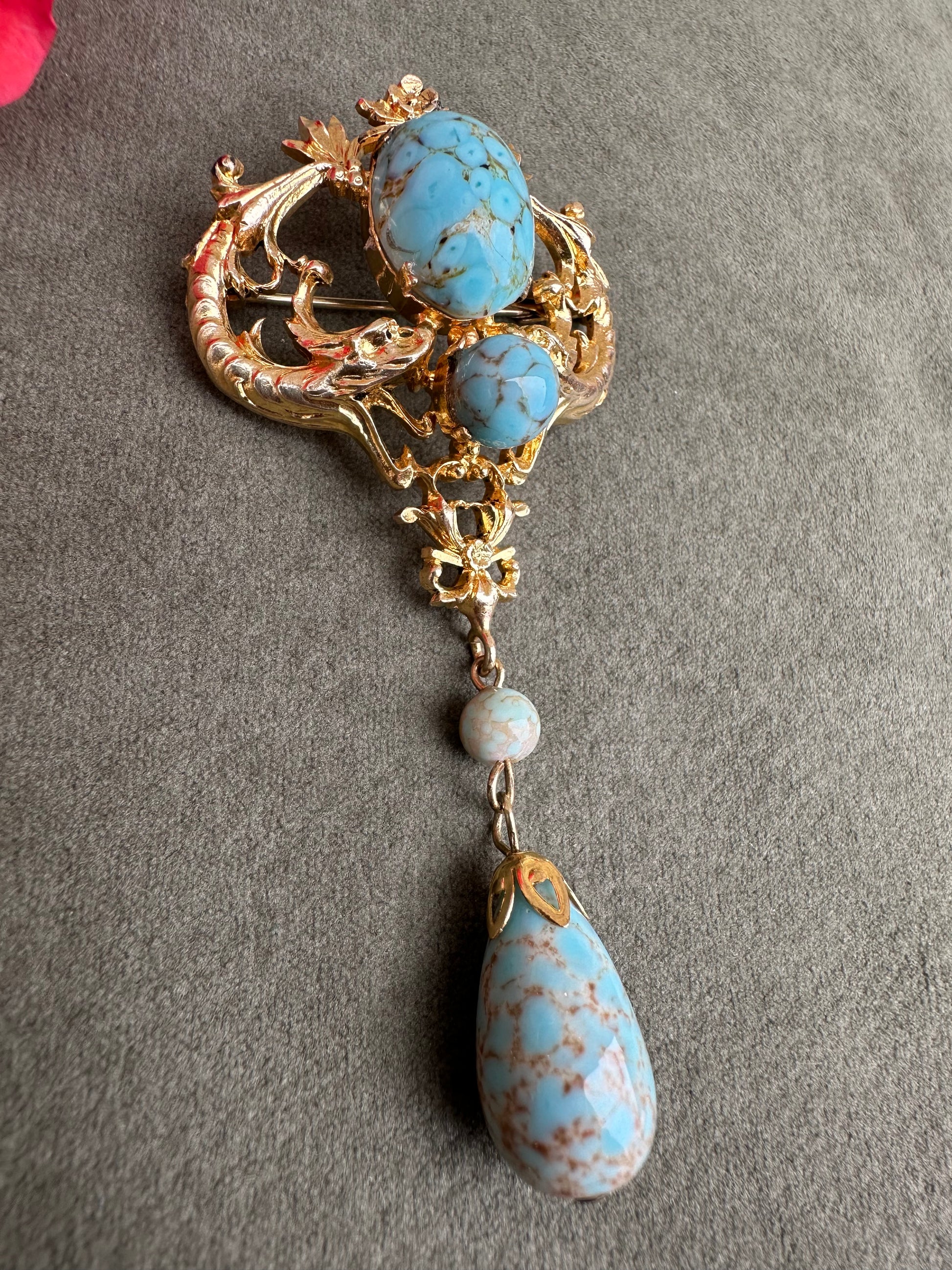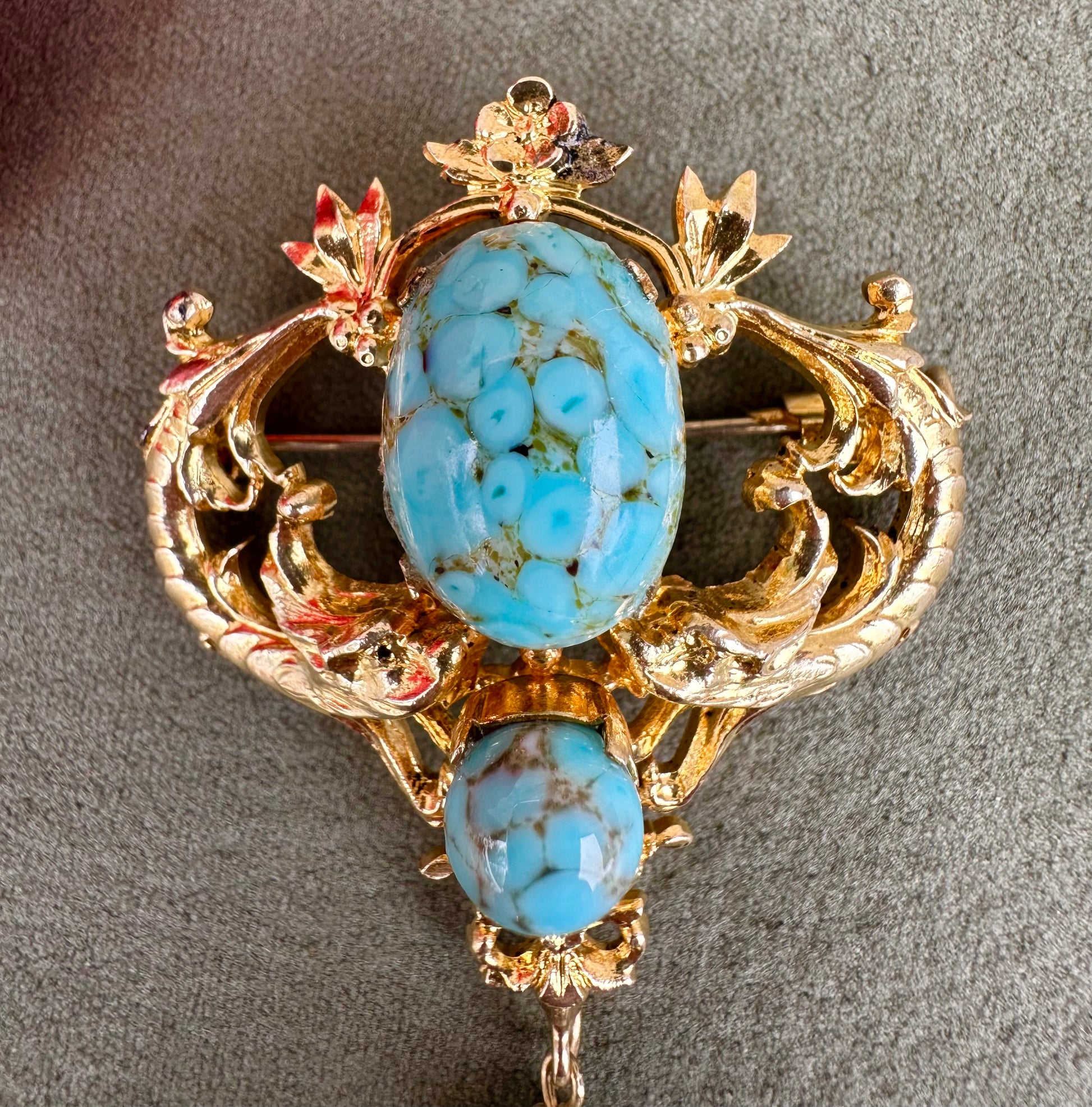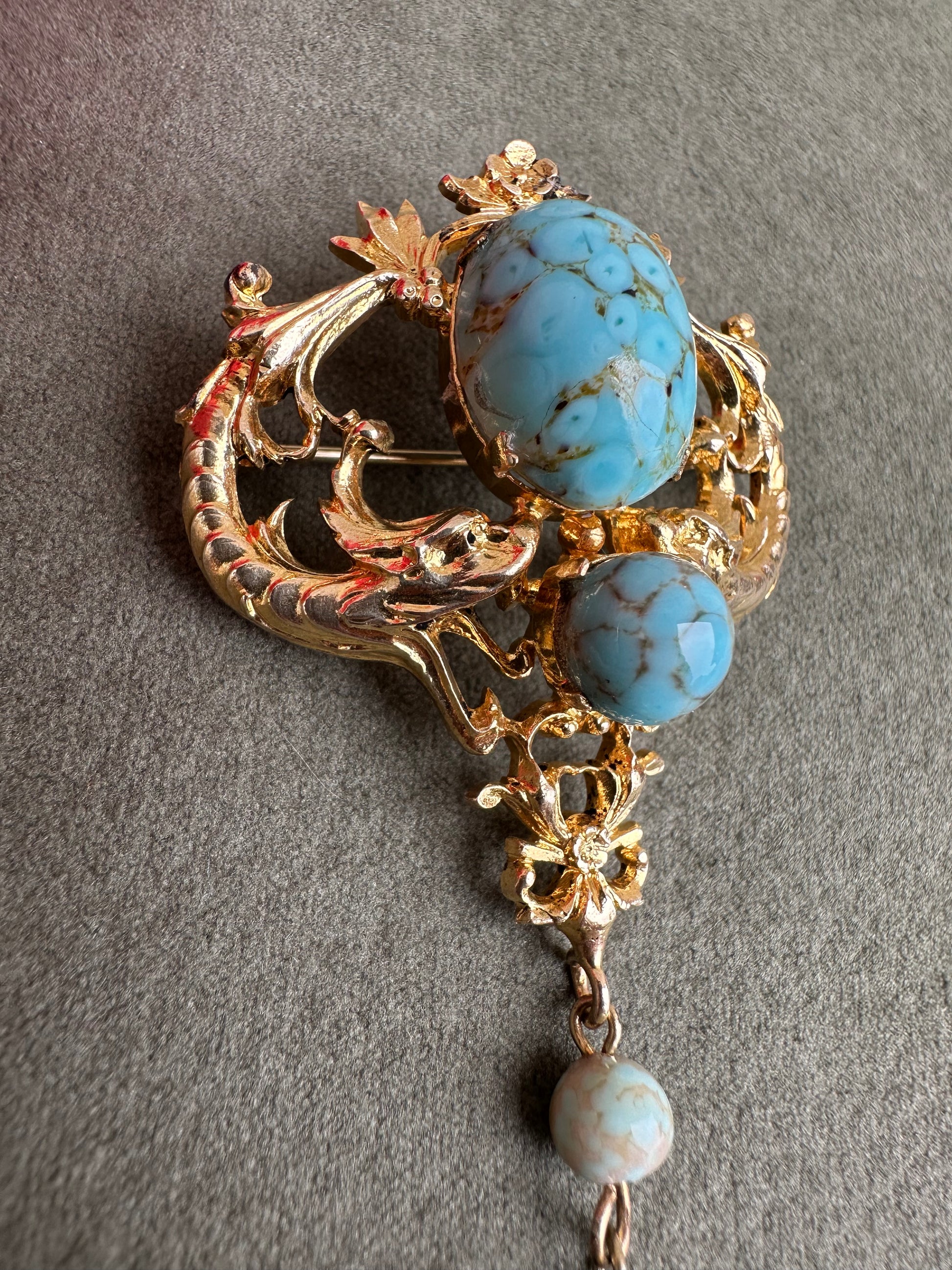 A beautiful French vintage Victorian revival brooch dating to the 1950's. The gorgeous pin features two griffins, mouths wide opened around two turquoise beads. Two other turquoise beads dangle from the pendant. This is the perfect jewelry for all lovers of vintage jewelry mixing quality and timeless design.