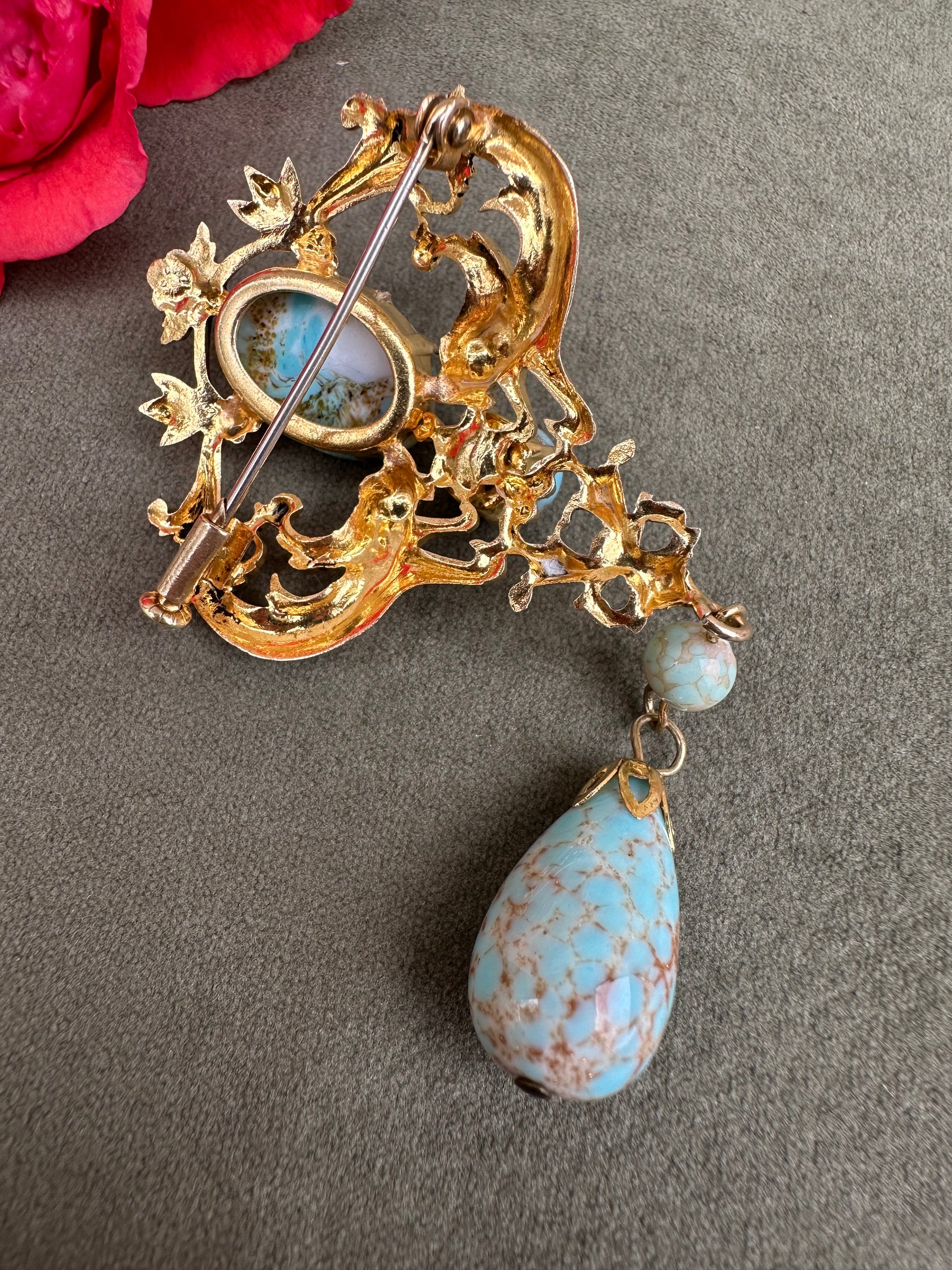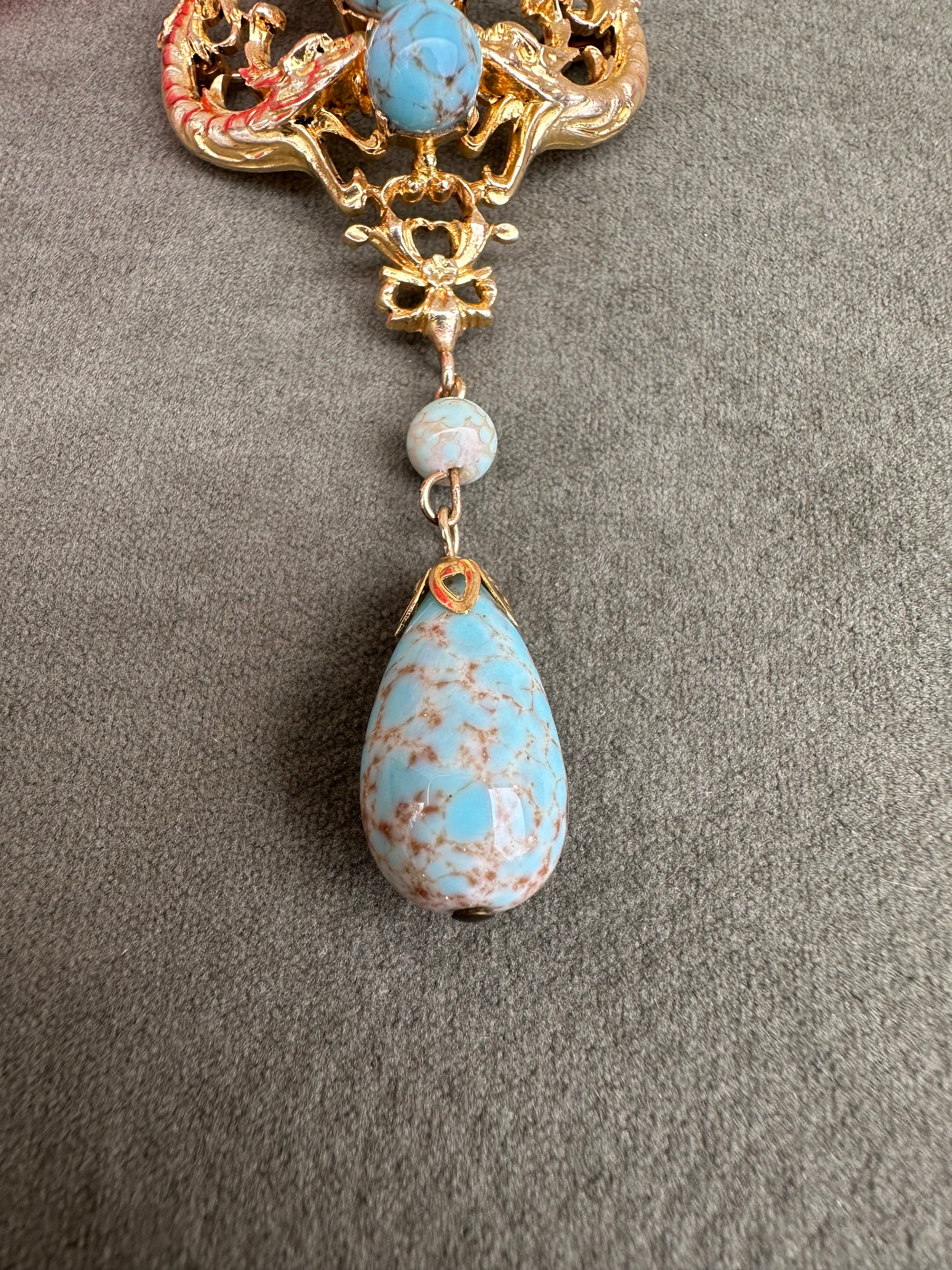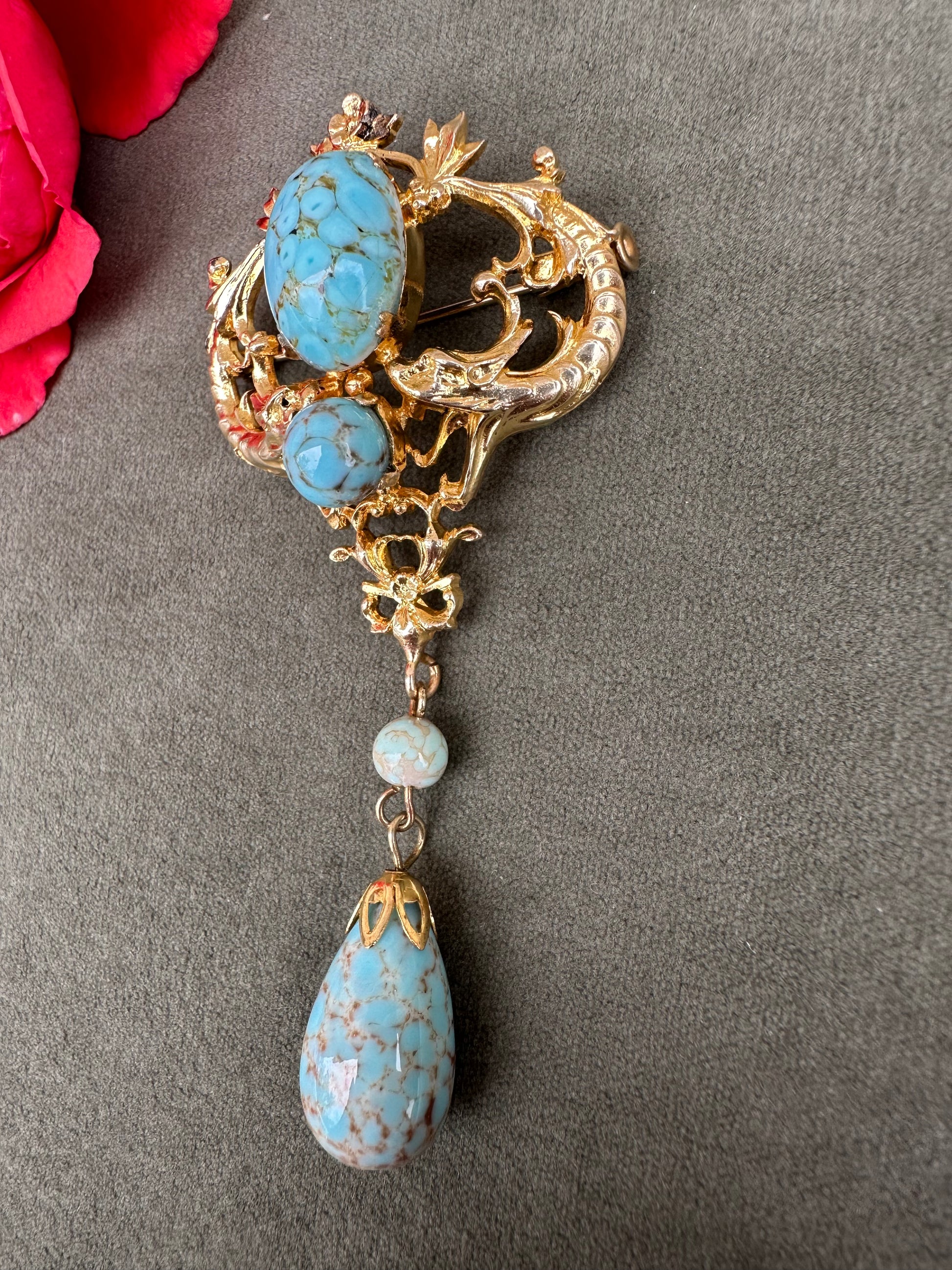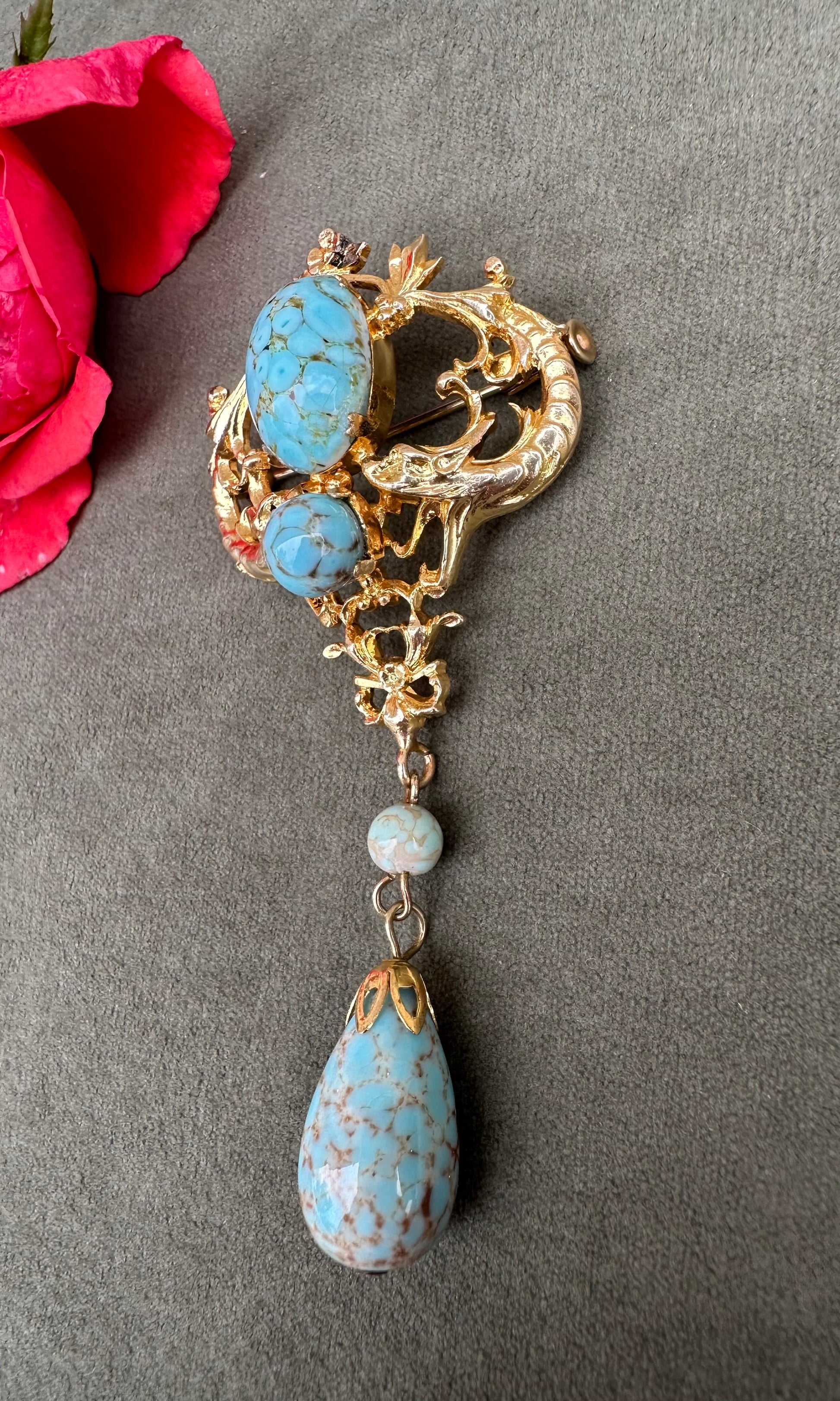 A beautiful French vintage Victorian revival brooch dating to the 1950's. The gorgeous pin features two griffins, mouths wide opened around two turquoise beads. Two other turquoise beads dangle from the pendant. This is the perfect jewelry for all lovers of vintage jewelry mixing quality and timeless design.