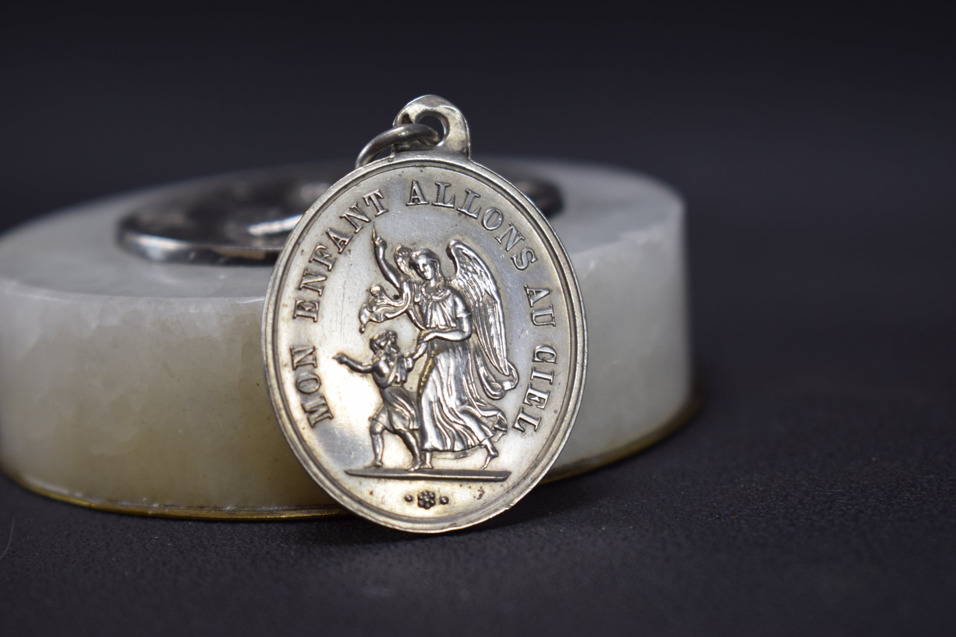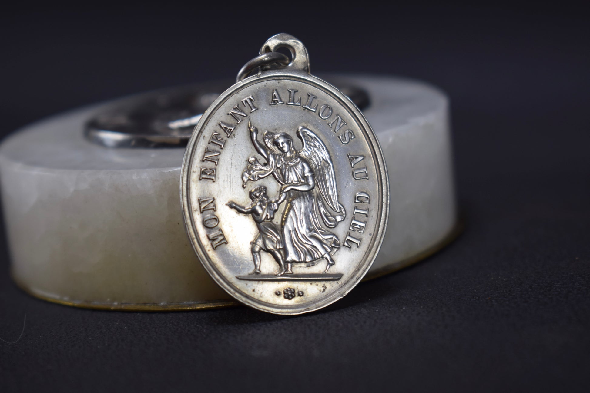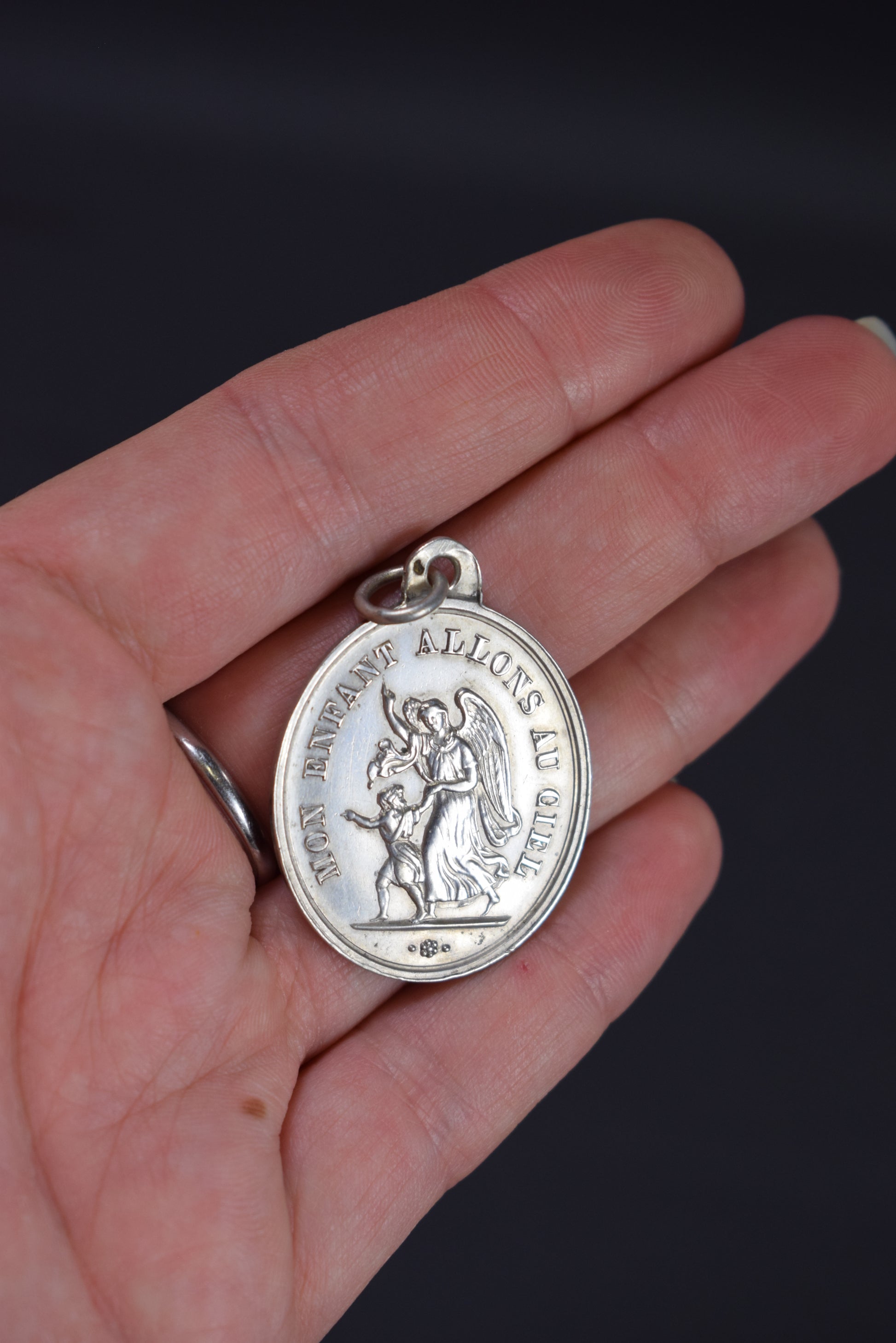 A large French antique religious medal made of solid sterling silver (harllmarked). The Catholic pendant features the Guardian Angel with a child. This design was created by the French engraver Adrien Vachette (1753-1839).