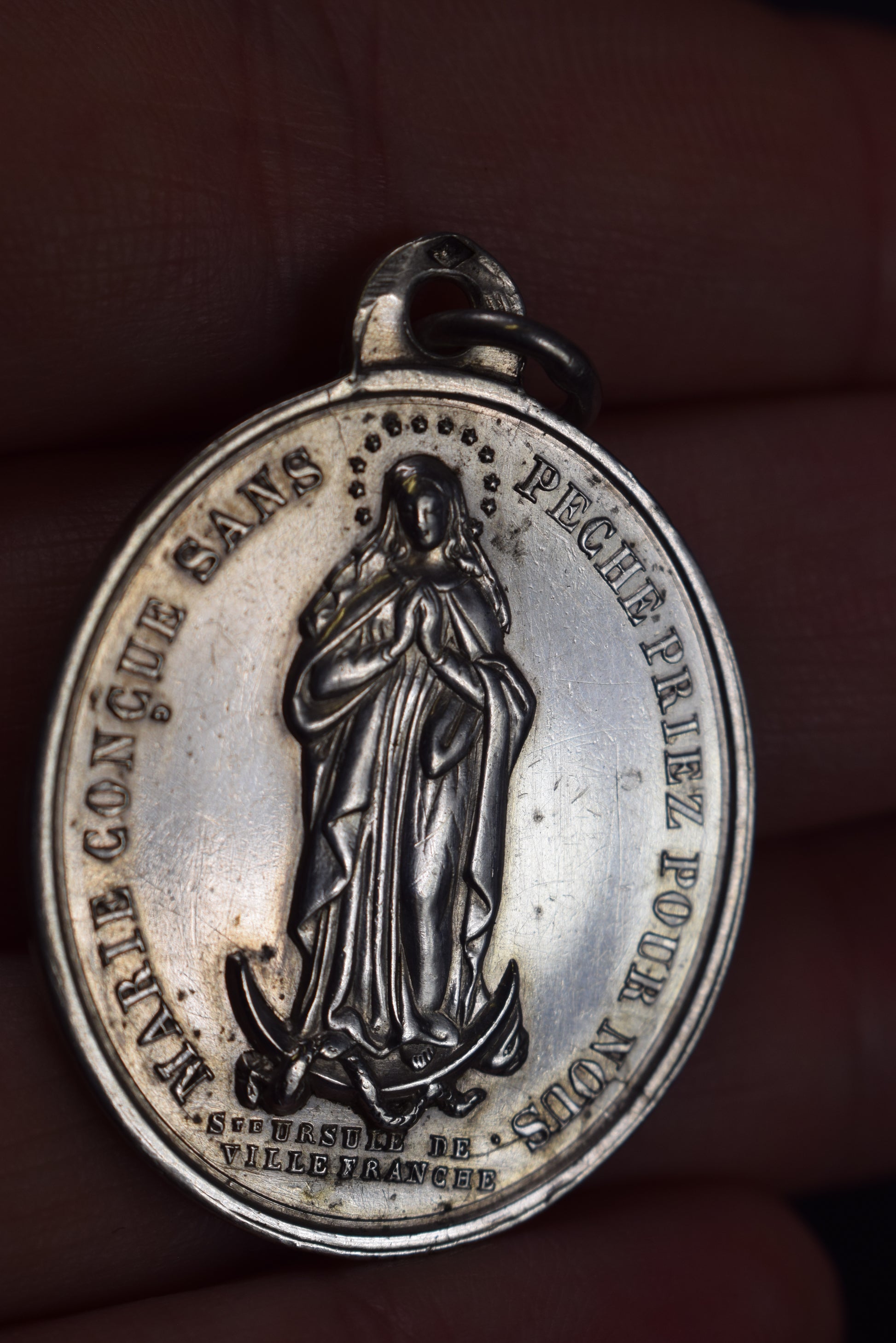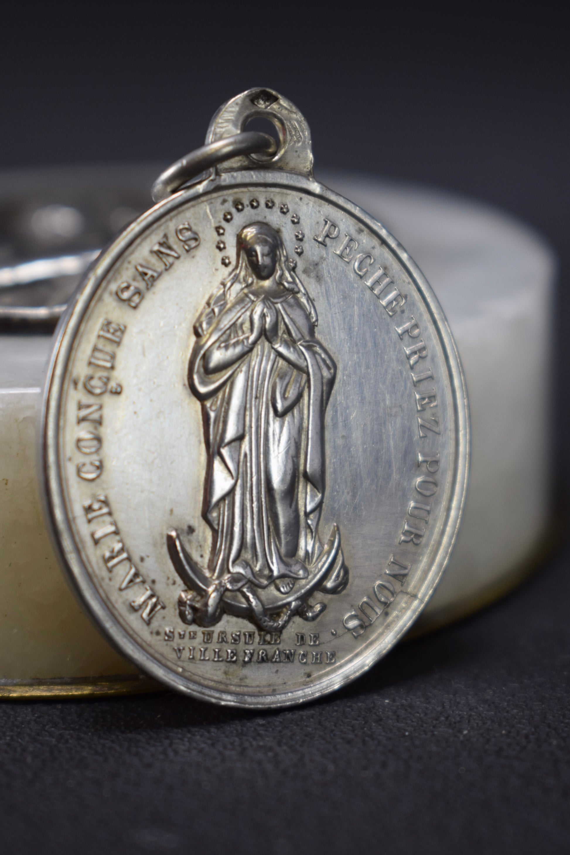 The reverse depicts Mary, standing, hand clasped, crushing the snake with her feet. At the bottom, you can read : Saint Ursula of Villefranche.
