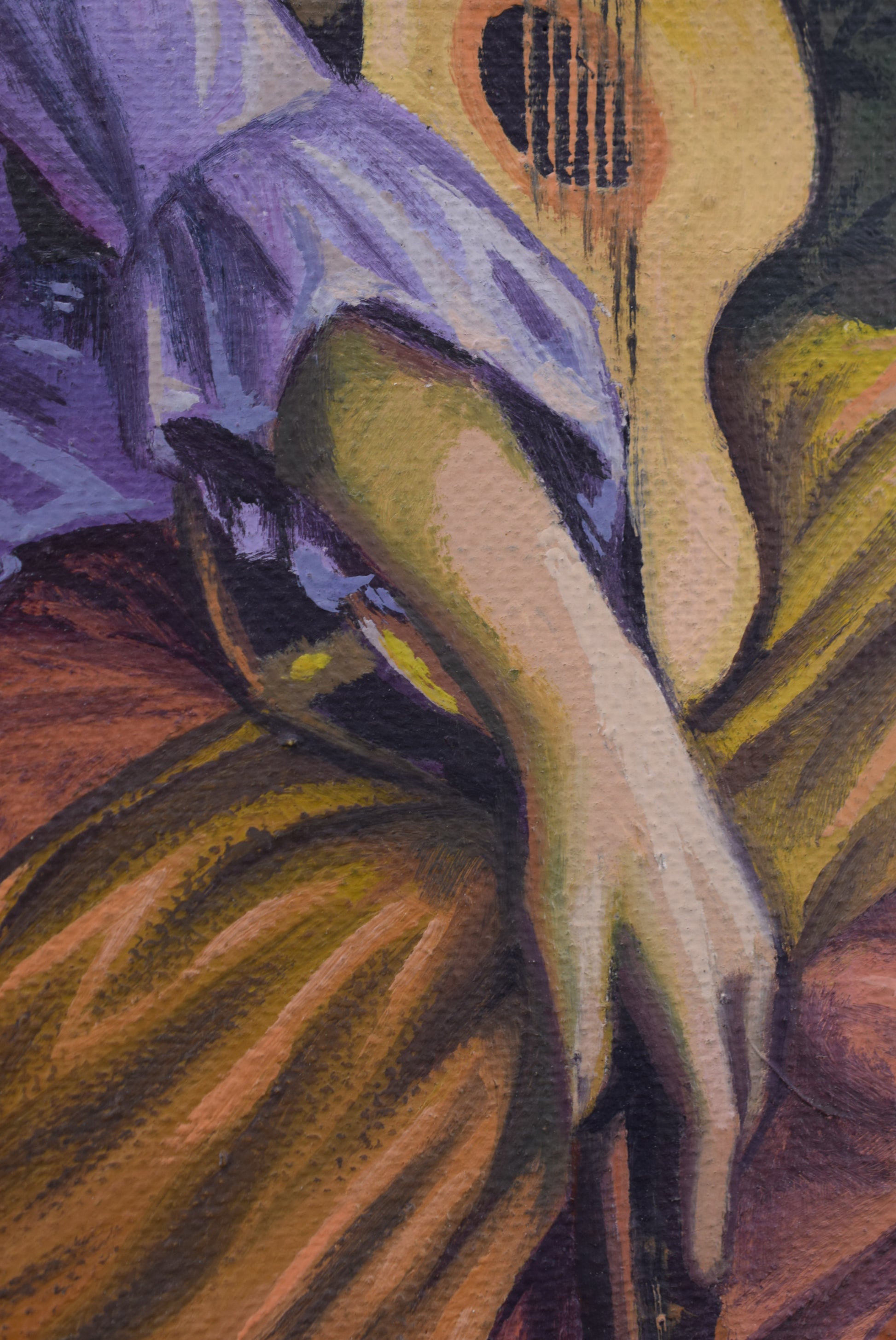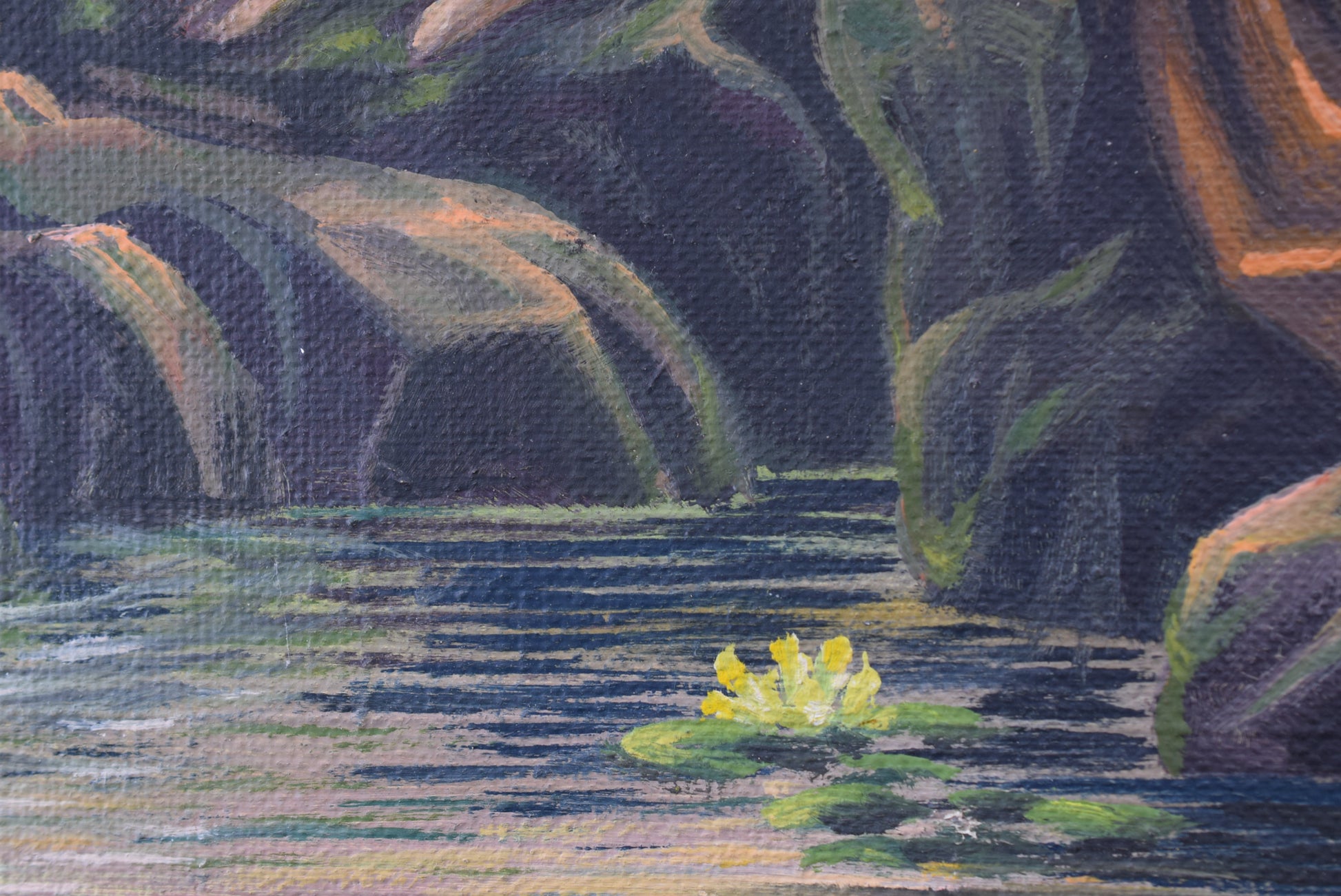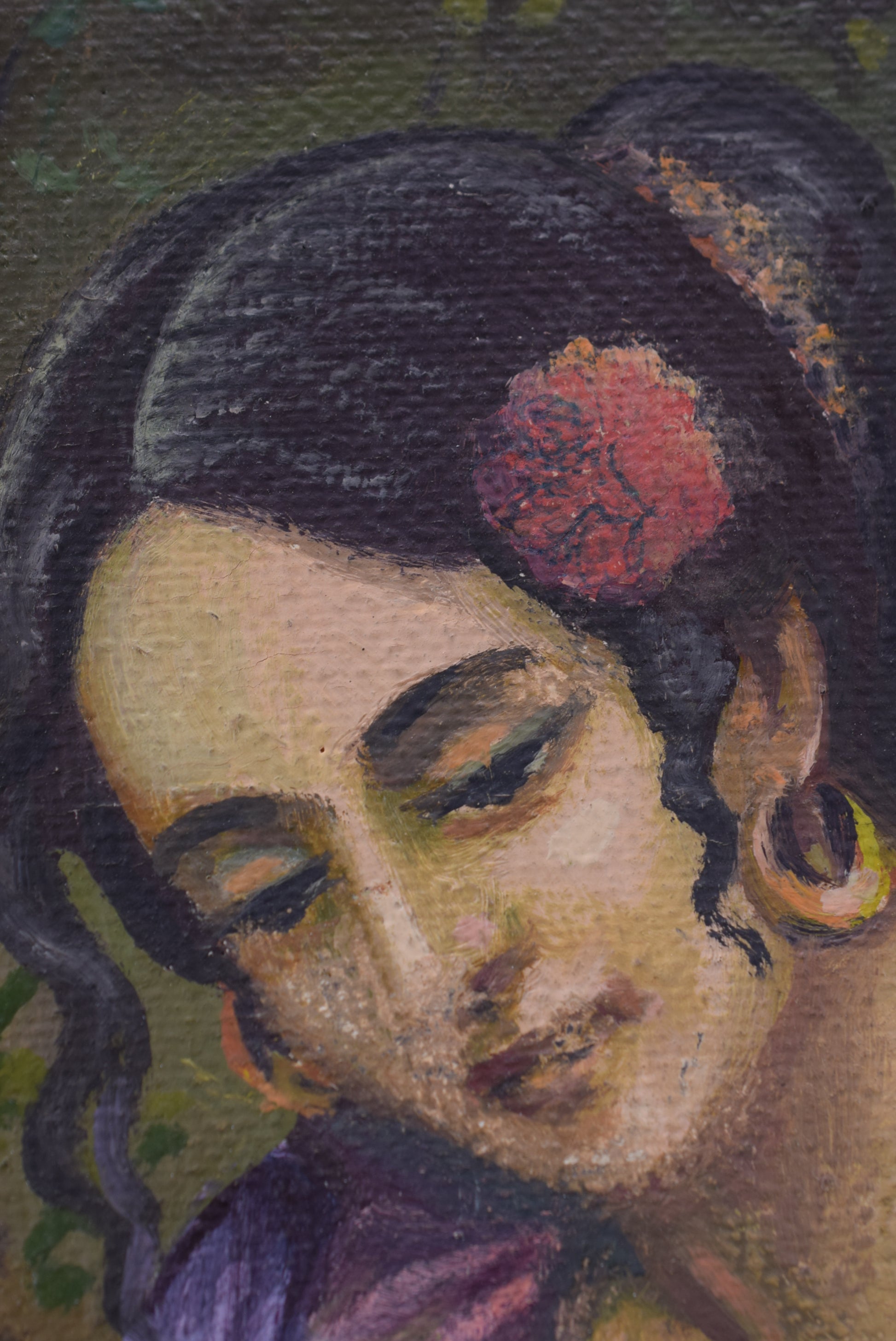 A wonderful vintage oil painting painted on canvas dating to the 1970's. The original art features a woman, a gypsy holding a guitare, seated near a river in a forest. The work of art has been signed by the artist on the left bottom corner: K.Posiuszny and dated 1976.