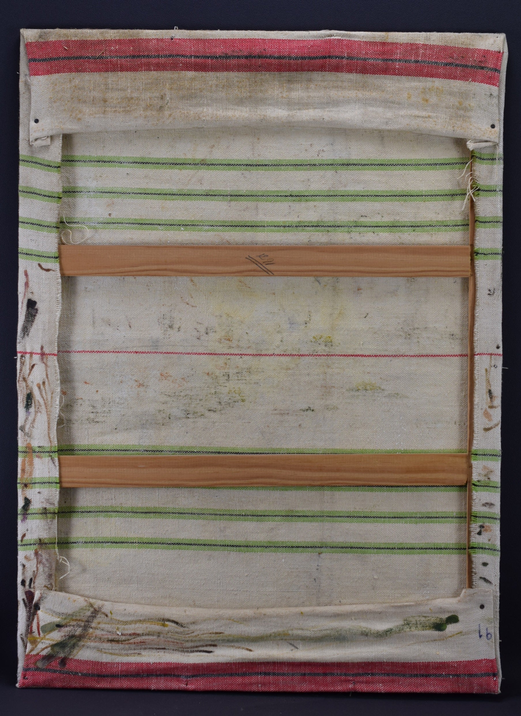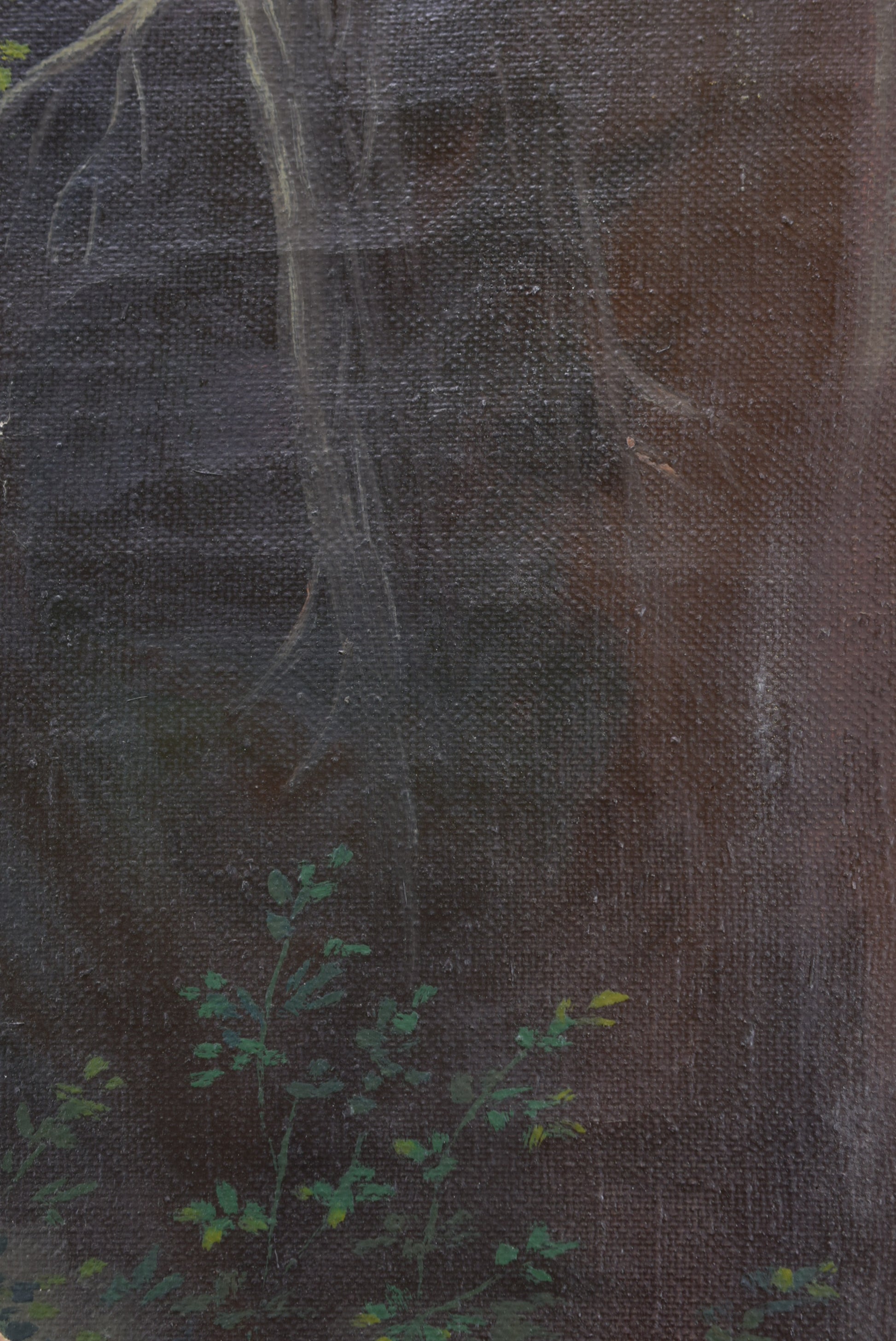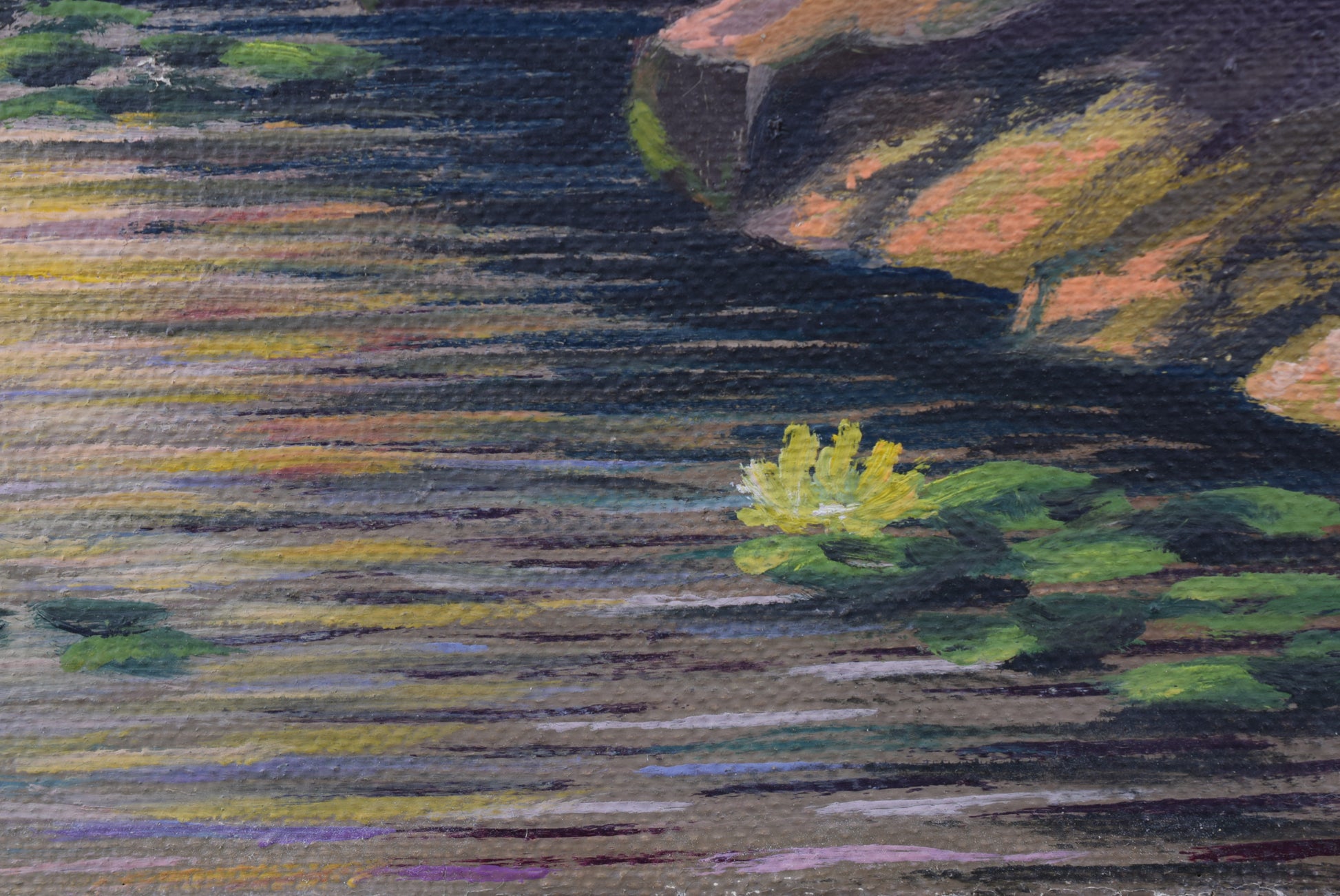 A wonderful vintage oil painting painted on canvas dating to the 1970's. The original art features a woman, a gypsy holding a guitare, seated near a river in a forest. The work of art has been signed by the artist on the left bottom corner: K.Posiuszny and dated 1976.