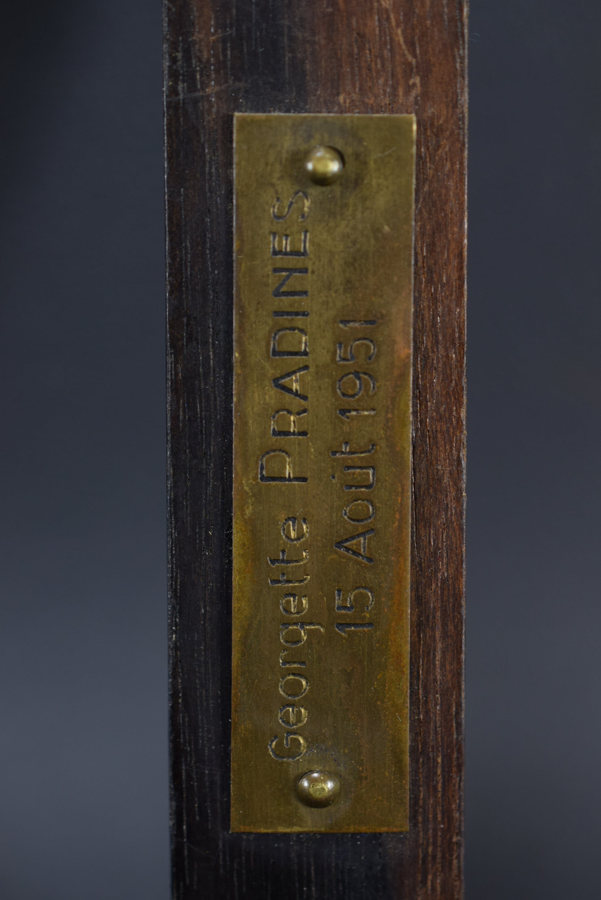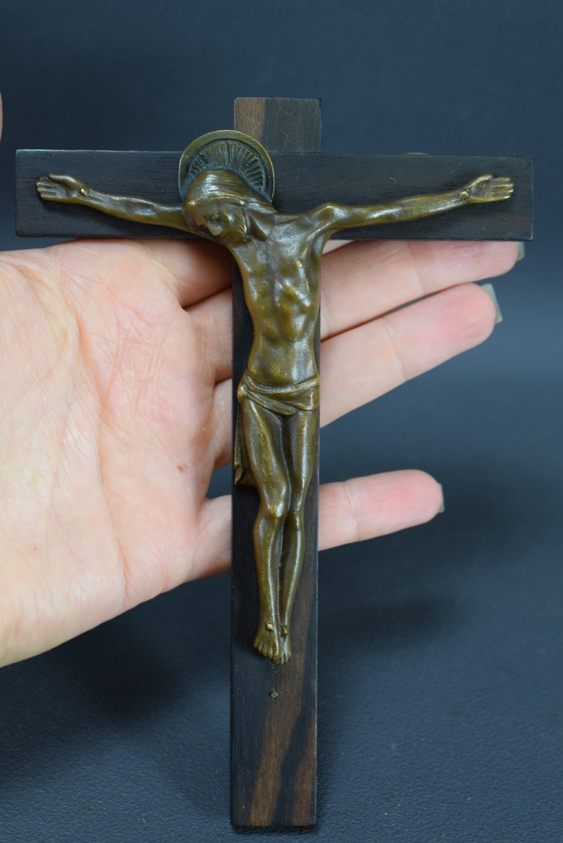 A French antique religious wall cross made of bronze and wood. Jesus Christ corpus is signed by the French artist Hartmann. This Art Deco crucifix dates from the 1950's. On the back there is a name and a date: Georgette Pradines 15 aout 1951.