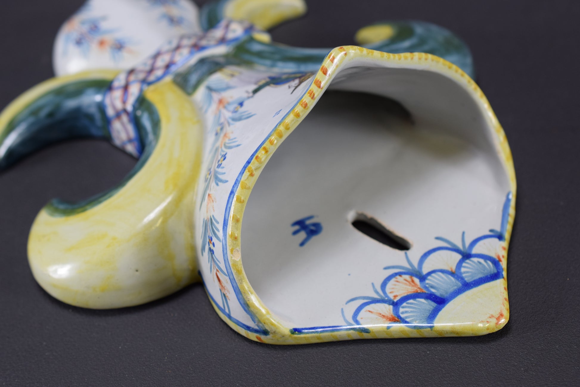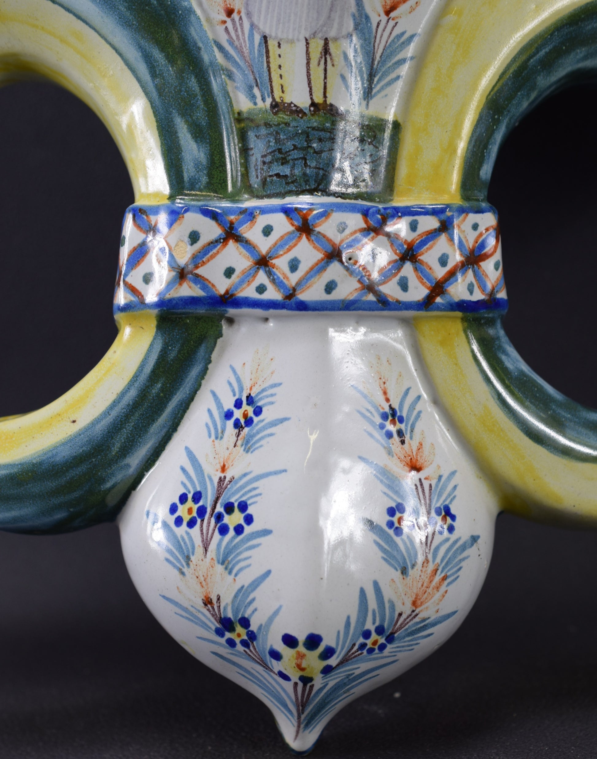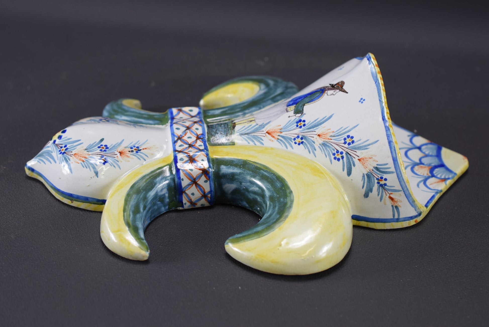 A French antique wall pocket made of hand painted earthenware. The fleur de lis shaped wall vase depicts a Breton peasant wearing traditional clothes and celtic motifs. It has been produced by the pottery factory of Henriot Quimper in the late 19th century. The HR mark is inside the wall pocket.