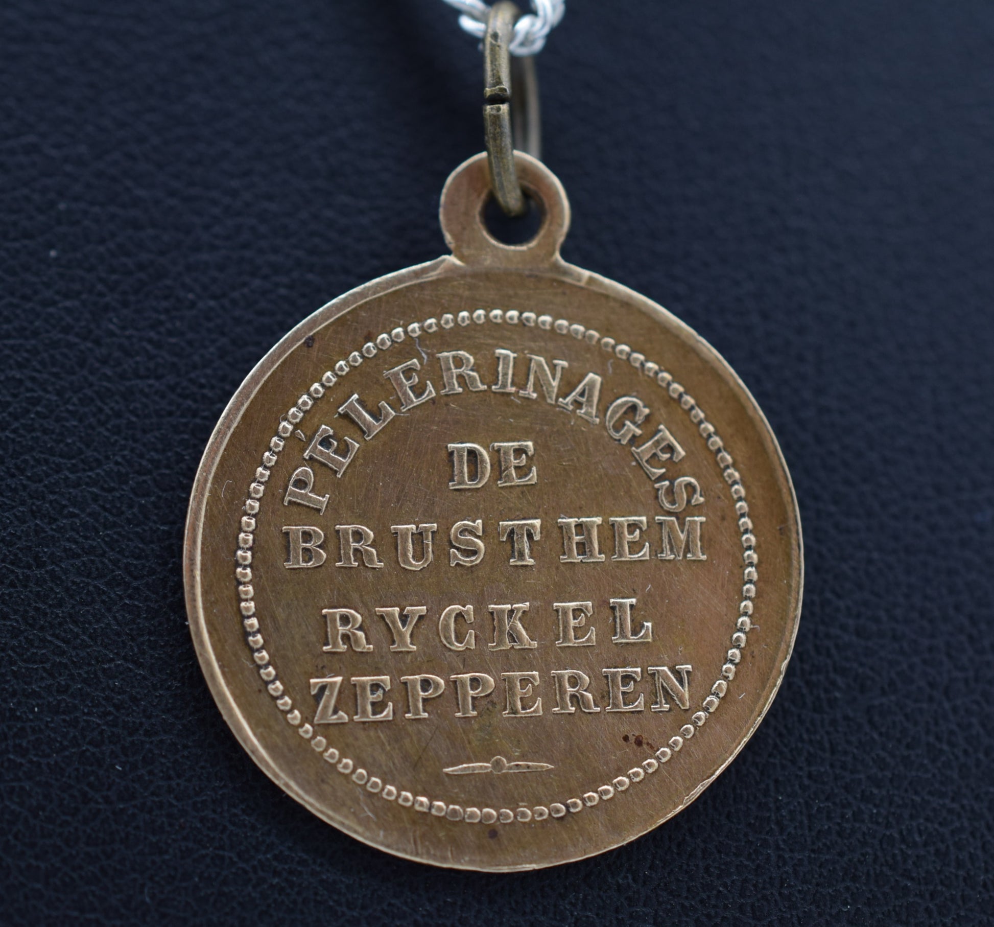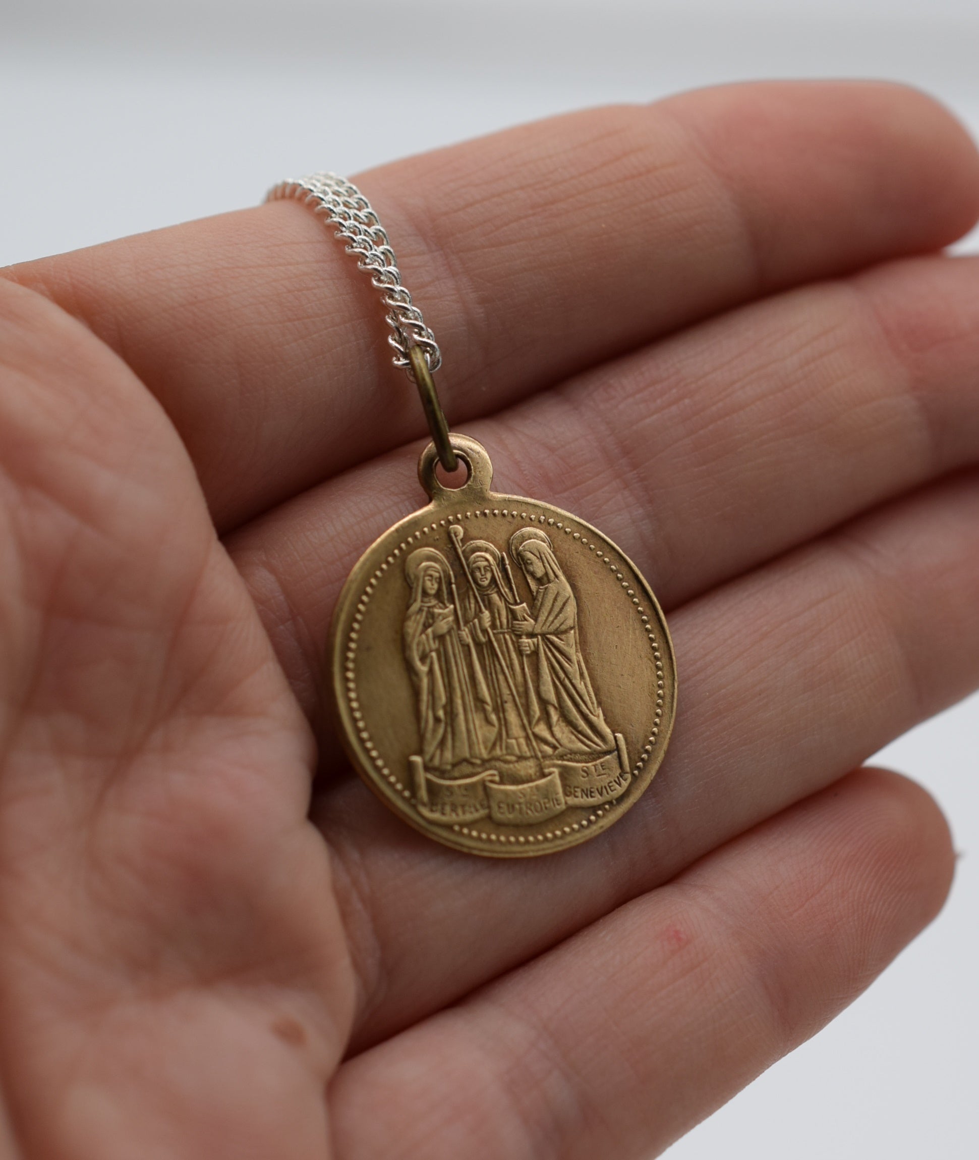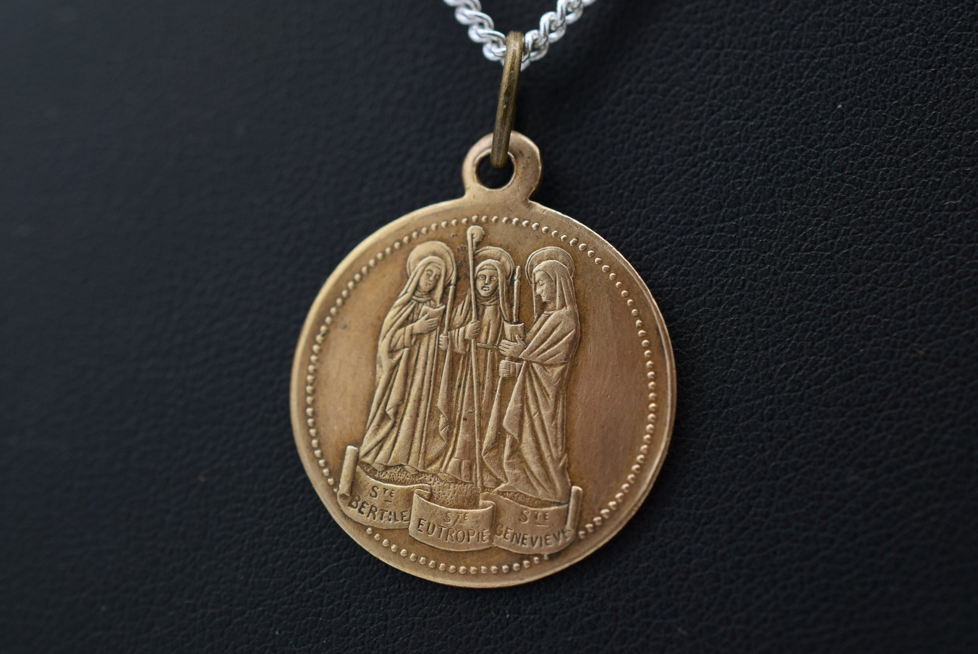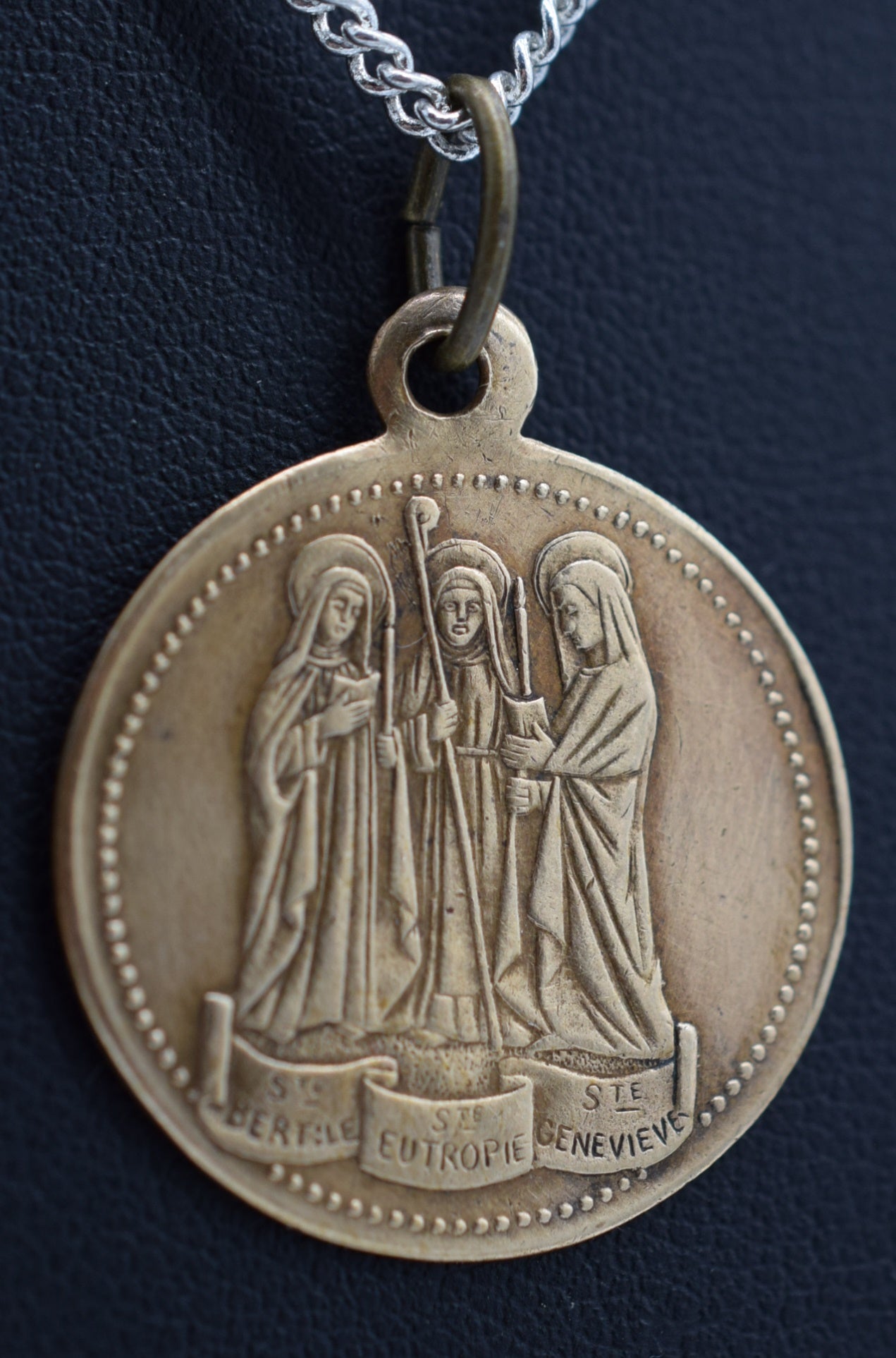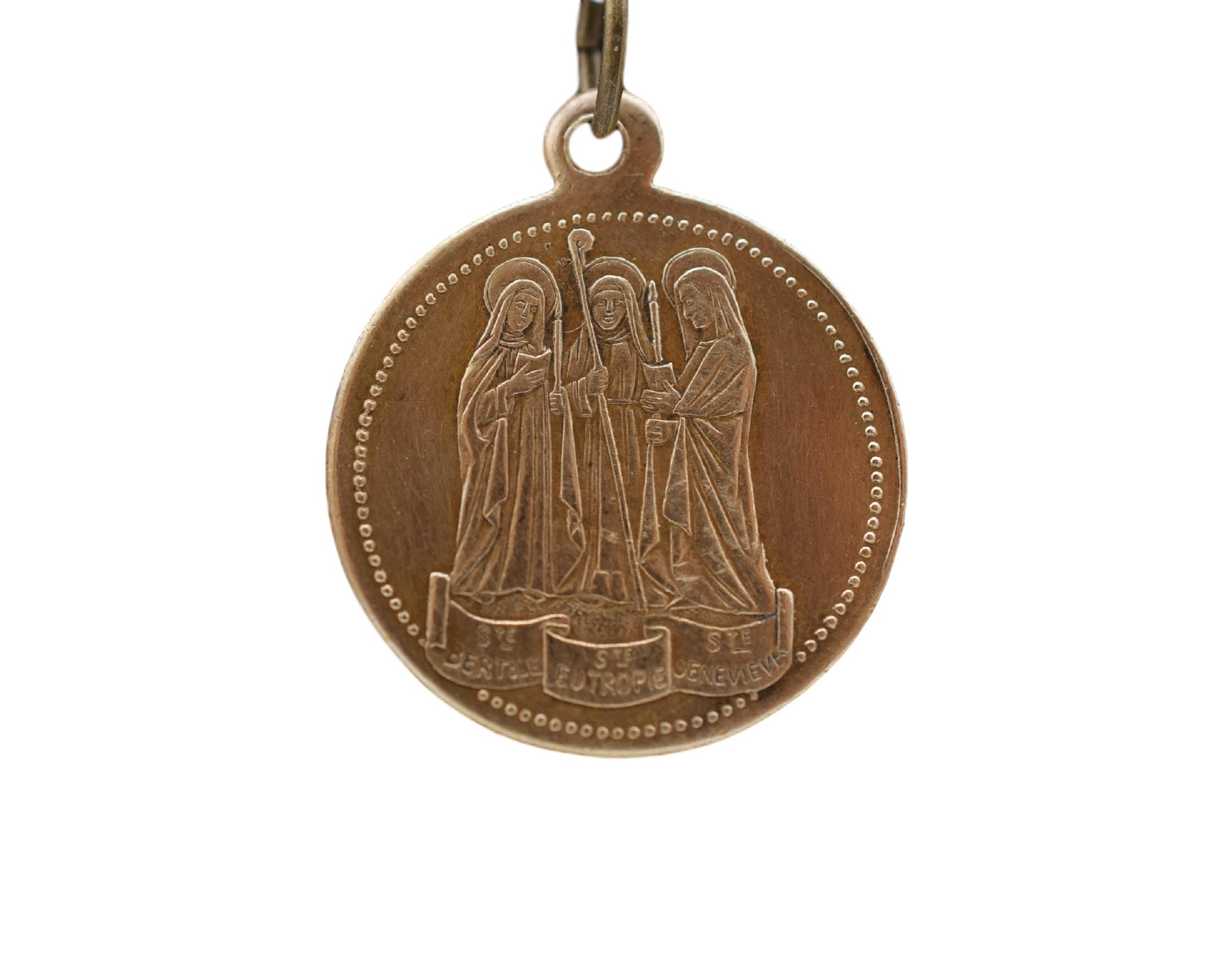 Antique Belgian religious medal dating to the early 20th century. It depicts three saints, St Bertile, St Eutropie and Saint Genevieve. All three are Holy Healers. Saint Bertille is a throat healer, Saint Eutrope cures children's diseases and Saint Genevieve is invoked against the fever.