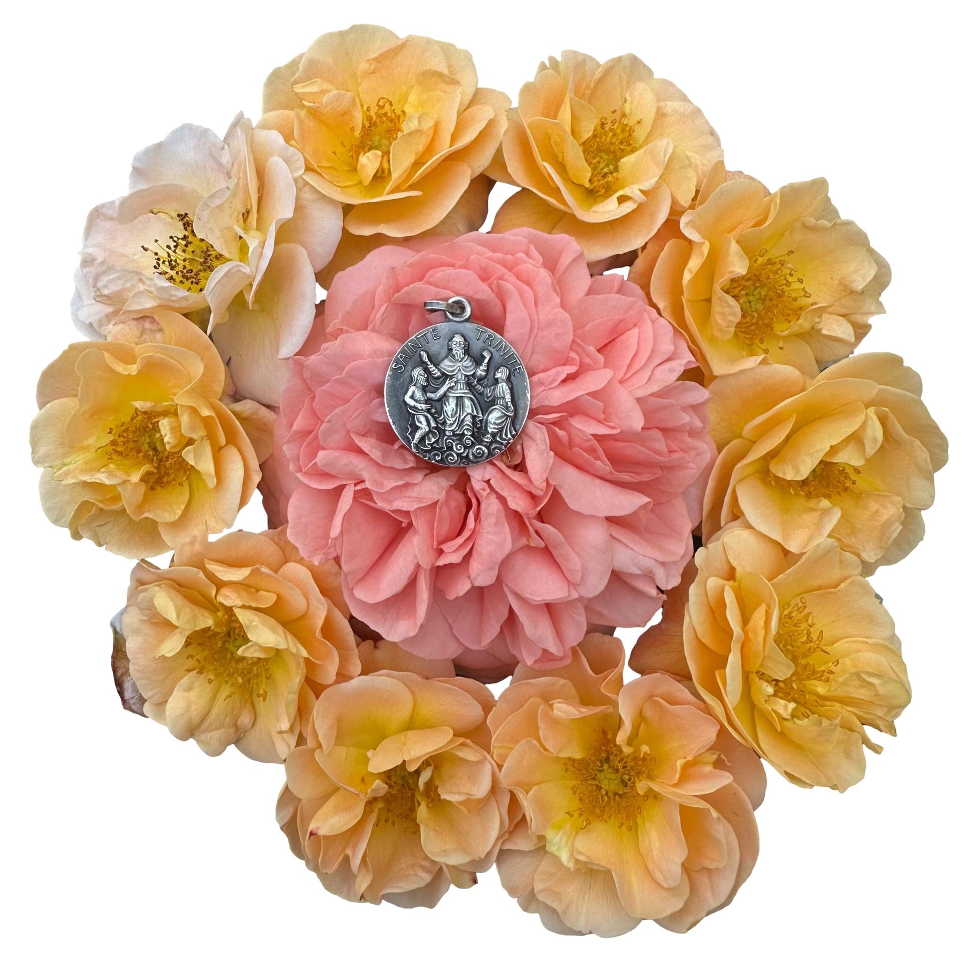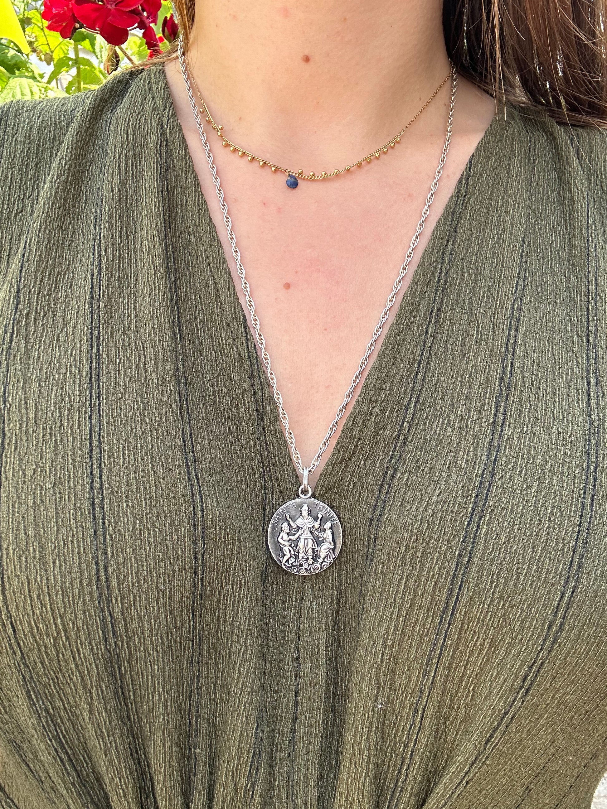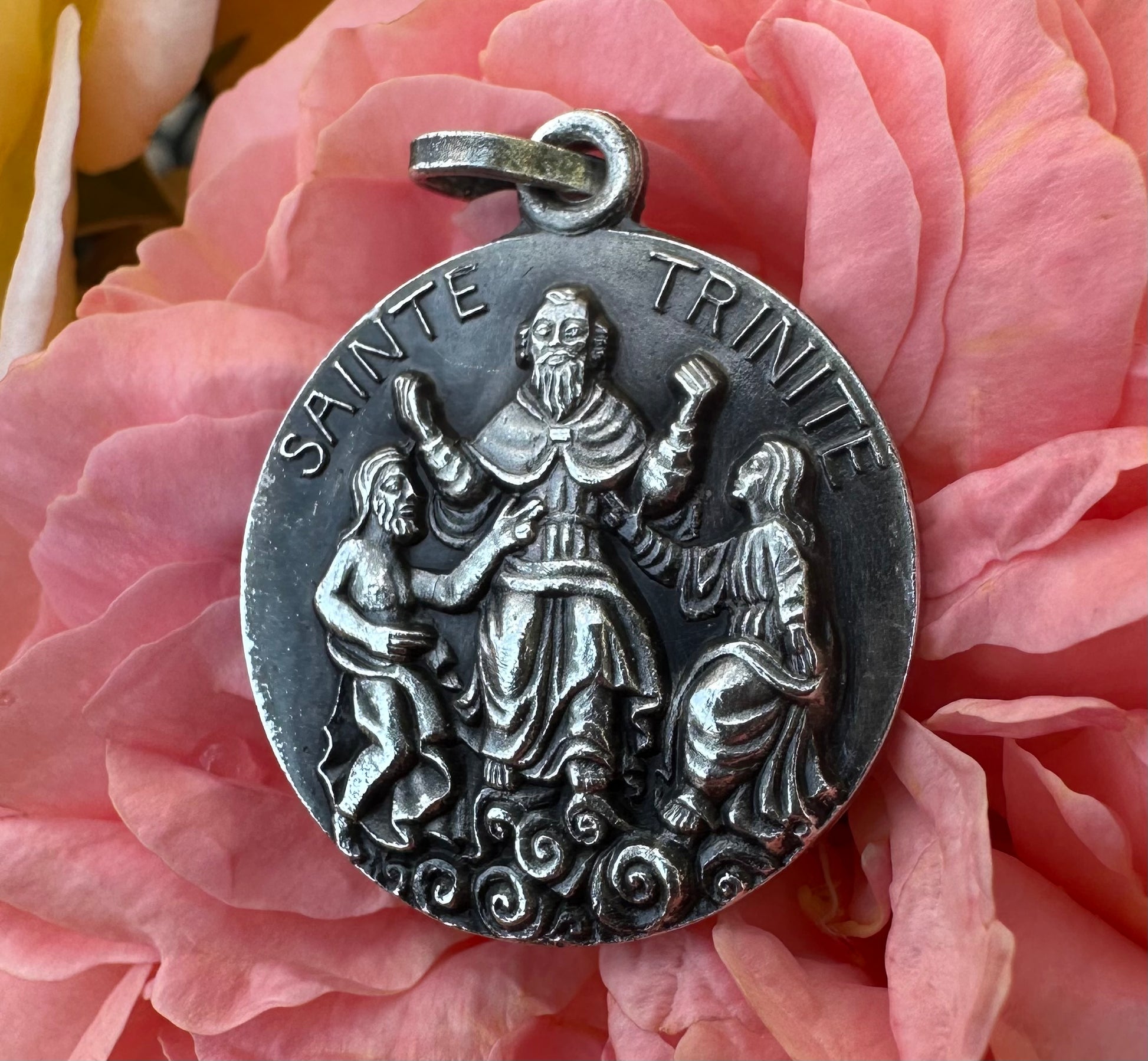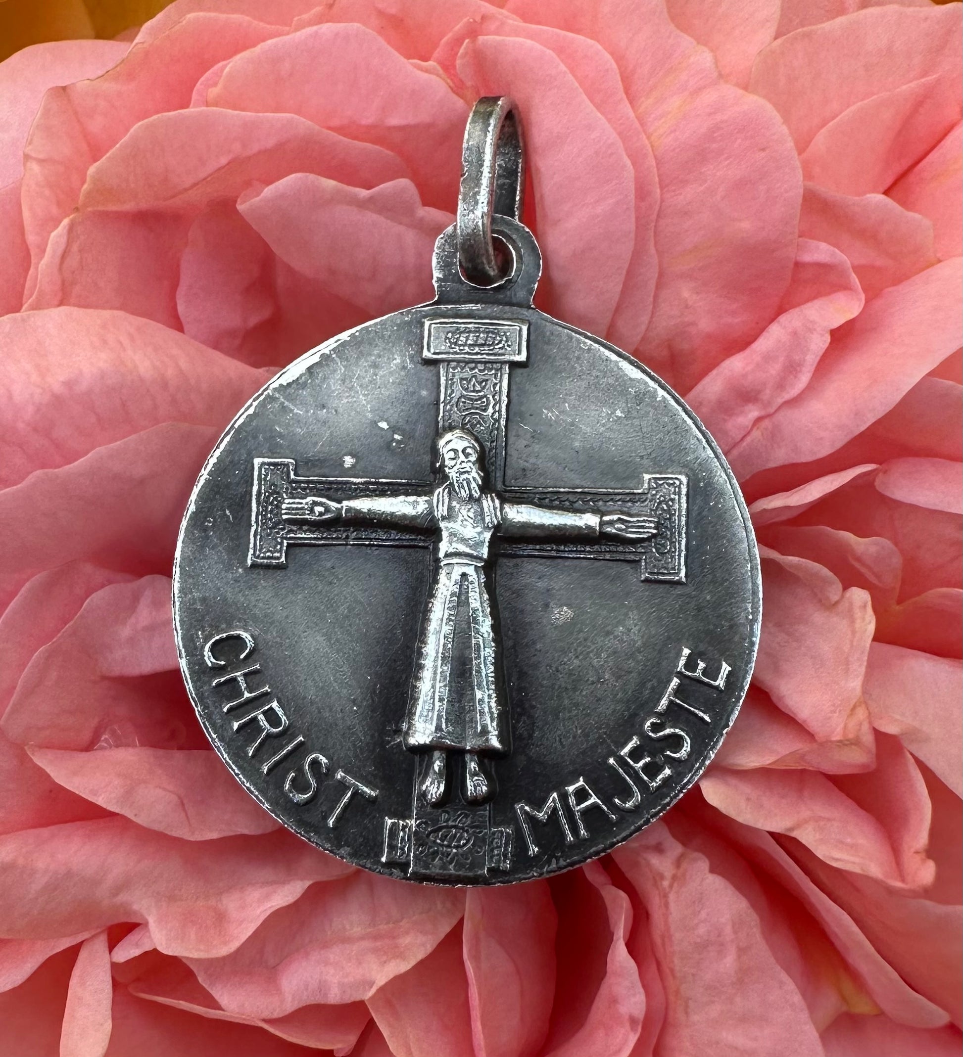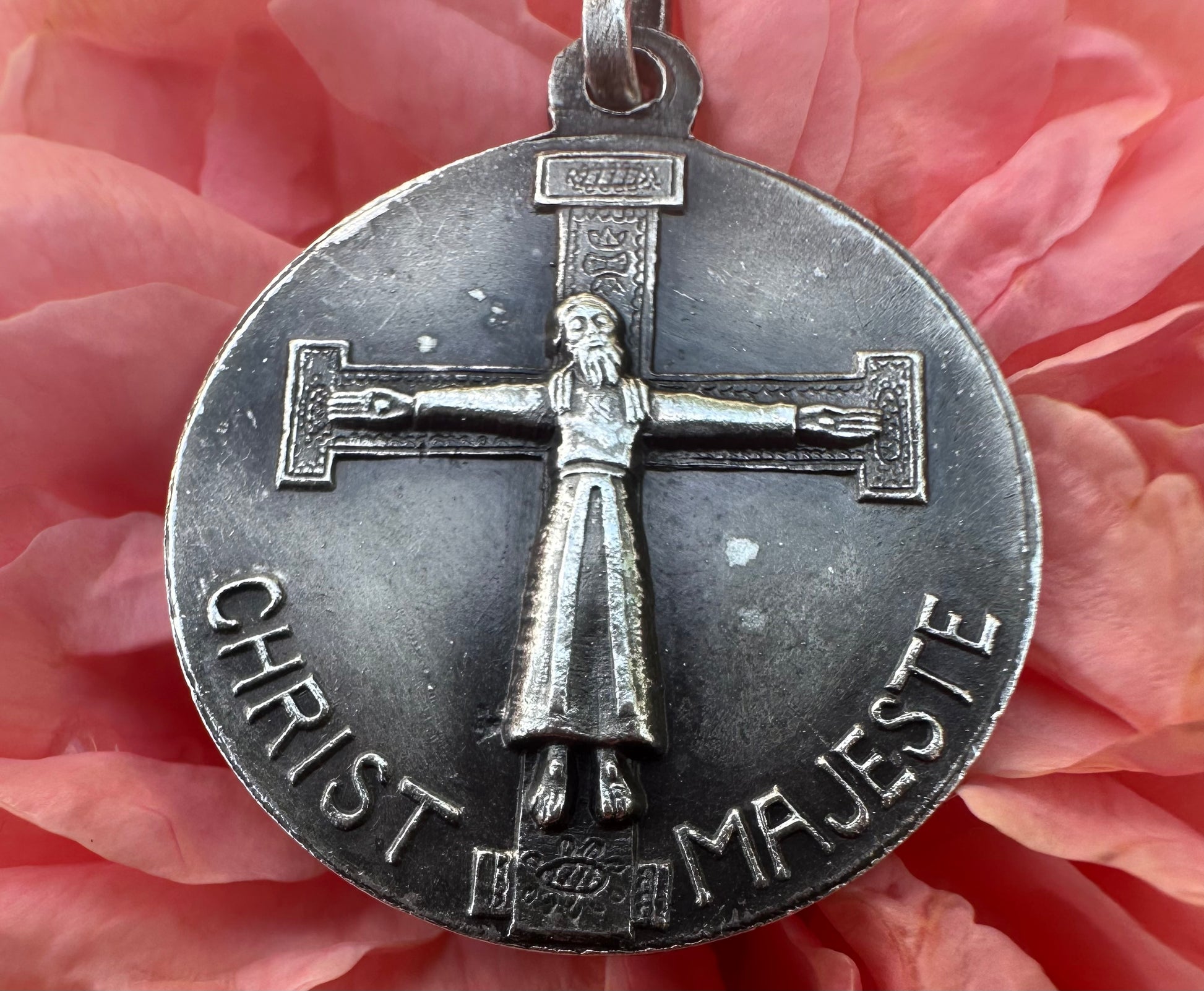 This Jesus medal is a beautiful blend of modernist design and timeless religious symbolism, making it a cherished addition to any jewelry collection. The front shows the Holy Trinity. At the back is a depiction of Christ in Majesty, symbolizing his sovereign power and divine authority, bringing a powerful spiritual presence to the piece.