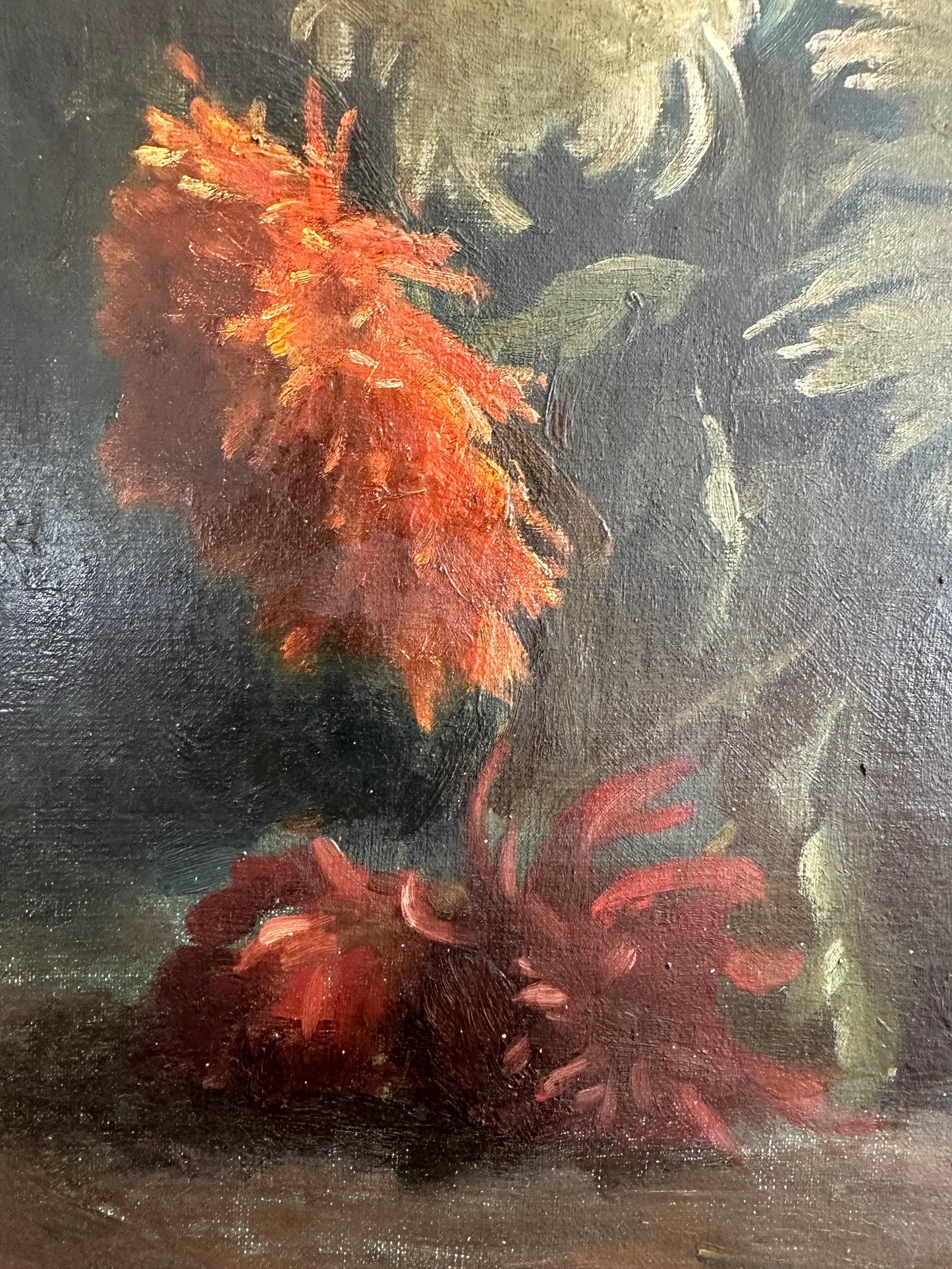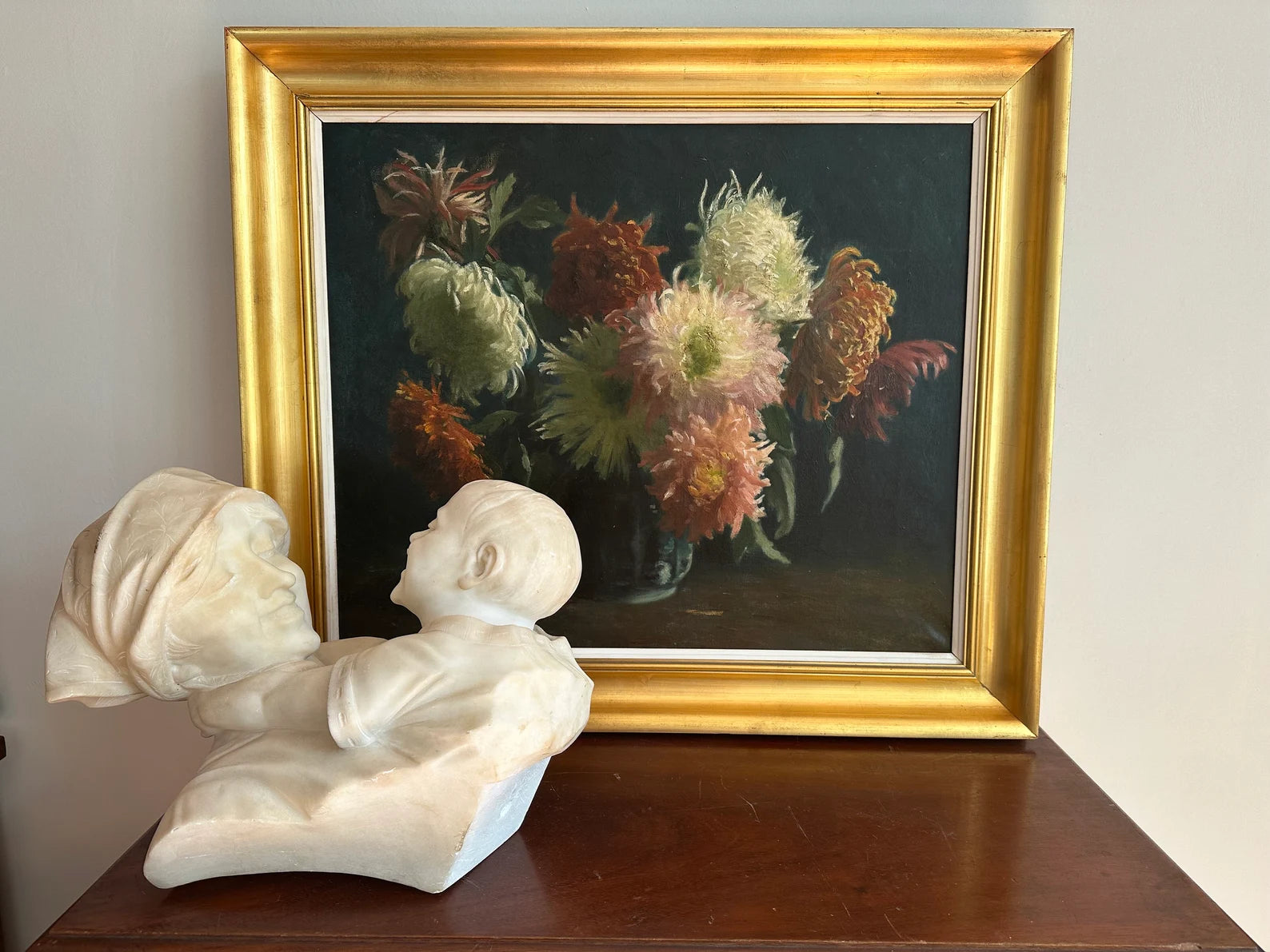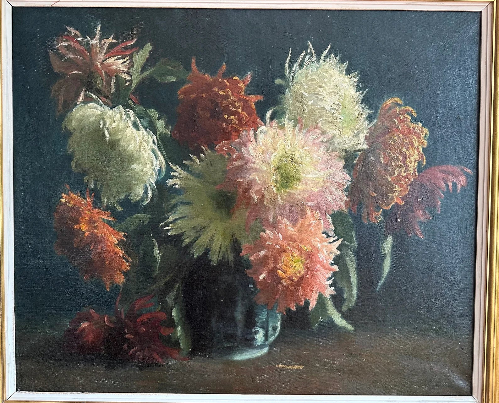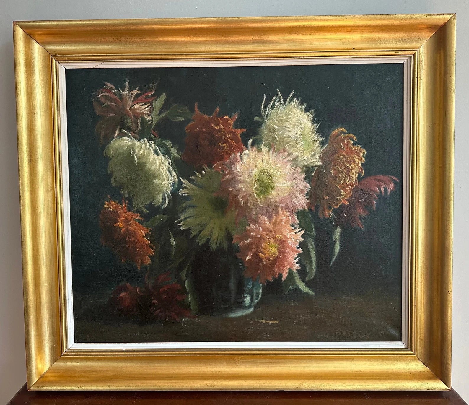 A wonderful French antique oil painting on canvas dating to the late 19th century, circa 1890's. The Impressionist original art features a bunch of flowers, dahlia in a vase on a dark background. The play of light on the flower petals is gorgeous ! The floral still life is enhanced by a contemporary gilt wooden frame. The wall art has not been signed by the artist. This magnificent everlasting bouquet is ready to be displayed on your home.
