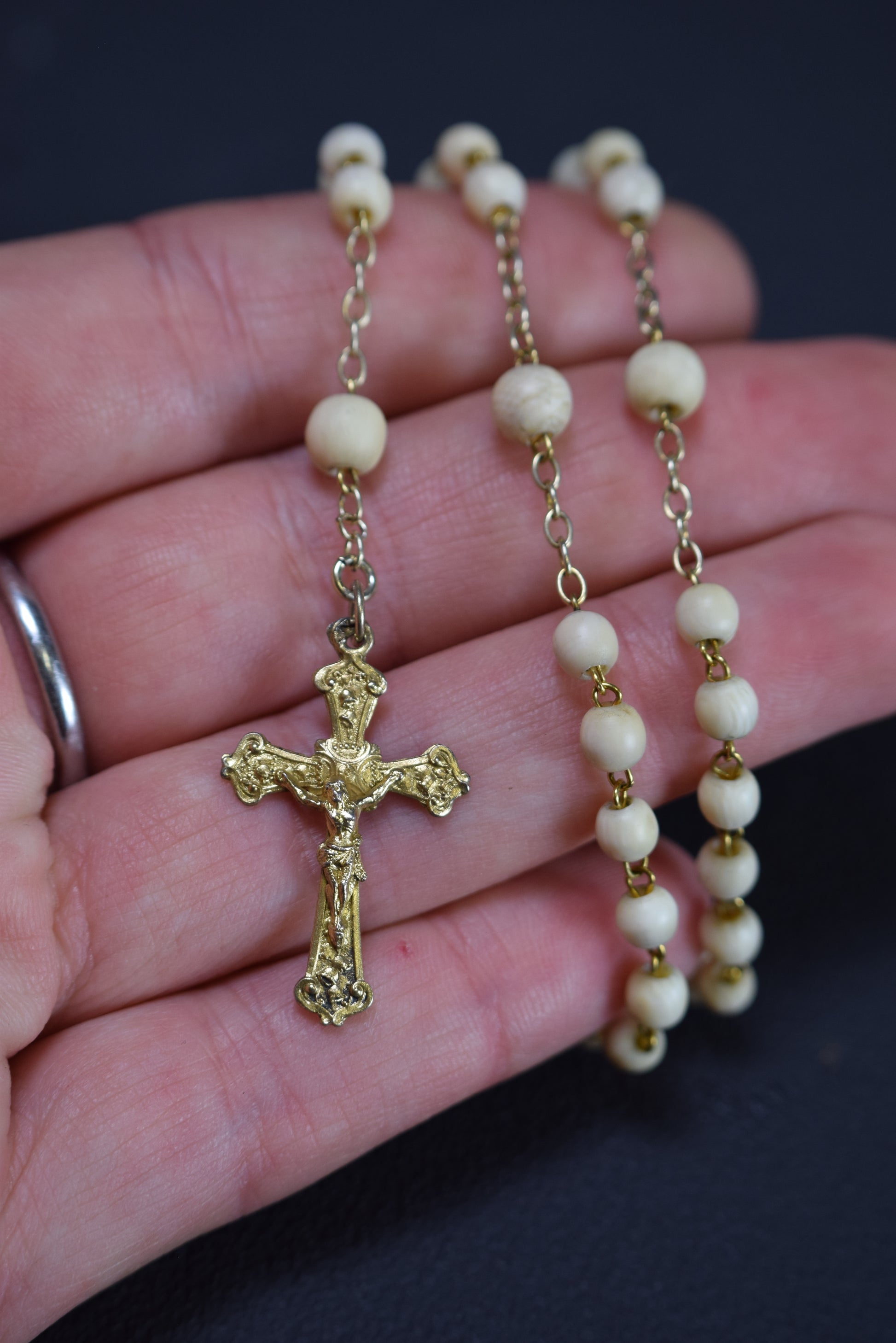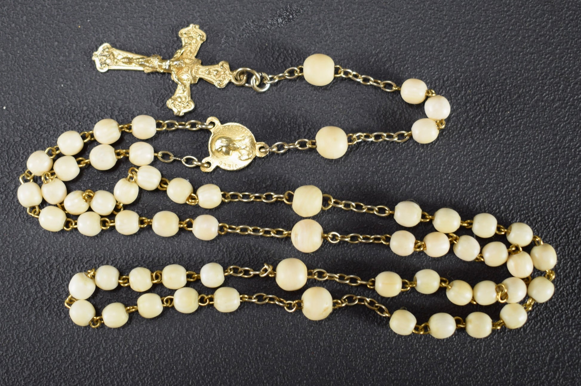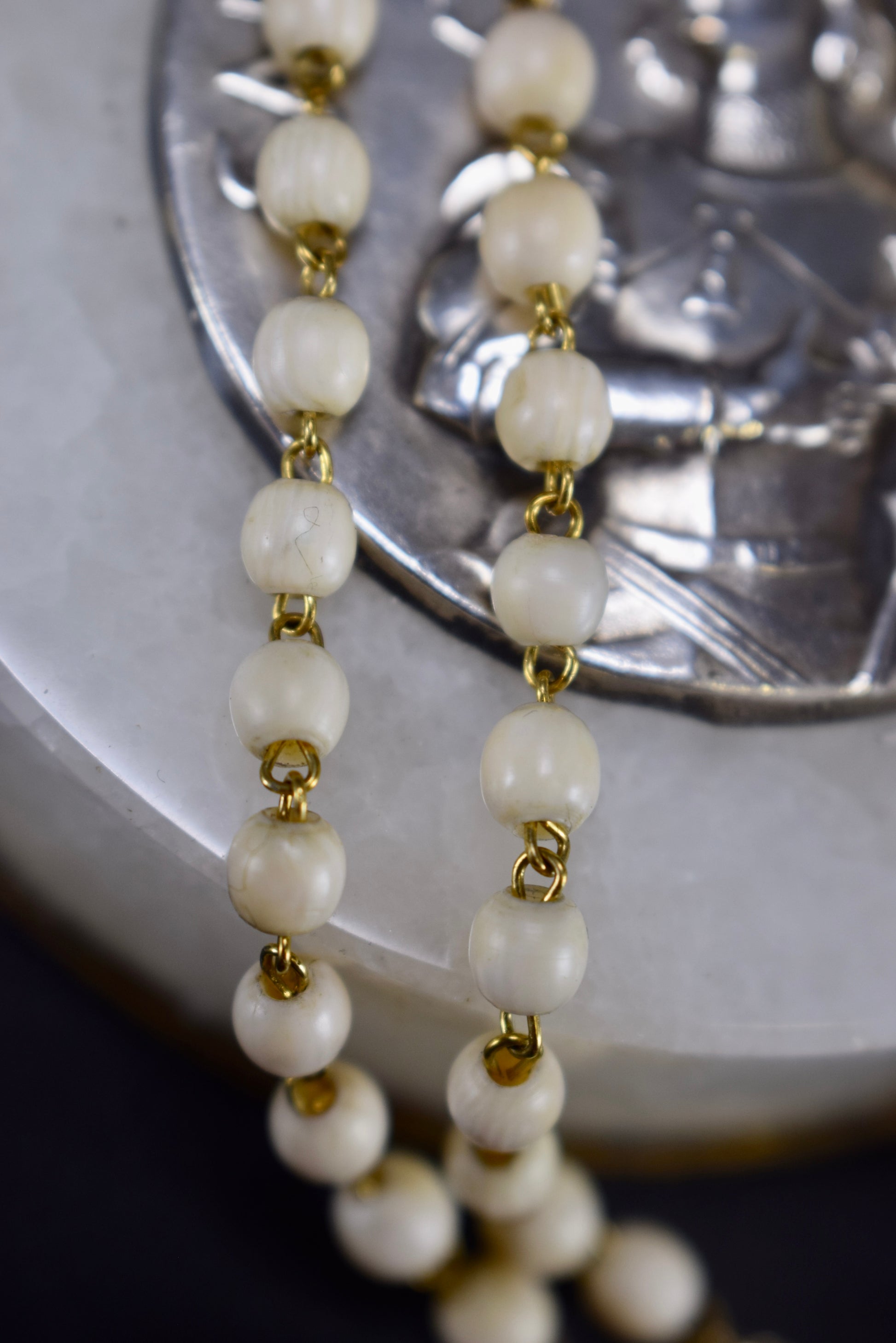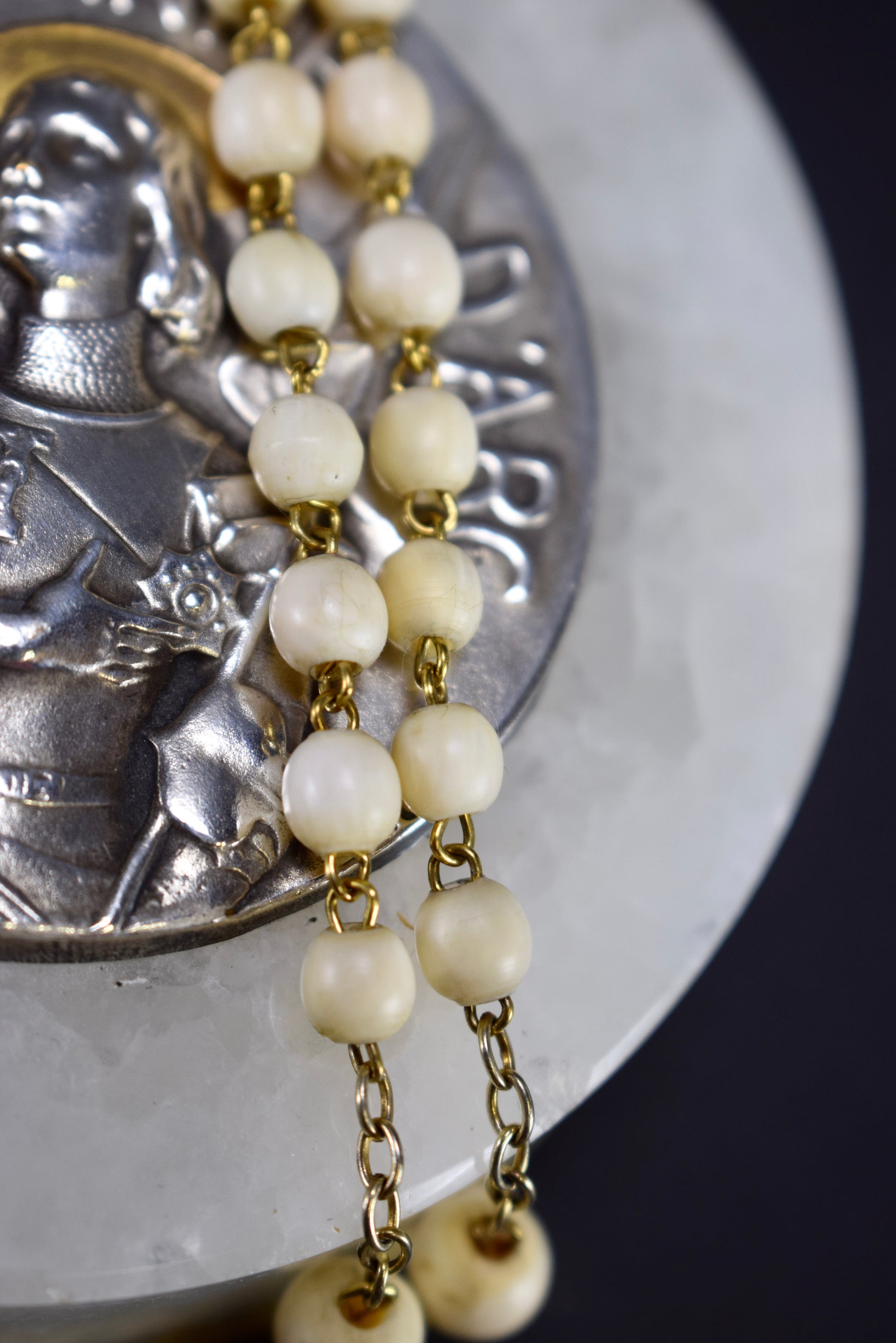 A beautiful French rosary, made of 59 fine ivory beads. This lovely religious necklace dates from the early 20th century, before 1947.