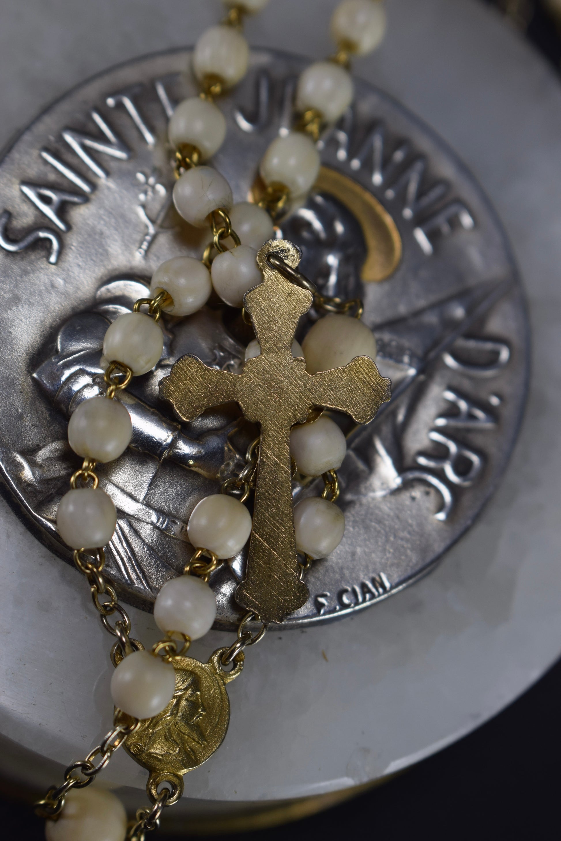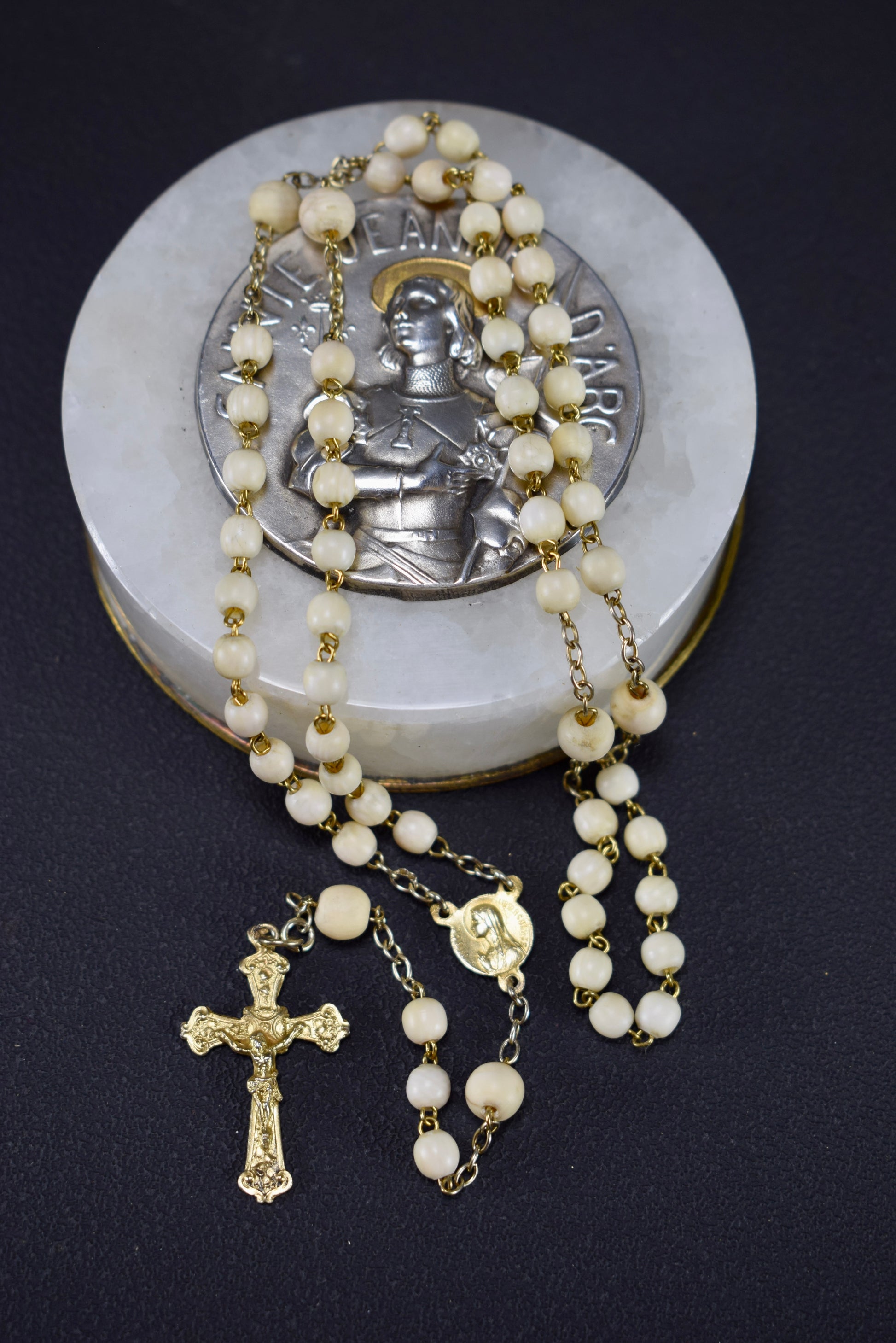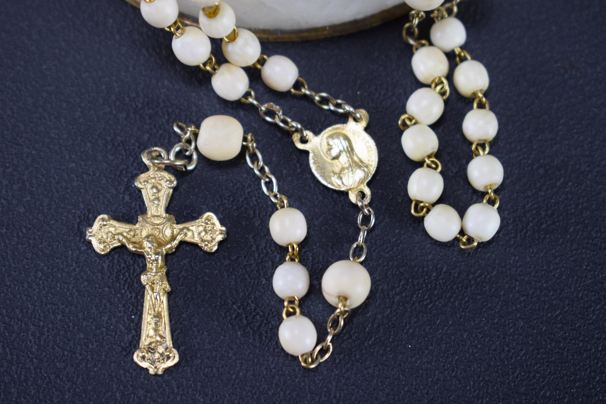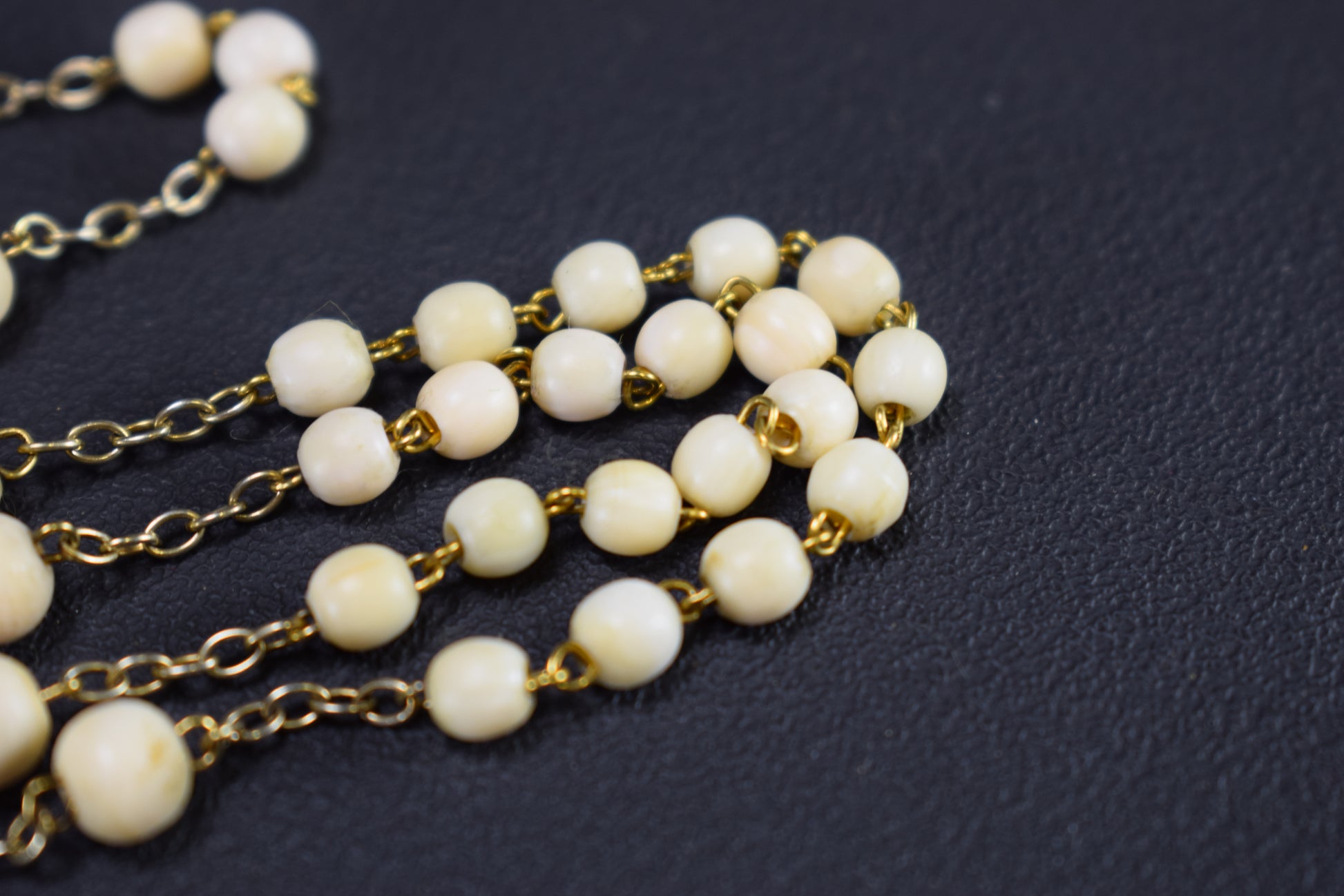 A beautiful French rosary, made of 59 fine ivory beads. This lovely religious necklace dates from the early 20th century, before 1947.