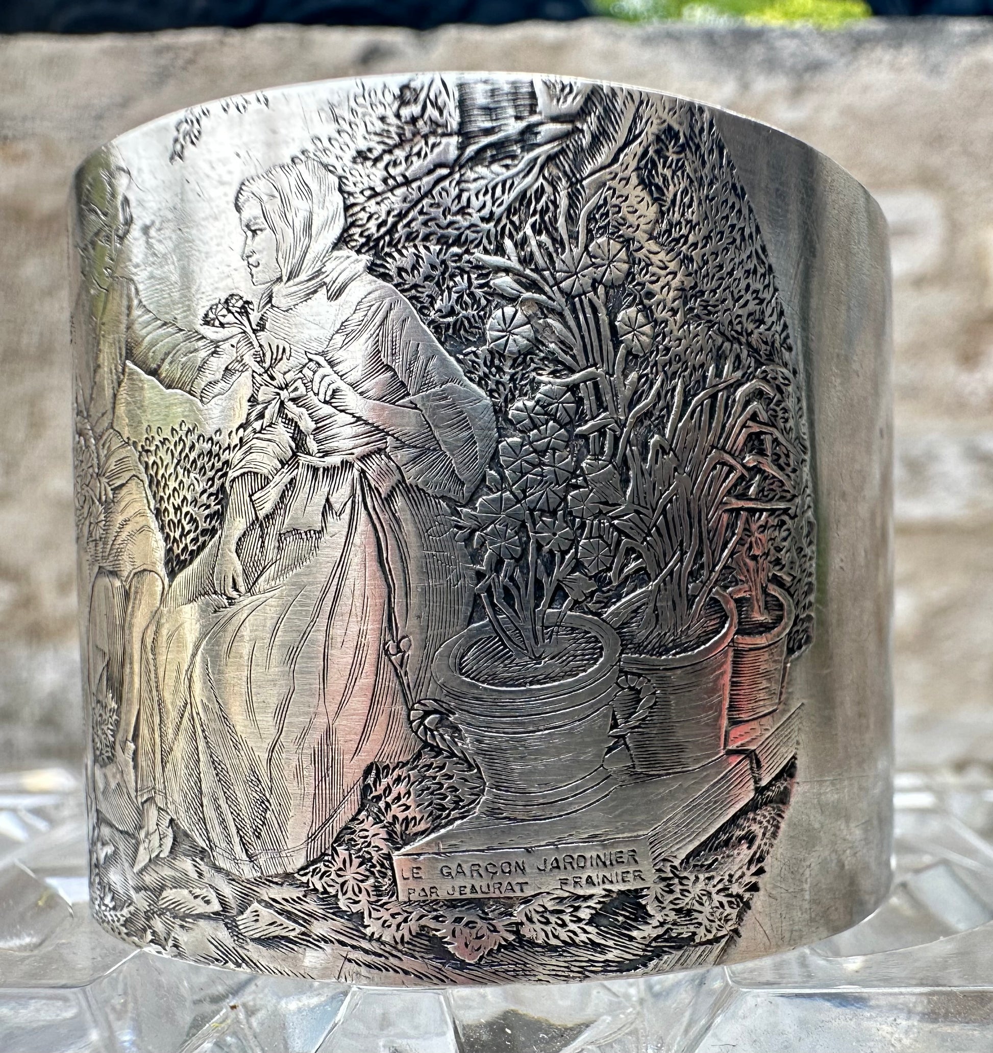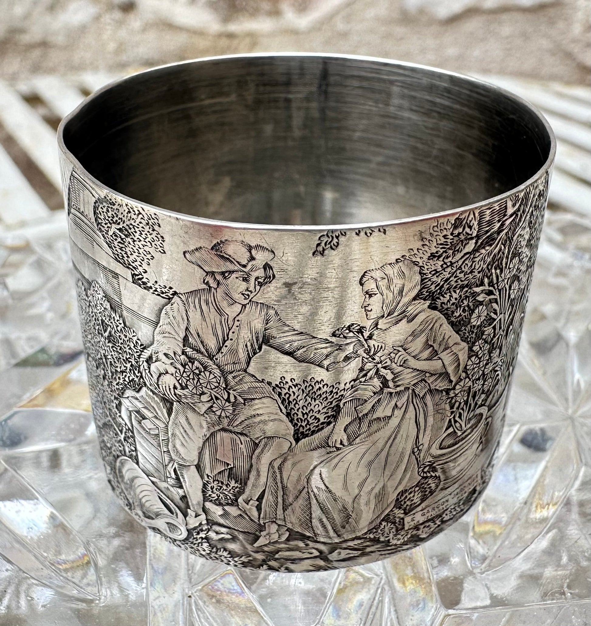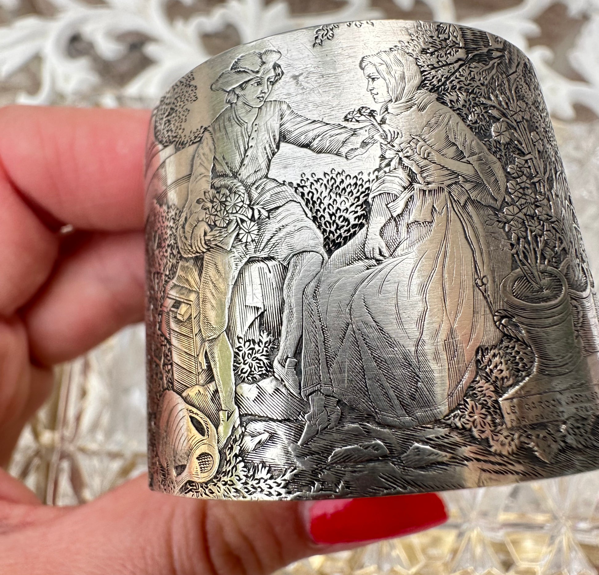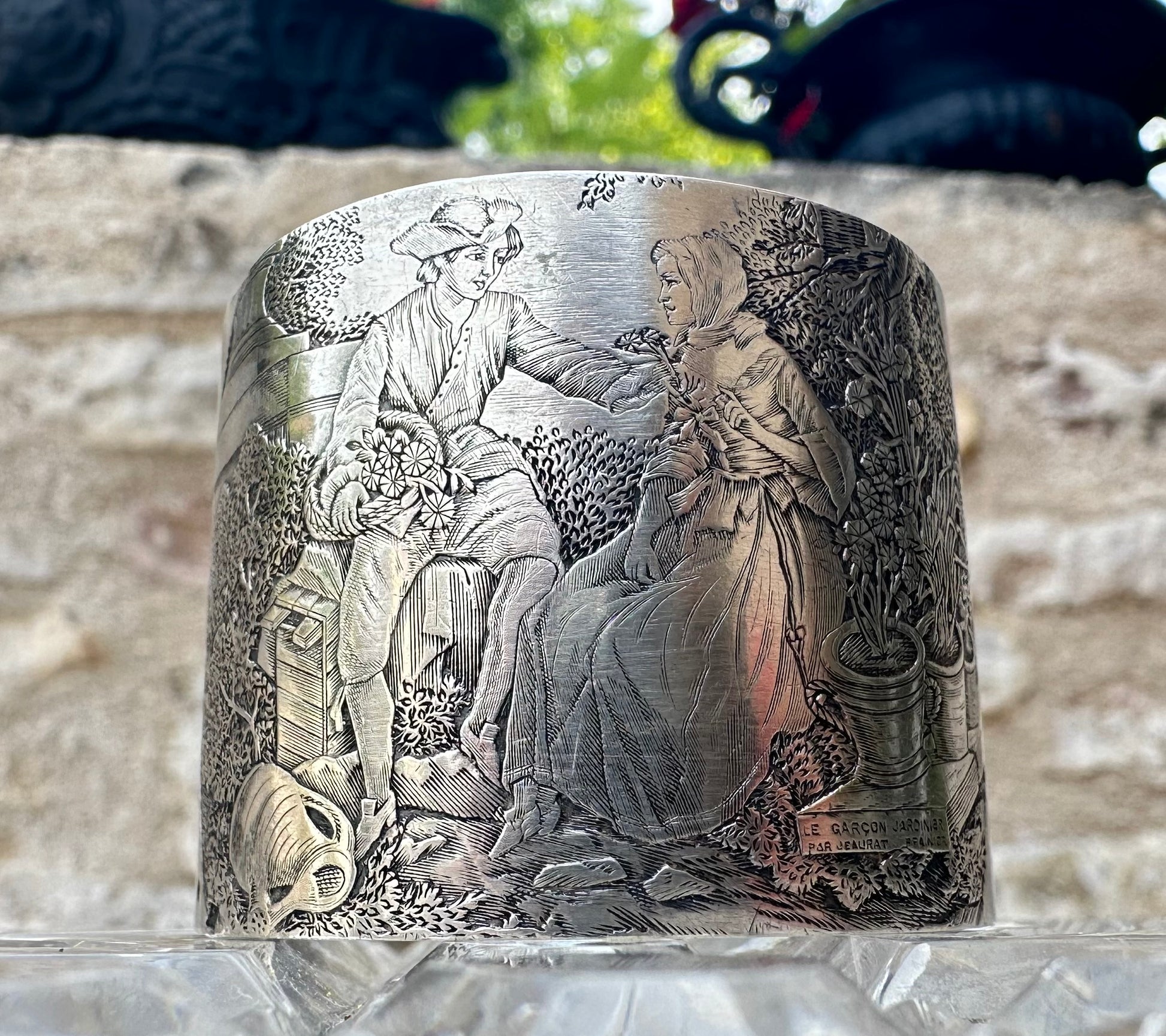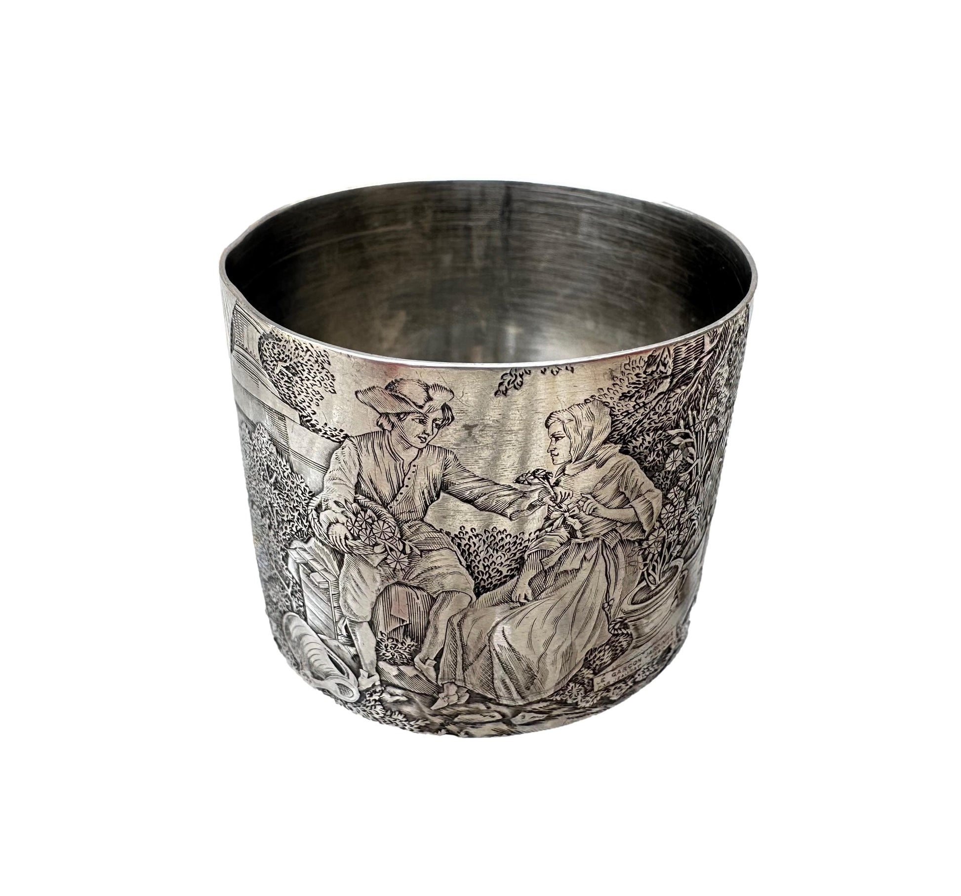 A beautiful antique French sterling silver napkin ring, dating from the early 20th century. The napkin holder features a rich engraved decor depicting "the Gardener Boy" after the famous 18th century painter Étienne Jeaurat (1699-1789). The romantic engraving features a galant scene of a boy offering a small bunch of flowers to a girl. The napkin ring has been engraved with the beautiful French name Jeanne (Jane in English).