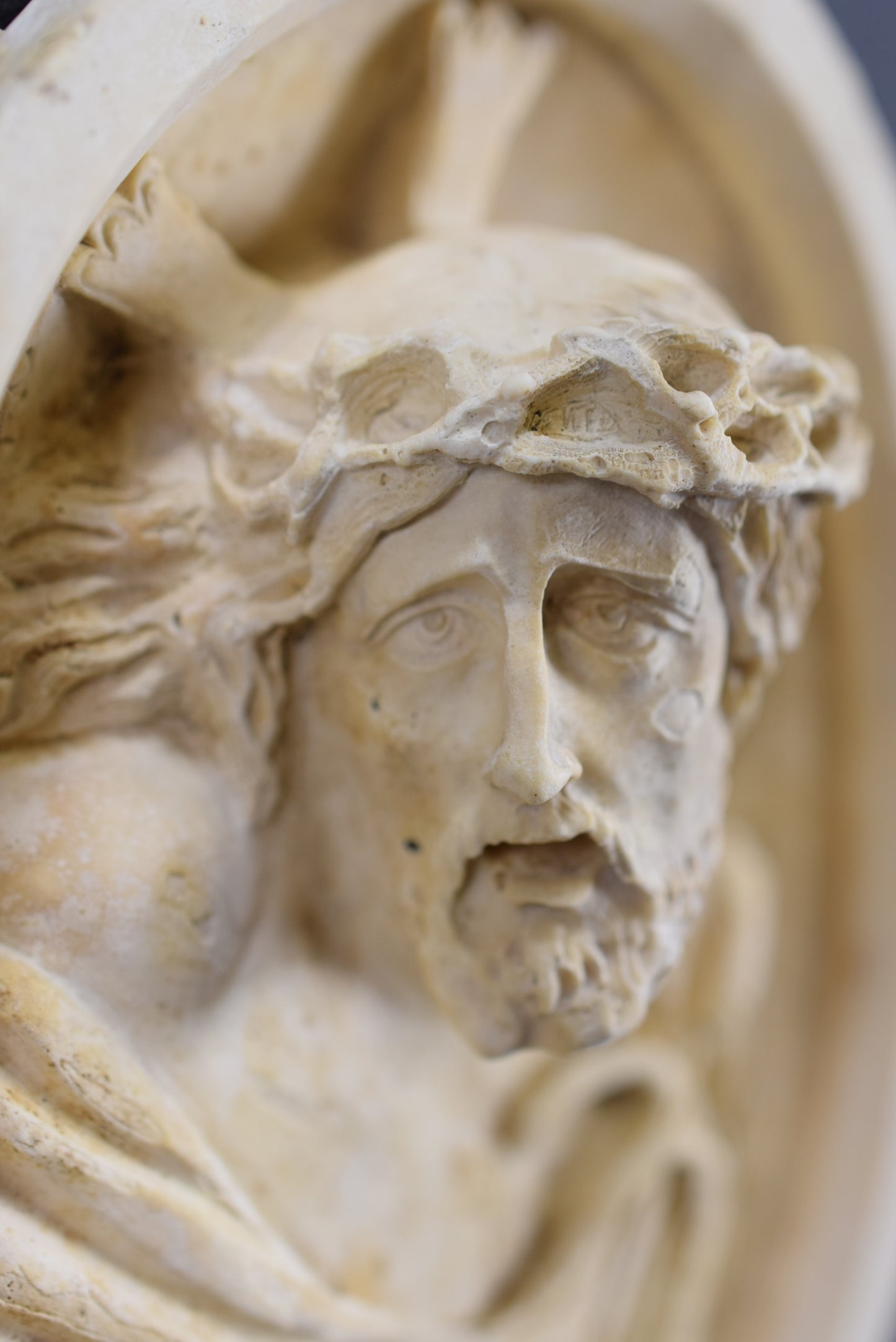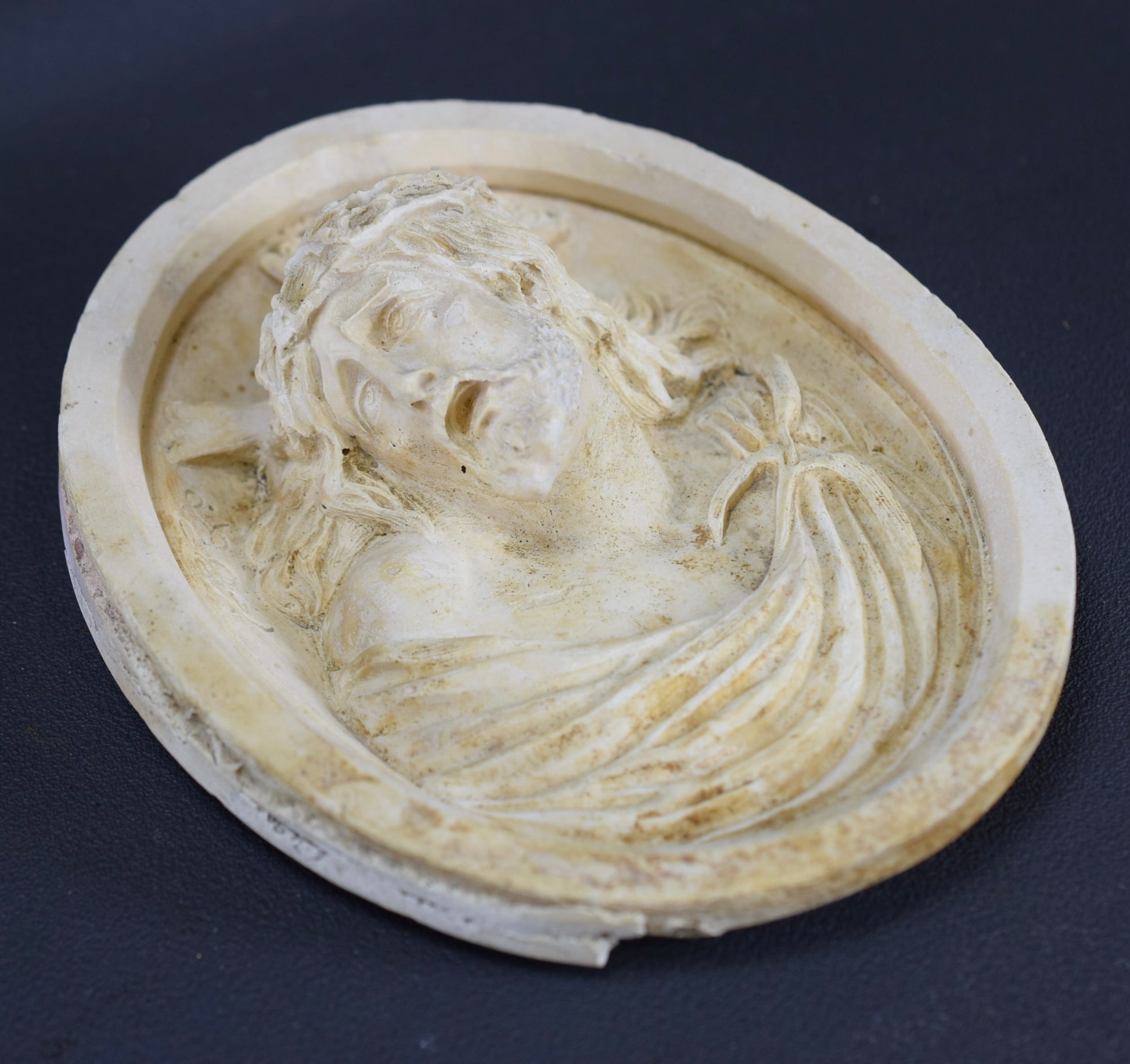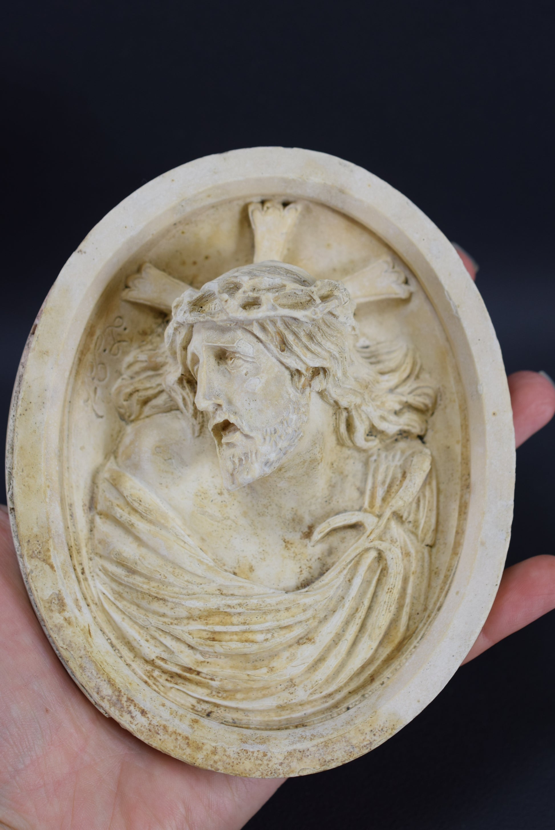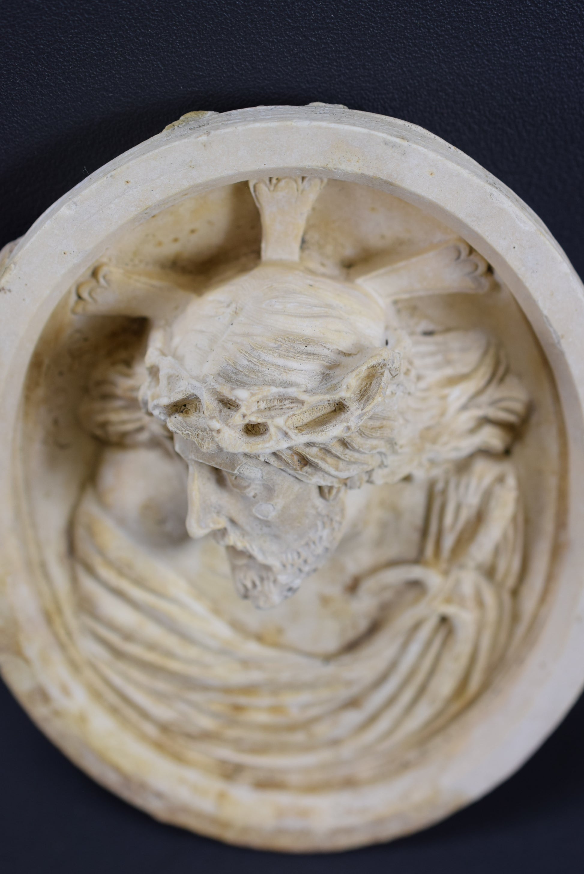 Antique French reliquary pendant made of carved soap plaster (imitating carved meerschaum). The carved medallion features a beautiful portrait of Our Lord Jesus Christ. It certainly used to have a frame.