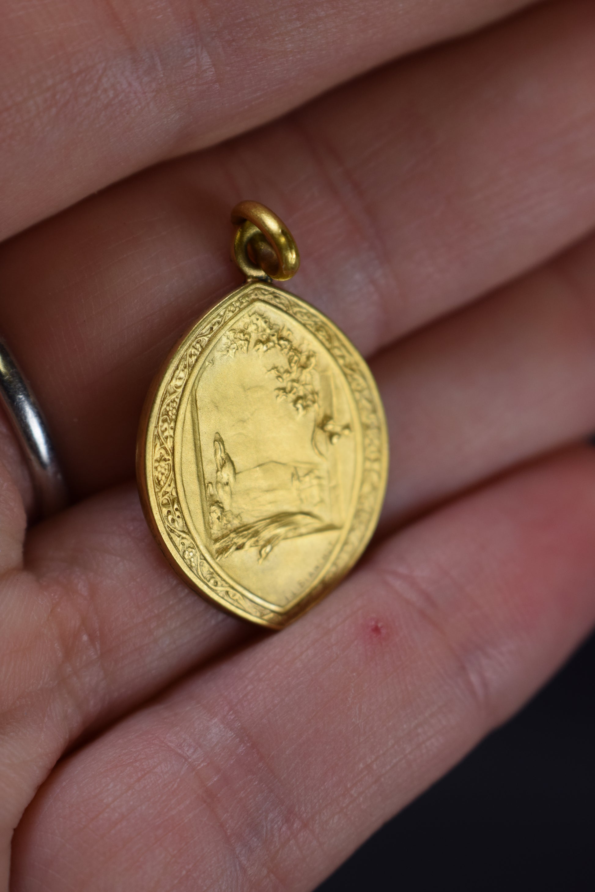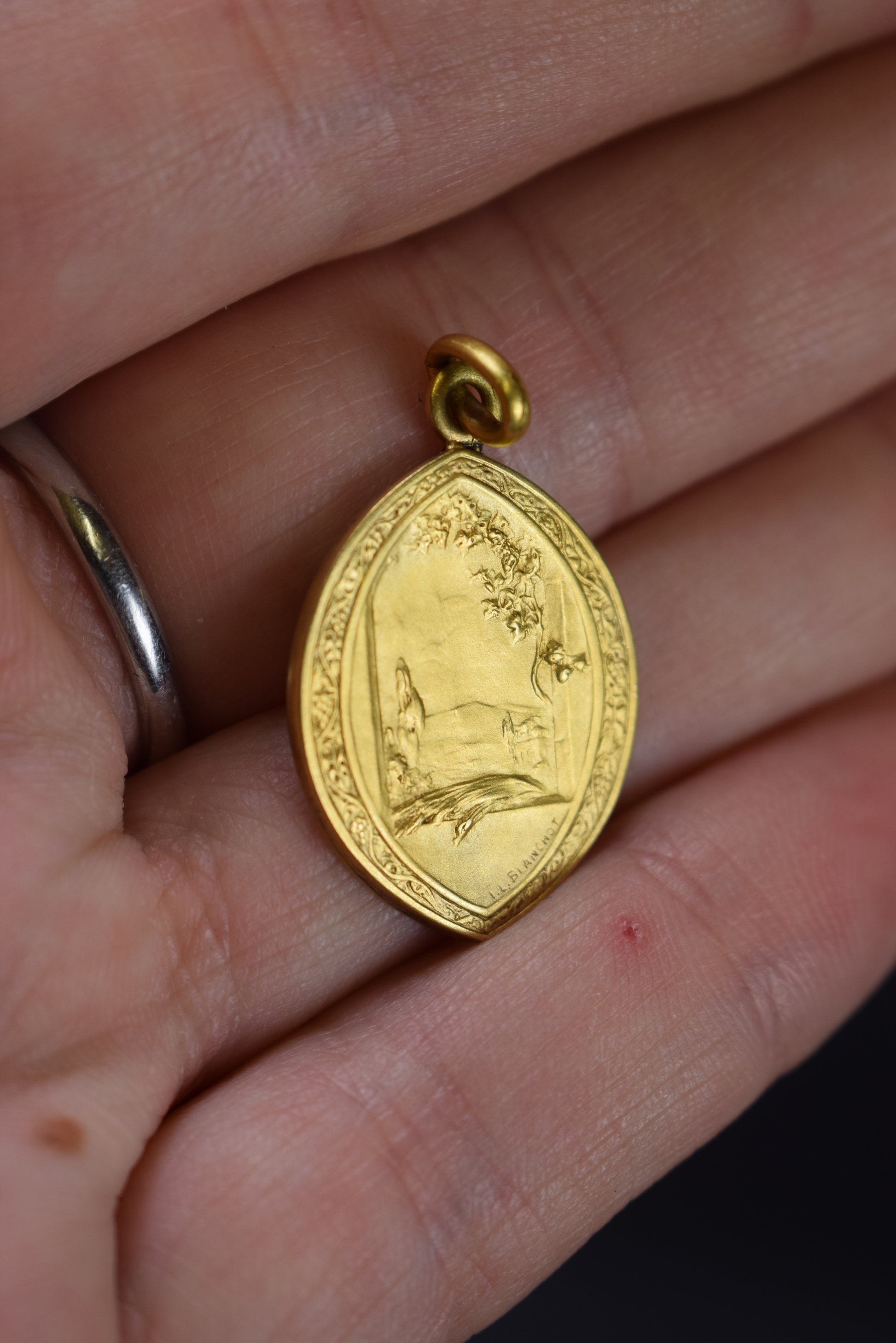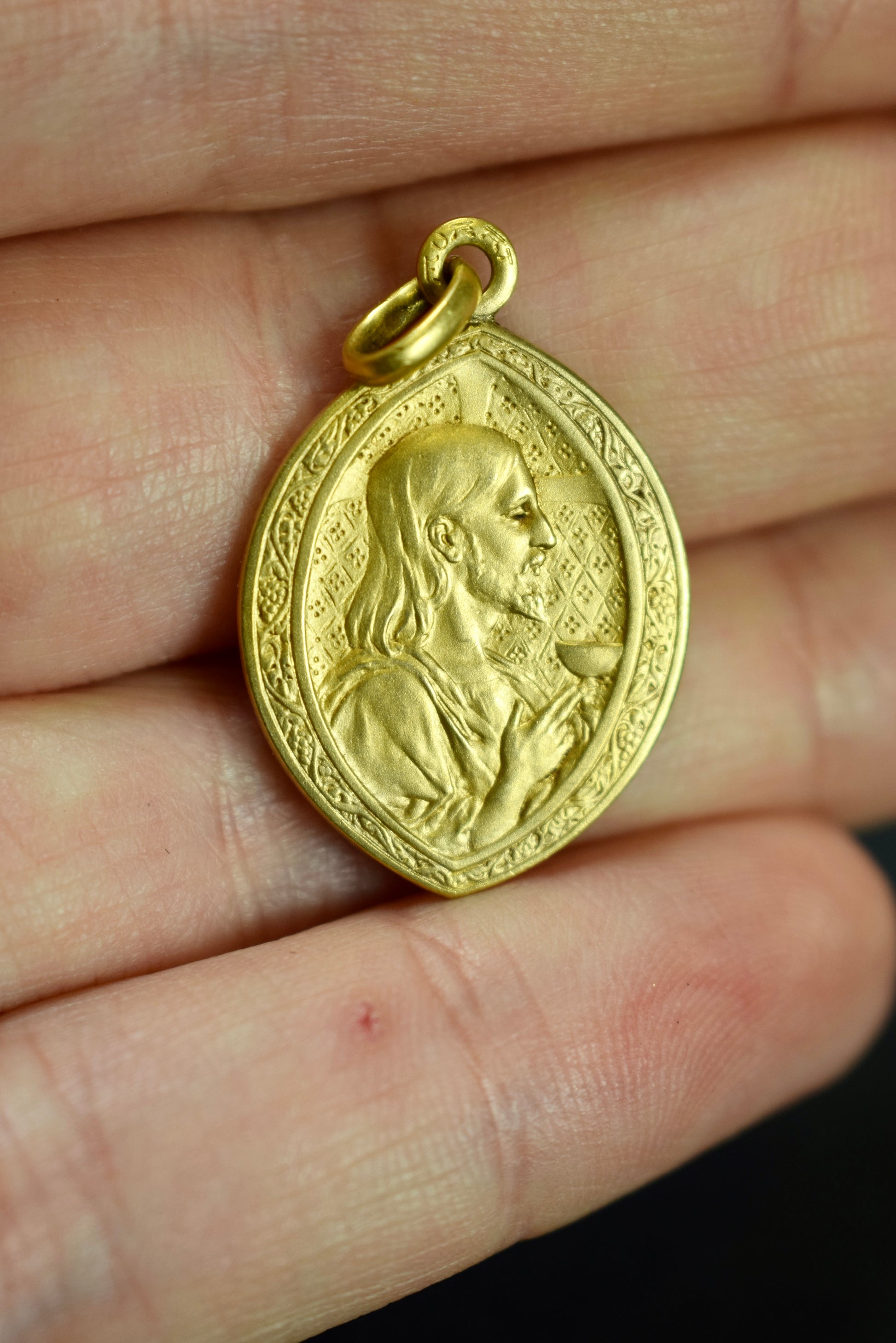 A rare and beautiful French vintage medal made of gold filled brass. The Catholic necklace pendant features a portrait of Jesus Christ holding a chalice. The reverse depicts a garden and has been signed by the French engraver I.L BLANCHOT. It would be a great Communion or Baptism gift. Produced by Murat.