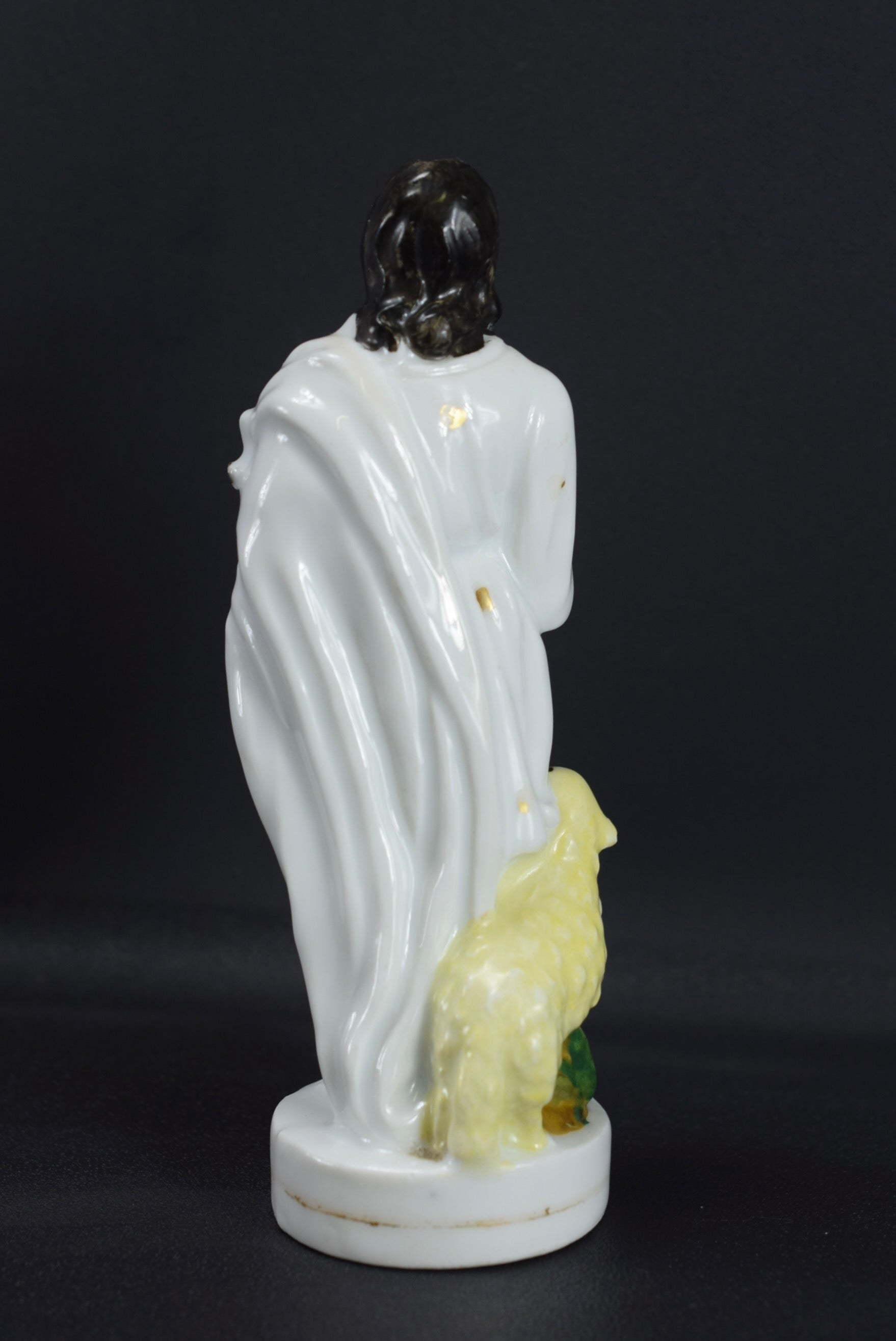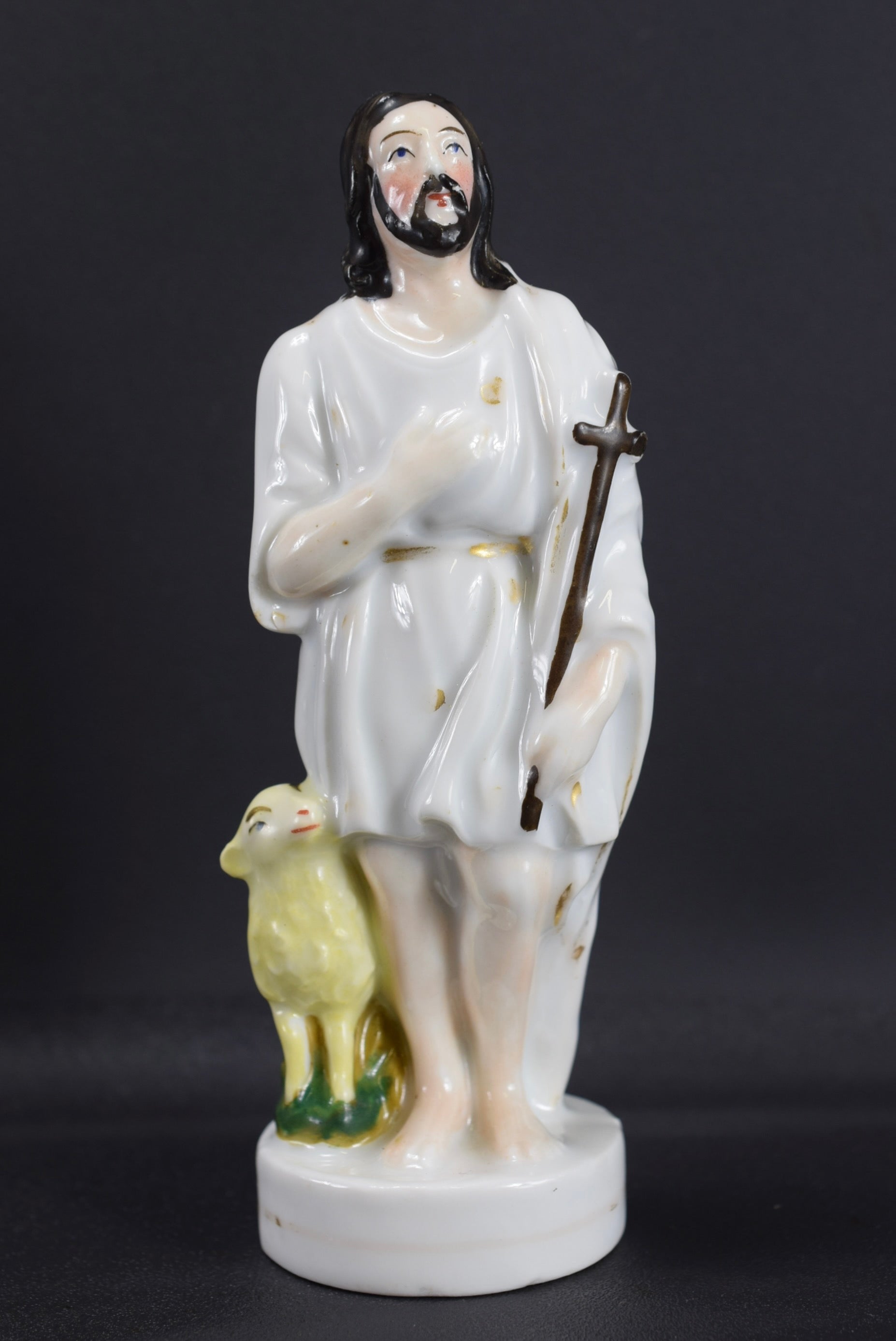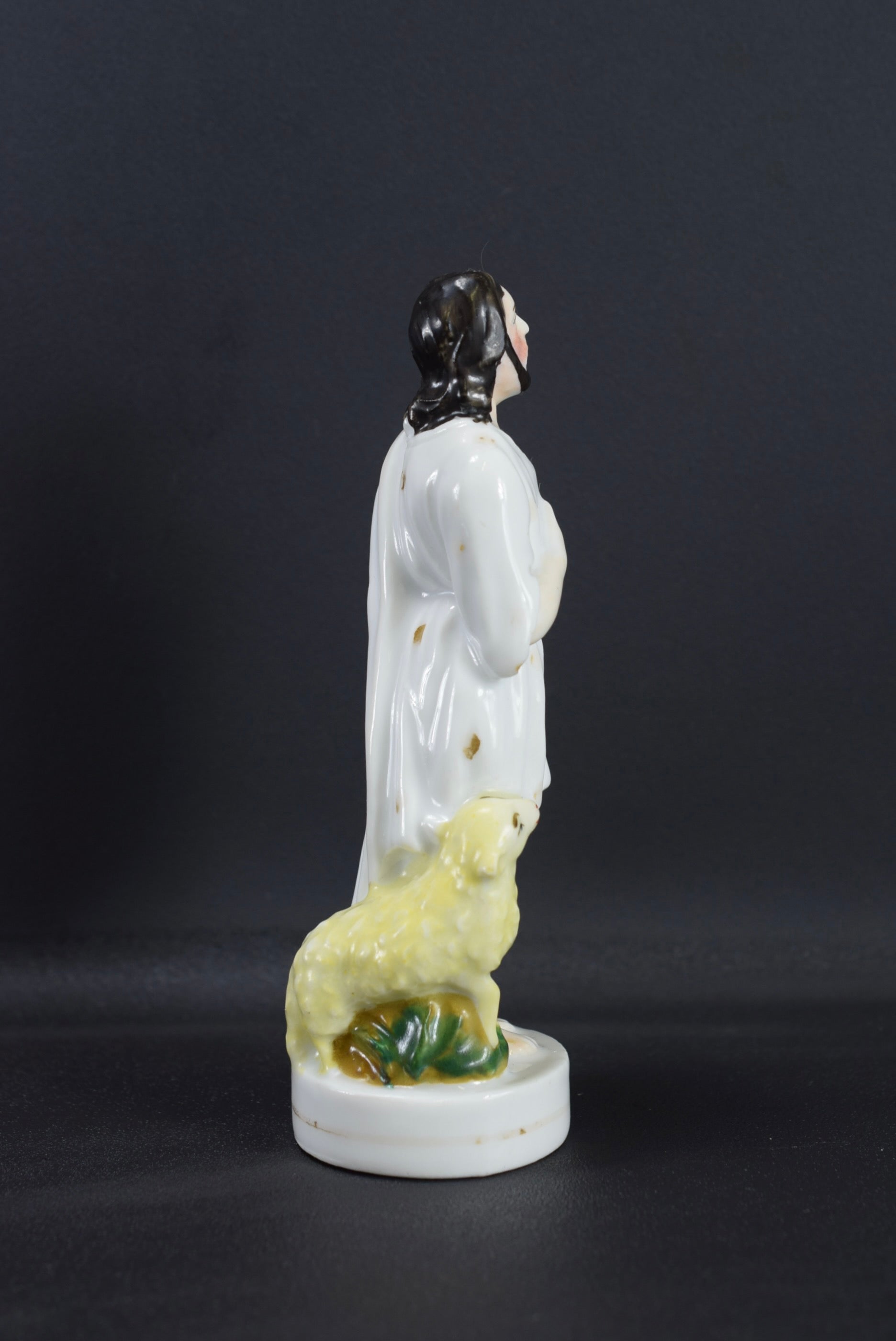 A beautiful French antique statue dating made of hand painted porcelain dating to the 19th century. The Catholic figurine depicts Jesus the Good Shepherd looking at the sky with faith, with a small lamb at his side.