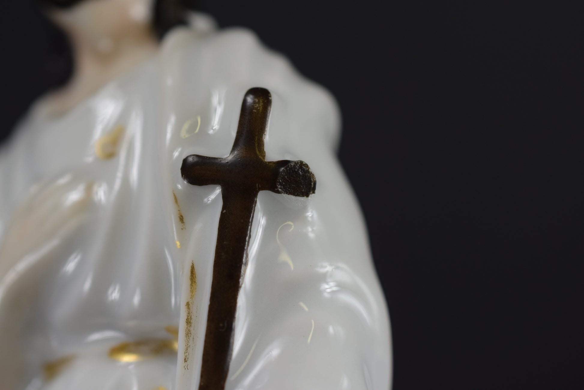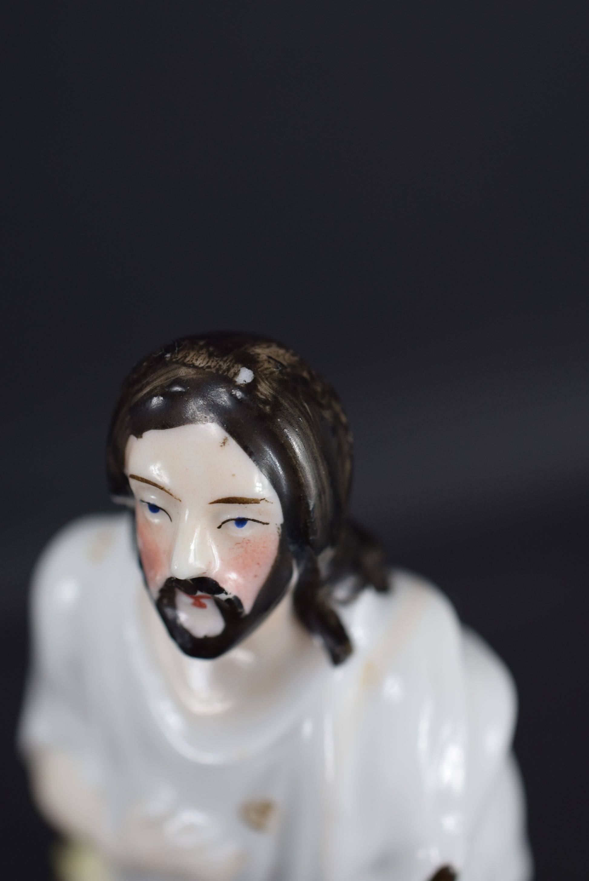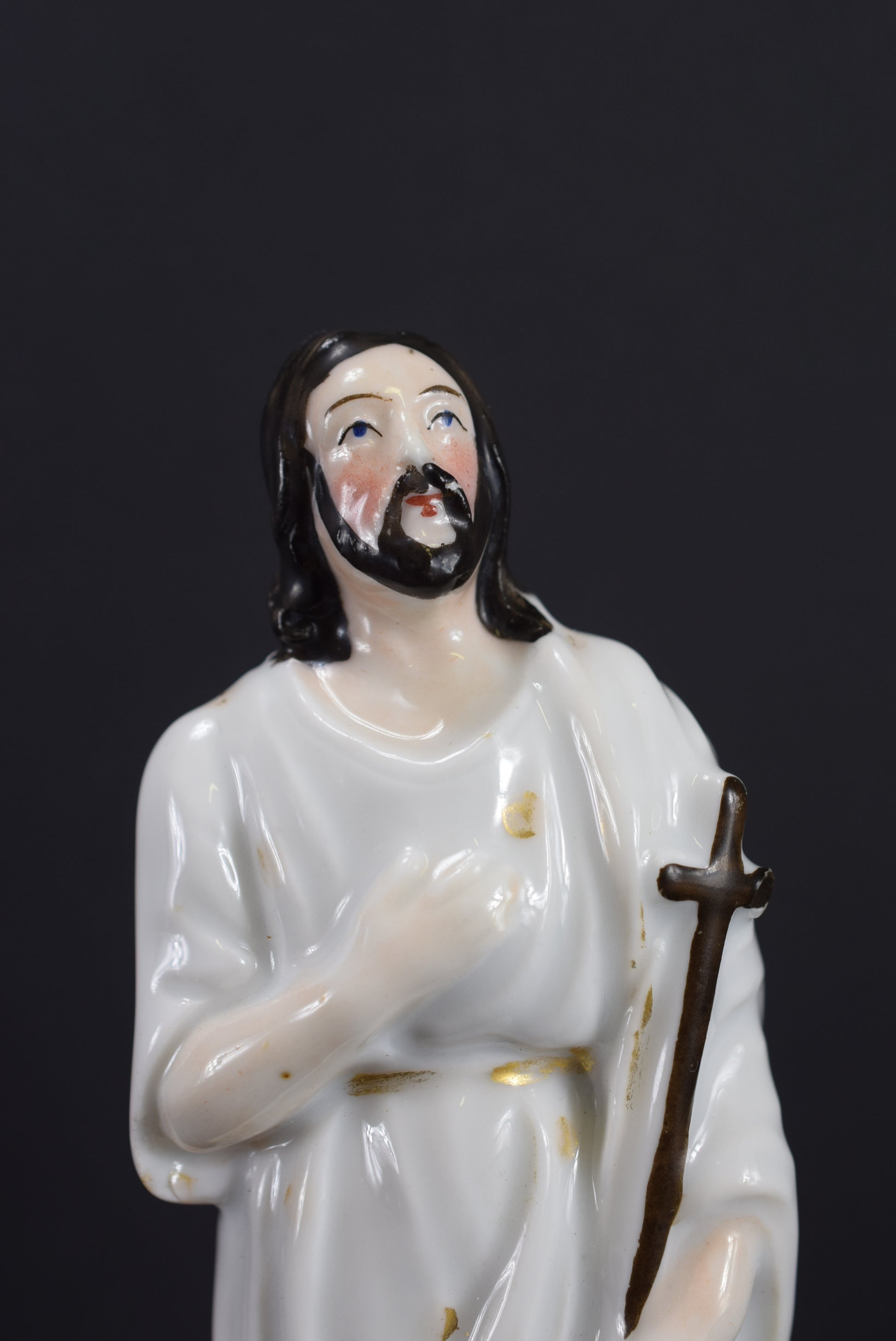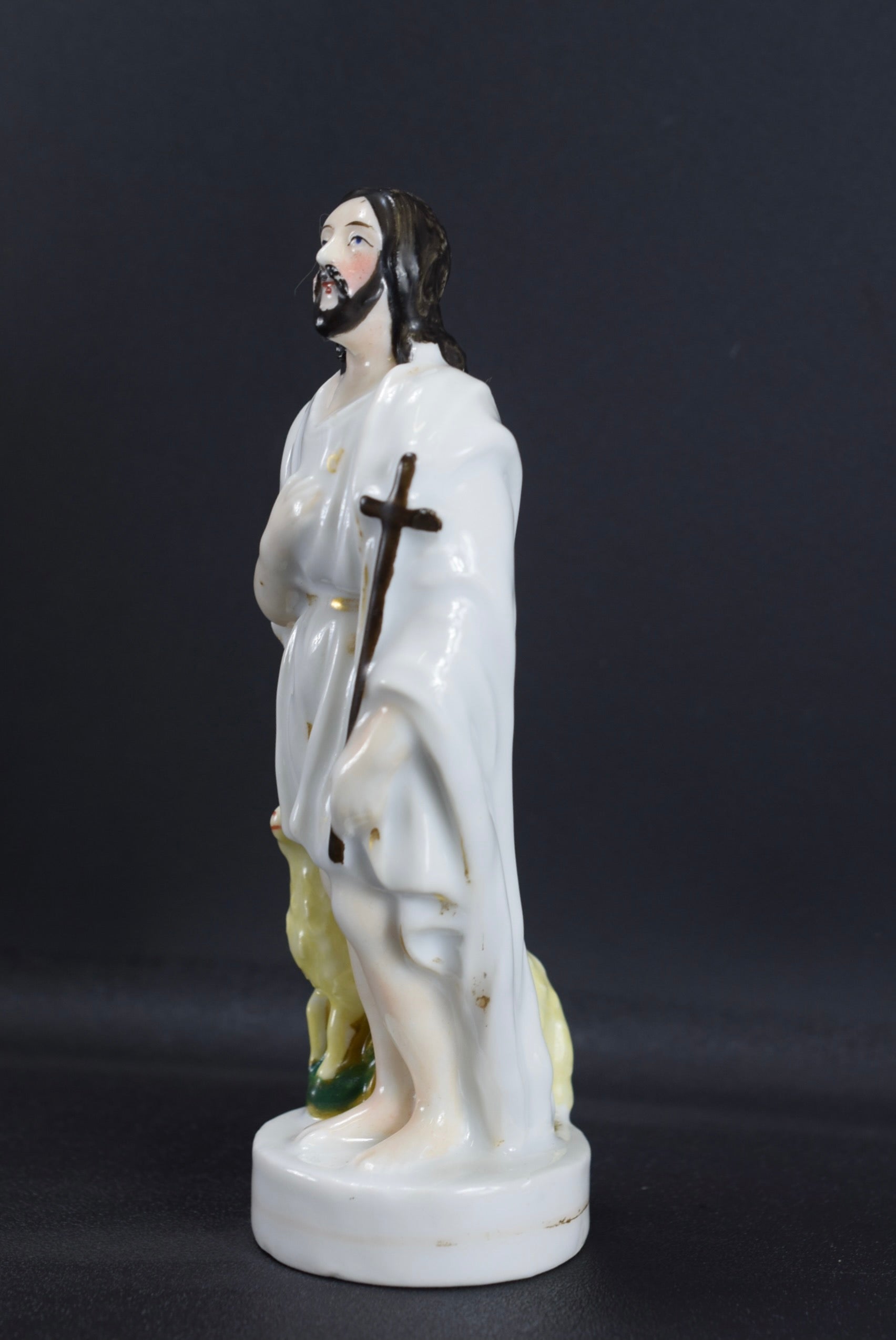 A beautiful French antique statue dating made of hand painted porcelain dating to the 19th century. The Catholic figurine depicts Jesus the Good Shepherd looking at the sky with faith, with a small lamb at his side.