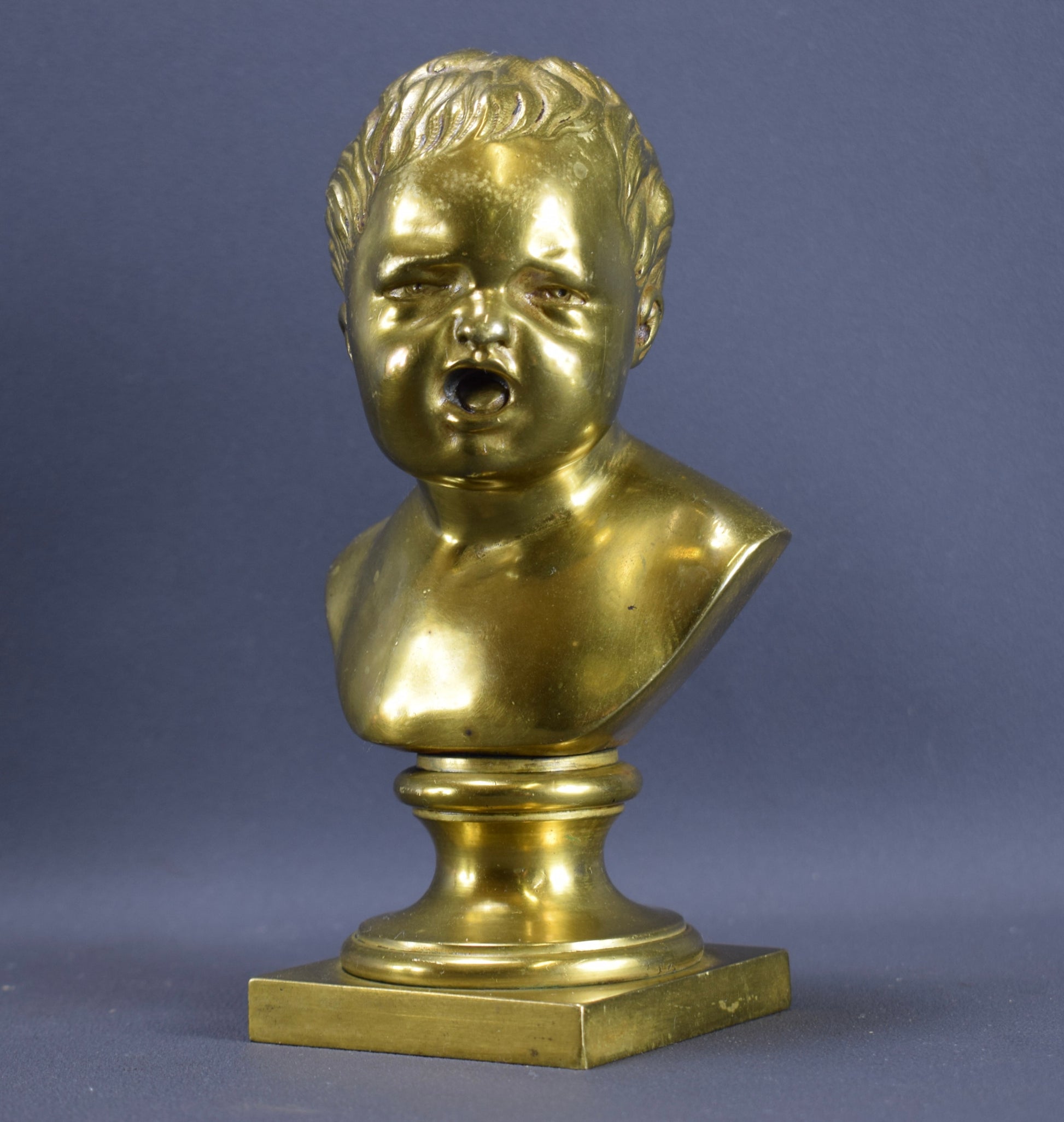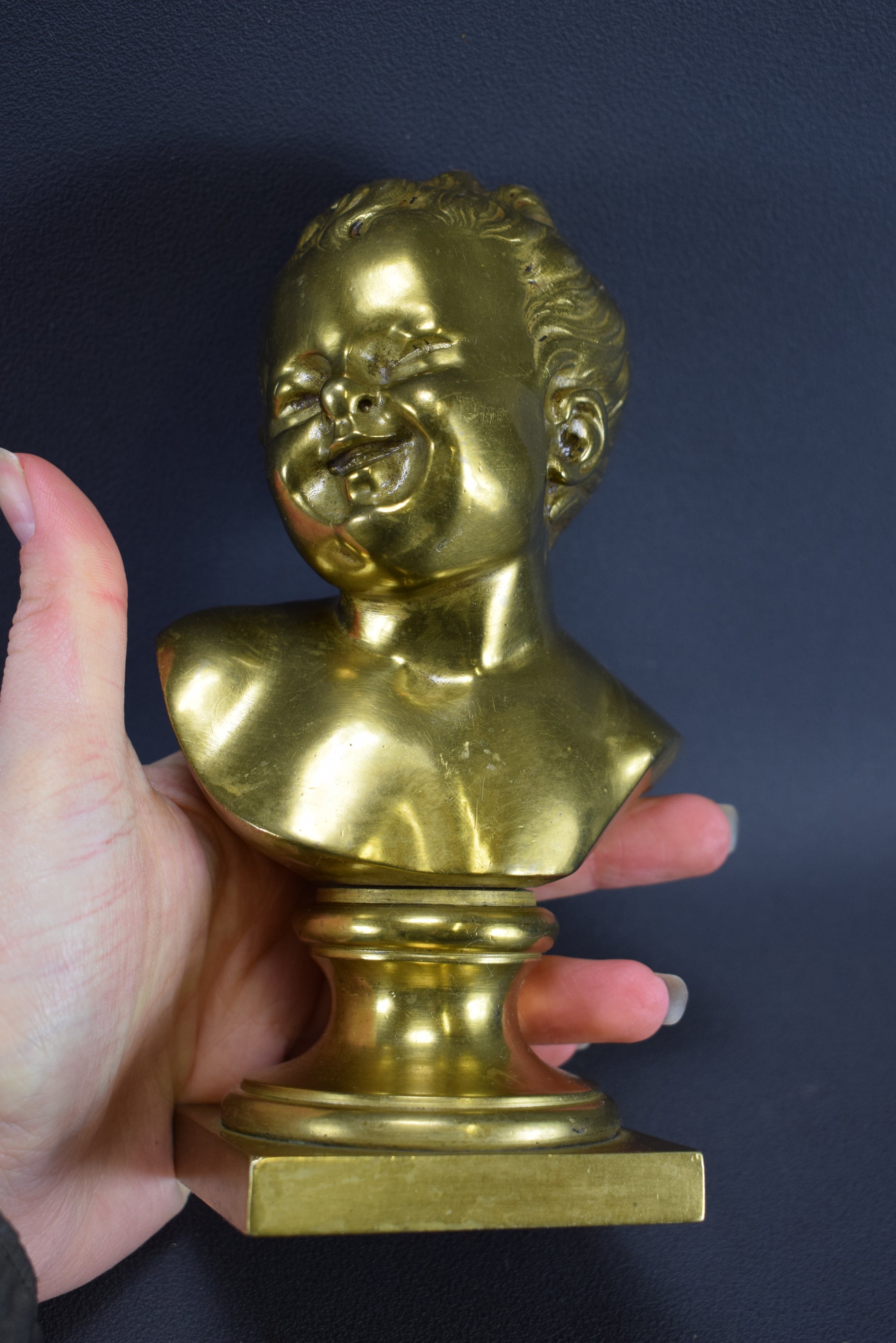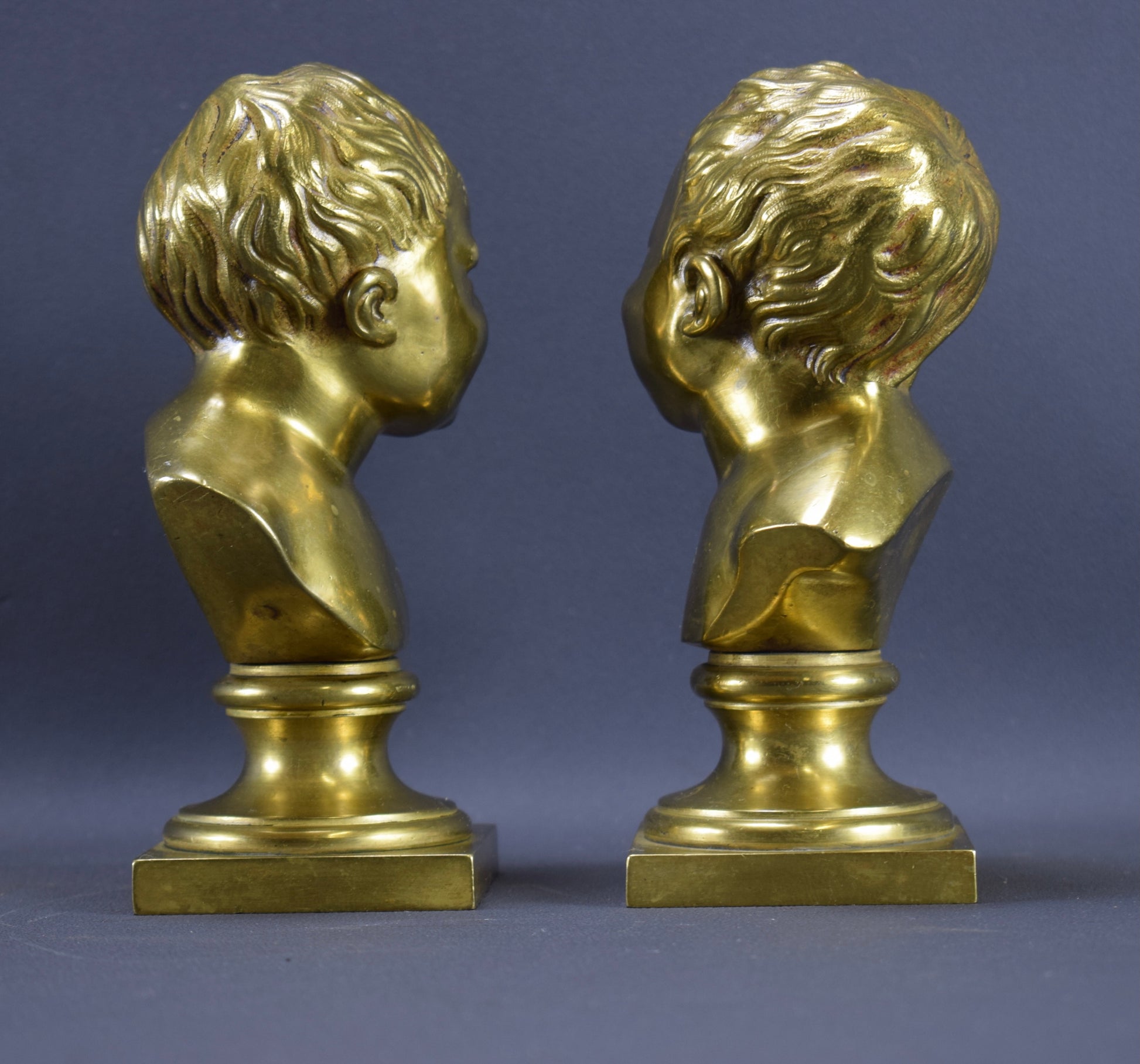 Very charming pair of bronze statues dating to the 19th century. The bust depict the heads of a laughing child and of a crying child. This pair of bronze sculptures was made after Jean Antoine Houdon (1741-1828). "Houdon is famous for his portrait busts and statues of philosophers, inventors and political figures of the Enlightenment. Houdon's subjects include Denis Diderot (1771), Benjamin Franklin (1778-09), Jean-Jacques Rousseau (1778), Voltaire (1781), Molière (1781), George Washington (1785–88), Thomas Jefferson (1789), Louis XVI (1790), Robert Fulton, (1803–04), and Napoléon Bonaparte (1806)."