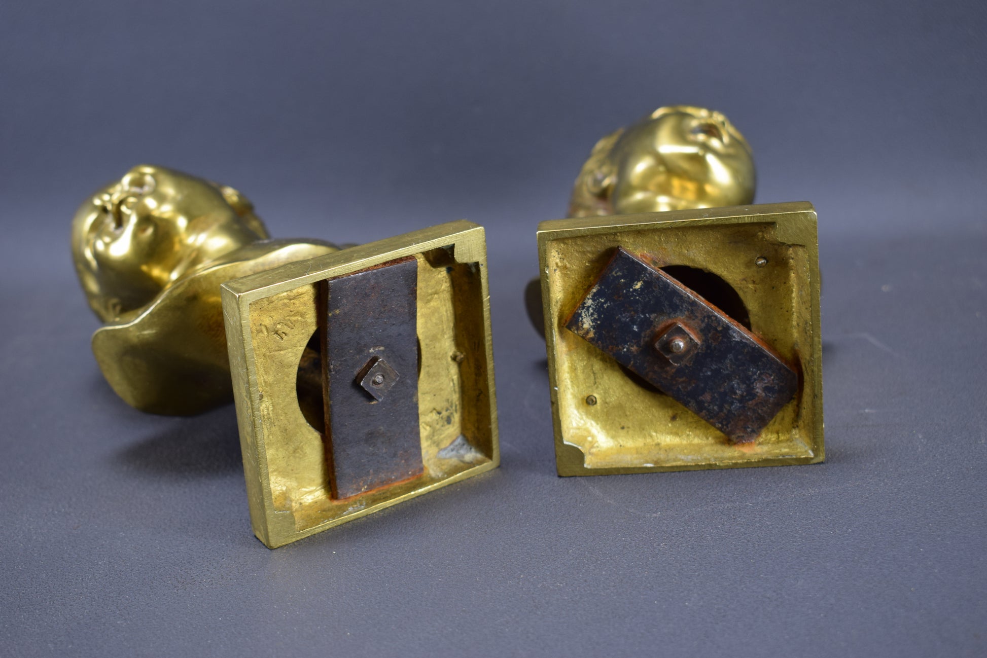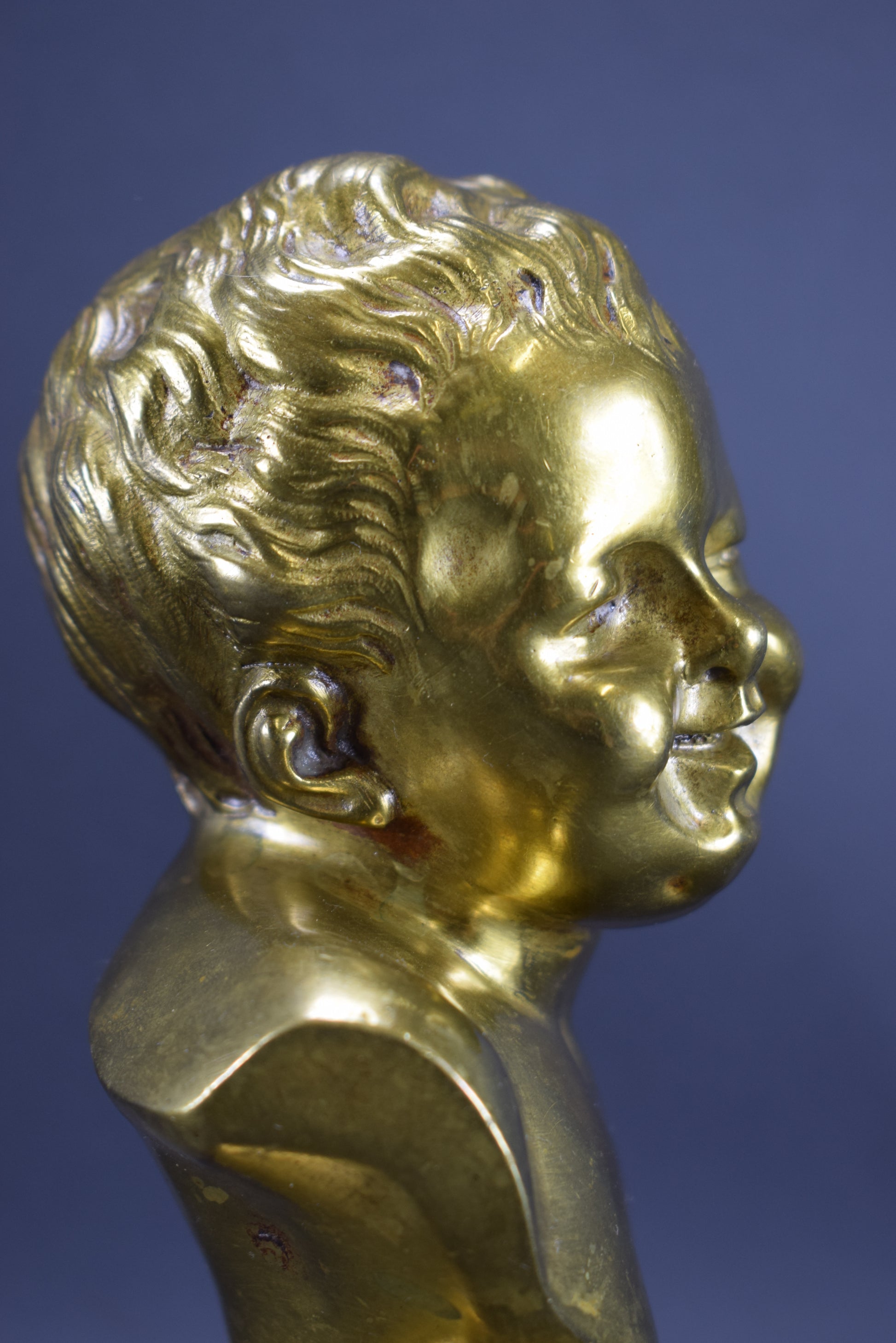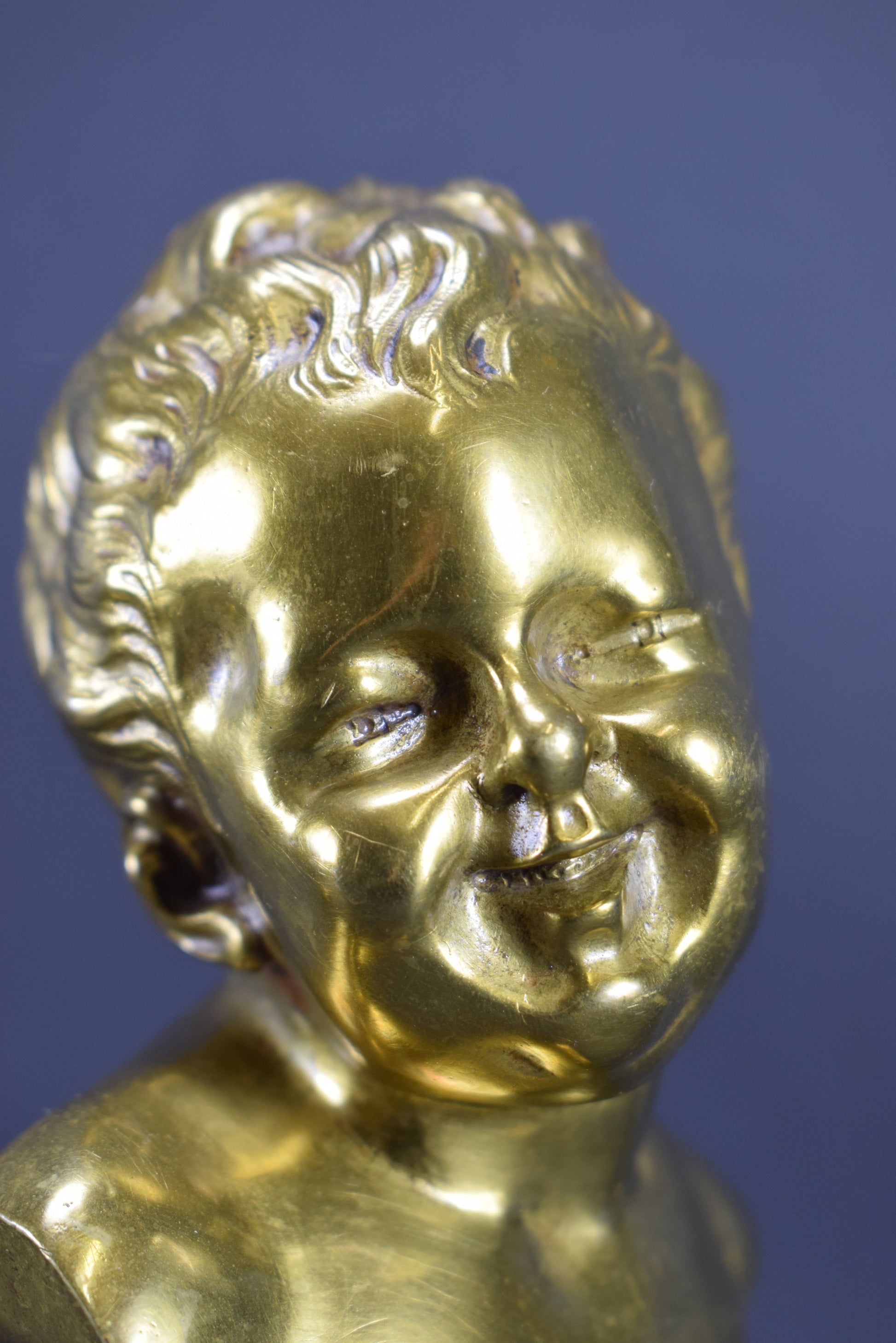 Very charming pair of bronze statues dating to the 19th century. The bust depict the heads of a laughing child and of a crying child. This pair of bronze sculptures was made after Jean Antoine Houdon (1741-1828). "Houdon is famous for his portrait busts and statues of philosophers, inventors and political figures of the Enlightenment. Houdon's subjects include Denis Diderot (1771), Benjamin Franklin (1778-09), Jean-Jacques Rousseau (1778), Voltaire (1781), Molière (1781), George Washington (1785–88), Thomas Jefferson (1789), Louis XVI (1790), Robert Fulton, (1803–04), and Napoléon Bonaparte (1806)."
