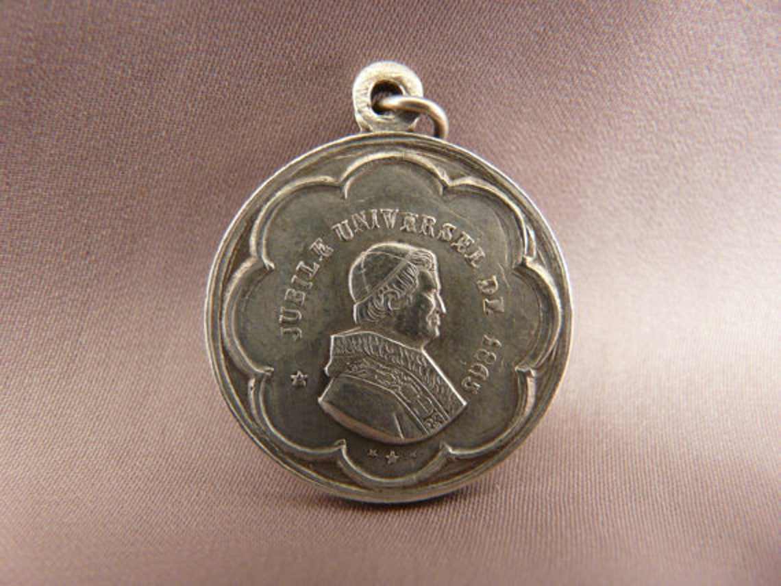 This is an antique French medal from the 19th century. It features Pope IX and on the reverse Virgin Mary. The medal commemorates the universal jubilee of 1865.