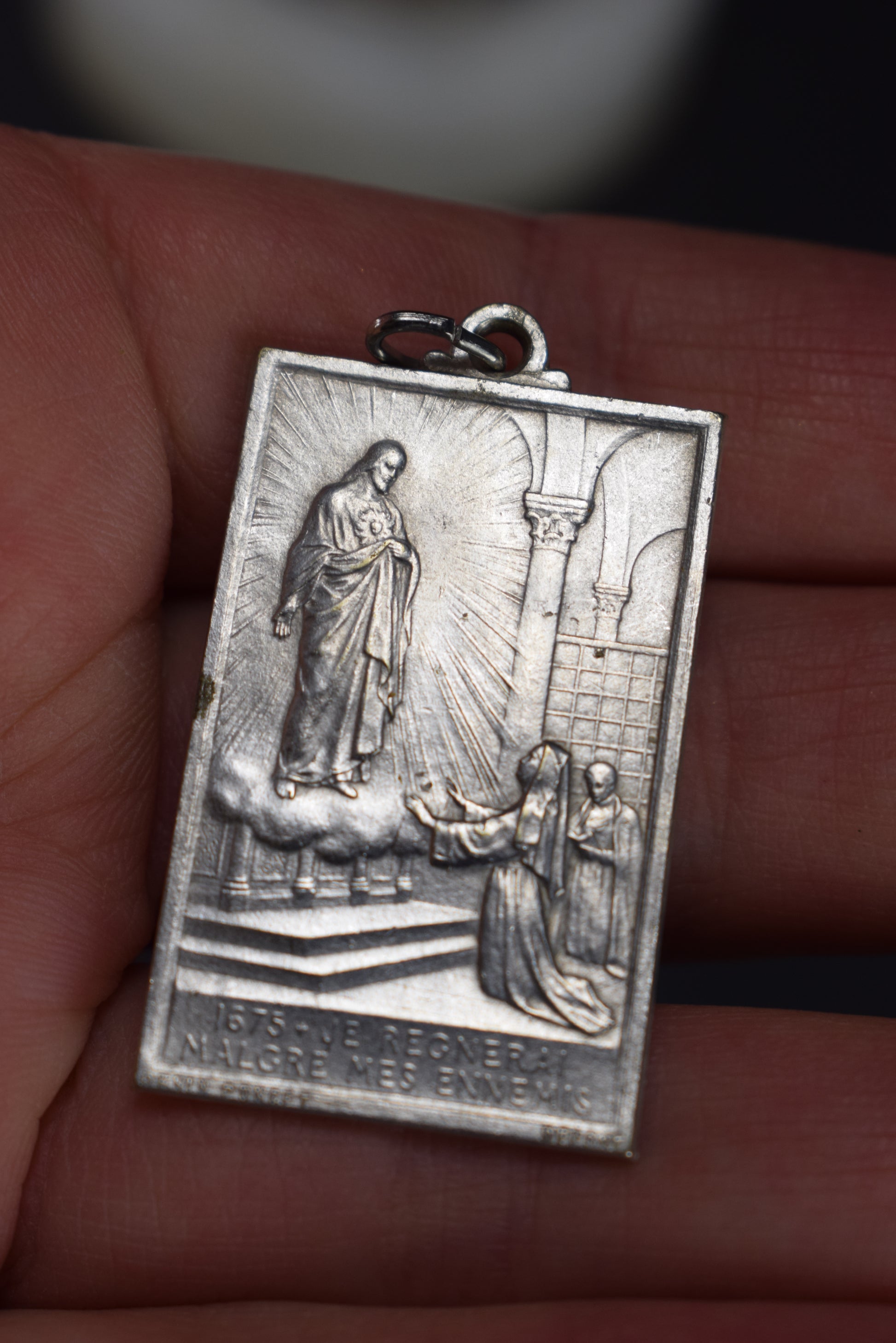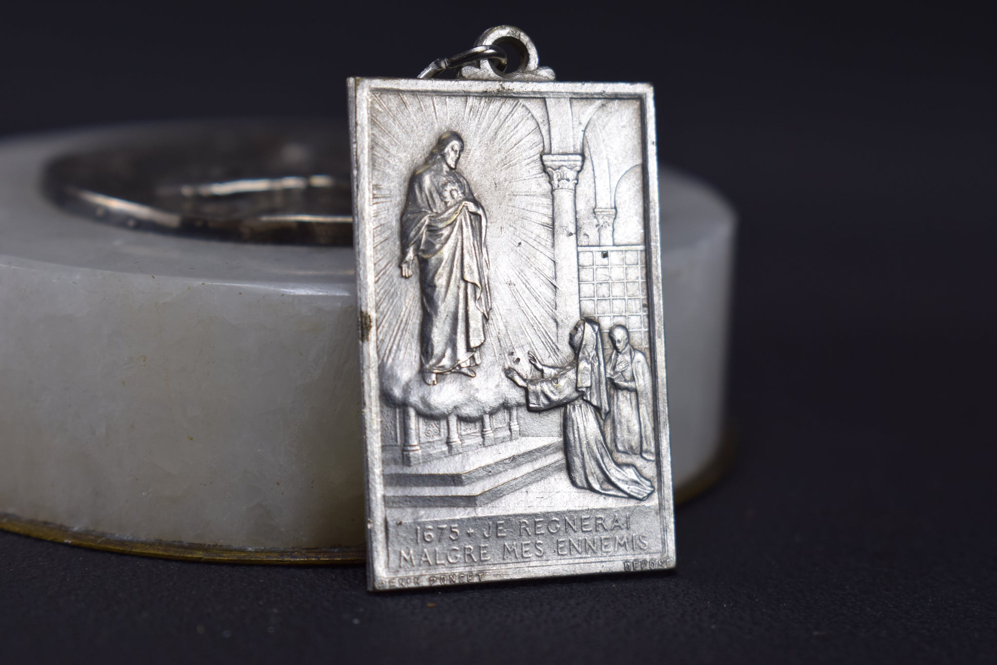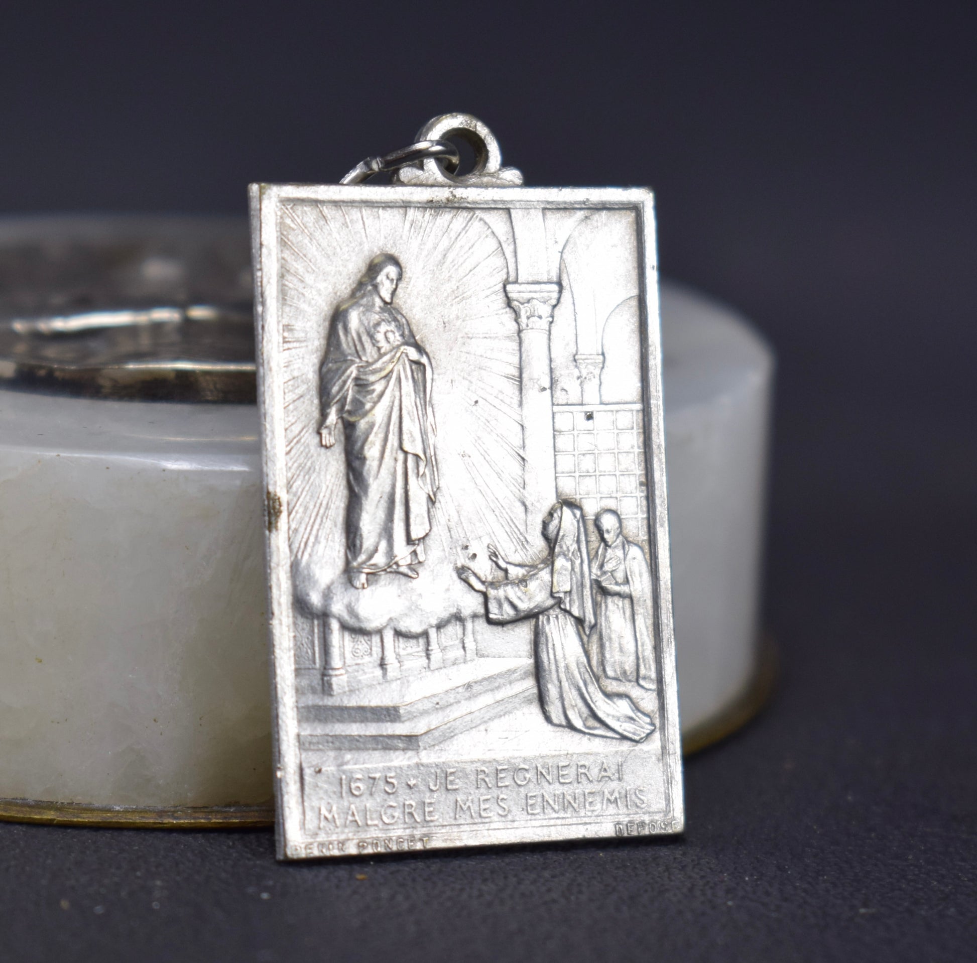 A beautiful vintage religious pendant dating to the 1900's. The silver-plated medal depicts an allegory of France: a crowned woman raising her arms, topped by the radiant sacred heart of Jesus with the city of Paray le Monial in the background (1900, La France appelle les Nations à party-Le-Monial / France calls the Nations to Paray-Le-Monial). The reverse features the apparition of Jesus Christ to Saint Margaret Mary Alacoque in 1675 (je règnerai malgré mes ennemis / I will reign despite my enemies). St. Margaret Mary Alacoque is the patron saint of devotees of the Sacred Heart of Jesus.