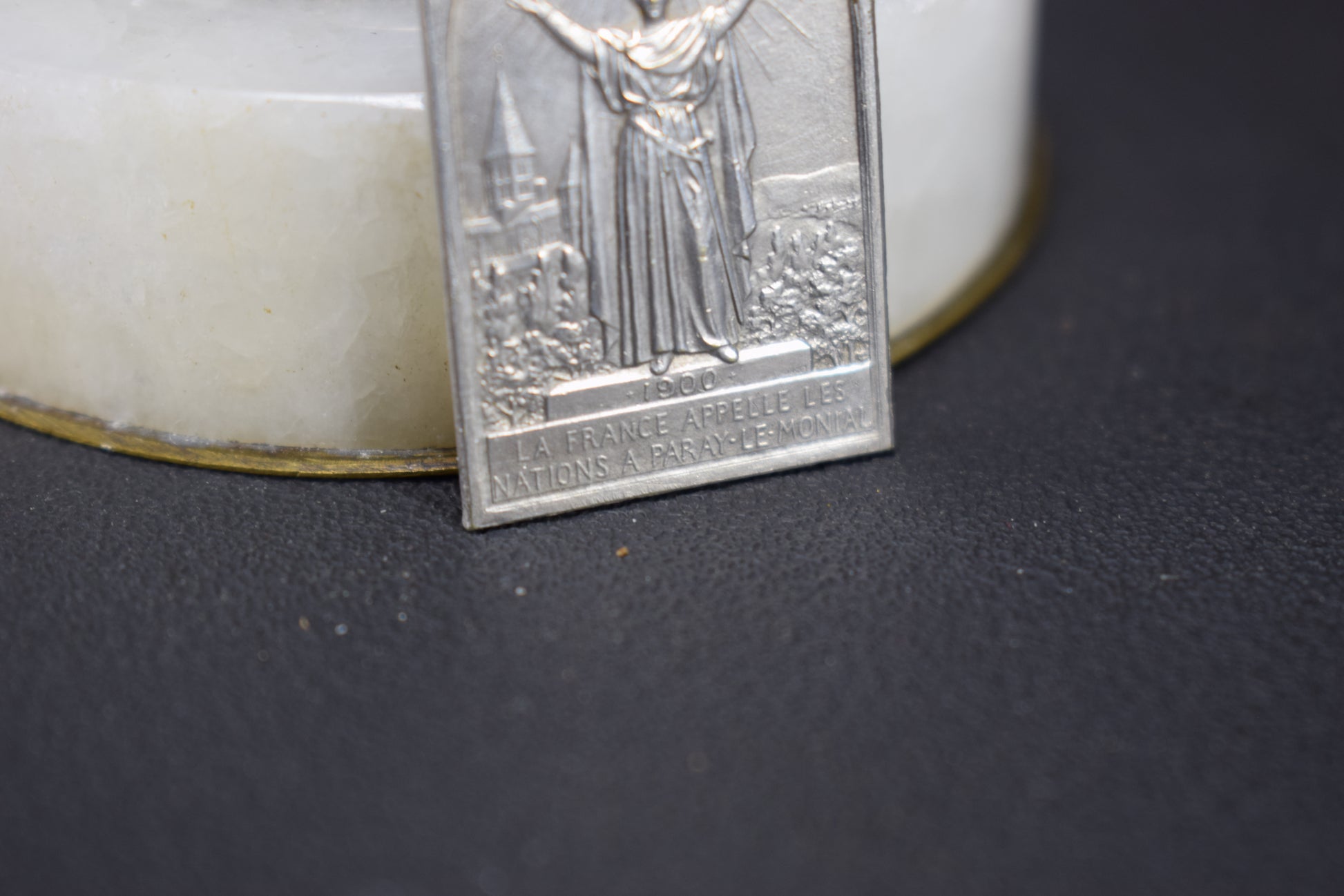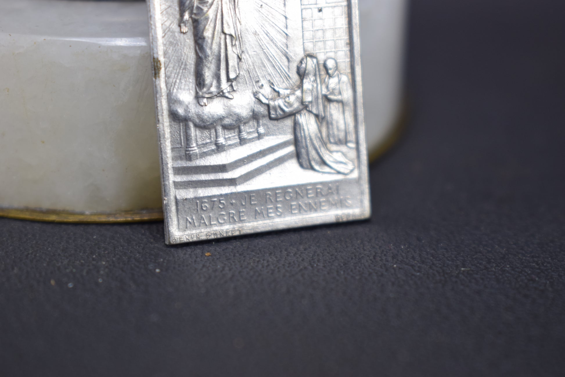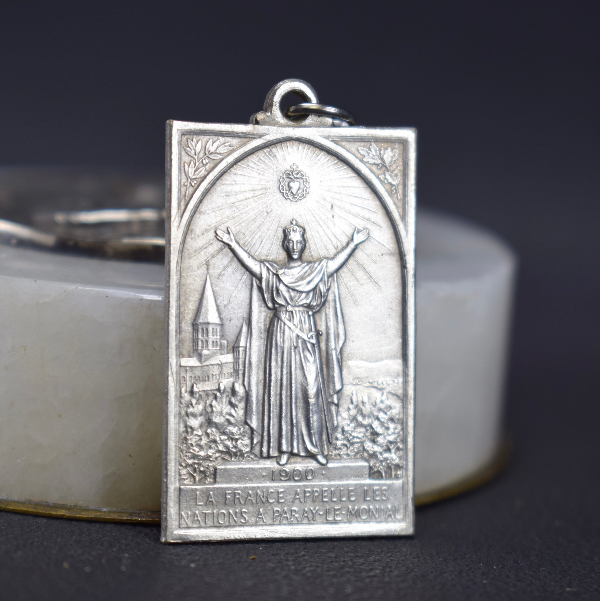 A beautiful vintage religious pendant dating to the 1900's. The silver-plated medal depicts an allegory of France: a crowned woman raising her arms, topped by the radiant sacred heart of Jesus with the city of Paray le Monial in the background (1900, La France appelle les Nations à party-Le-Monial / France calls the Nations to Paray-Le-Monial). The reverse features the apparition of Jesus Christ to Saint Margaret Mary Alacoque in 1675 (je règnerai malgré mes ennemis / I will reign despite my enemies). St. Margaret Mary Alacoque is the patron saint of devotees of the Sacred Heart of Jesus.