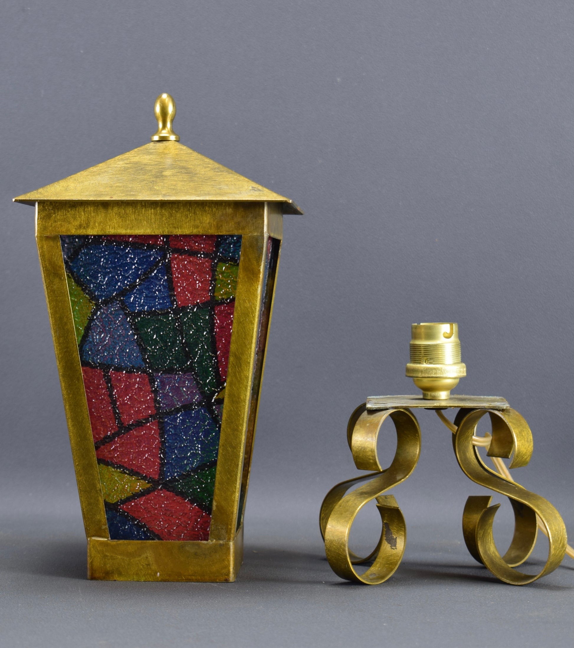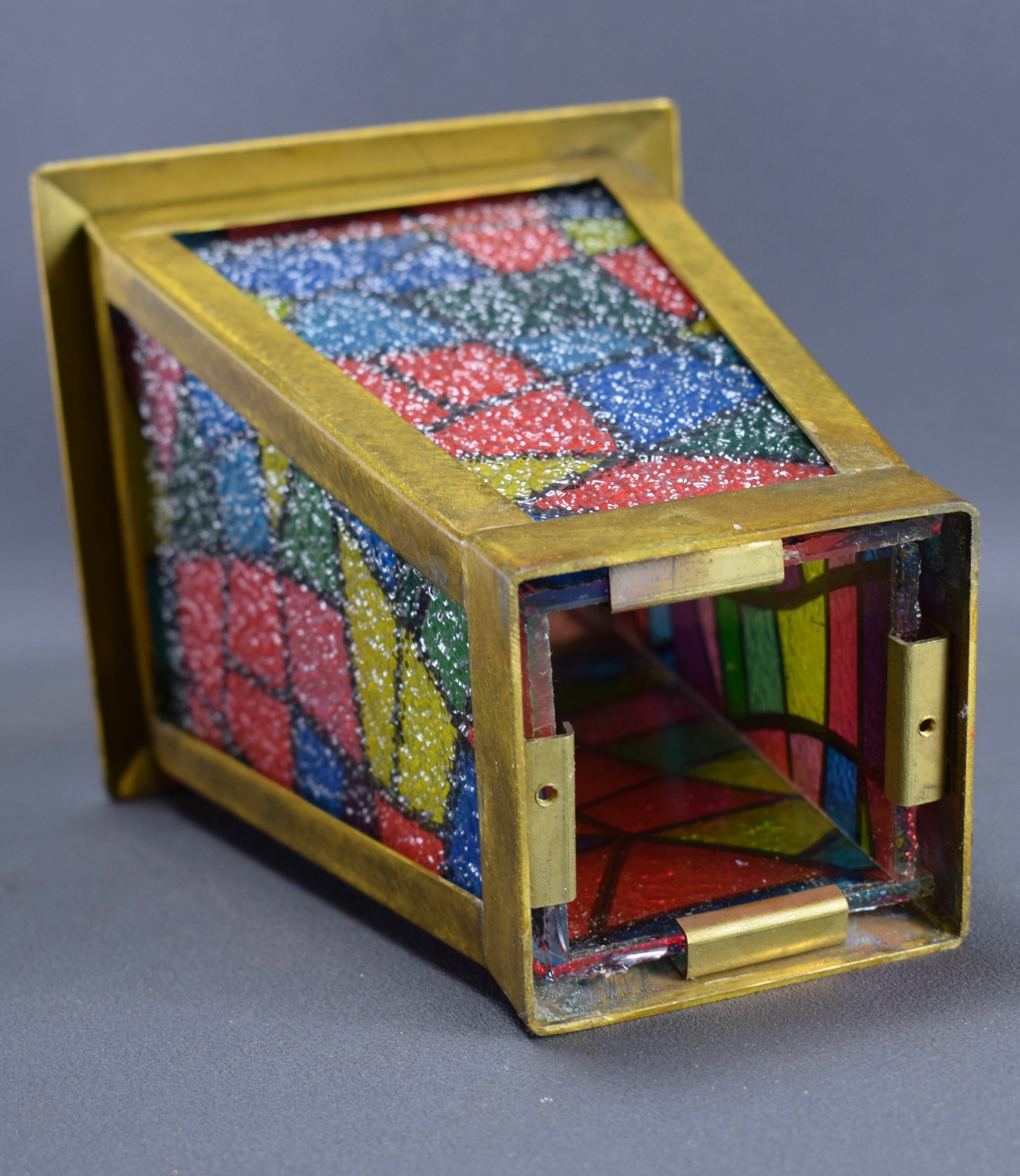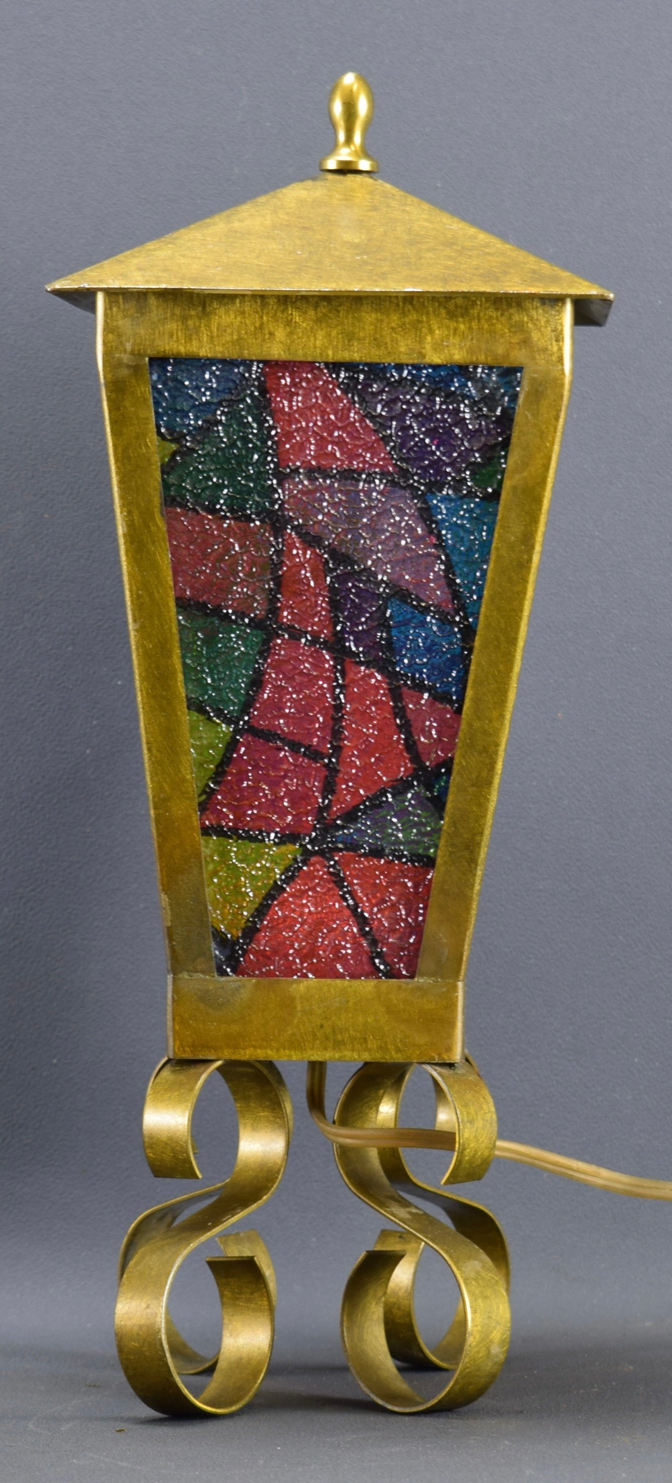 One of a kind Vintage Stained Glass Lantern Table Lamp. Four sides.