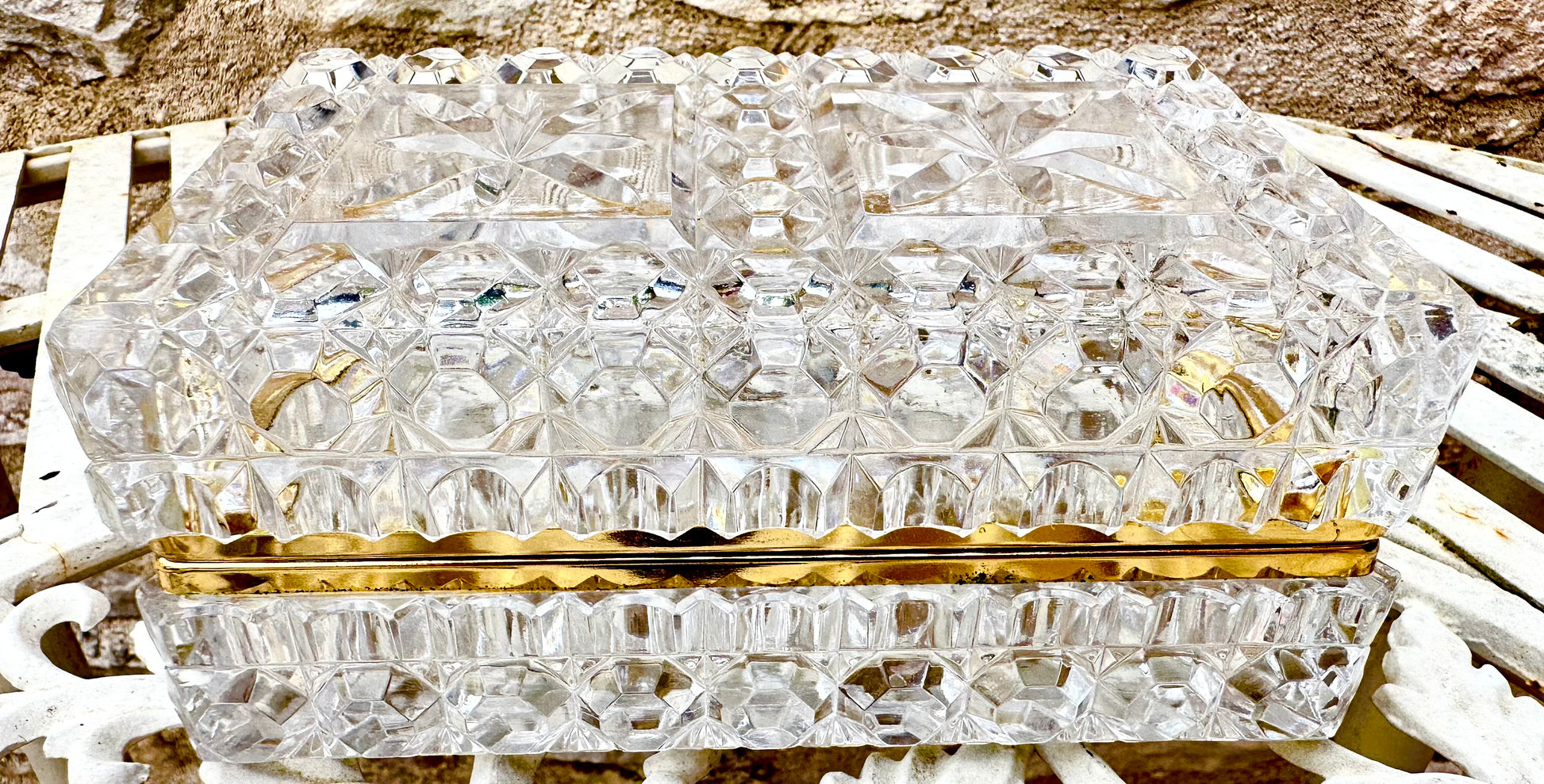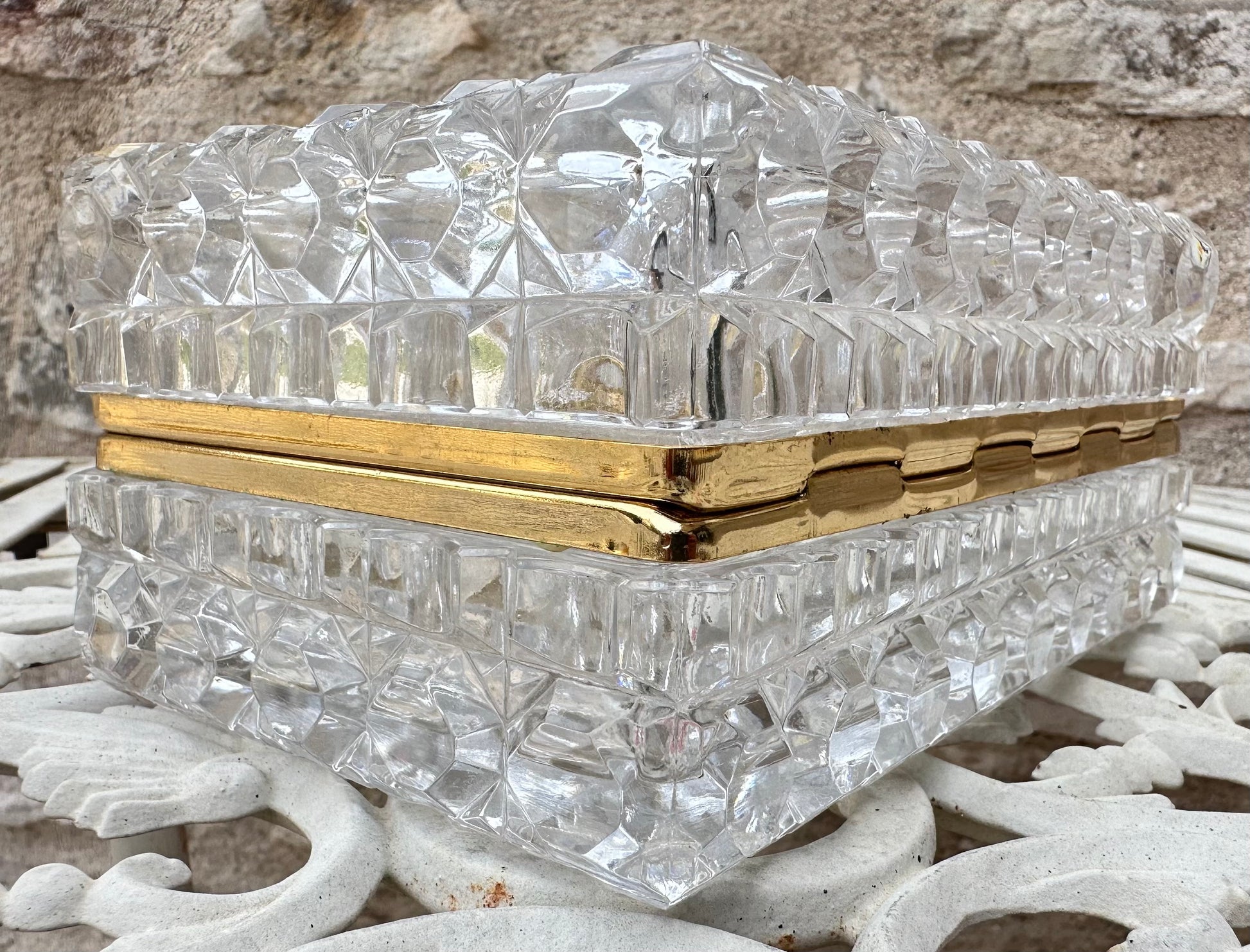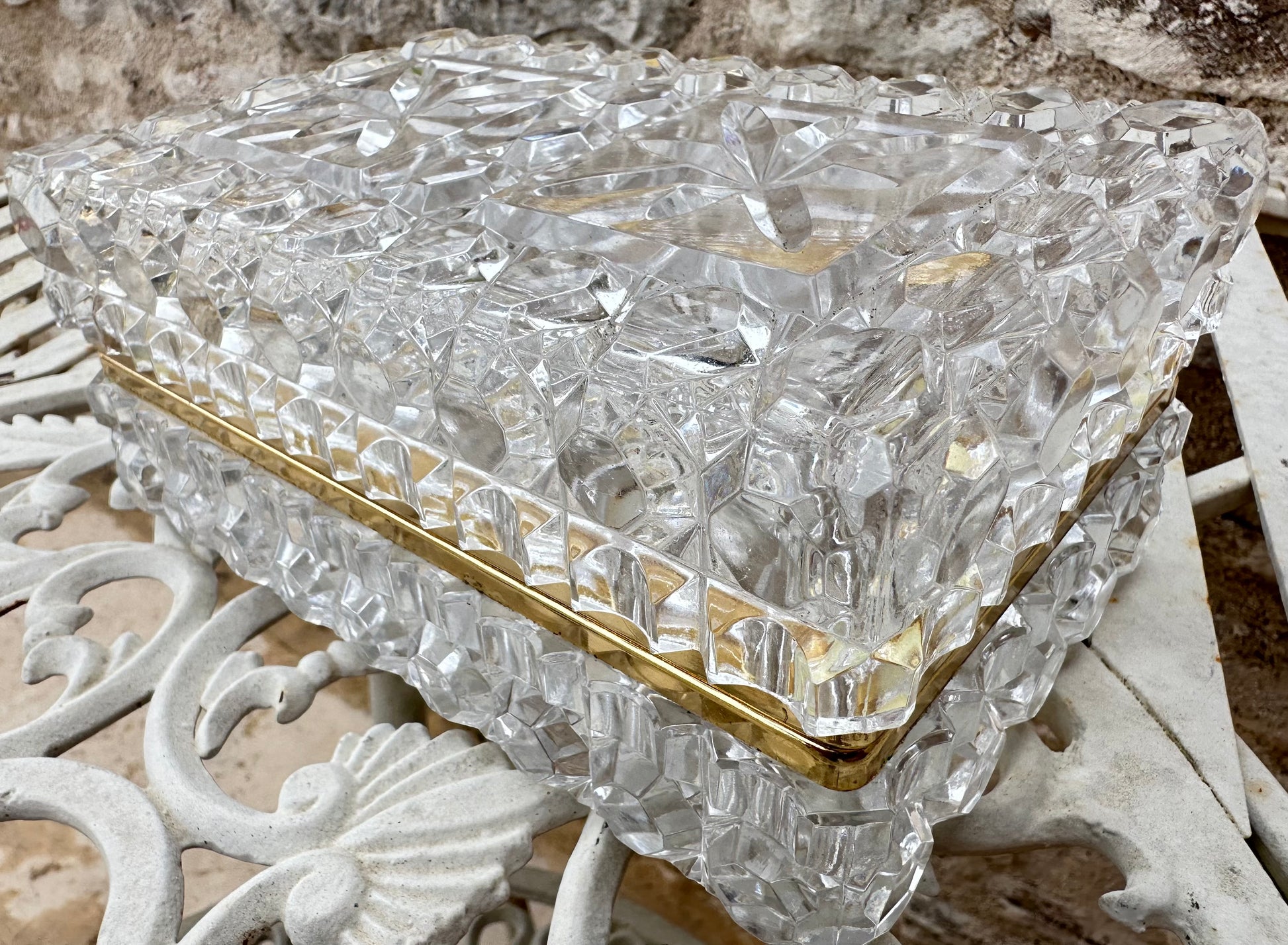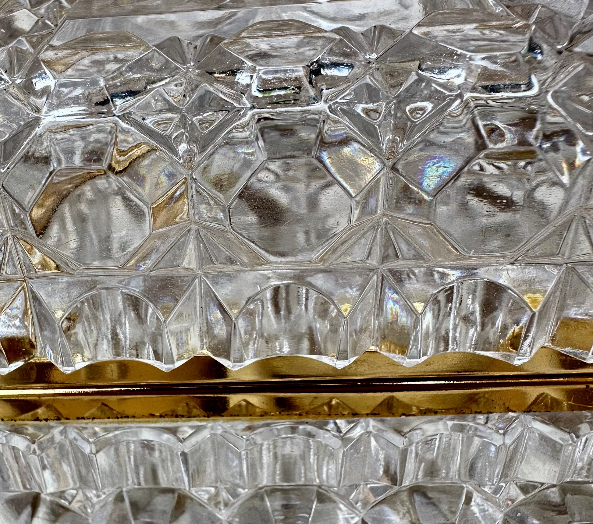 This exquisite jewelry box, exemplifies timeless elegance and fine craftsmanship. The box is meticulously crafted from high-quality lead crystal, renowned for its exceptional clarity and brilliance. The faceted design enhances its sparkle, capturing and reflecting light in a dazzling display. The The Hollywood Regency elegant jewelry casket or dresser box features a refined, geometric pattern that accentuates its sophisticated aesthetic. The box's interior is spacious enough to accommodate a variety of jewelry pieces, making it not only a stunning decorative item but also a practical storage solution. The mount is made of gold plated brass.