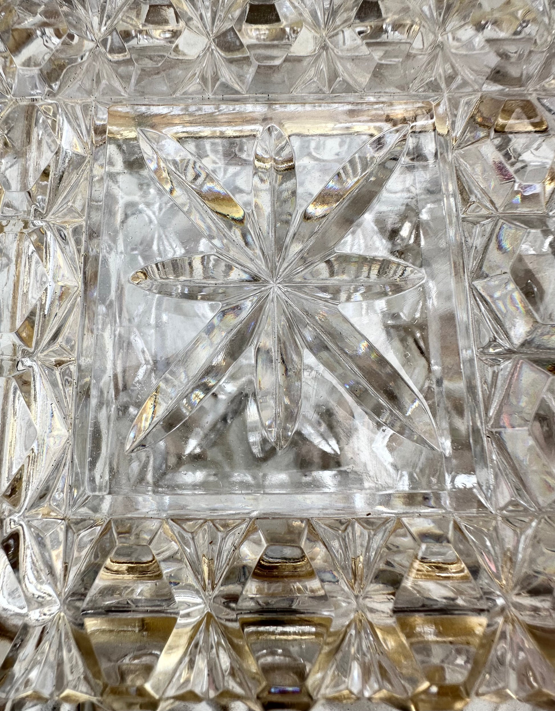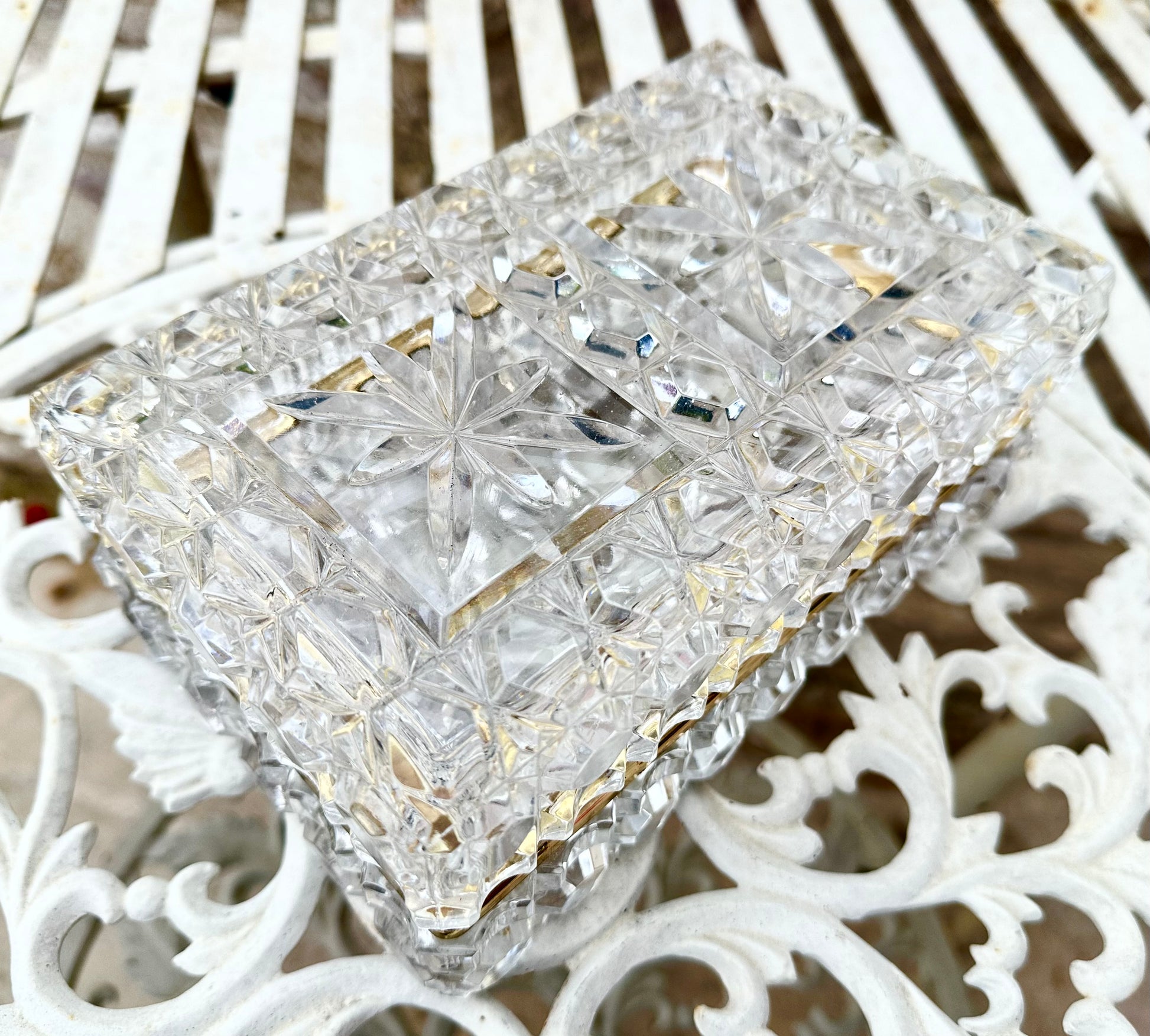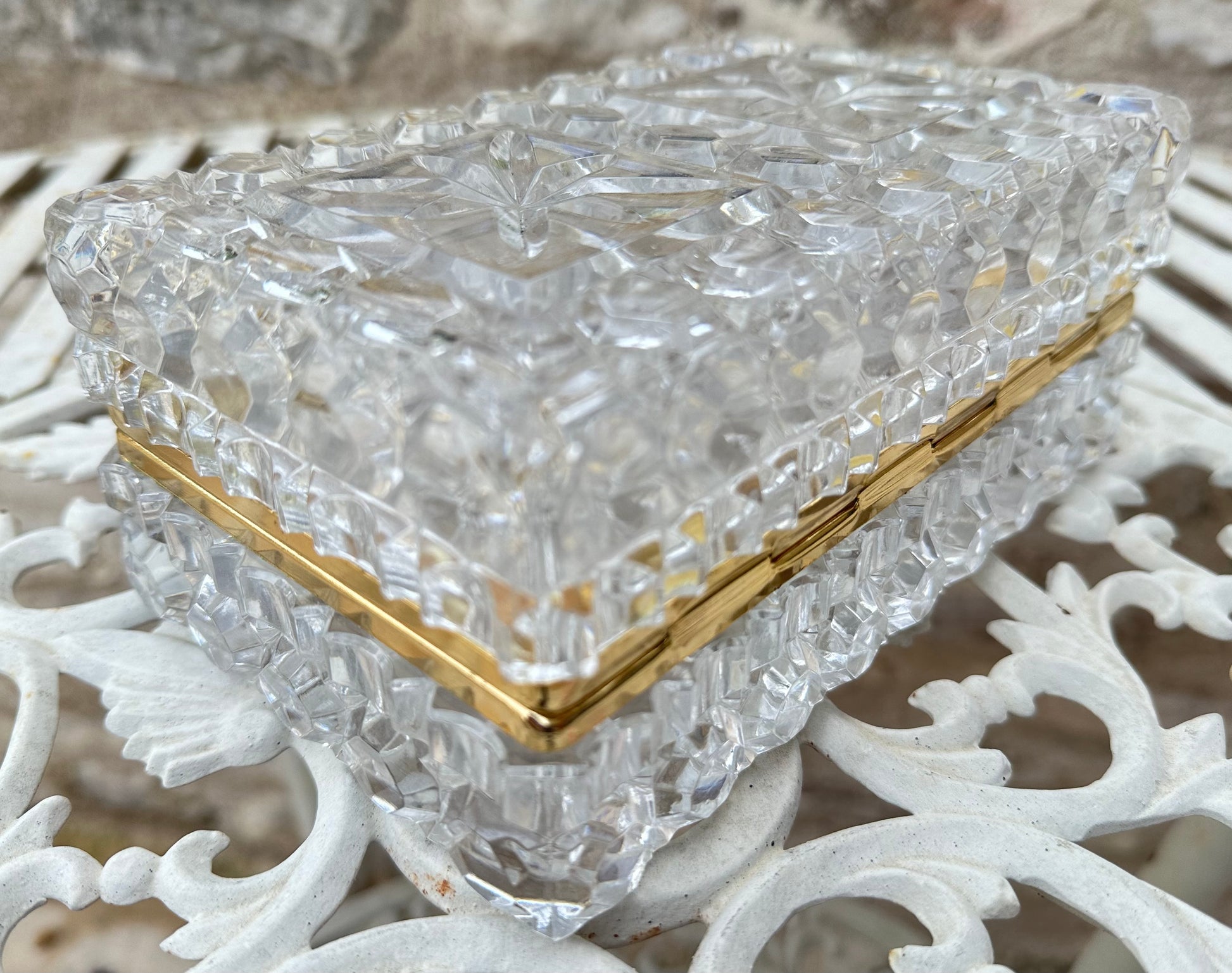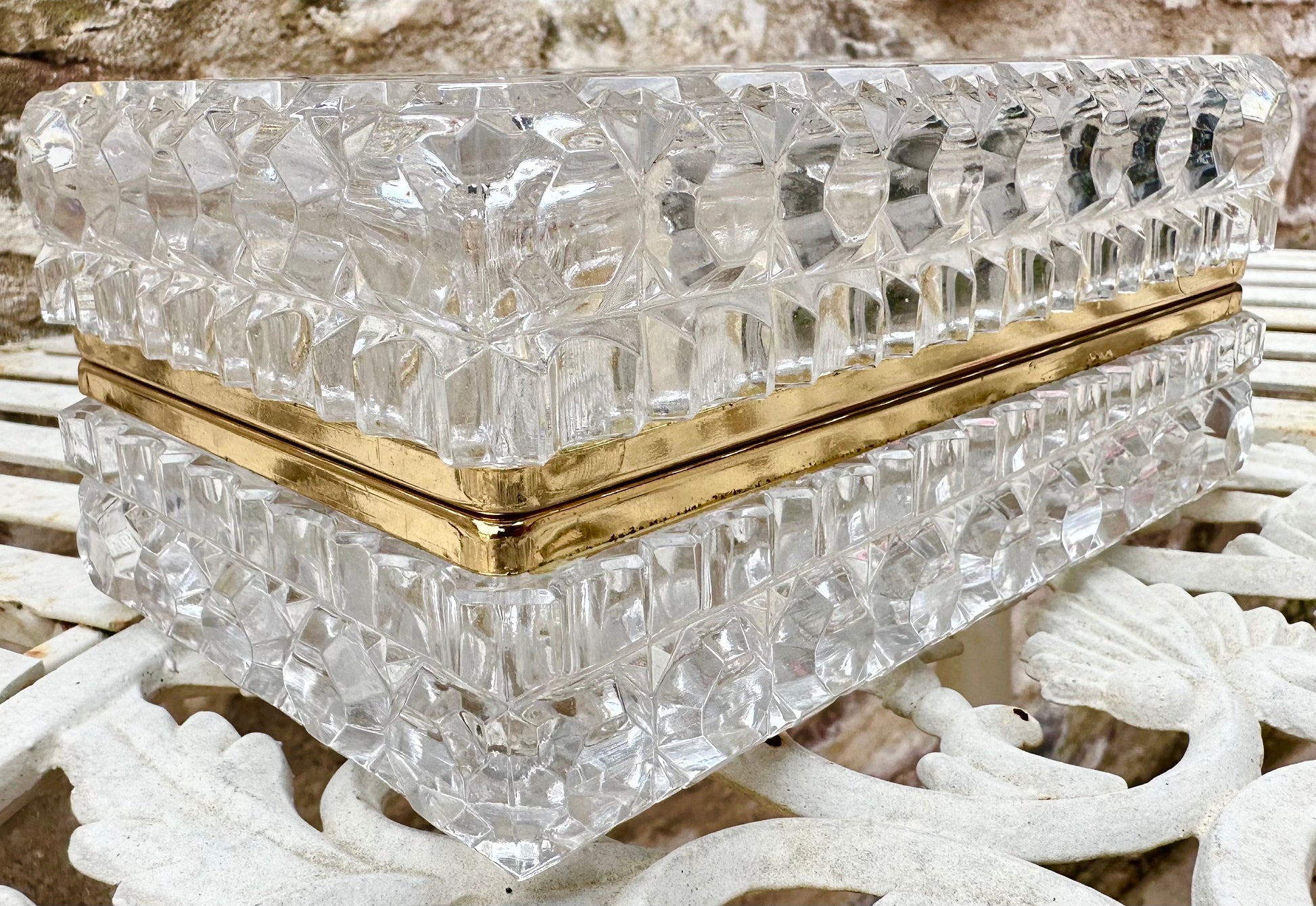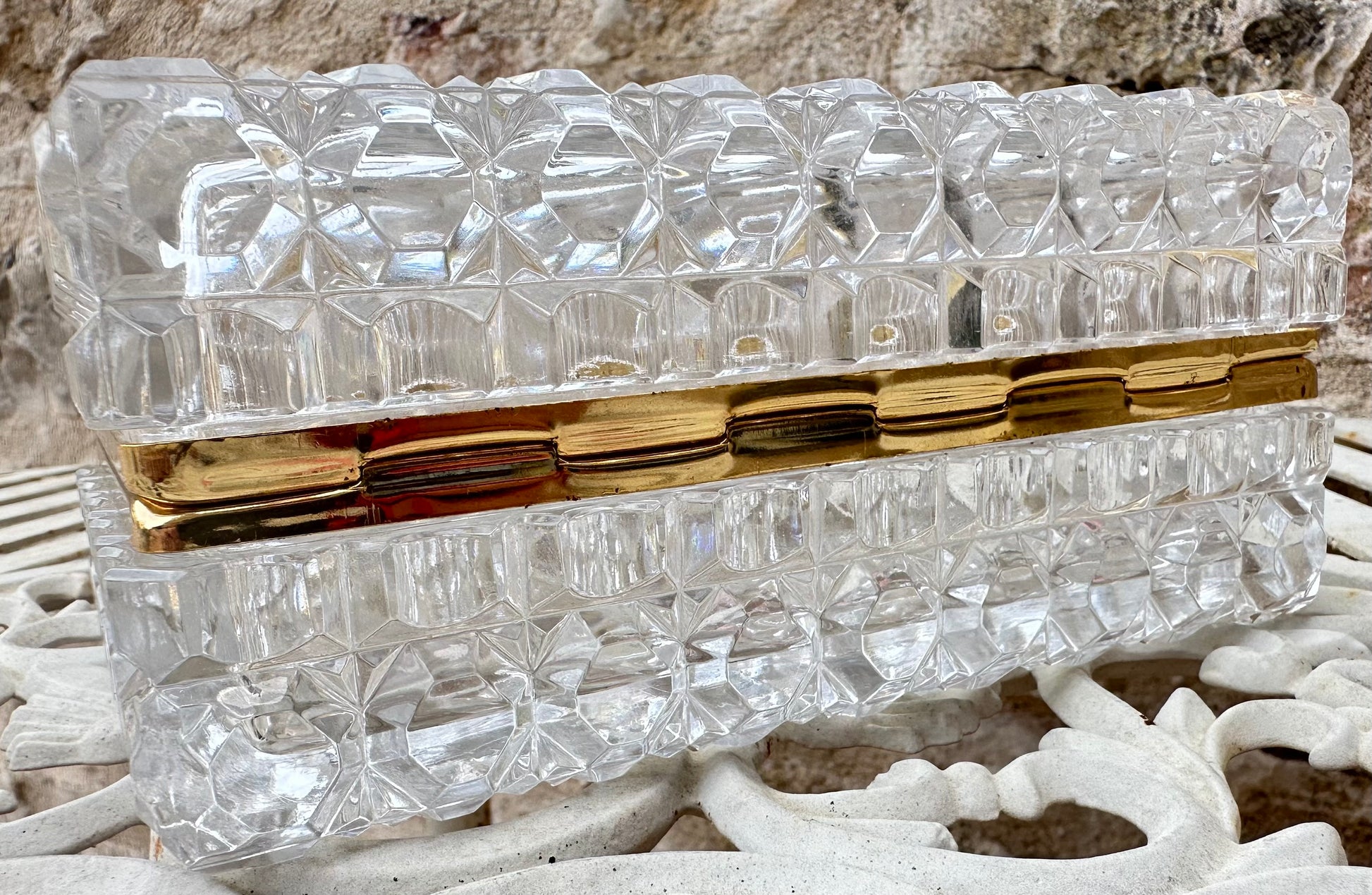 This exquisite jewelry box, exemplifies timeless elegance and fine craftsmanship. The box is meticulously crafted from high-quality lead crystal, renowned for its exceptional clarity and brilliance. The faceted design enhances its sparkle, capturing and reflecting light in a dazzling display. The The Hollywood Regency elegant jewelry casket or dresser box features a refined, geometric pattern that accentuates its sophisticated aesthetic. The box's interior is spacious enough to accommodate a variety of jewelry pieces, making it not only a stunning decorative item but also a practical storage solution. The mount is made of gold plated brass.
