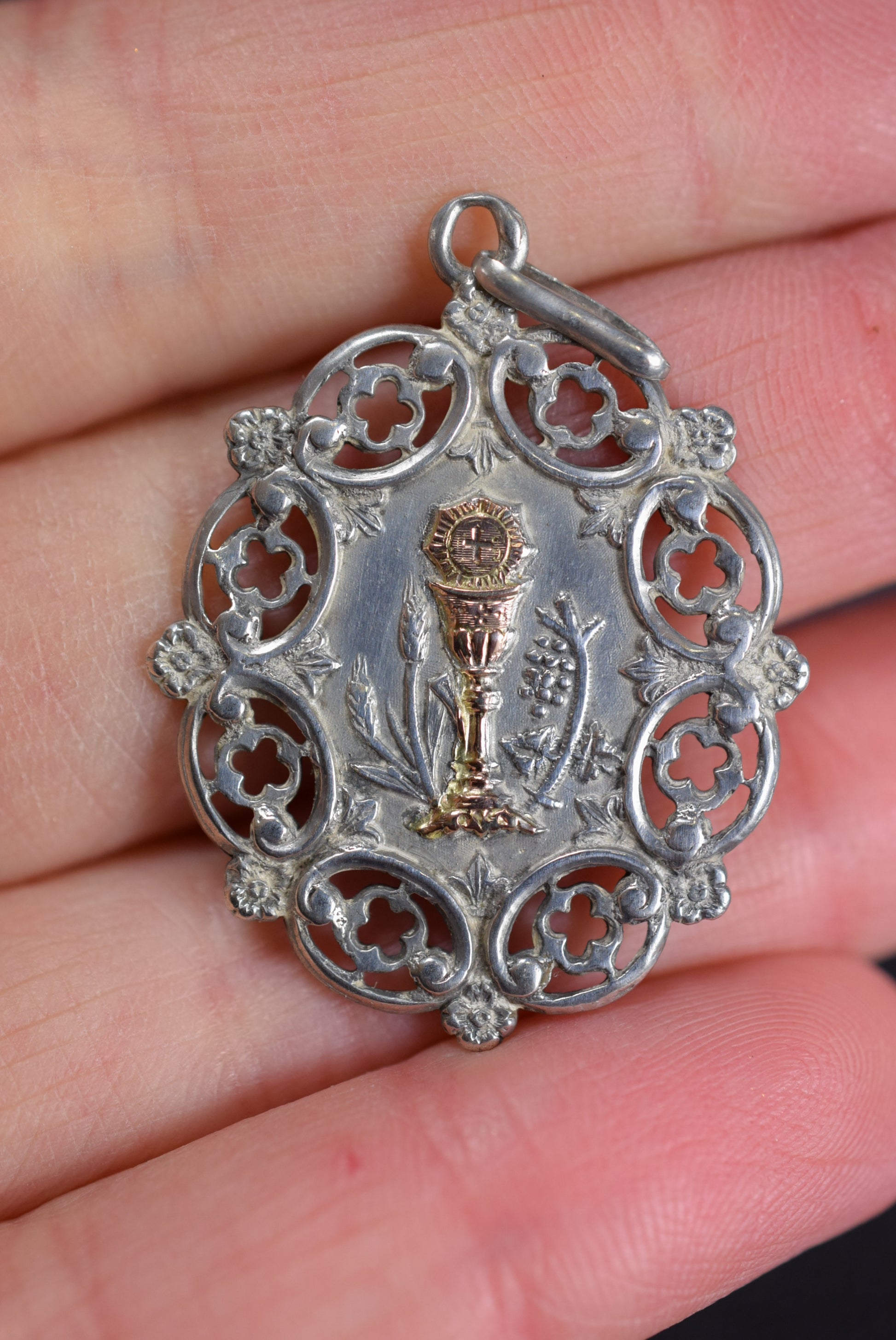 A beautiful French antique religious medal made of solid sterling silver. The Catholic pendant dates to the late 19th century. Gorgeous openwork decor with a goldplated chalice on the middle. The back has been engraved with two initials and dated 4th May 1913.