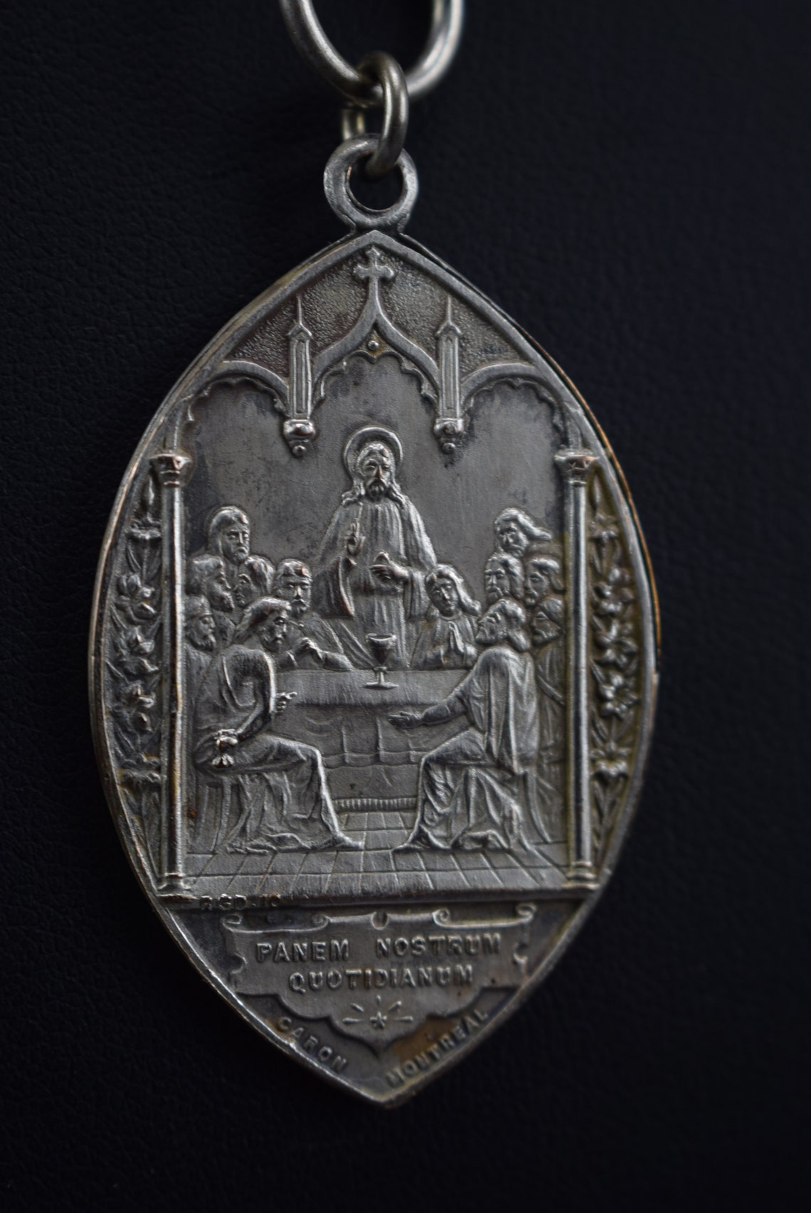 The rare pendant features Mary on one side and Jesus and His twelve apostles at the Last Supper with the words "Panem Nostrum Quotidianum" which means "Our Daily Bread" on the other side.