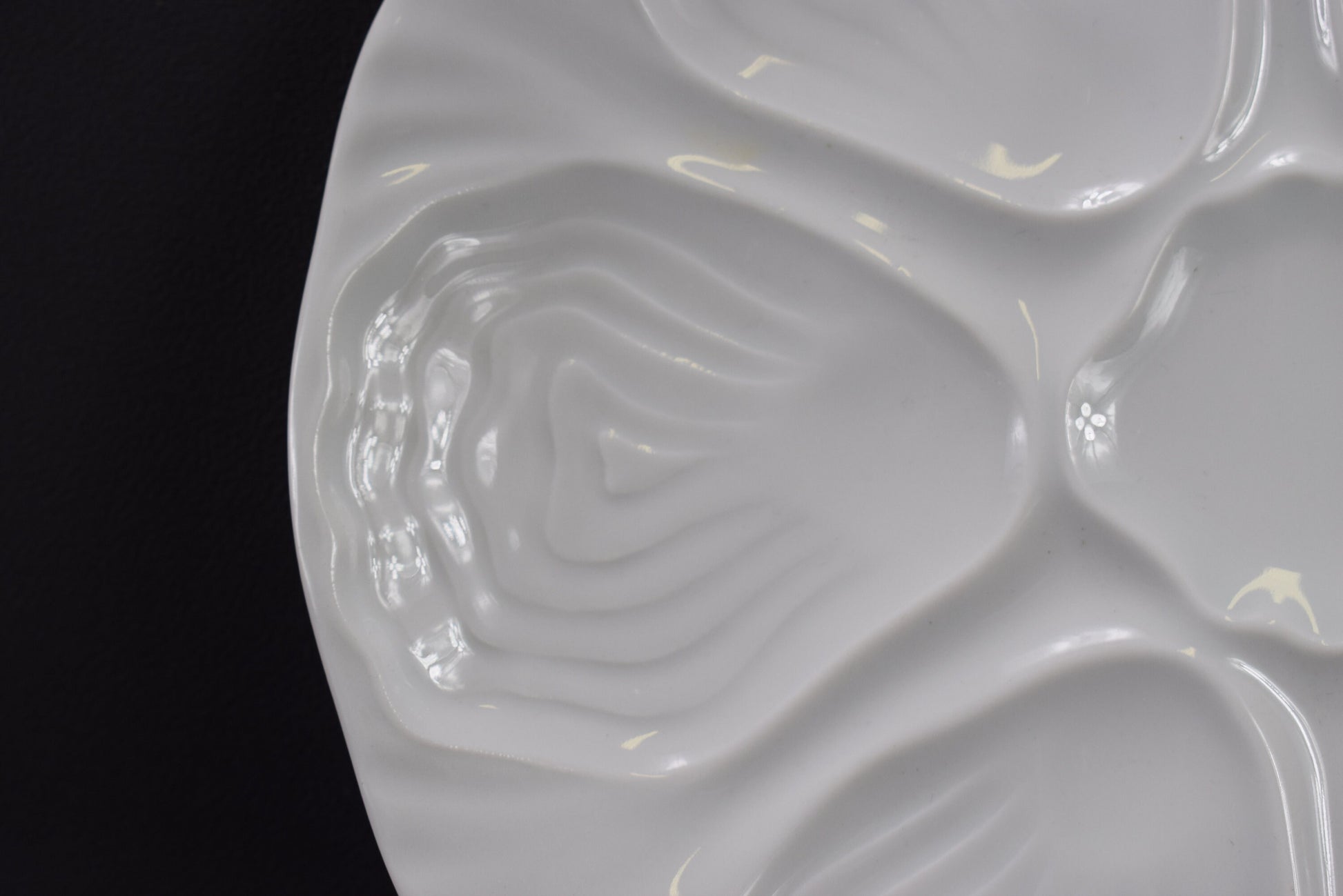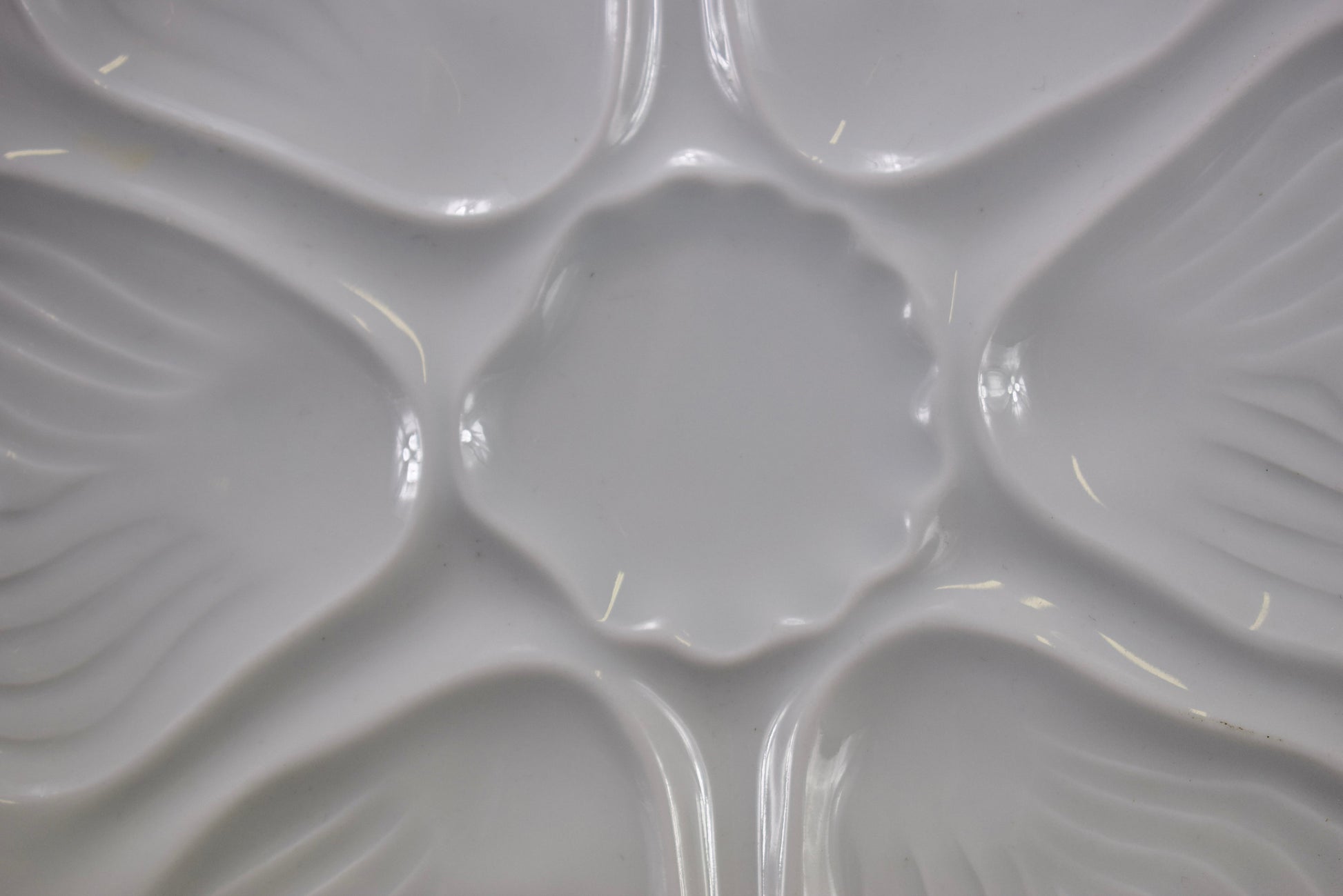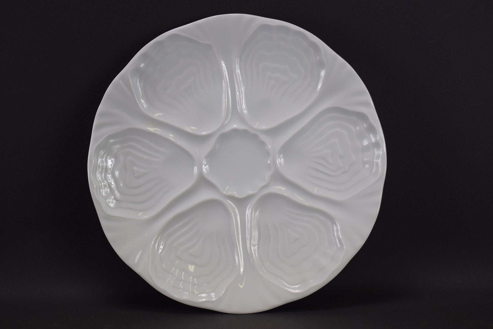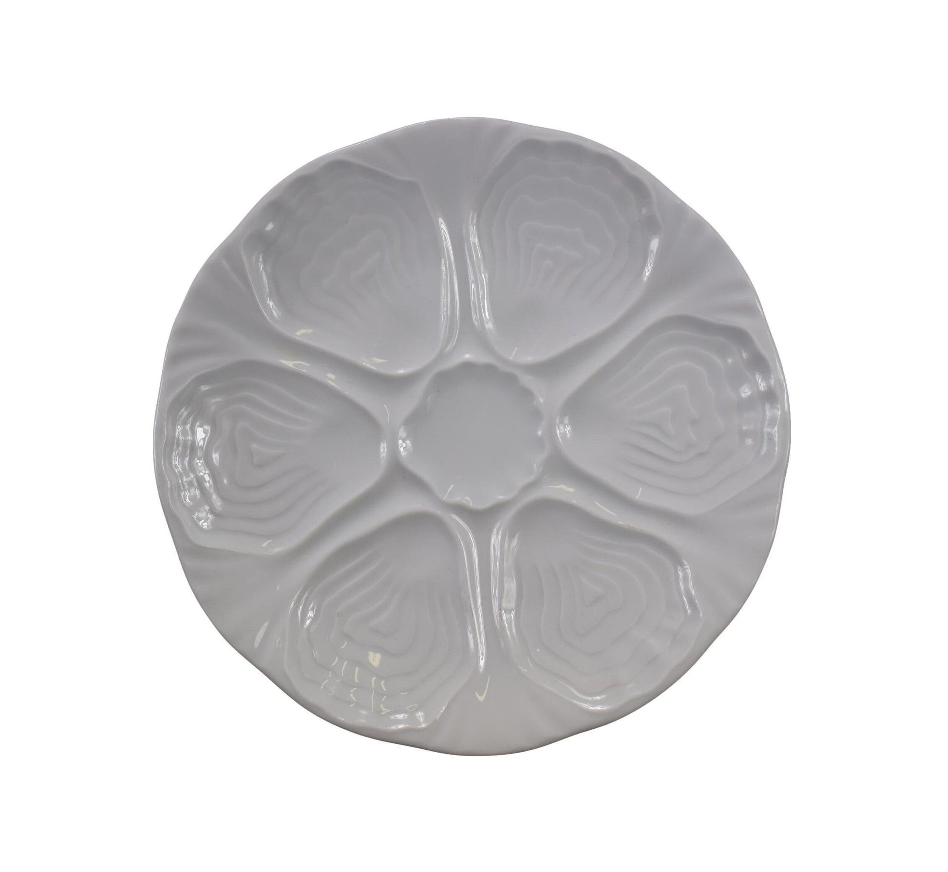 The plate is elegantly designed with six wells for oysters, arranged in a symmetrical pattern around a central well that can be used for lemon slices or sauce. Each well is shaped to cradle an oyster perfectly, making it not only a functional piece but also a beautiful addition to any table setting.