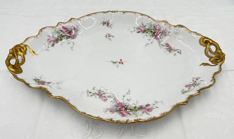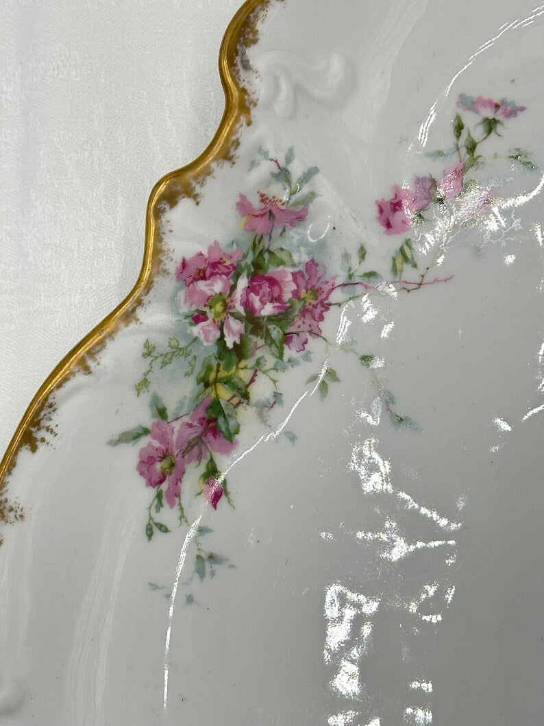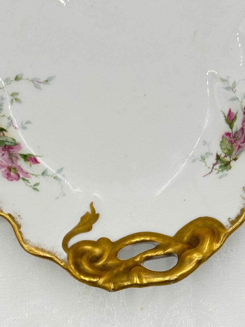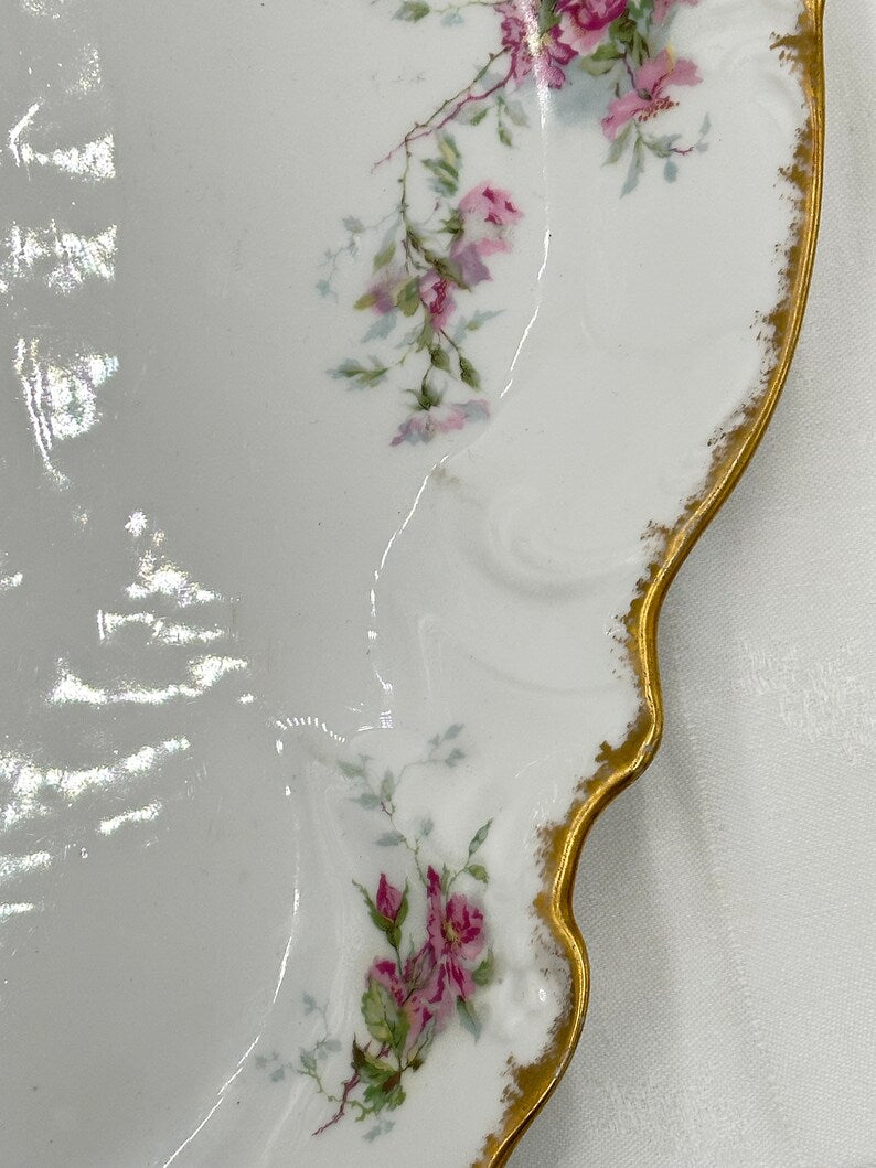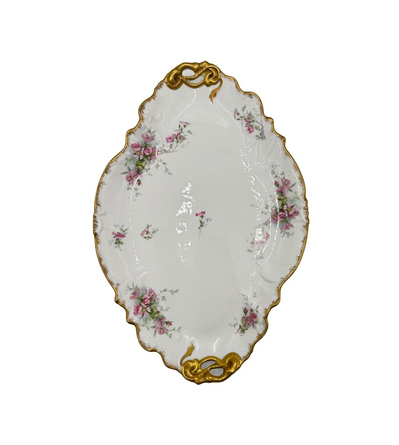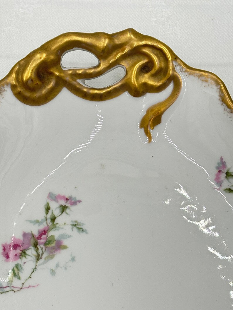 Add a touch of vintage elegance to your table with this exquisite early 20th century Limoges porcelain serving dish. Adorned with a beautiful wild pink roses decor and highlighted with luxurious gold rims, this piece exemplifies the fine craftsmanship and timeless beauty of Limoges porcelain.