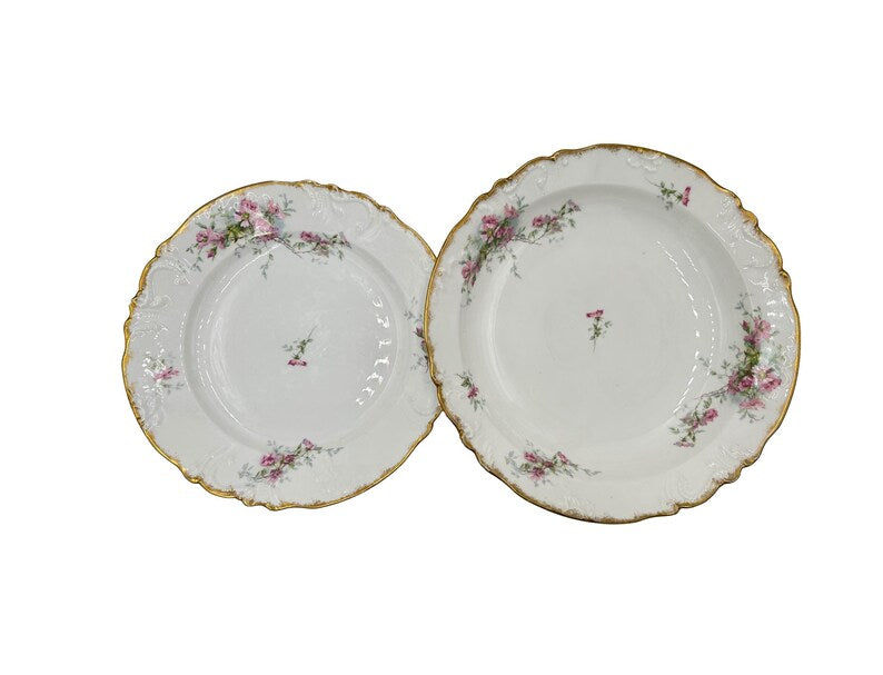 Enhance your dining table with this elegant set of two French antique serving dishes. Featuring beautifully detailed wild rose round Limoges porcelain dishes, these pieces are perfect for adding a touch of classic French sophistication to your culinary presentations.