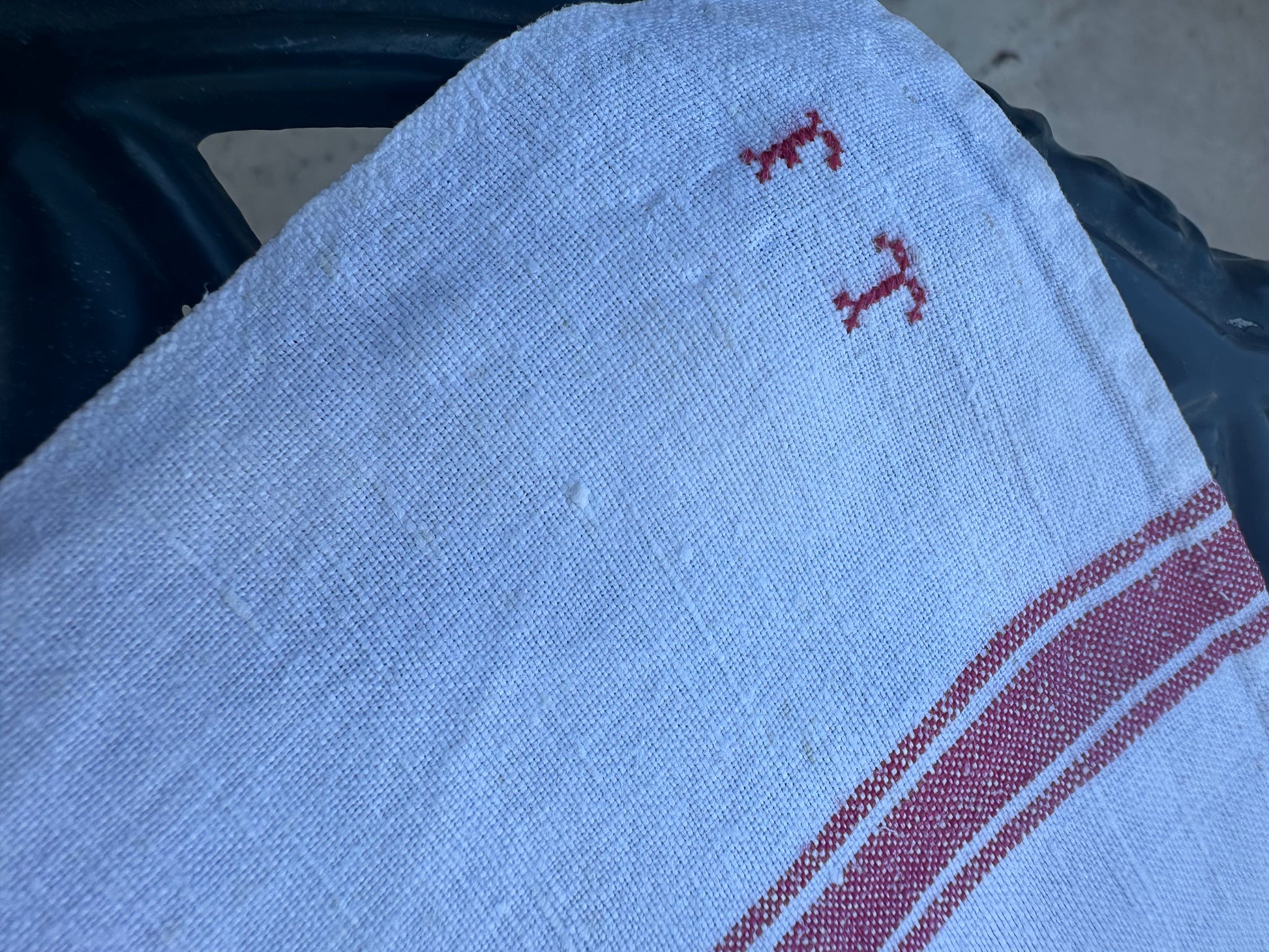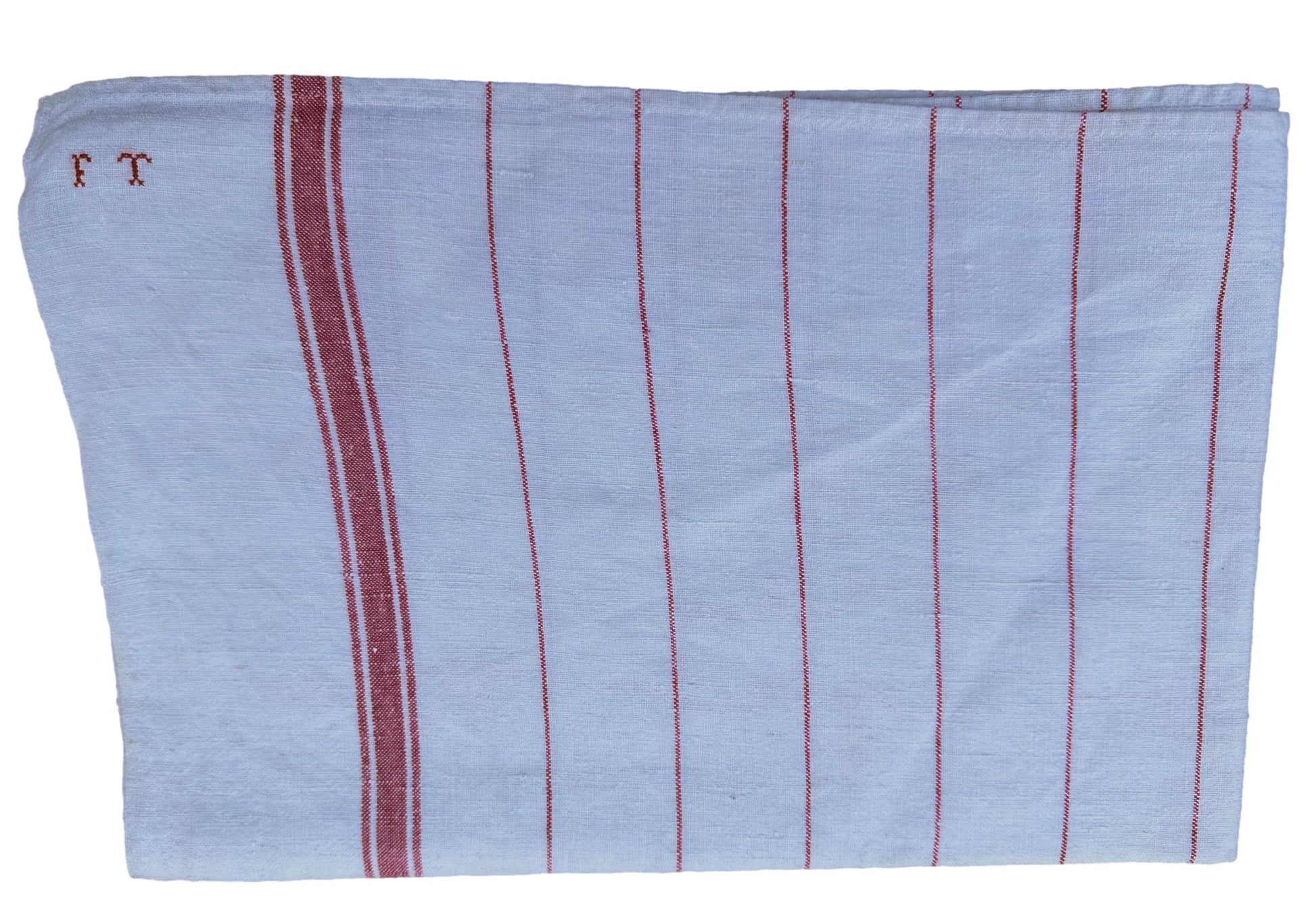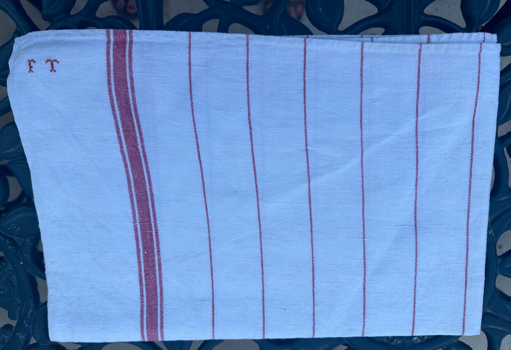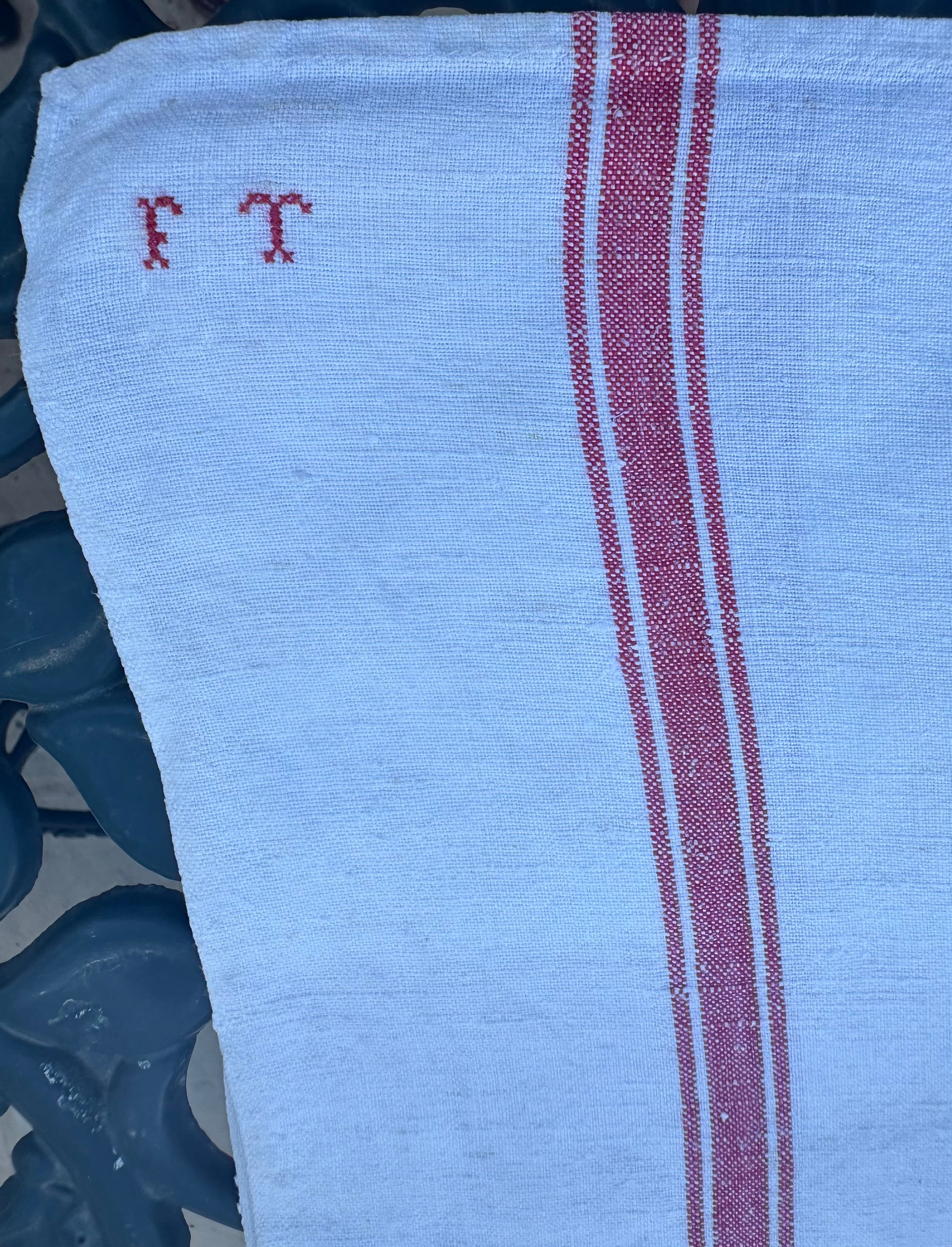 Adding to its charm, the towel is monogrammed with the initials "FT," meticulously stitched to reflect the personalization and attention to detail characteristic of the era. The monogram not only denotes the original owner's initials but also serves as a distinctive historical element that enhances the towel's vintage appeal.