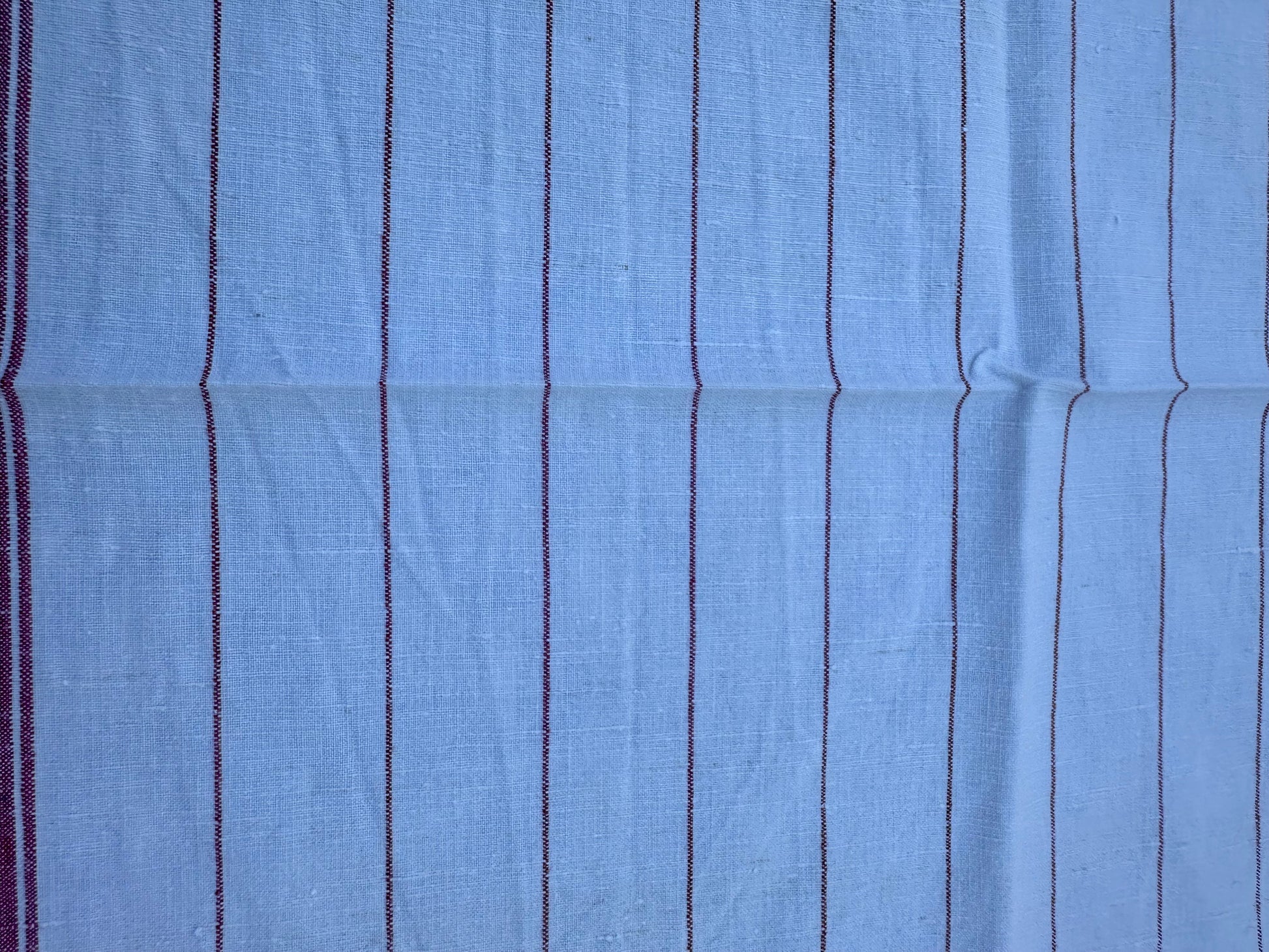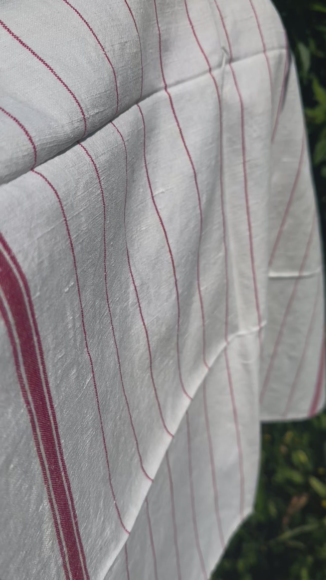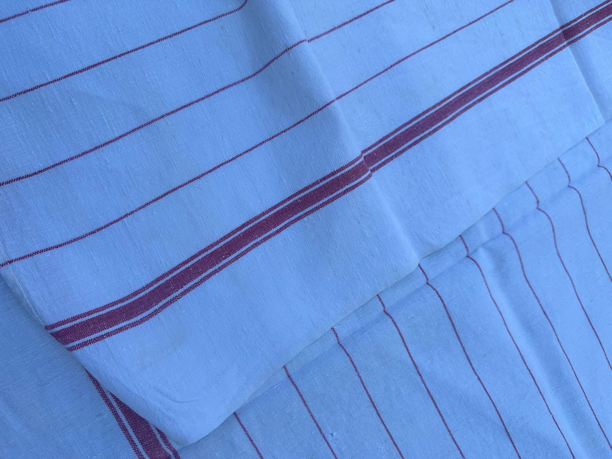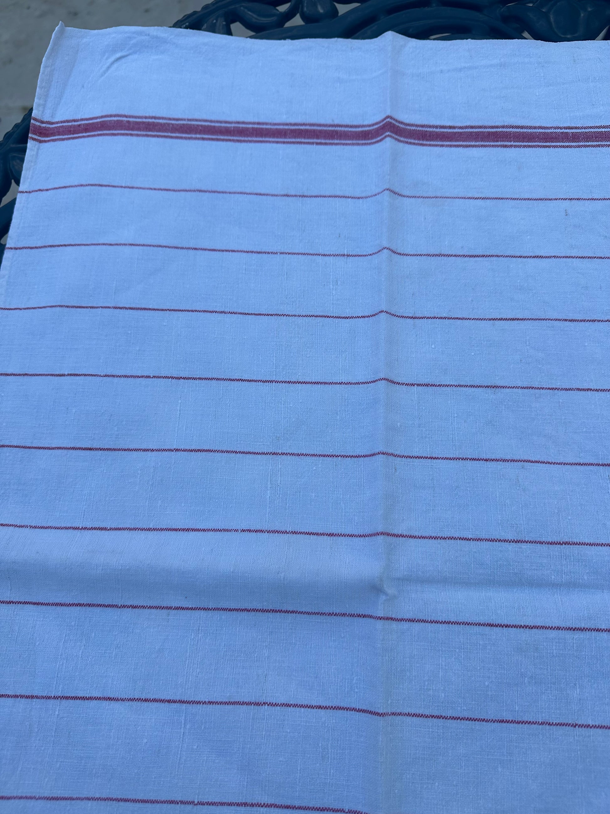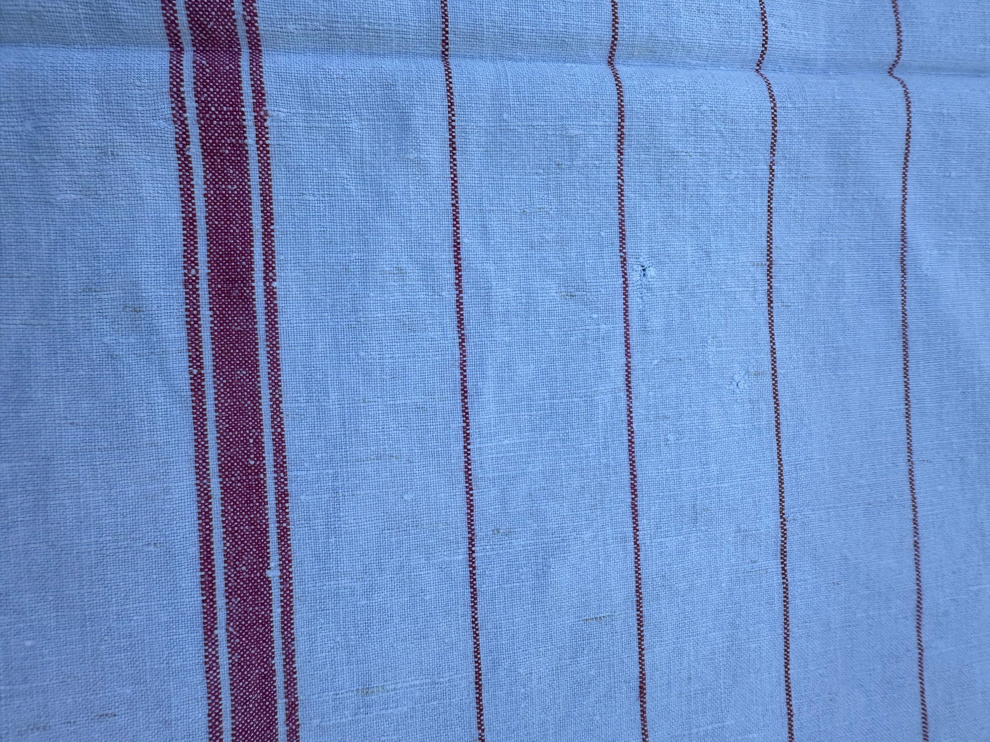The towel features several vibrant red stripes running vertically, a classic design that adds a lively touch while maintaining a rustic and traditional aesthetic. These stripes are woven into the fabric, ensuring they remain bright and intact through frequent use and washing.