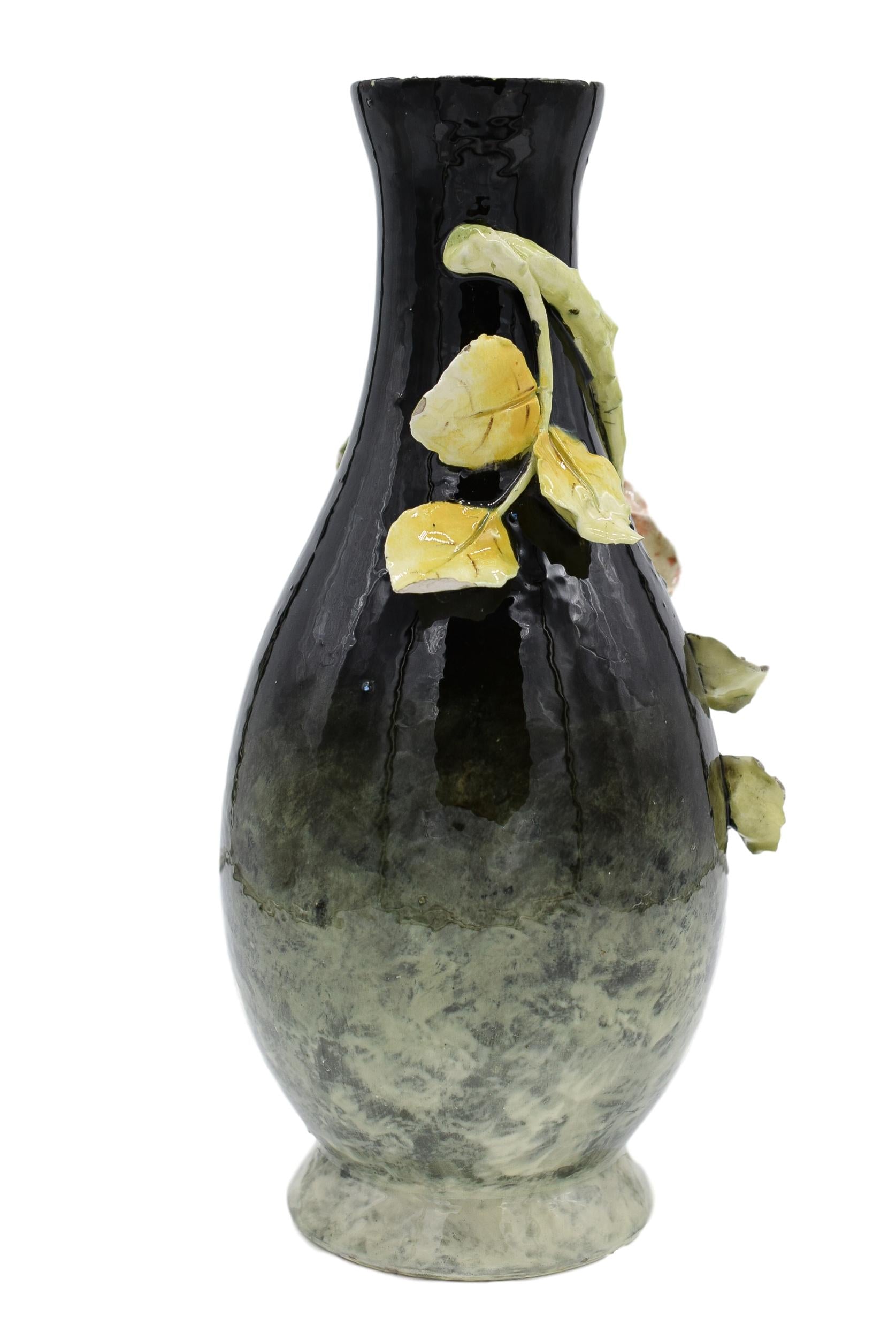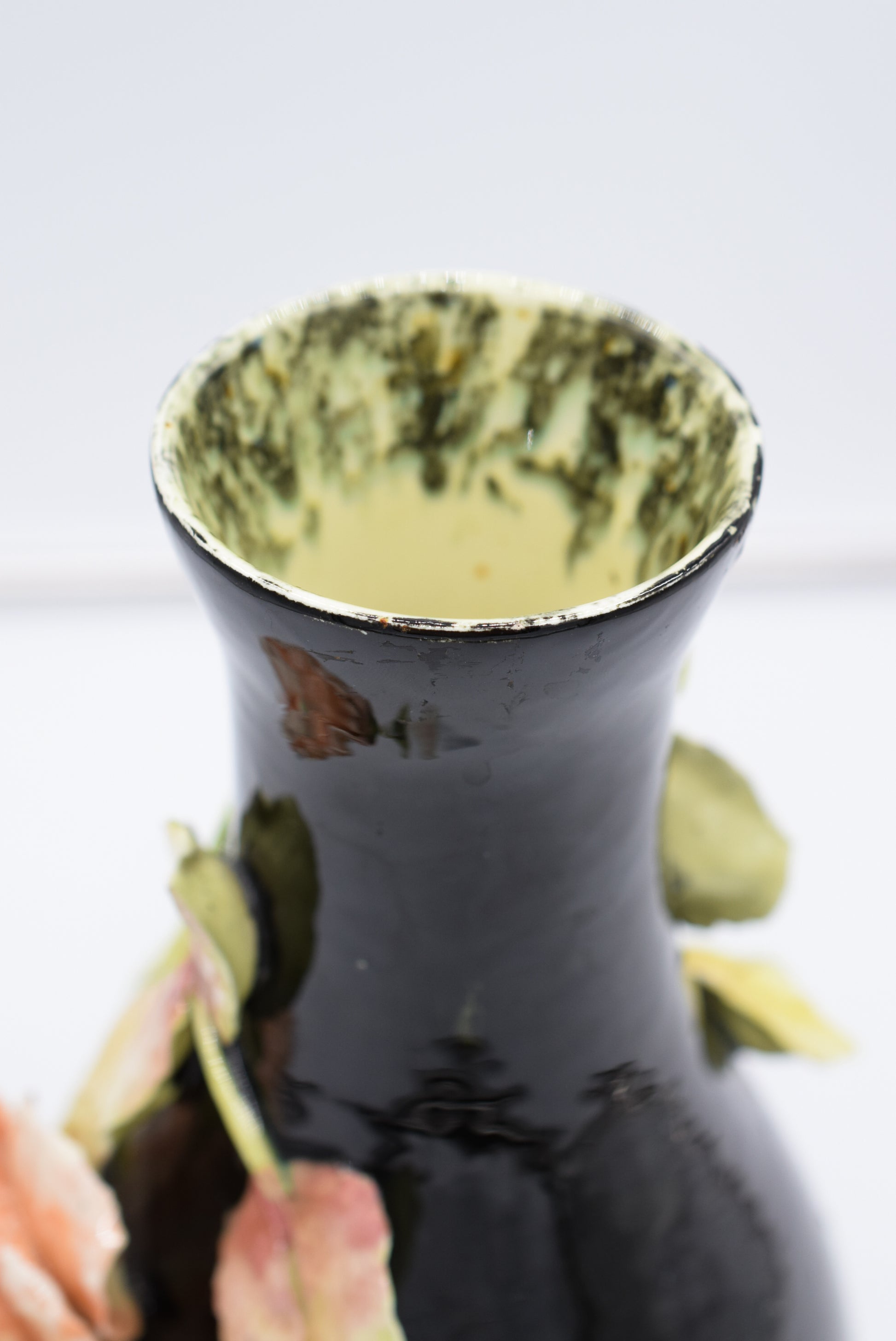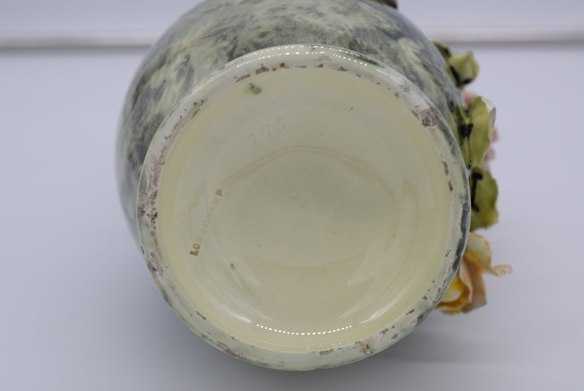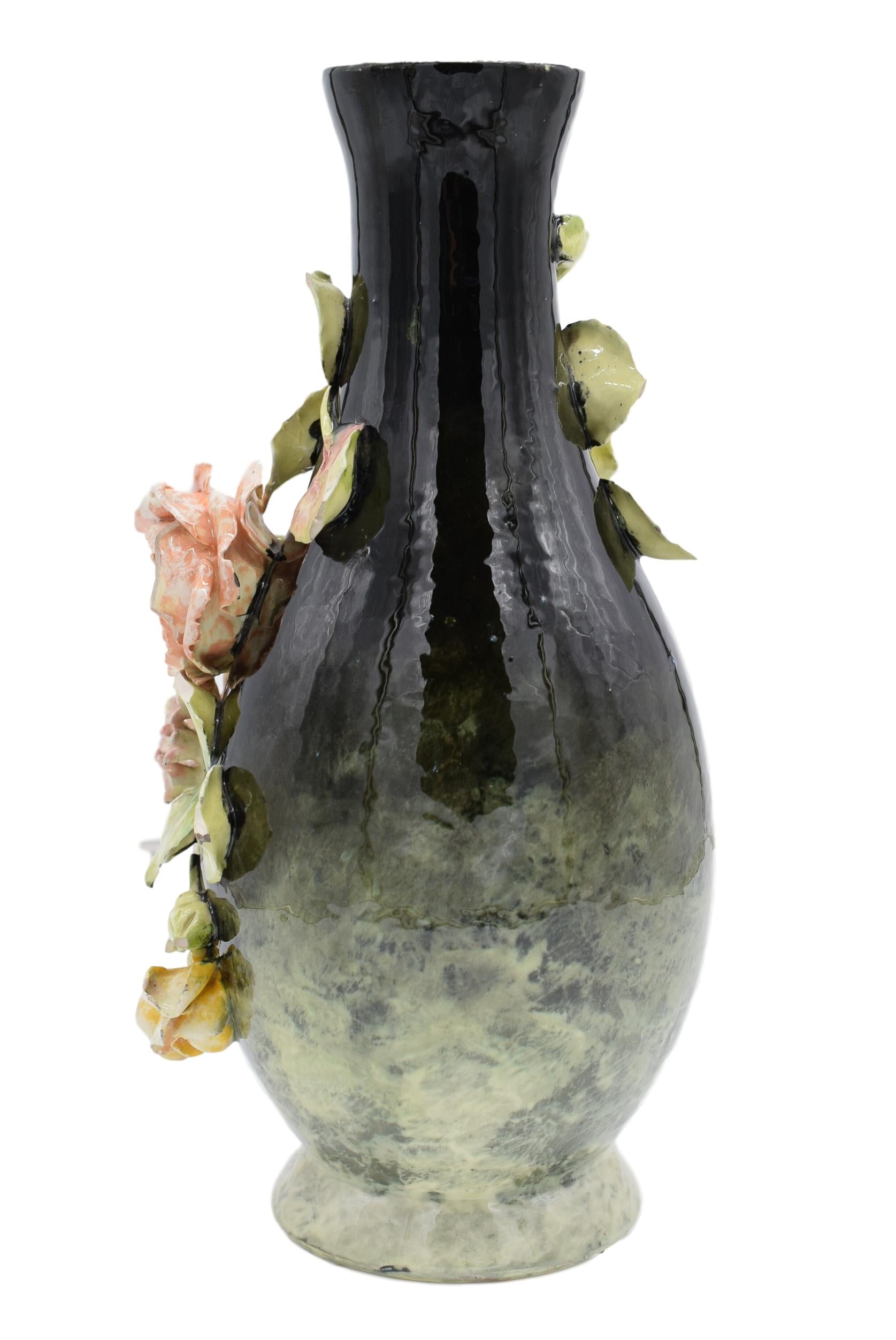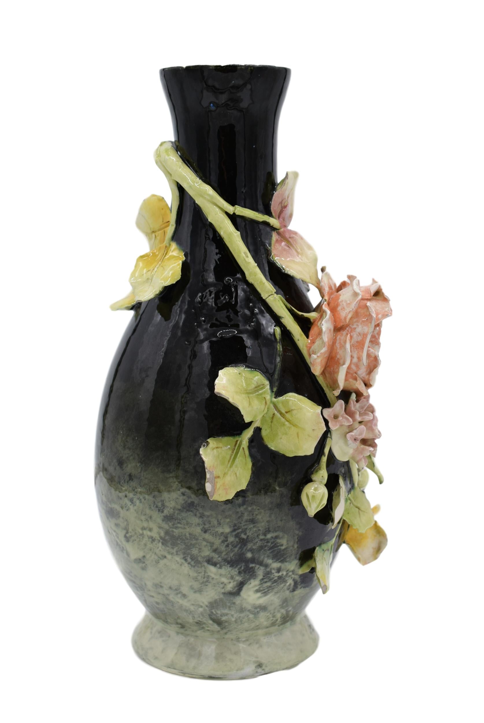 A fabulous French antique majolica vase dating to the late 19th century. The Longchamp ceramic has been decorated with applied high relief roses and and foliage. The majolica is bright. It has been stamped Longchamp.
